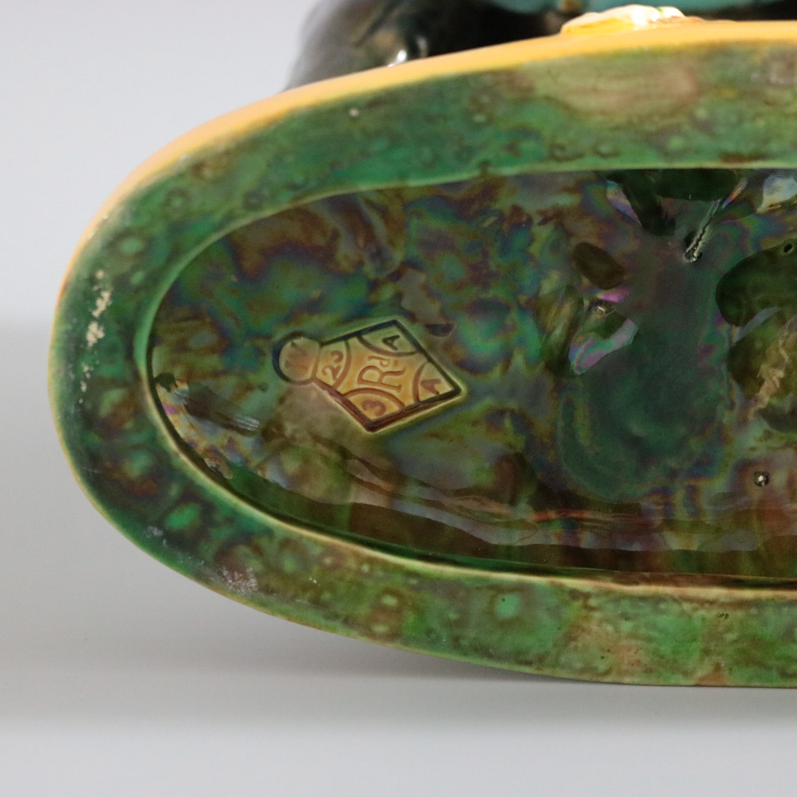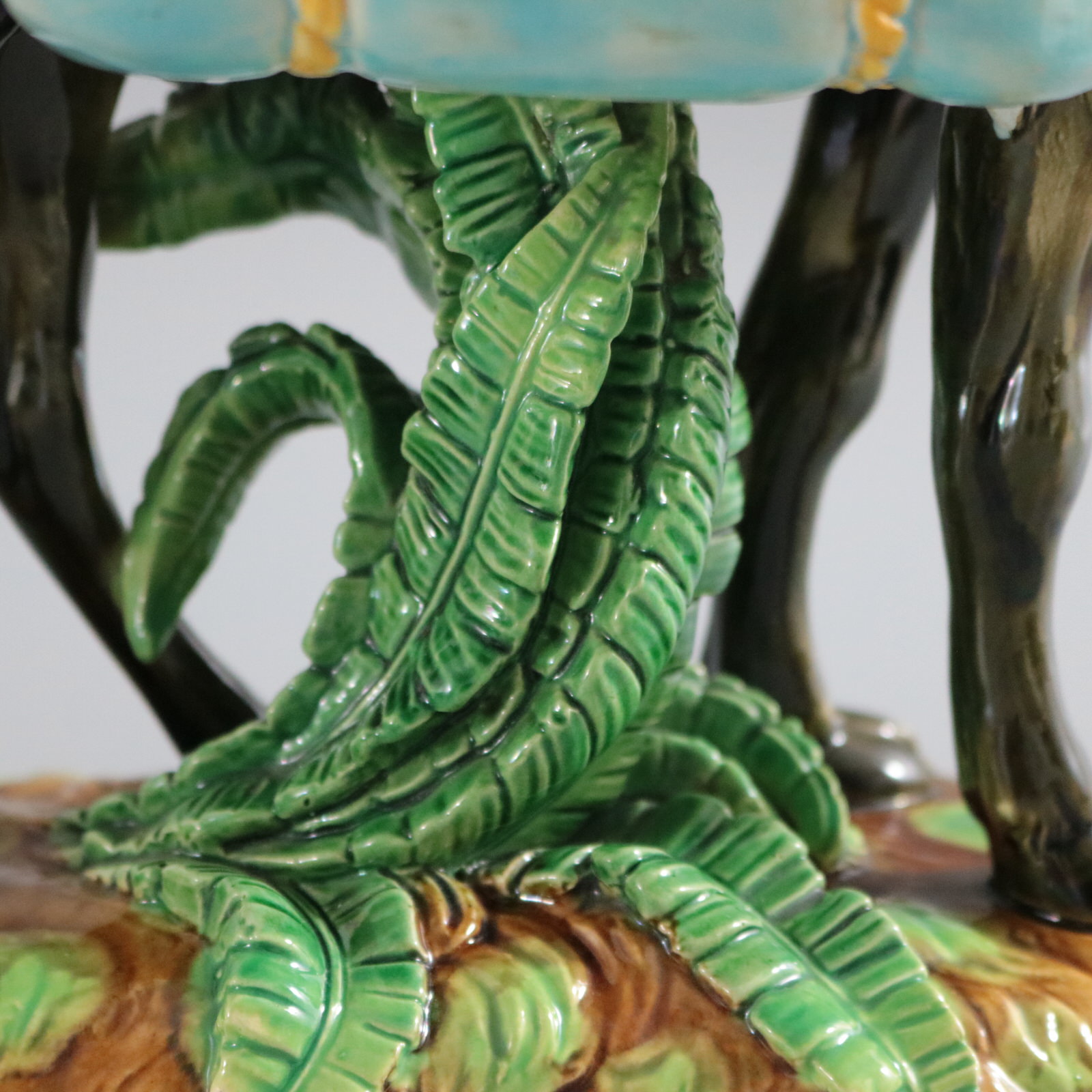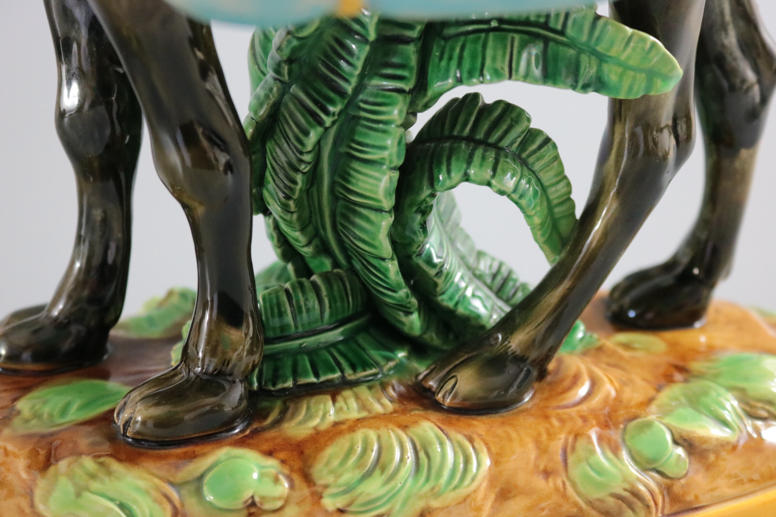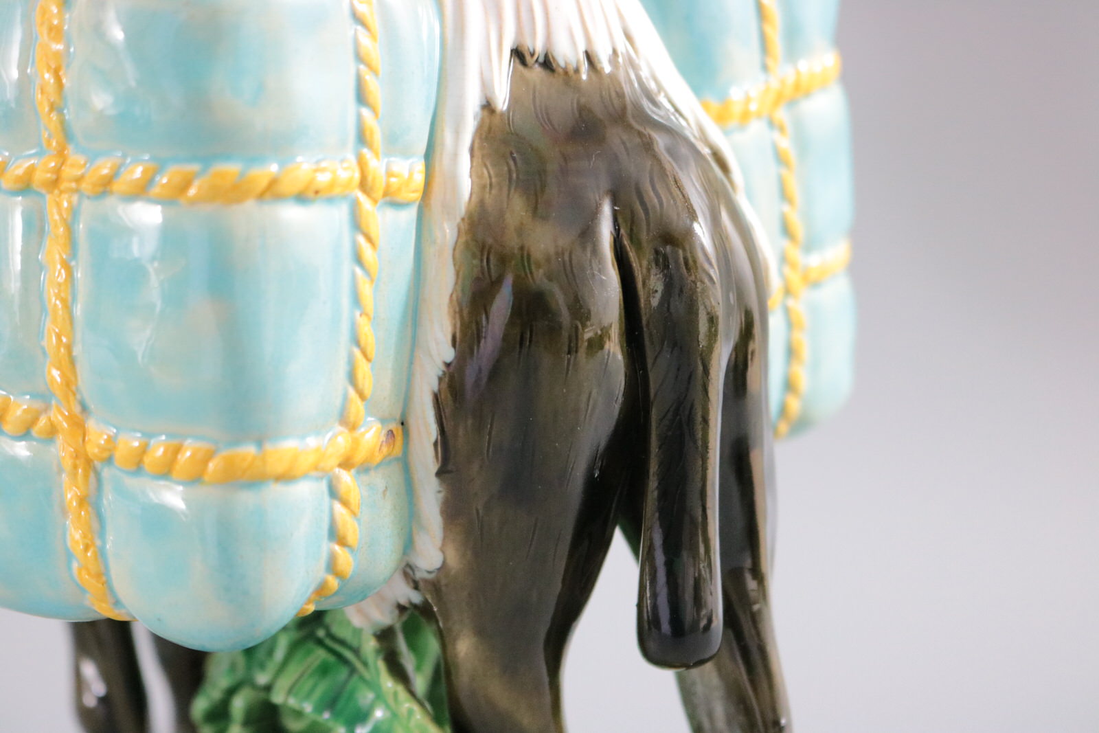 Victorian, circa 1871. 8.9ins high, 9.4ins wide, 5.5ins depth. George Jones Majolica flower holder which features a camel, stood over leaves, carrying panniers on it's back.