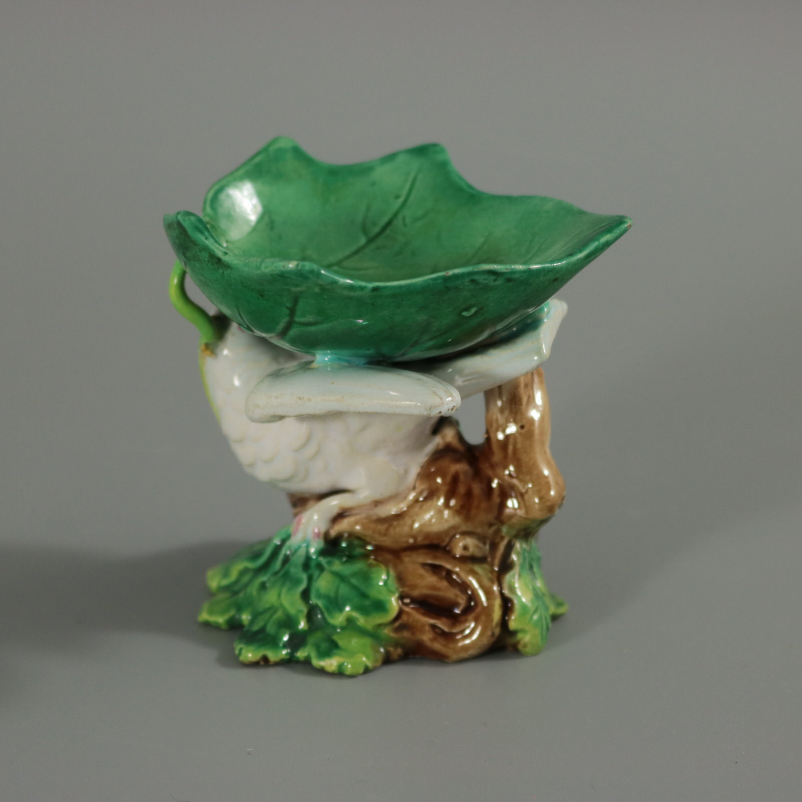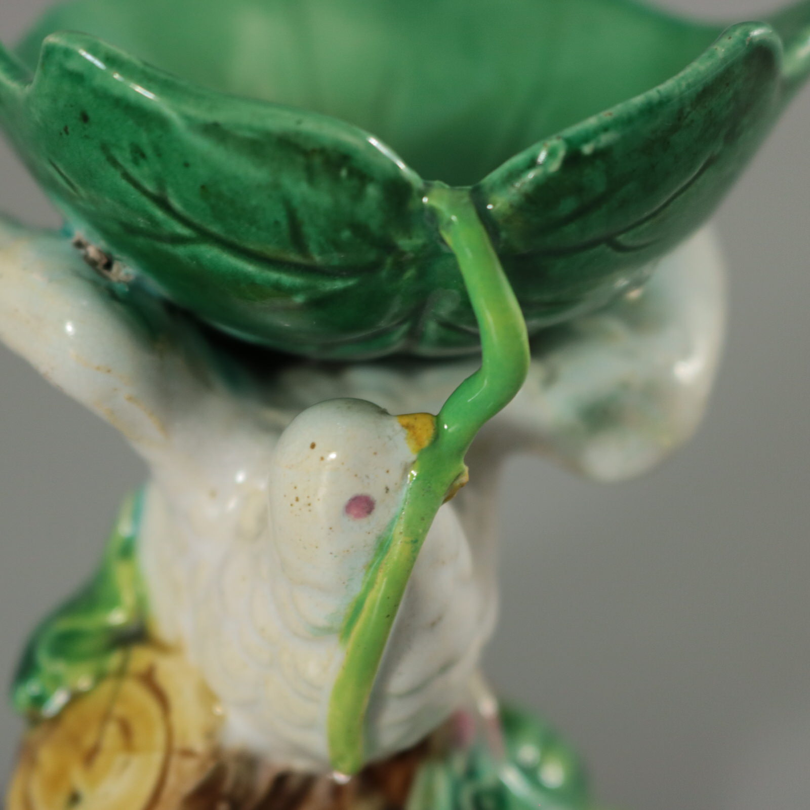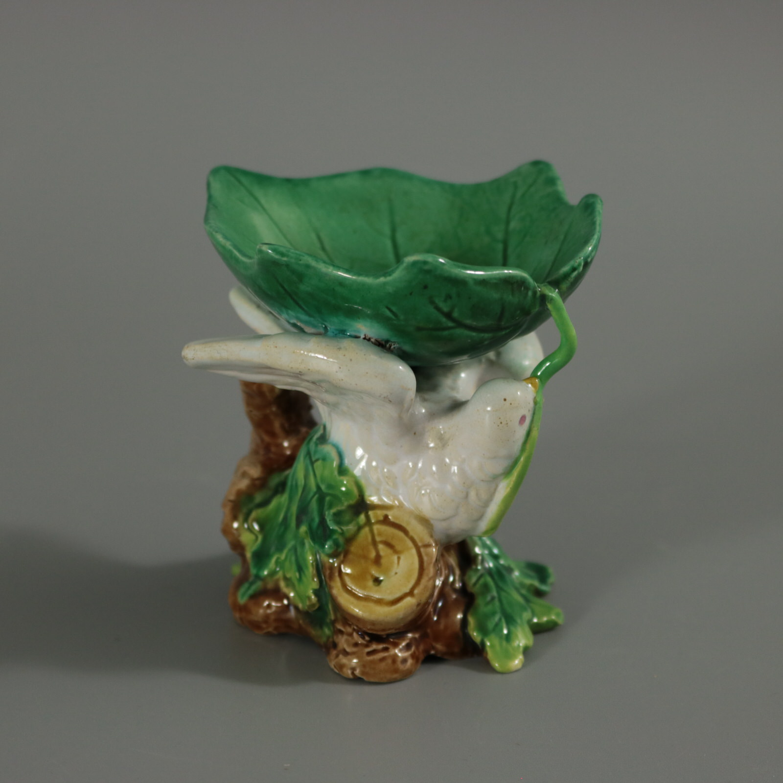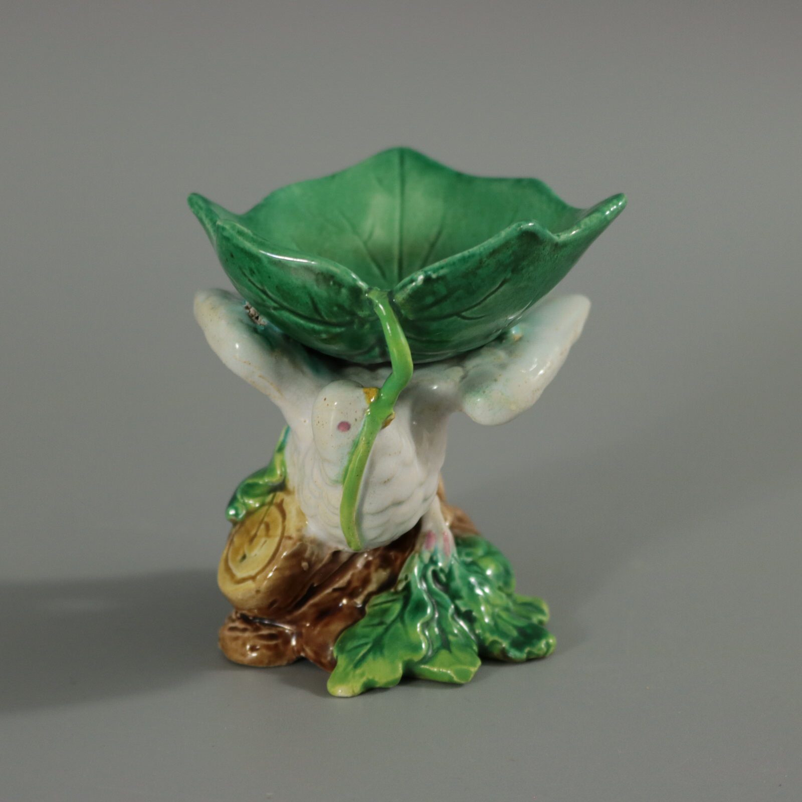 Victorian, circa 1875. 2.9ins high, 3ins wide, 2.8ins depth. George Jones Majolica pot which features a white dove, perched on a tree stump, holding a leaf in it's beak.