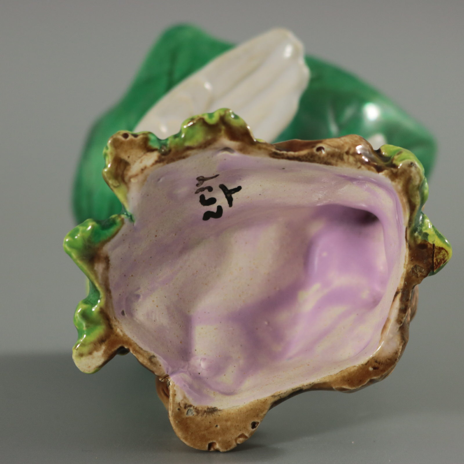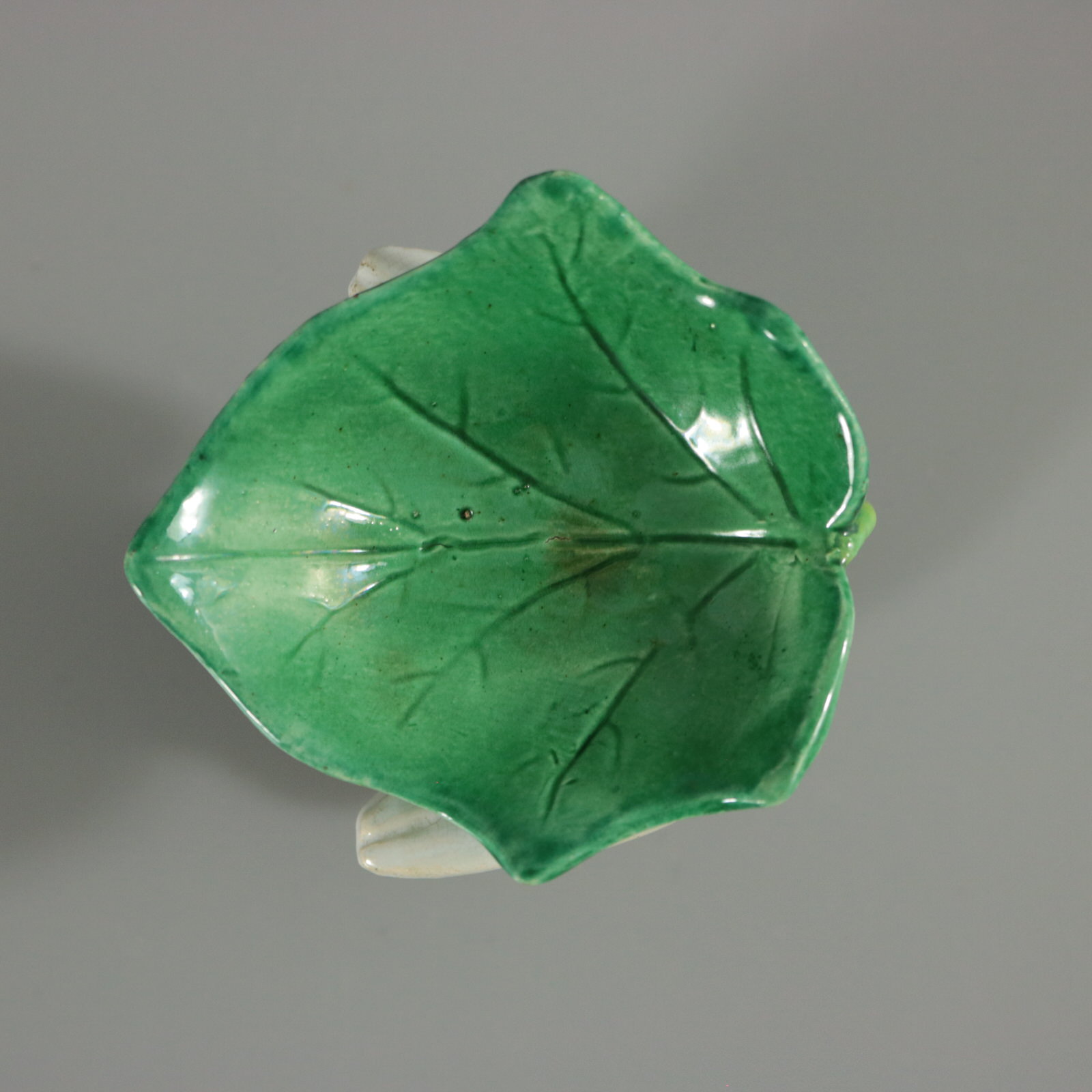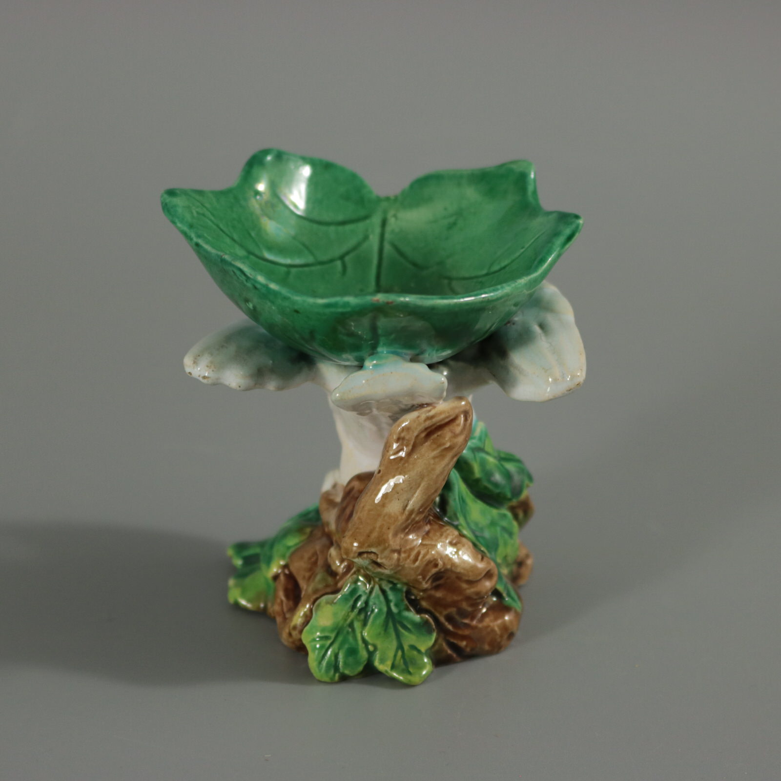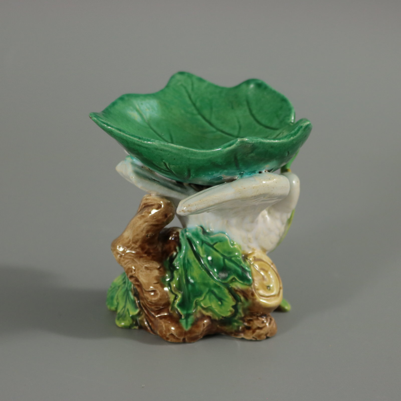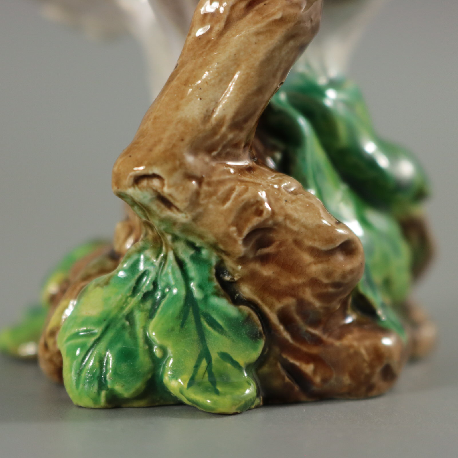 Victorian, circa 1875. 2.9ins high, 3ins wide, 2.8ins depth. George Jones Majolica pot which features a white dove, perched on a tree stump, holding a leaf in it's beak.