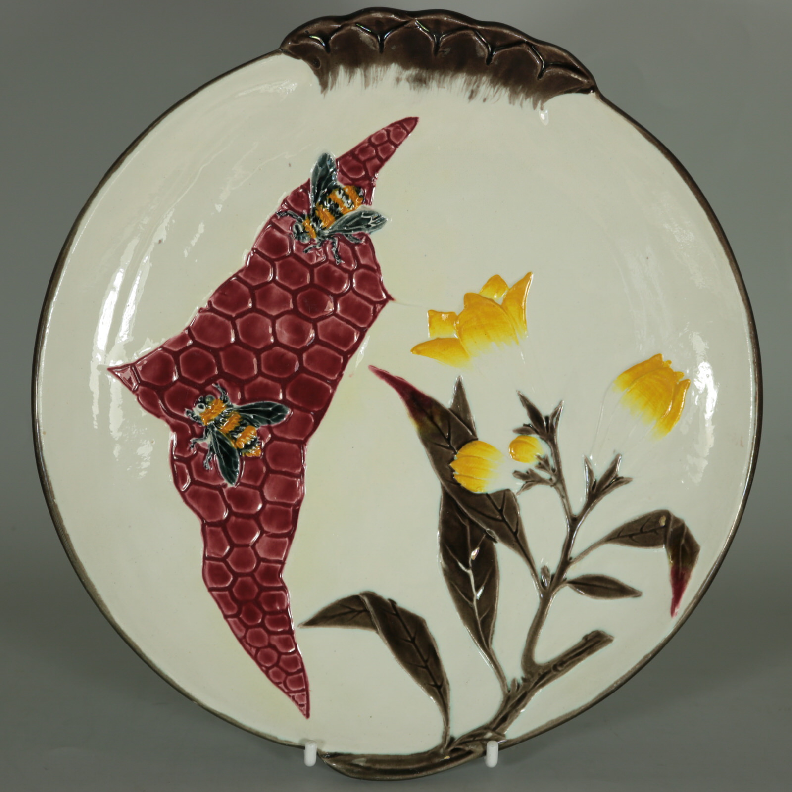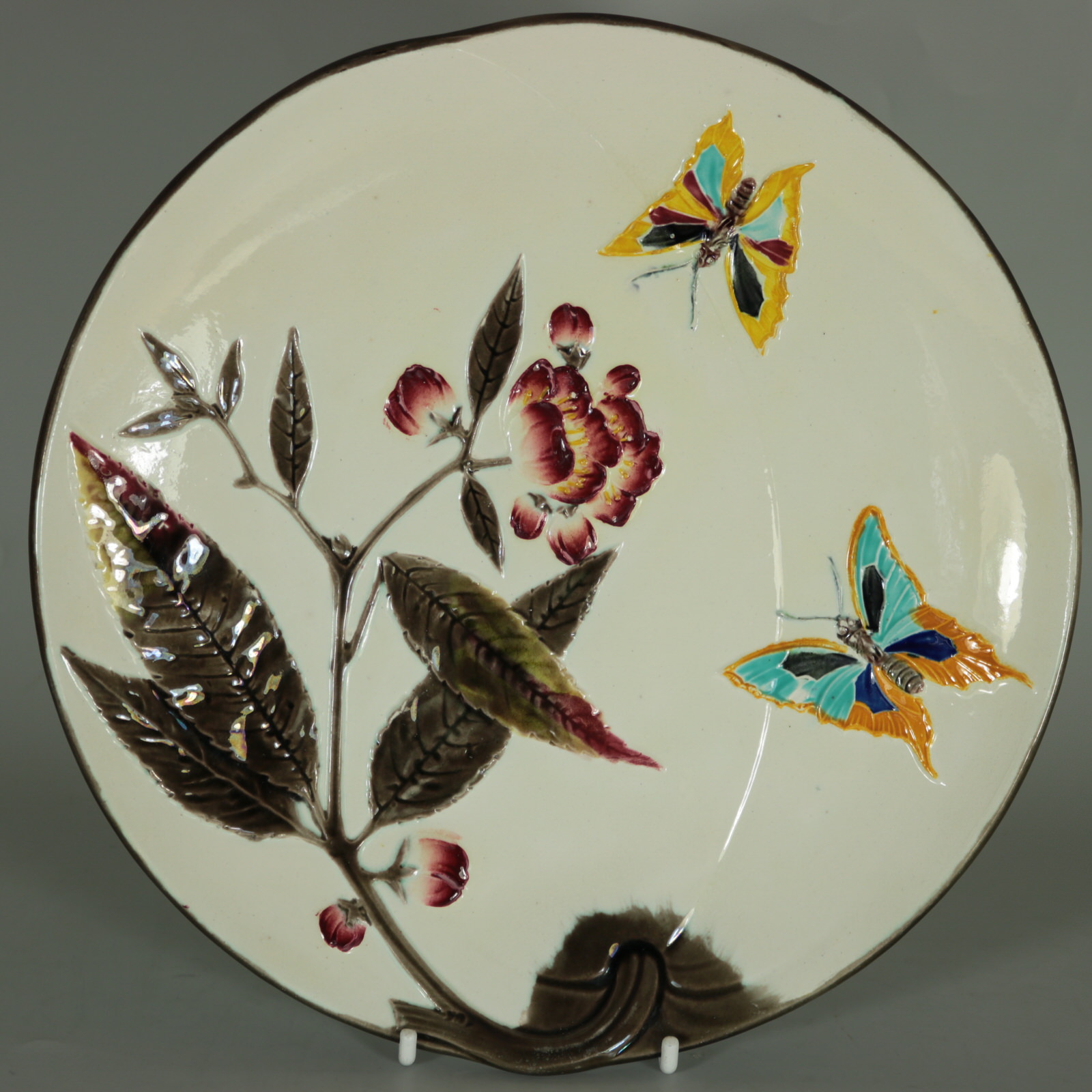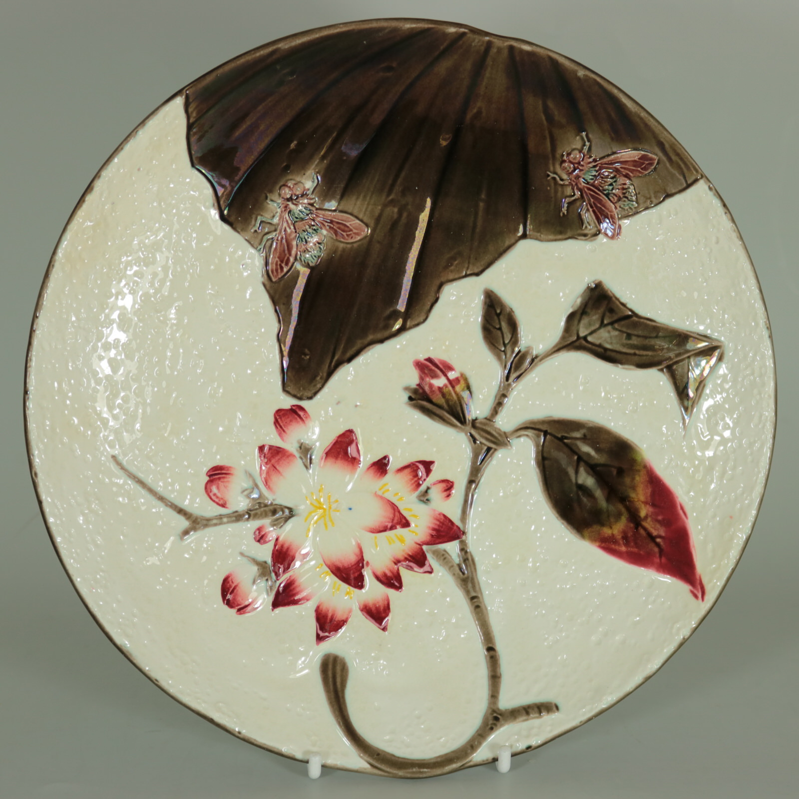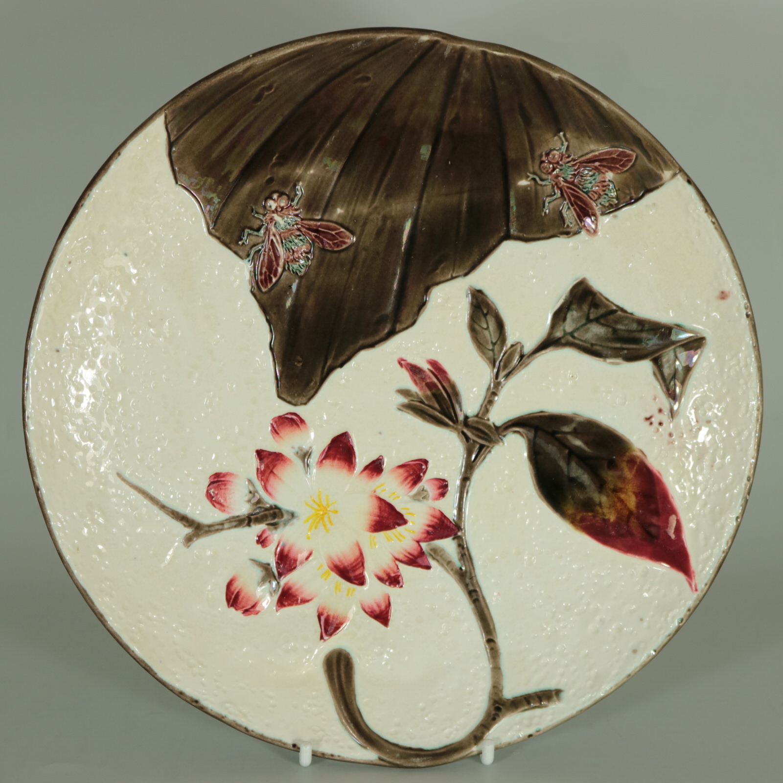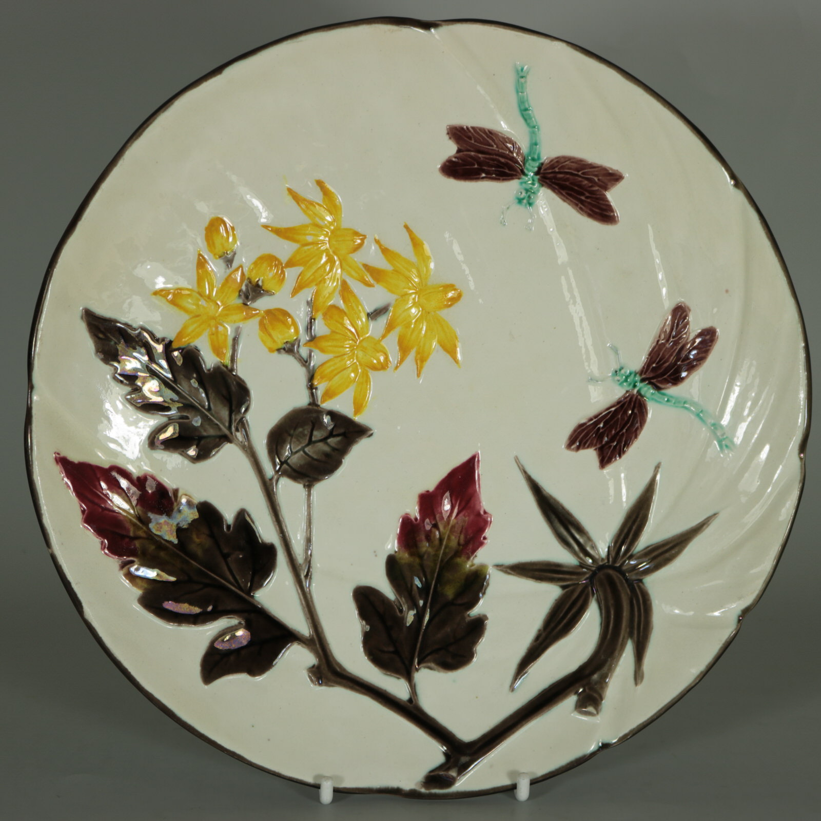 Victorian, circa 1882. Tallest is 9.1ins high, 9.1ins wide, 1.1ins depth. Set of eleven Wedgwood Argenta Majolica plates which feature bees and flowers on 6 plates, butterflies and flowers on 4 plates and dragonflies on one.