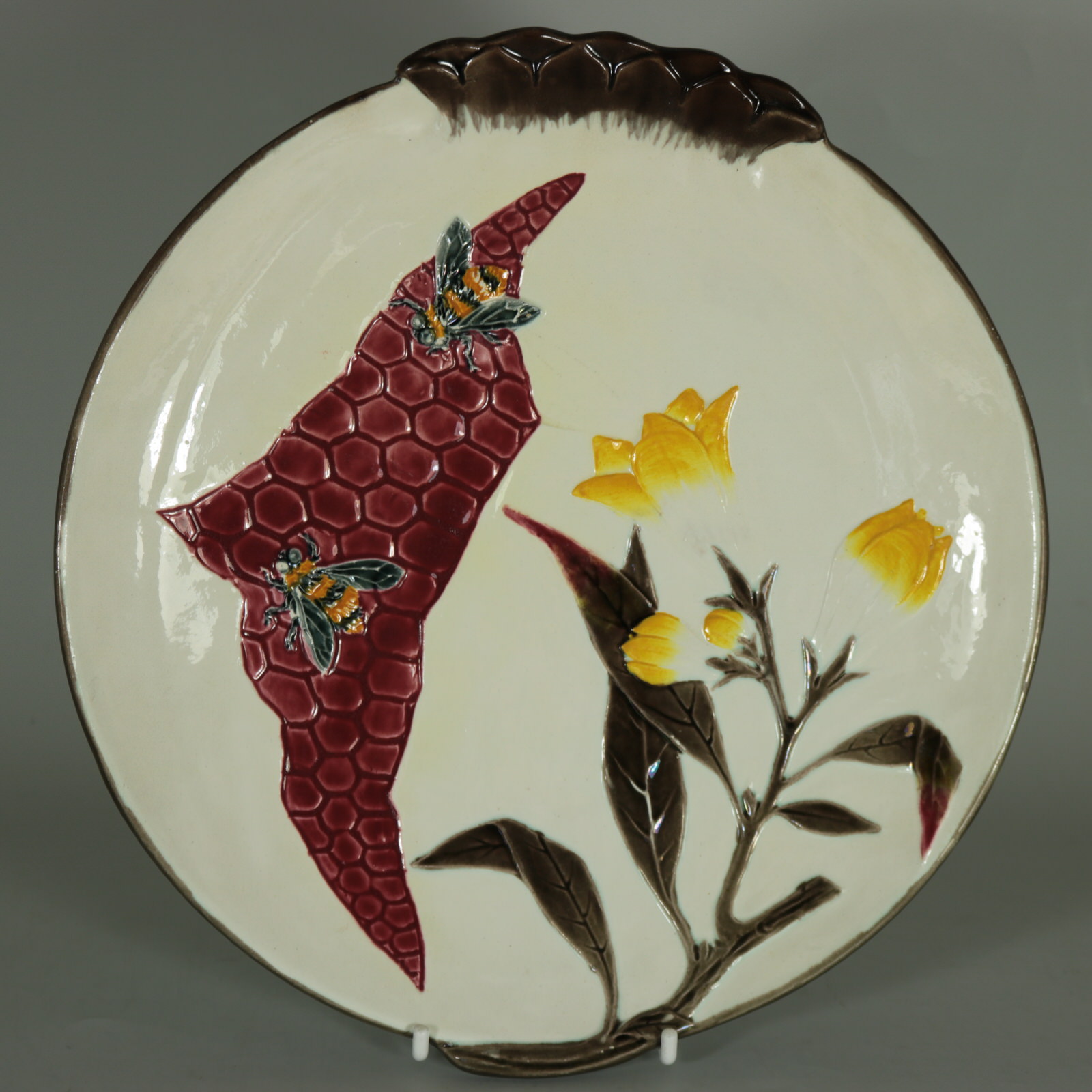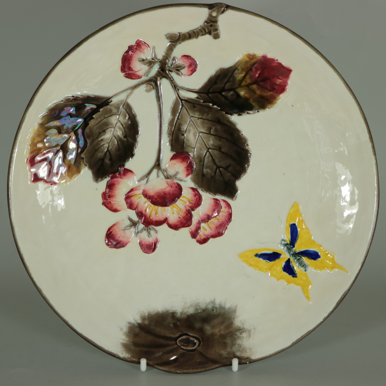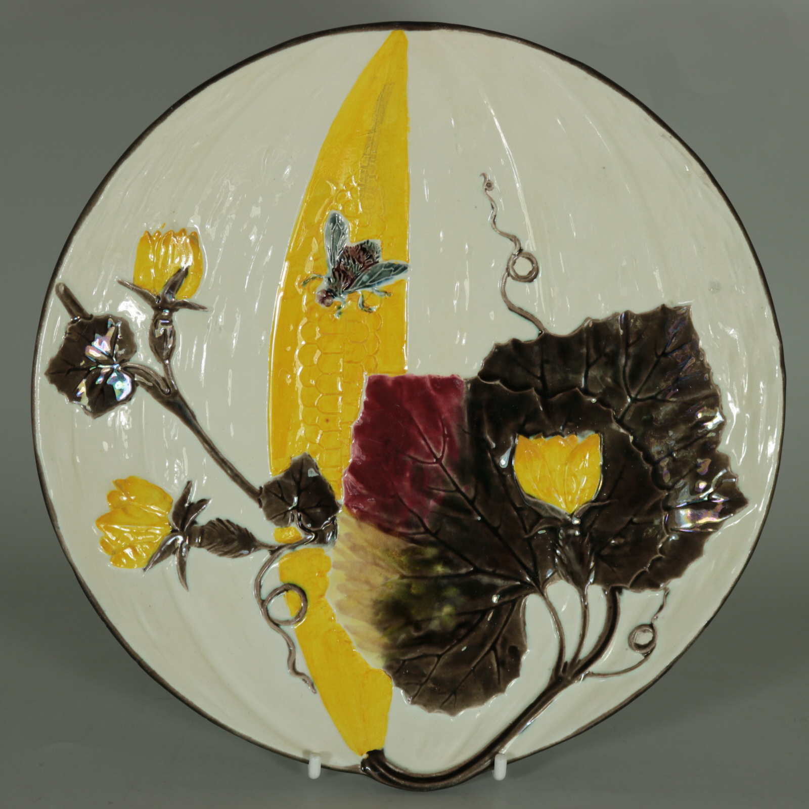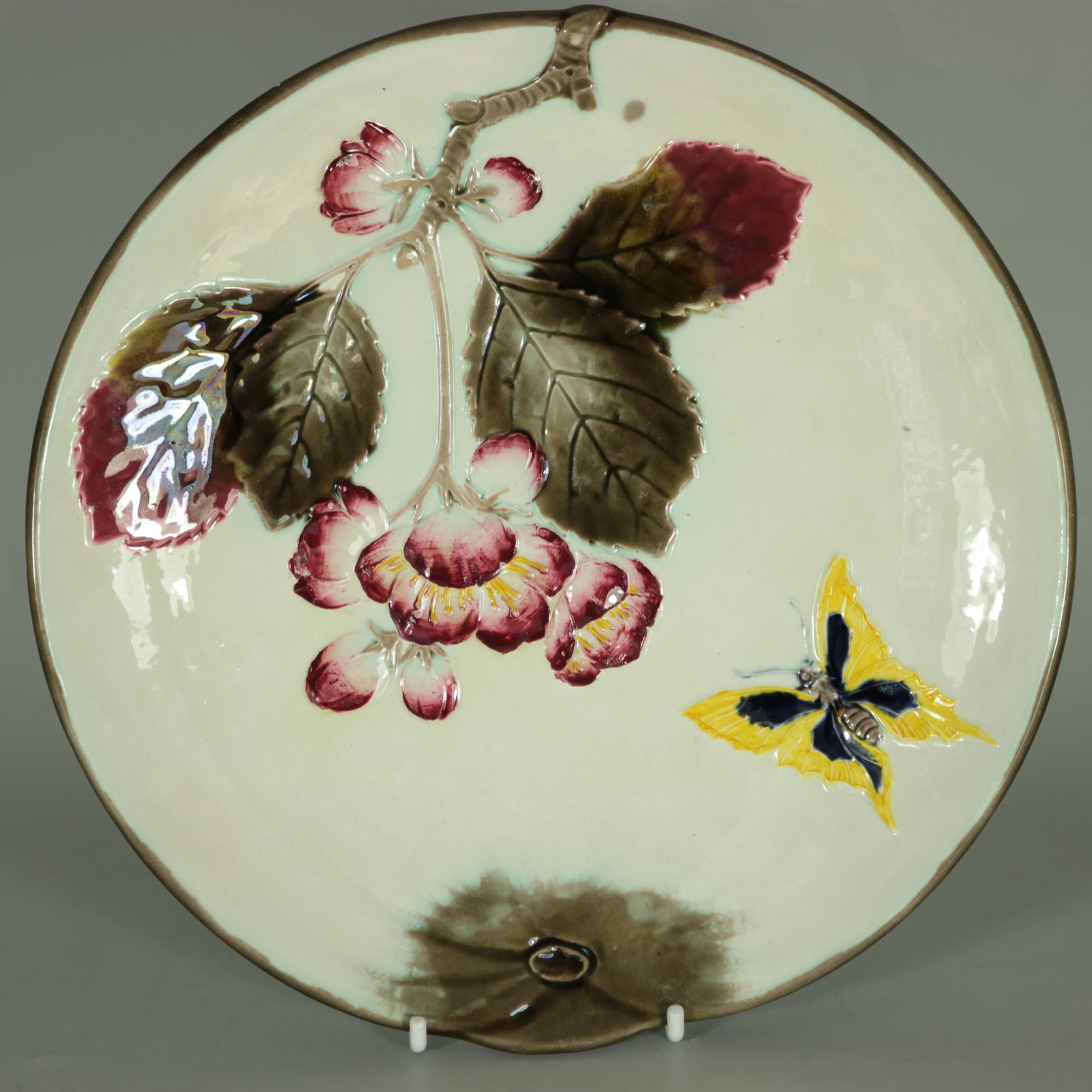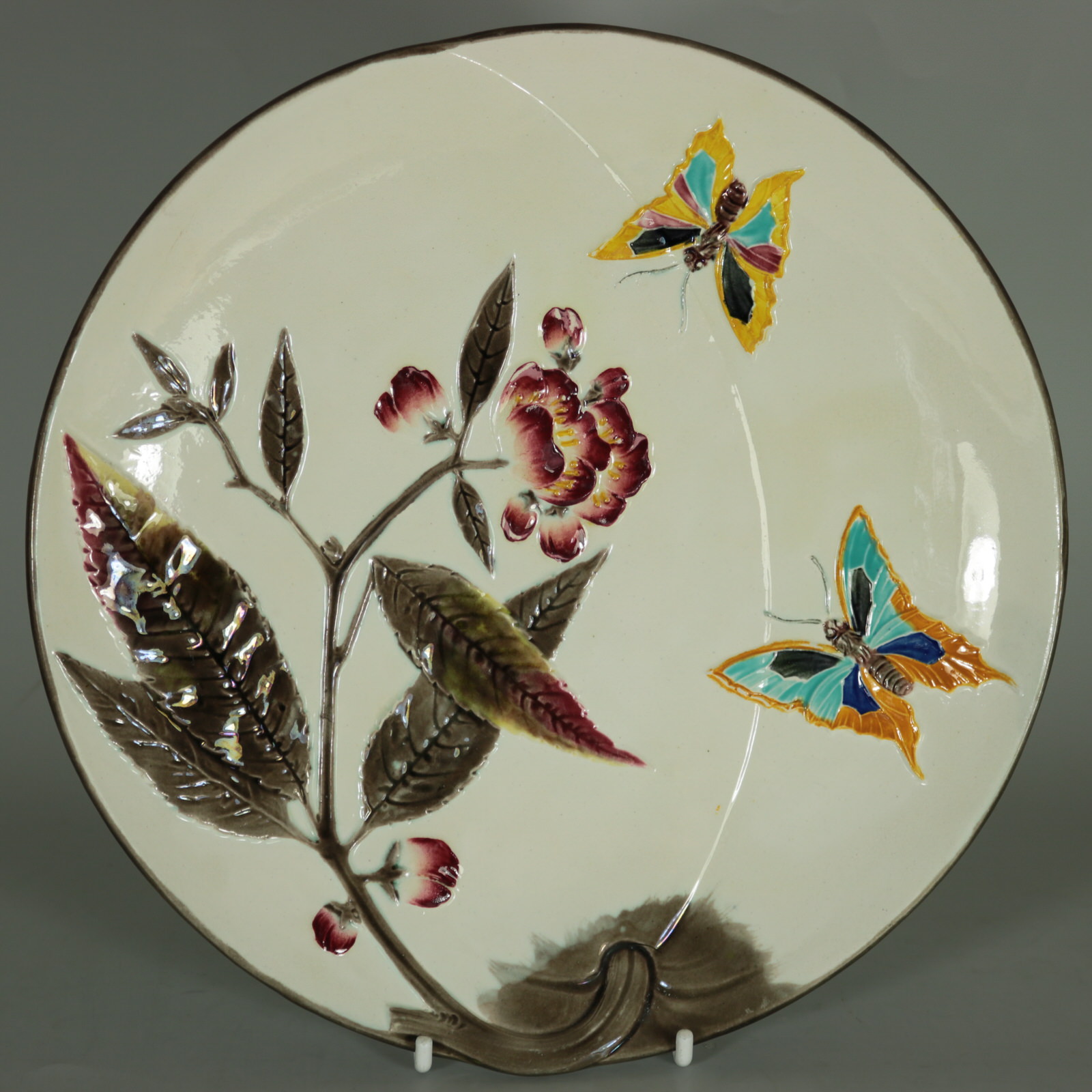 Victorian, circa 1882. Tallest is 9.1ins high, 9.1ins wide, 1.1ins depth. Set of eleven Wedgwood Argenta Majolica plates which feature bees and flowers on 6 plates, butterflies and flowers on 4 plates and dragonflies on one.