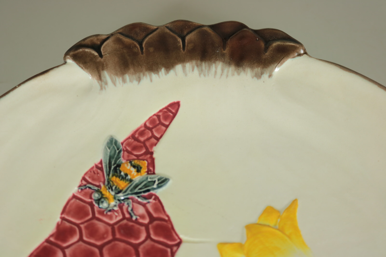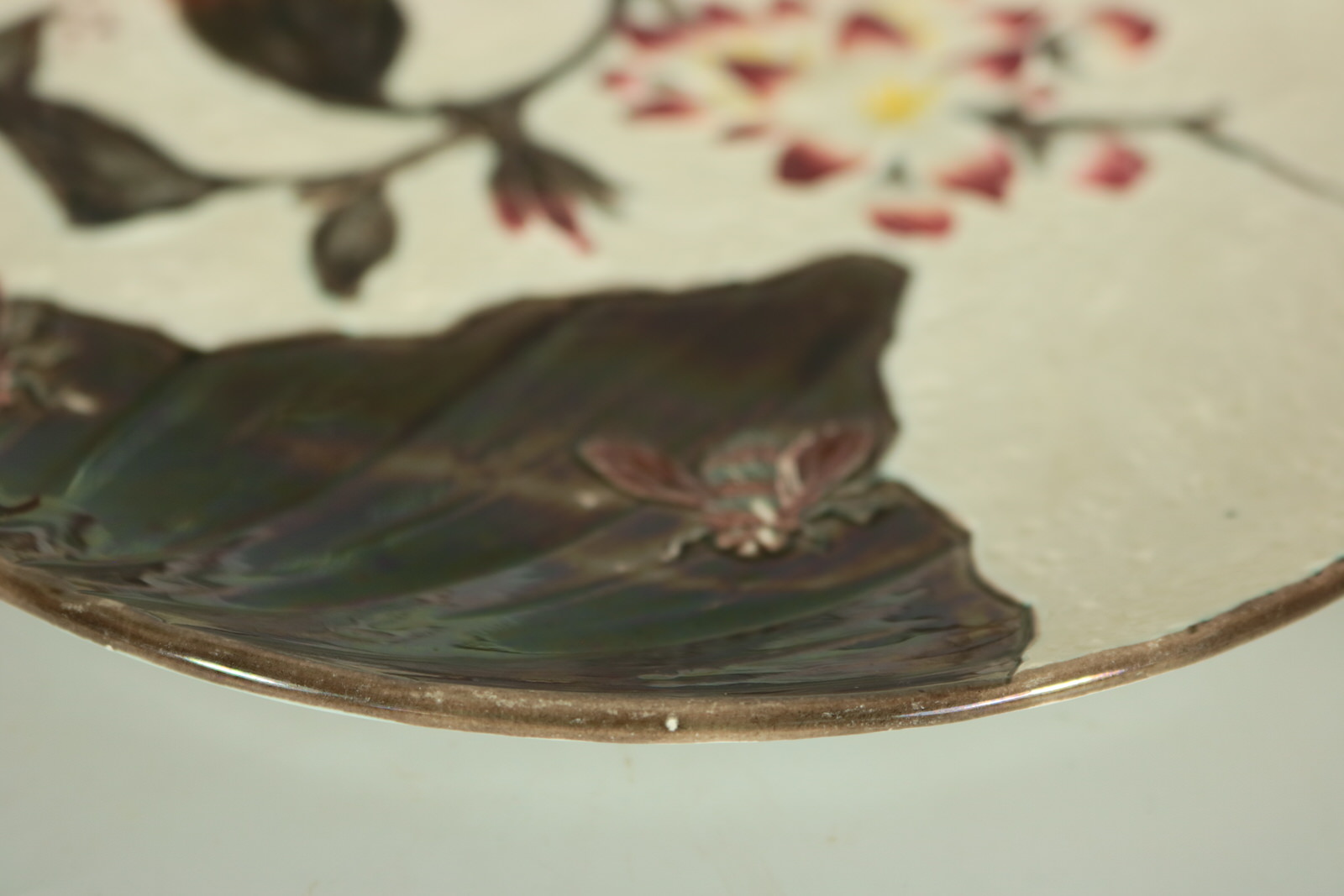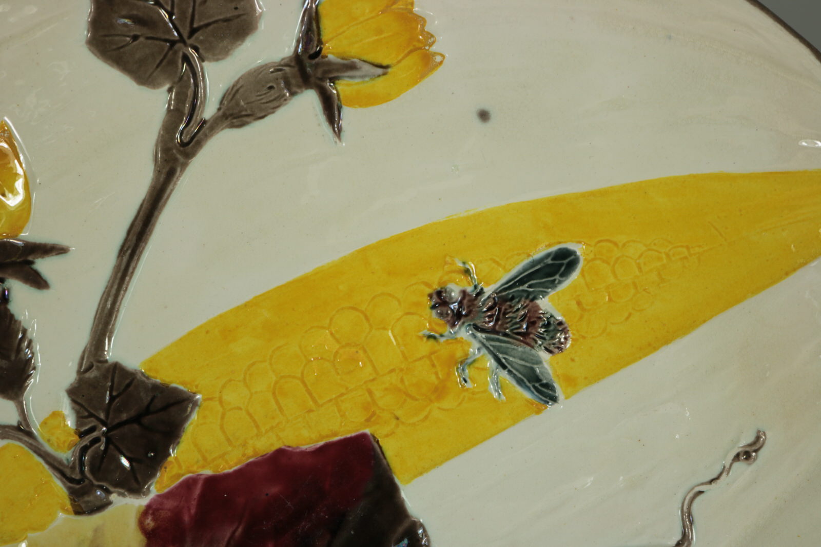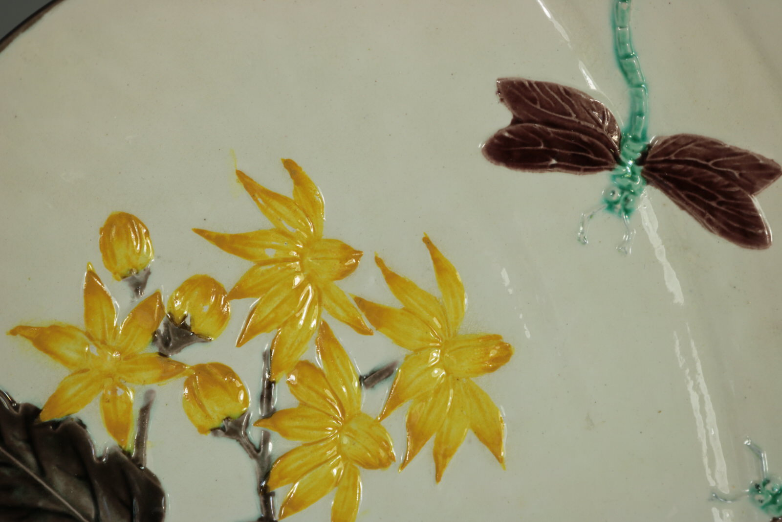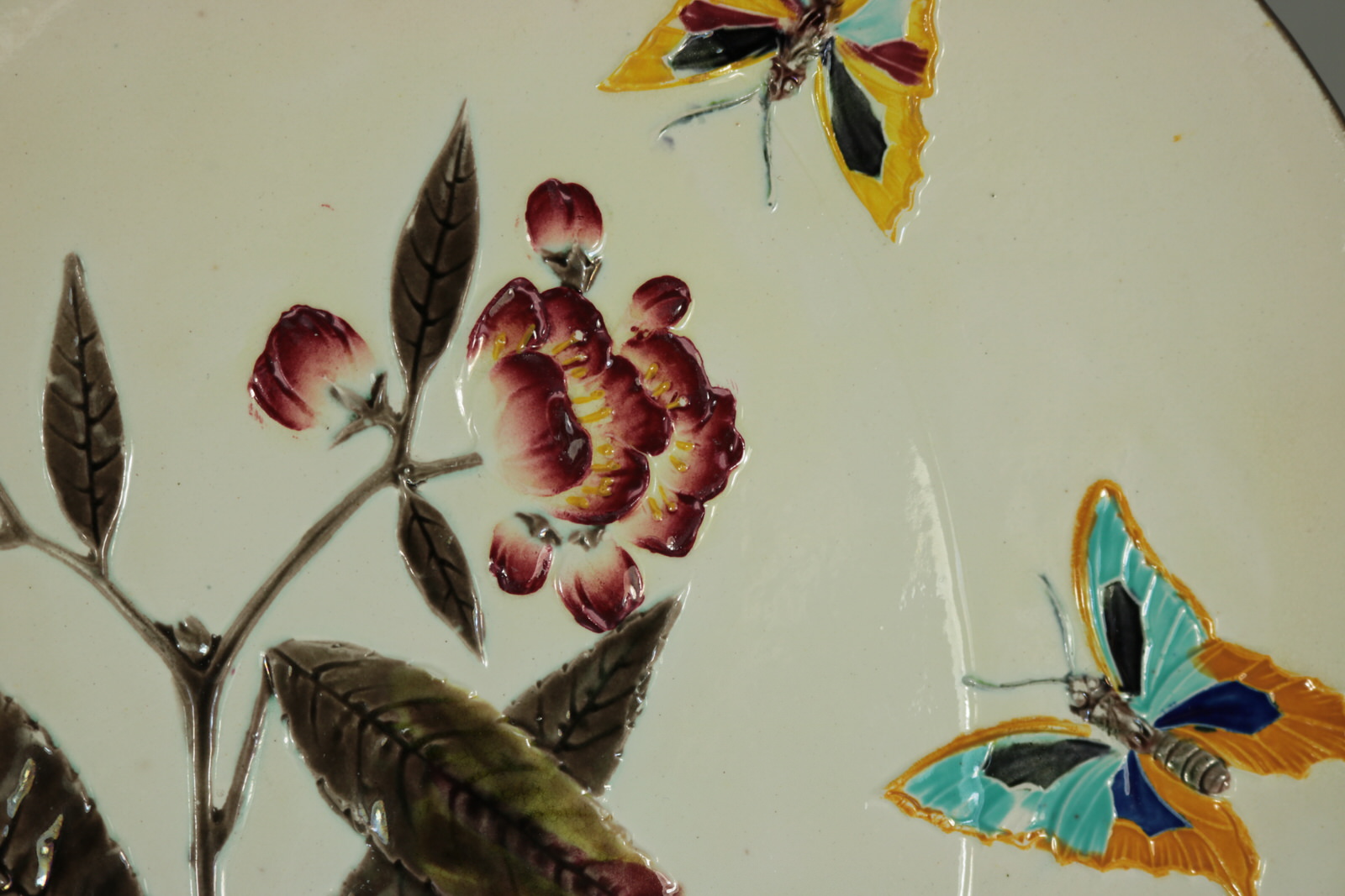 Victorian, circa 1882. Tallest is 9.1ins high, 9.1ins wide, 1.1ins depth. Set of eleven Wedgwood Argenta Majolica plates which feature bees and flowers on 6 plates, butterflies and flowers on 4 plates and dragonflies on one.