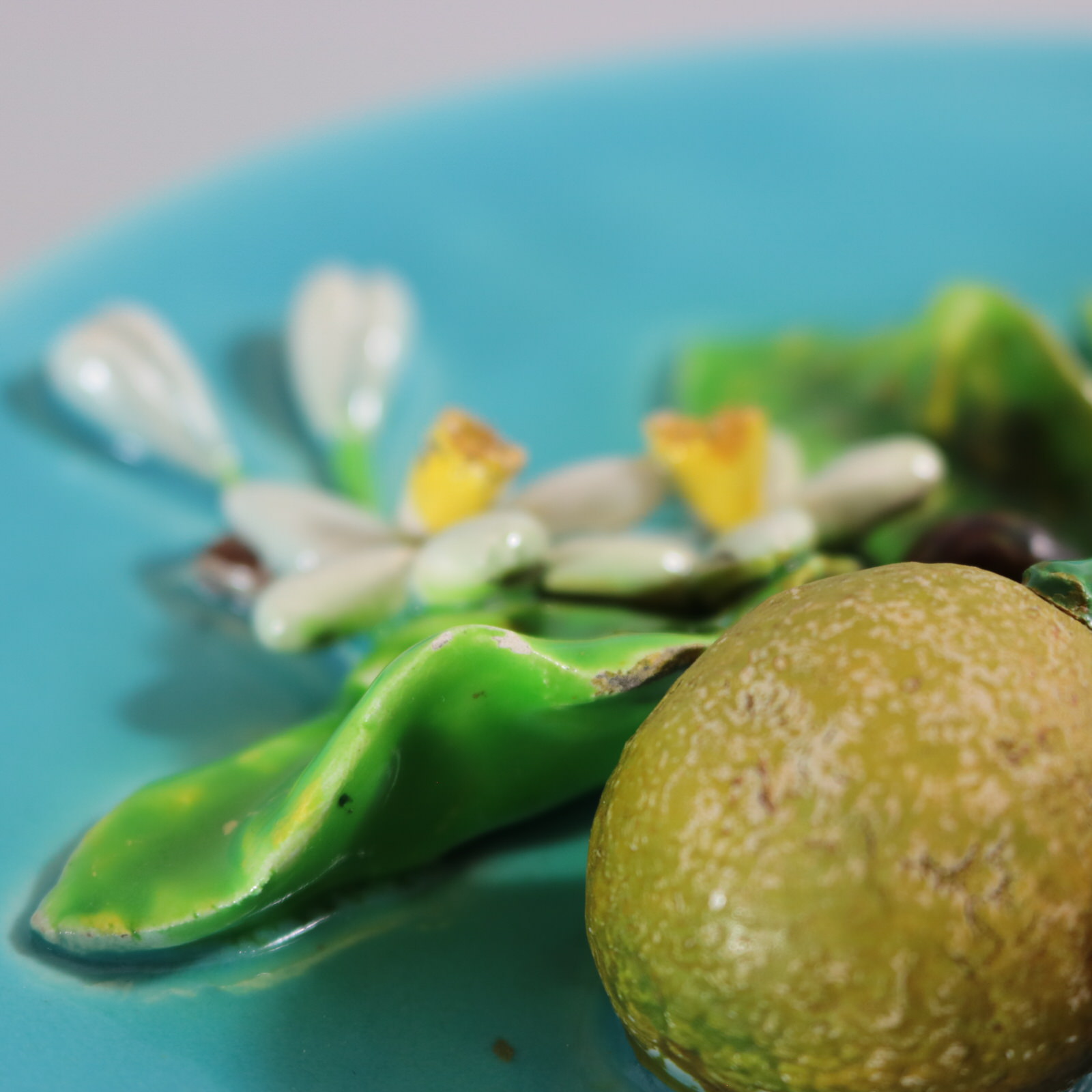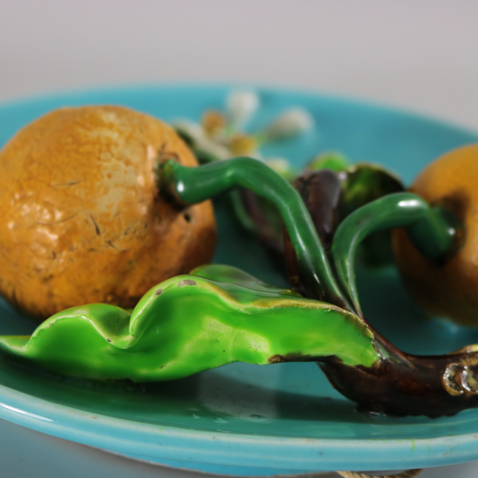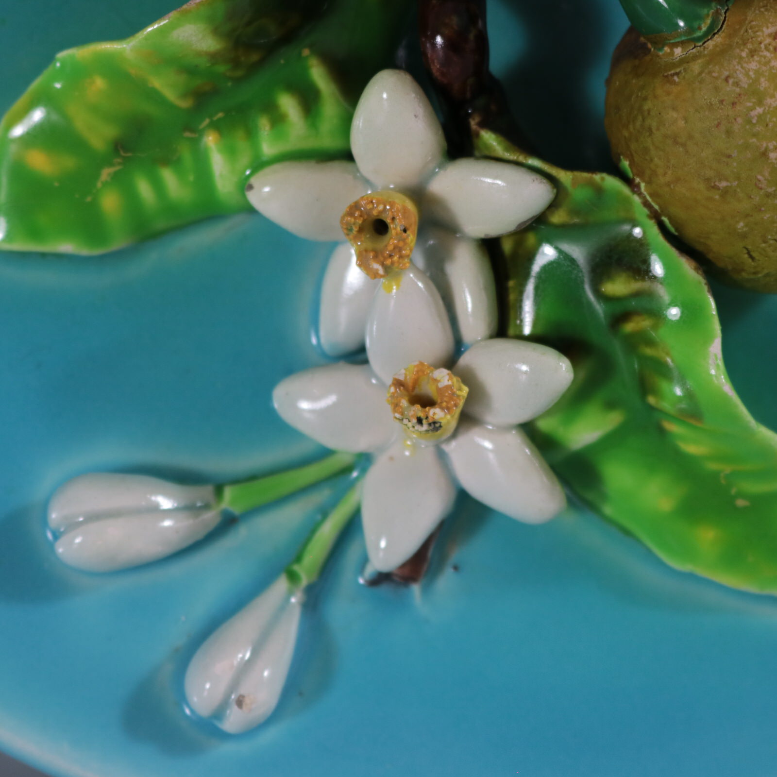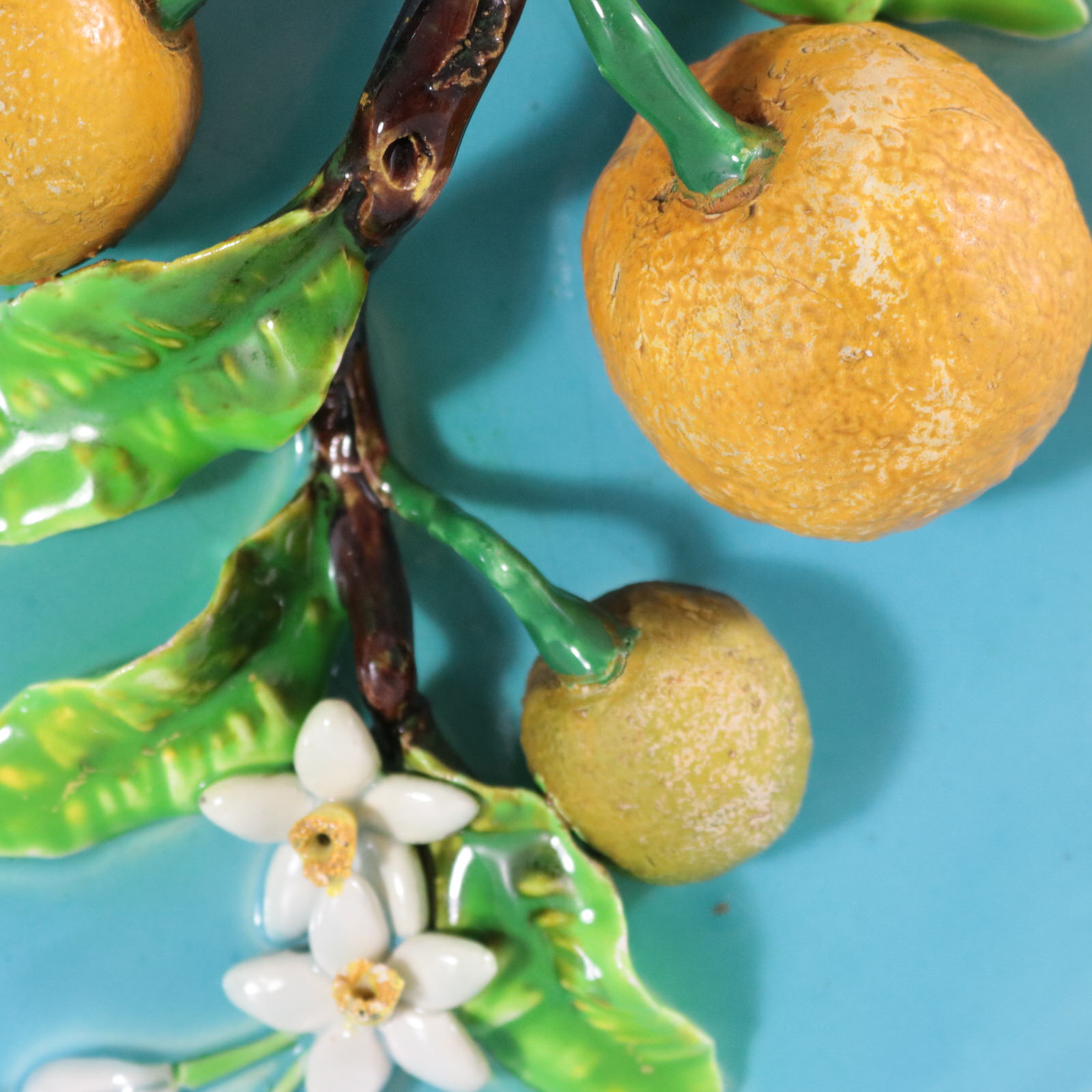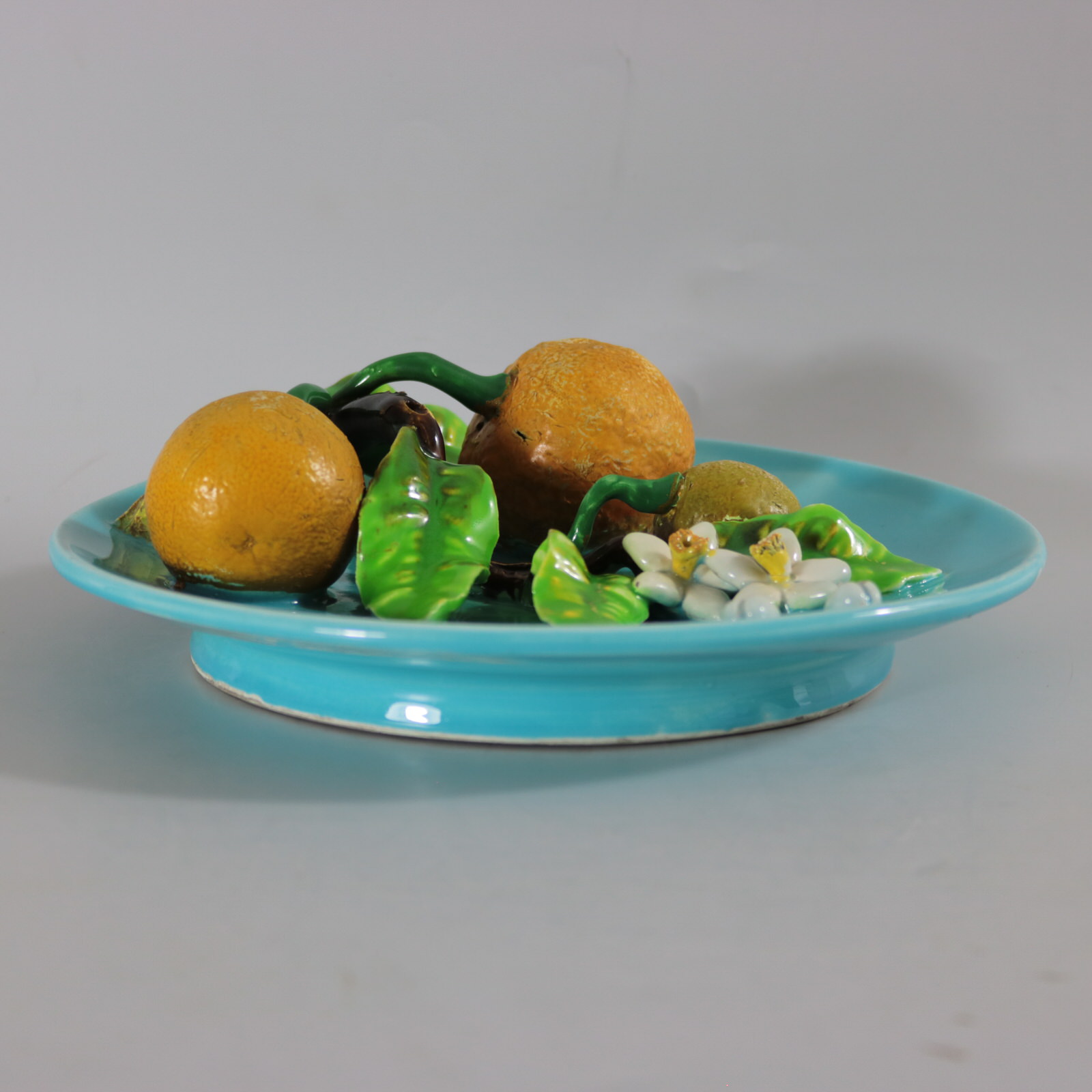 Circa 1880. 8.9ins high, 8.9ins wide, 2.6ins depth. Menton French Majolica wall plate which features oranges, leaves and flowers.