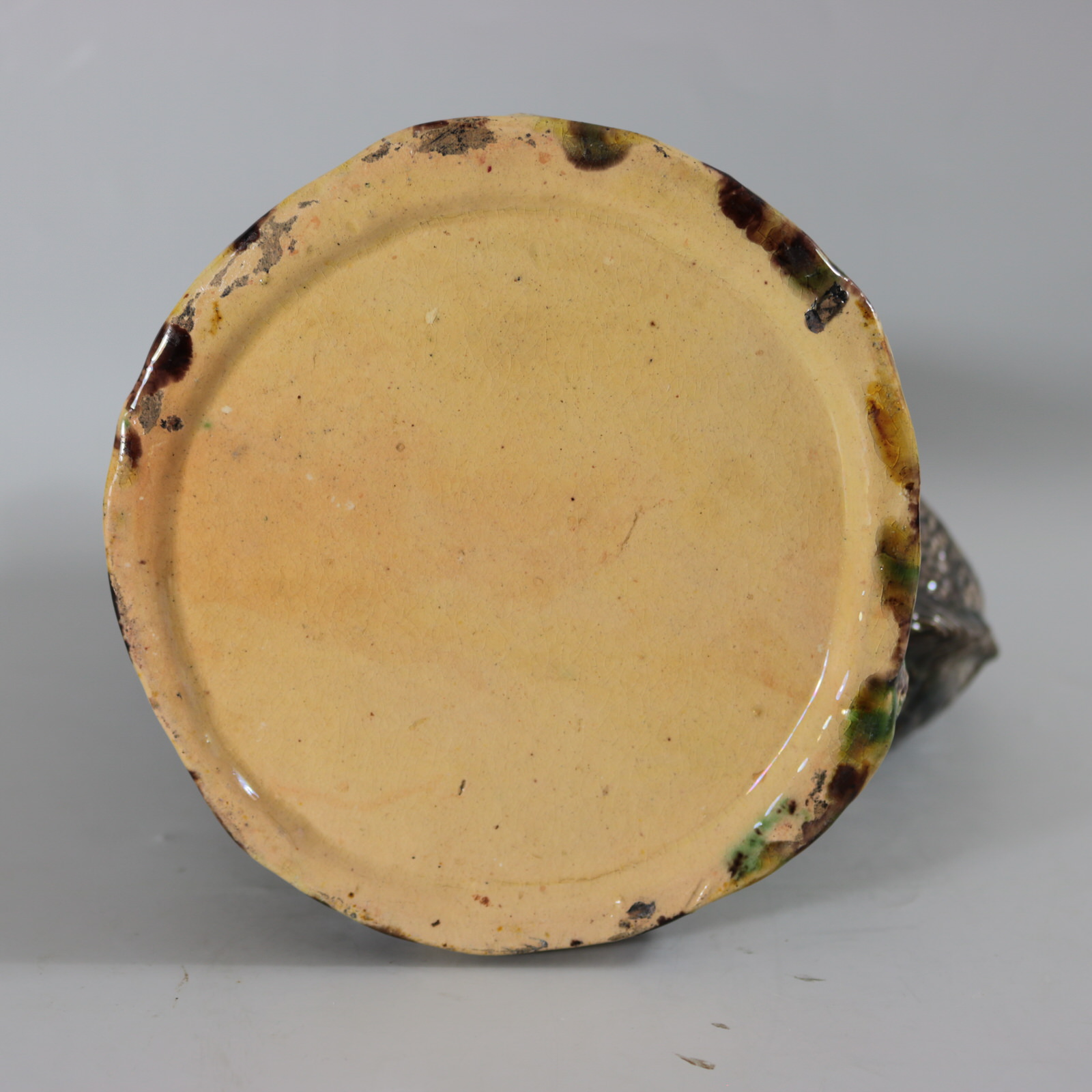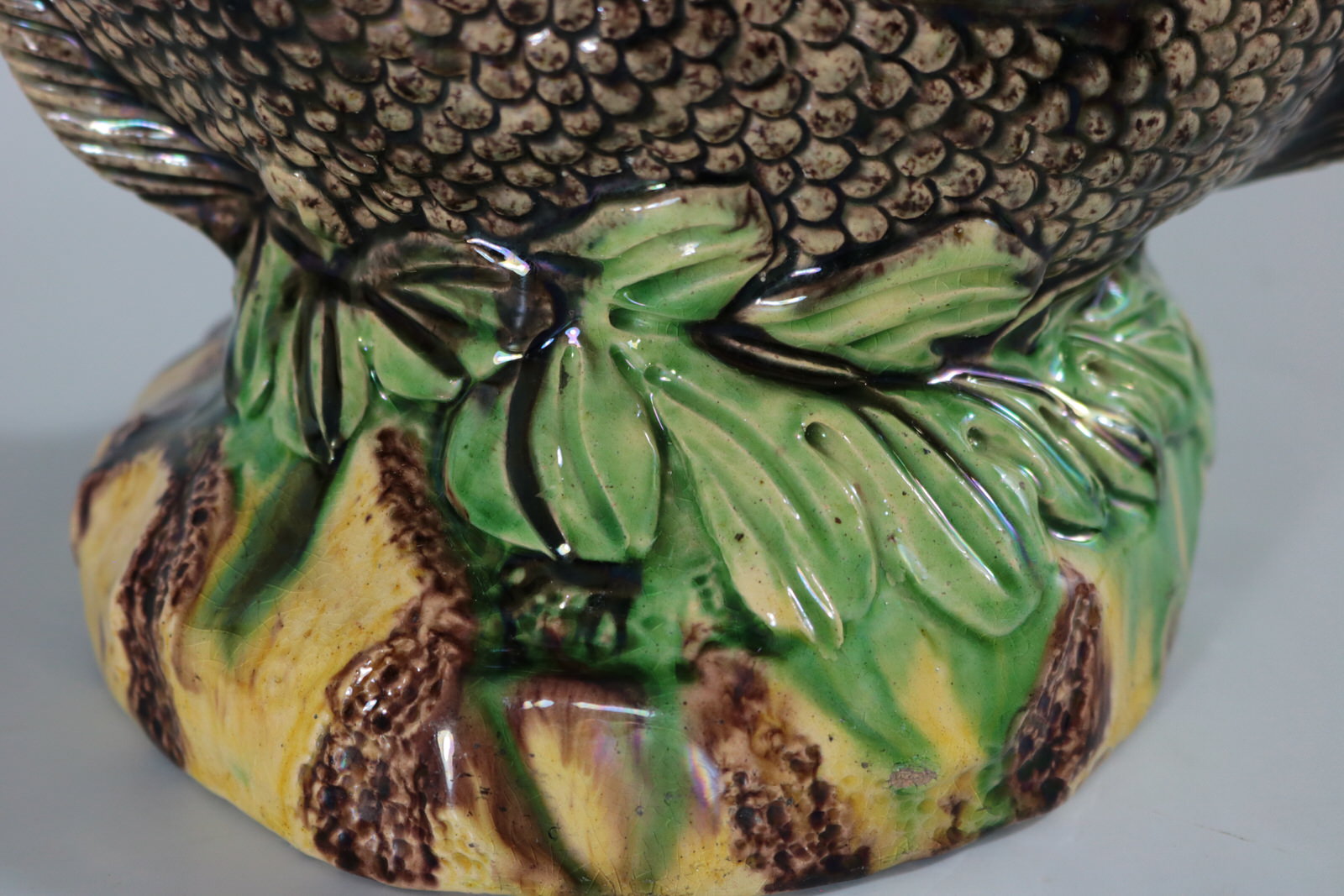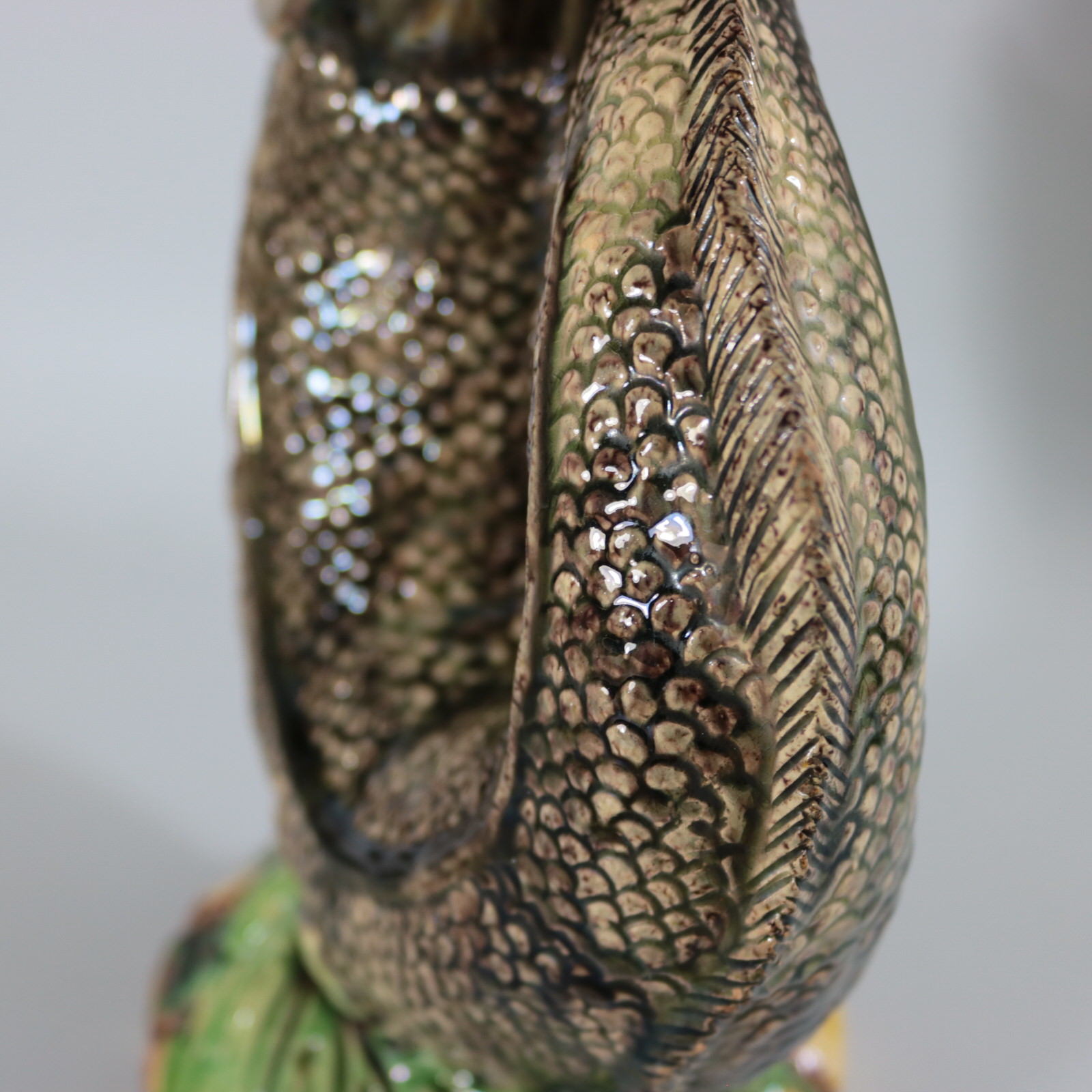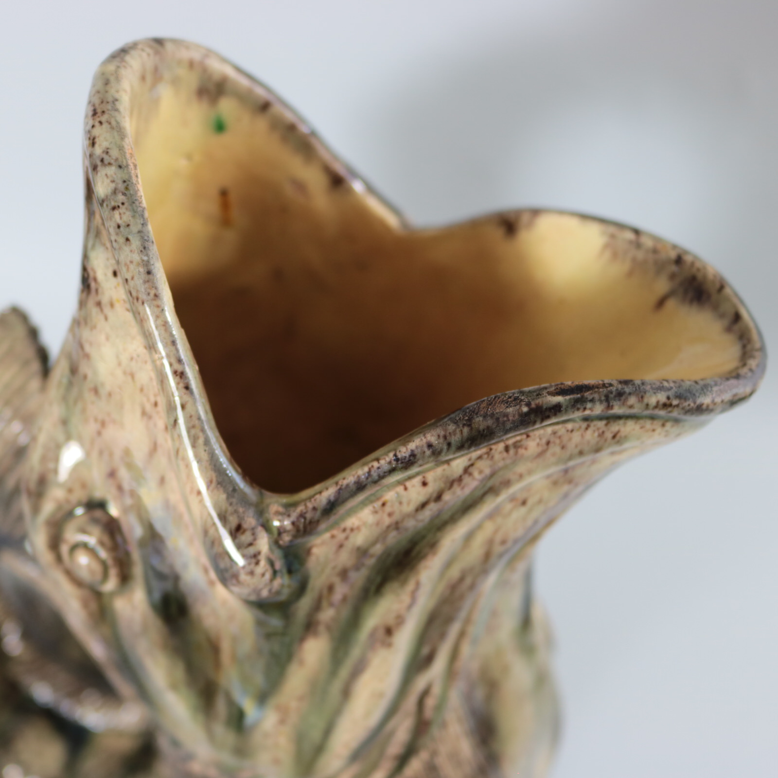 Circa 1890. 14.2ins high, 9.1ins wide, 5.7ins depth. European/Continental Majolica jug/pitcher which features a leaping fish, mouth wide open, on a bed of leaves.