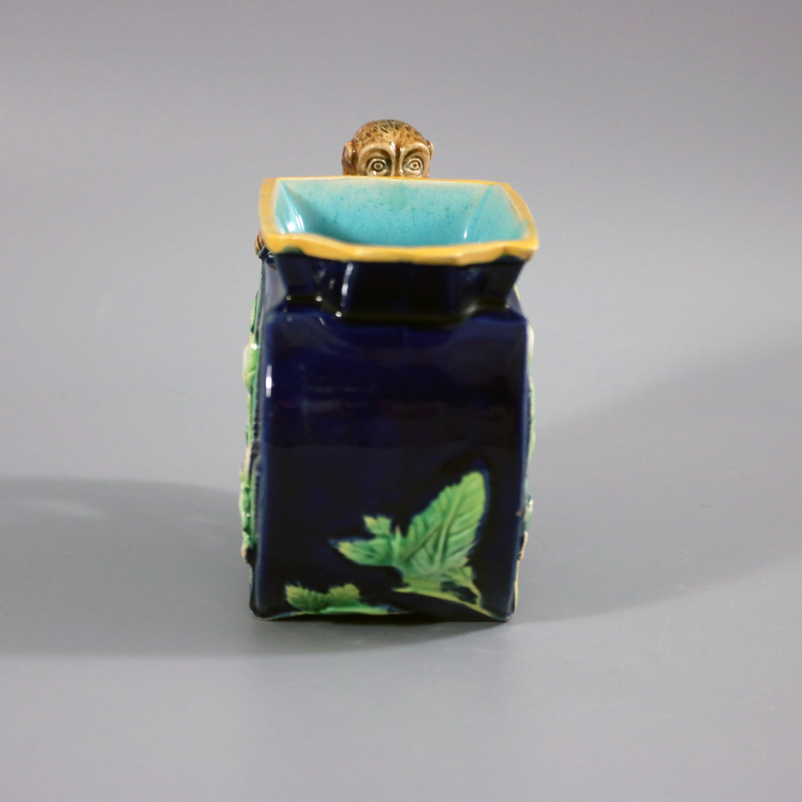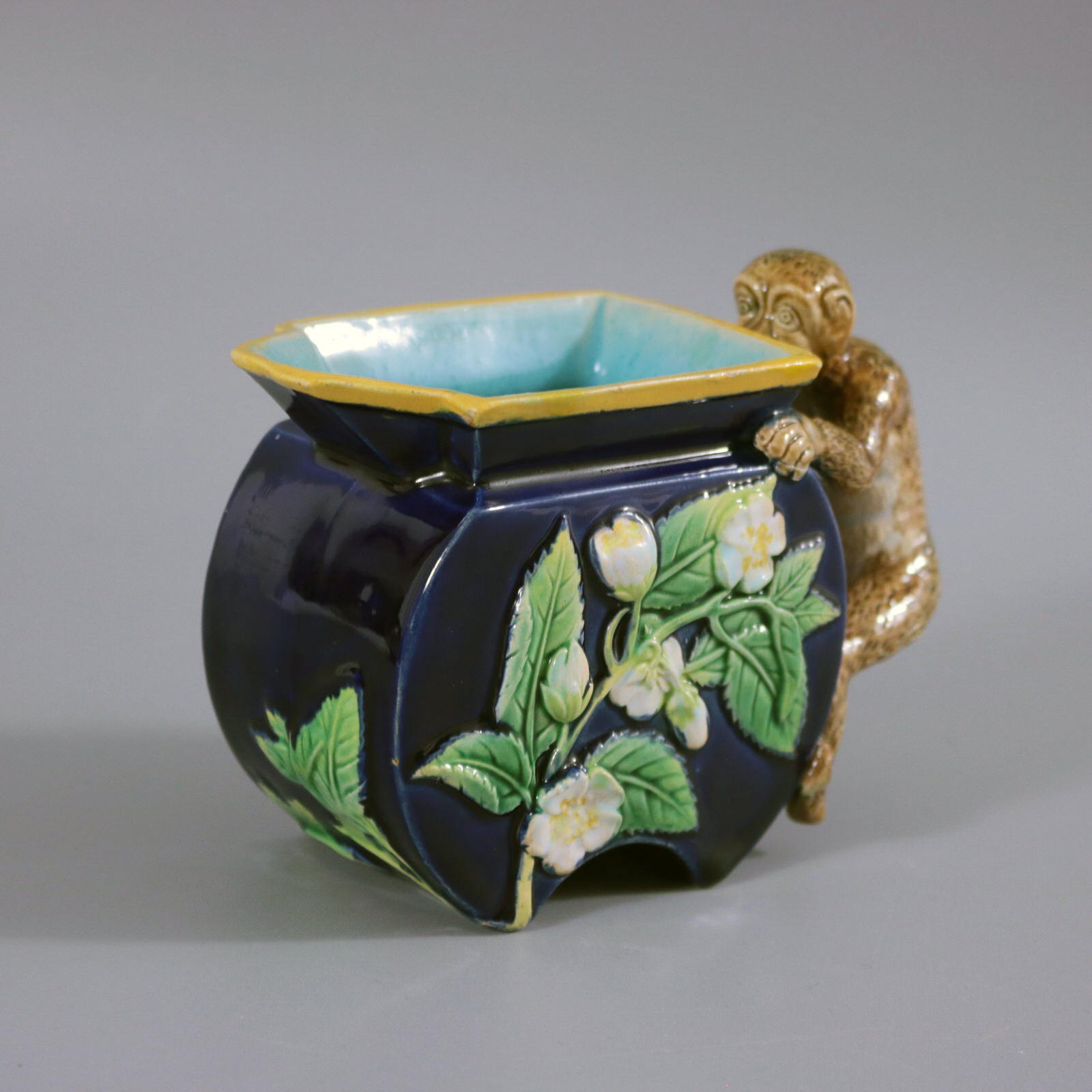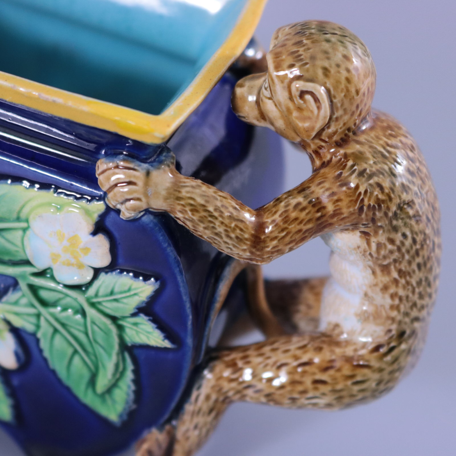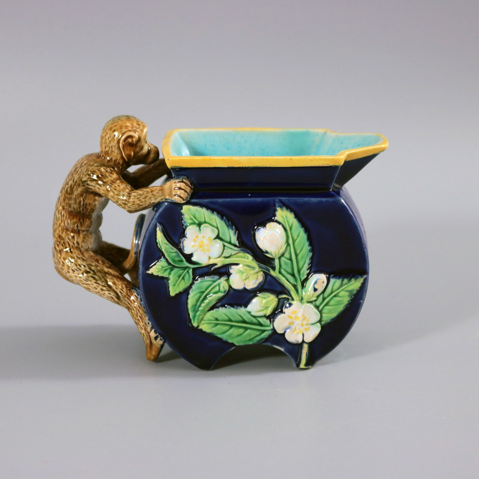 Victorian, circa 1875. 3.5ins high, 4.7ins wide, 2.1ins depth. George Jones Majolica creamer which features flowers and leaves to the sides and the handle in the form of a monkey.