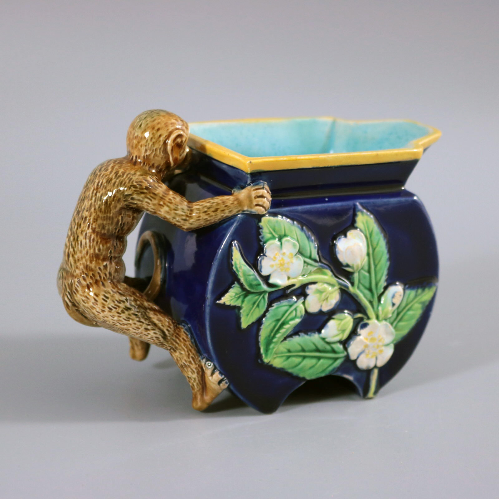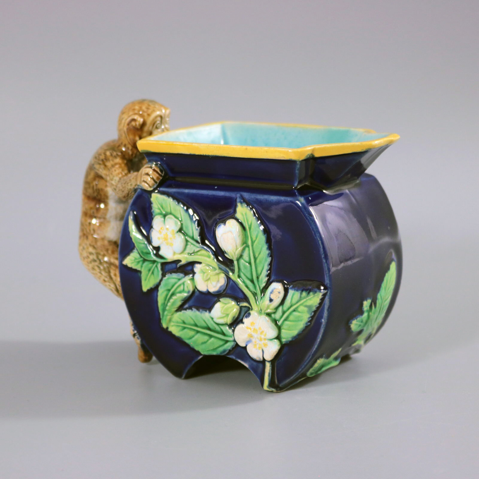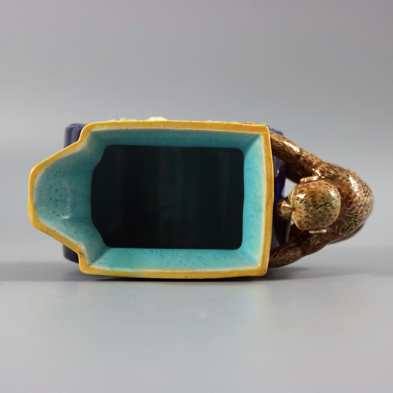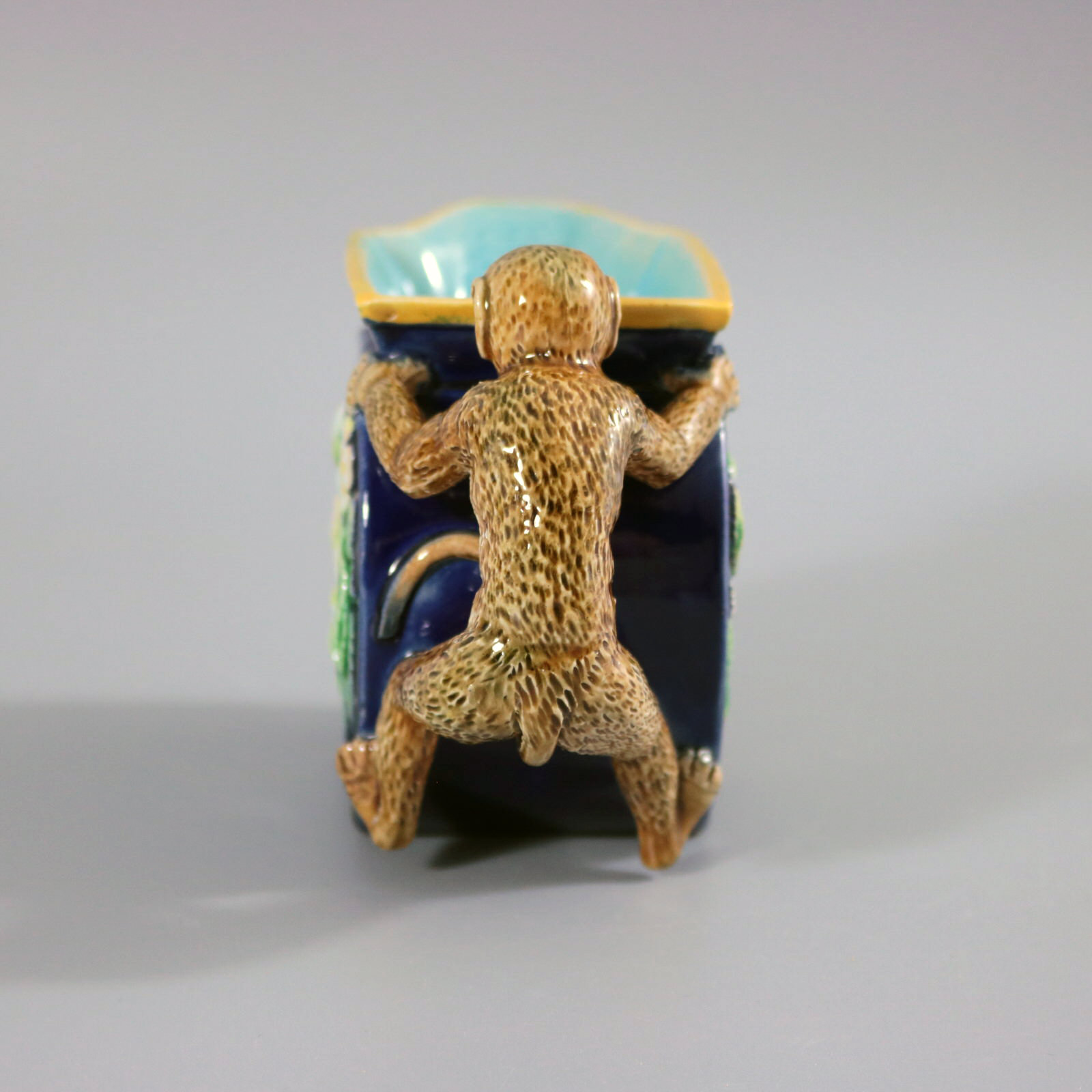 Victorian, circa 1875. 3.5ins high, 4.7ins wide, 2.1ins depth. George Jones Majolica creamer which features flowers and leaves to the sides and the handle in the form of a monkey.