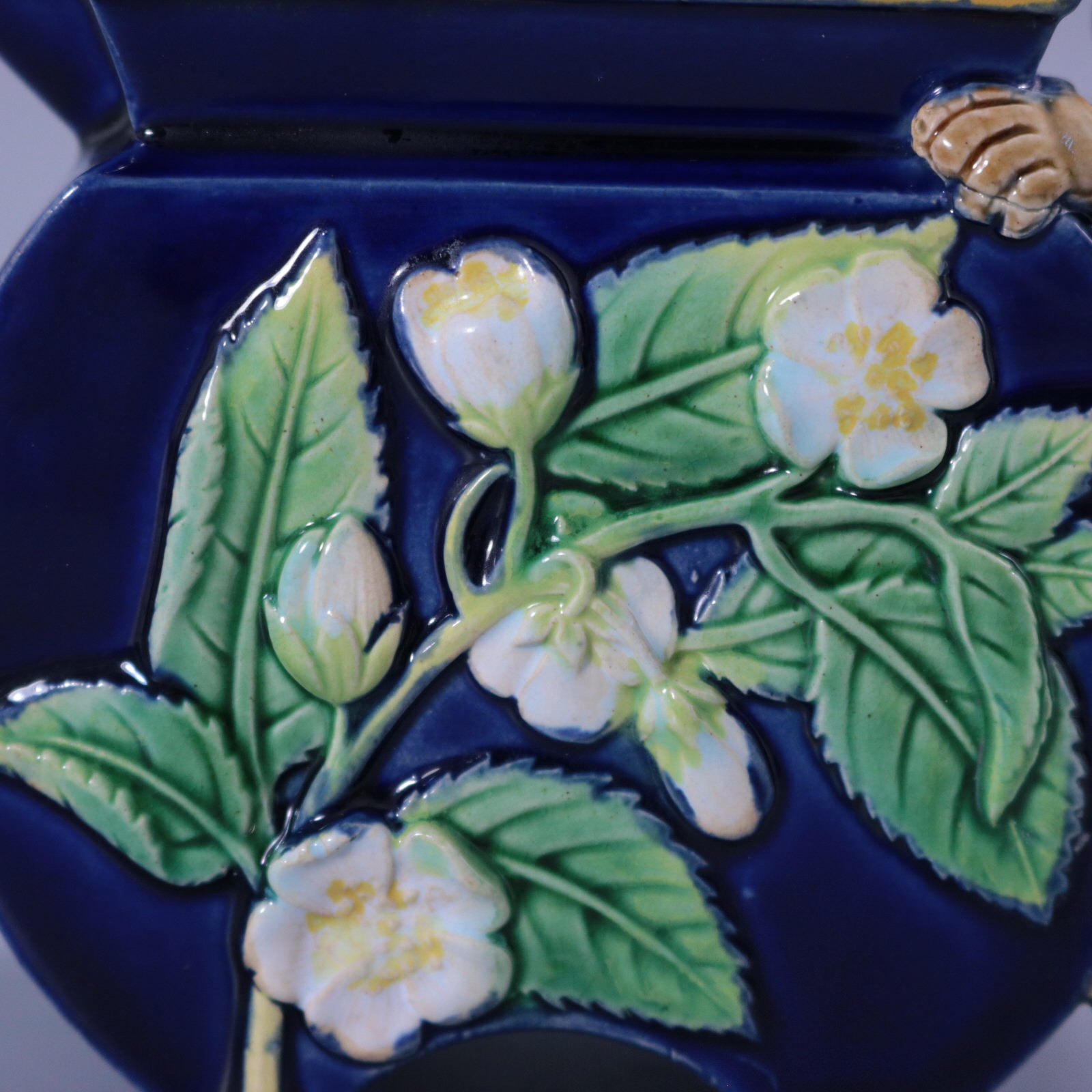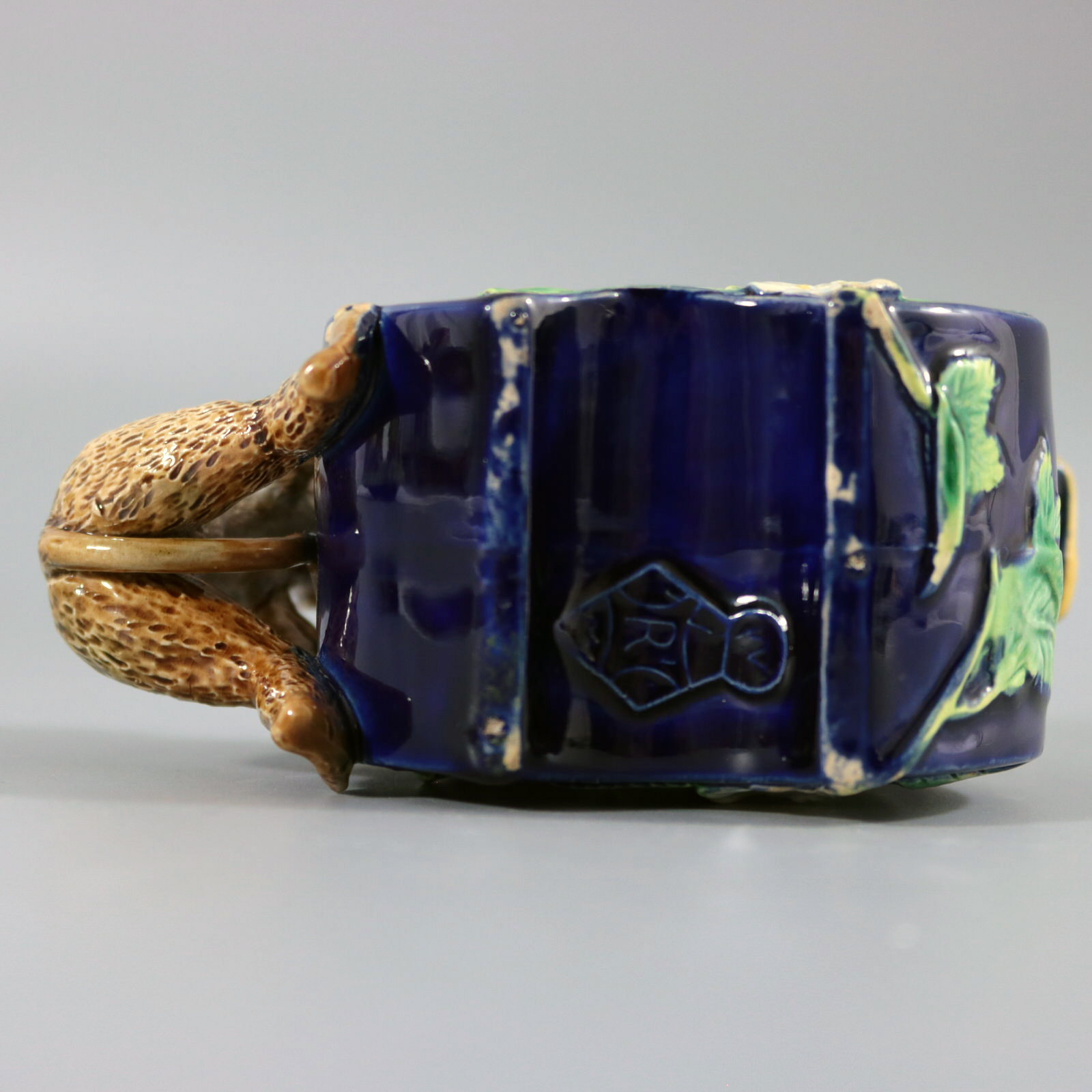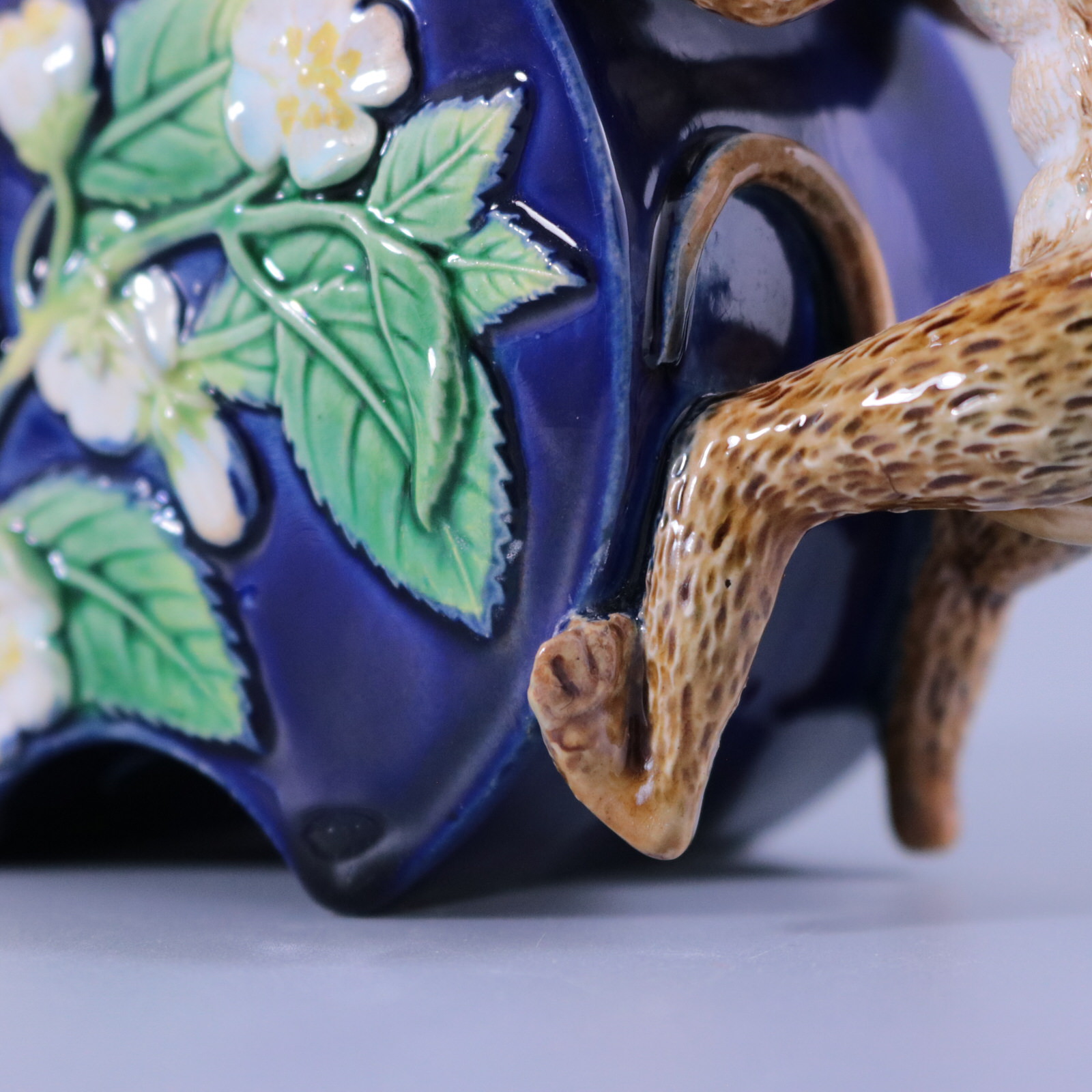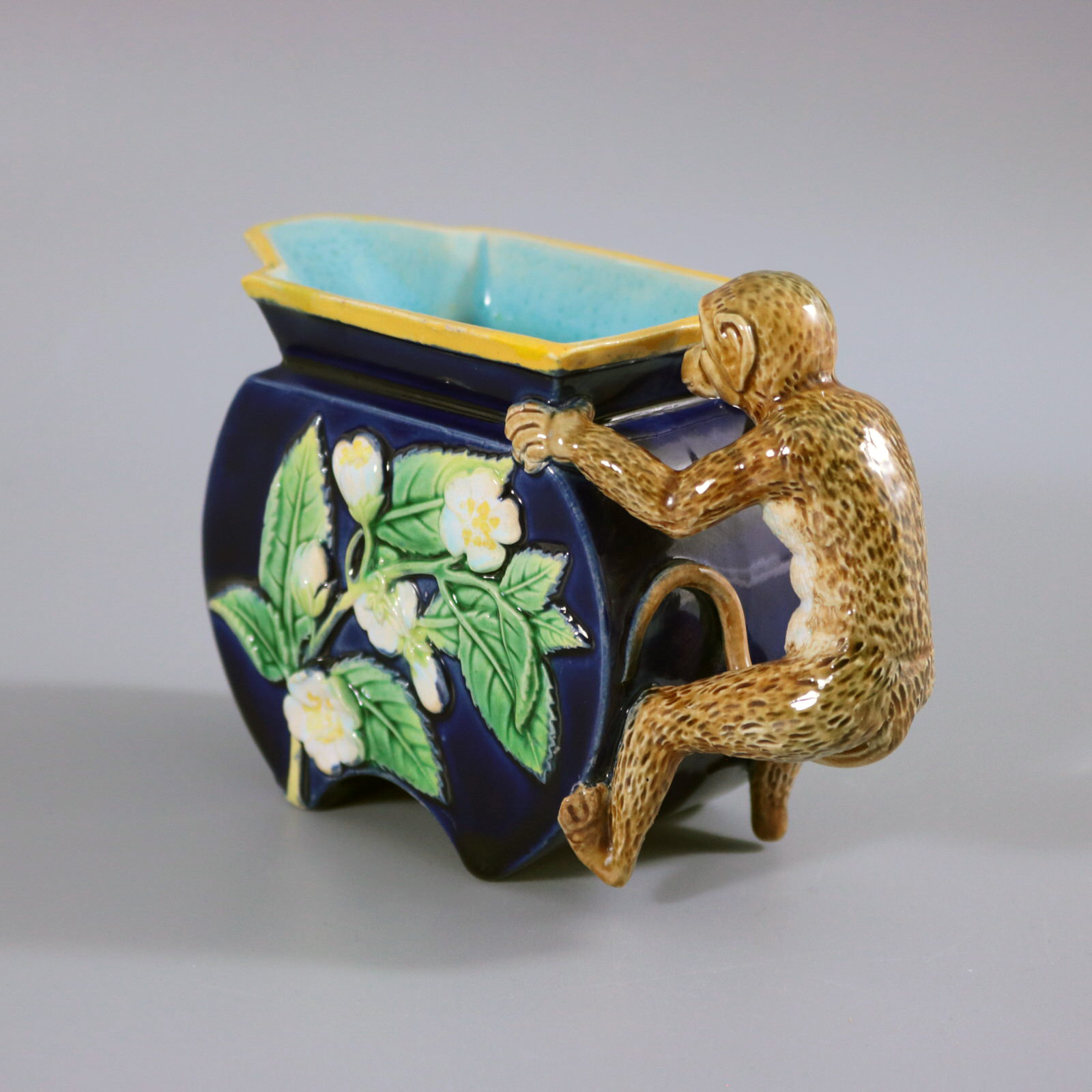 Victorian, circa 1875. 3.5ins high, 4.7ins wide, 2.1ins depth. George Jones Majolica creamer which features flowers and leaves to the sides and the handle in the form of a monkey.