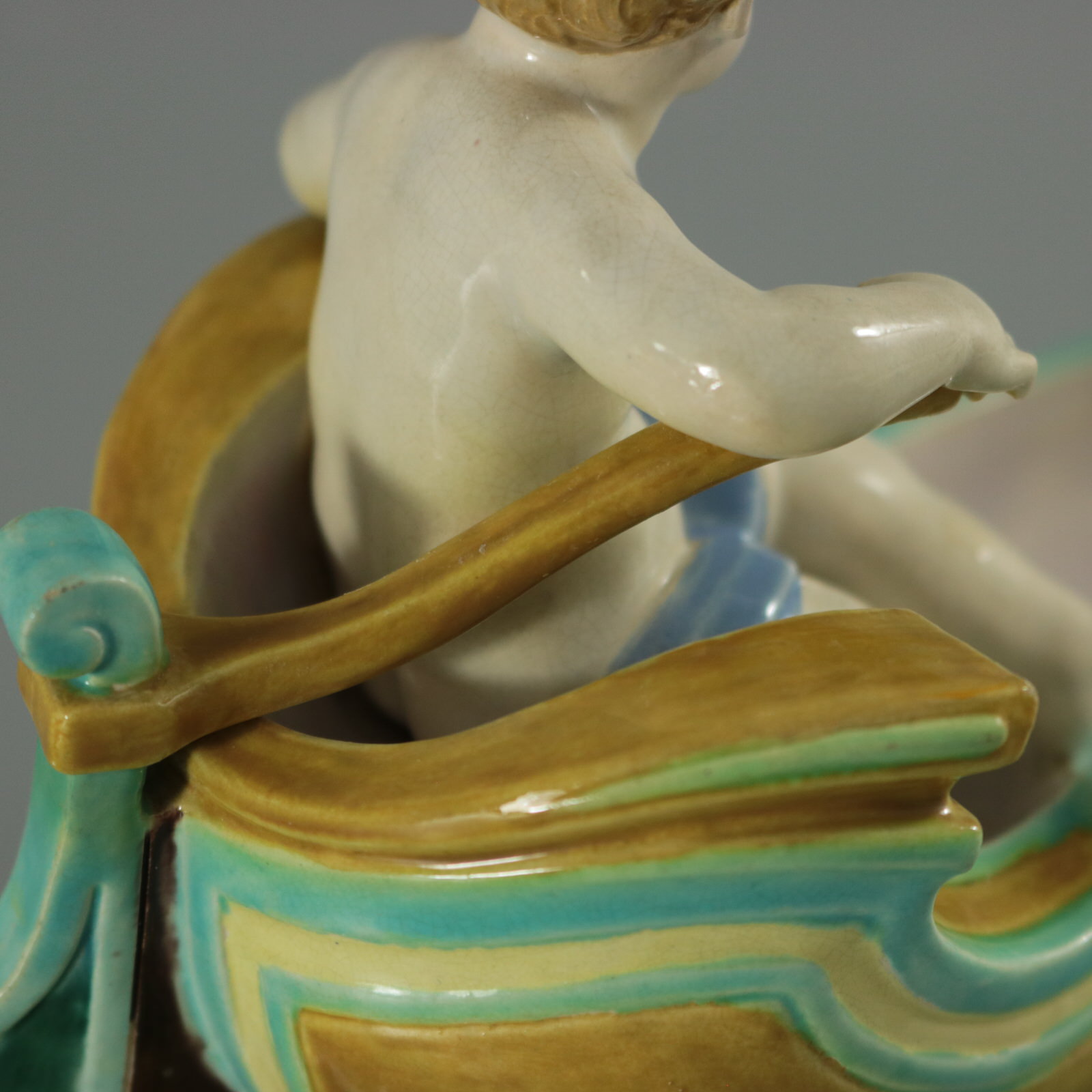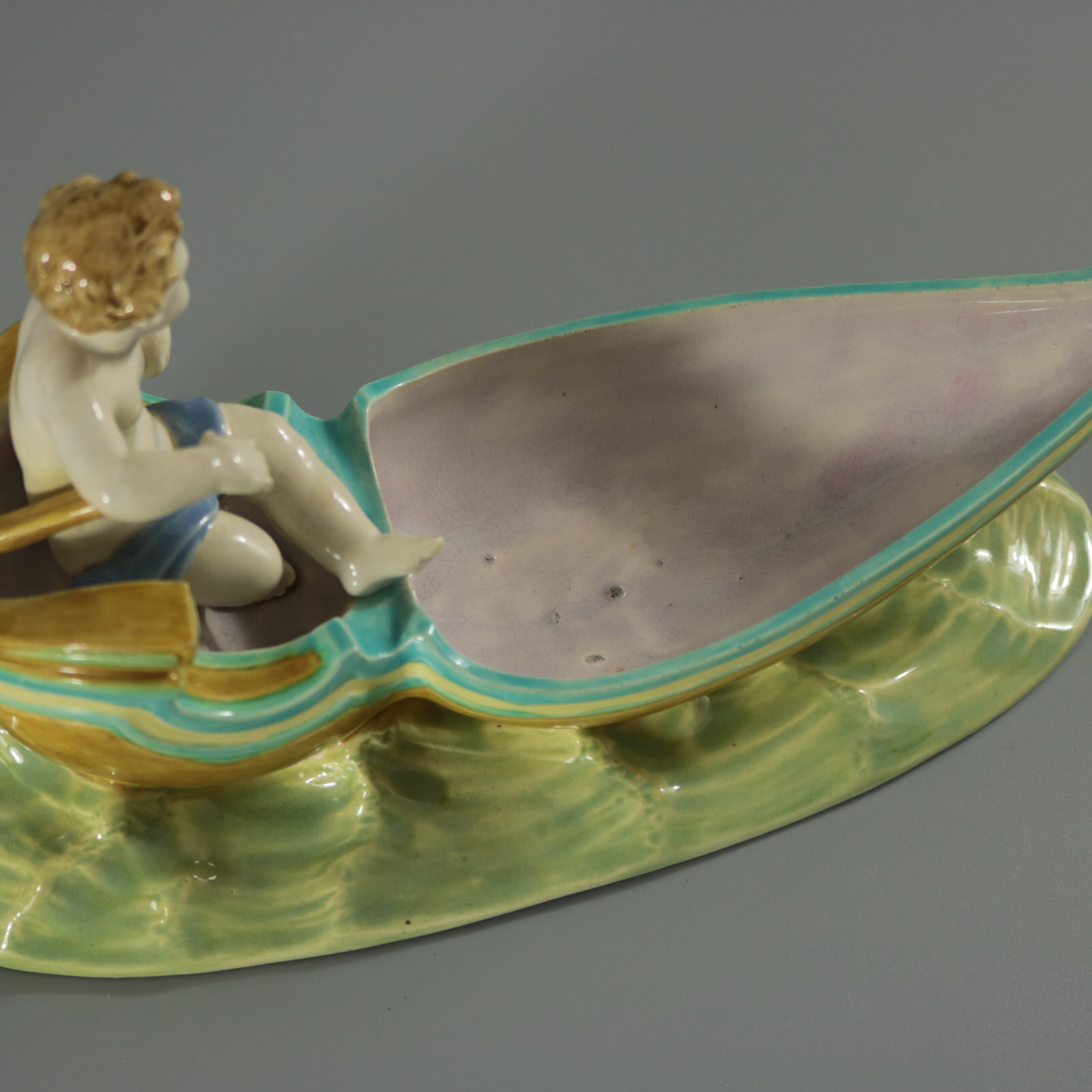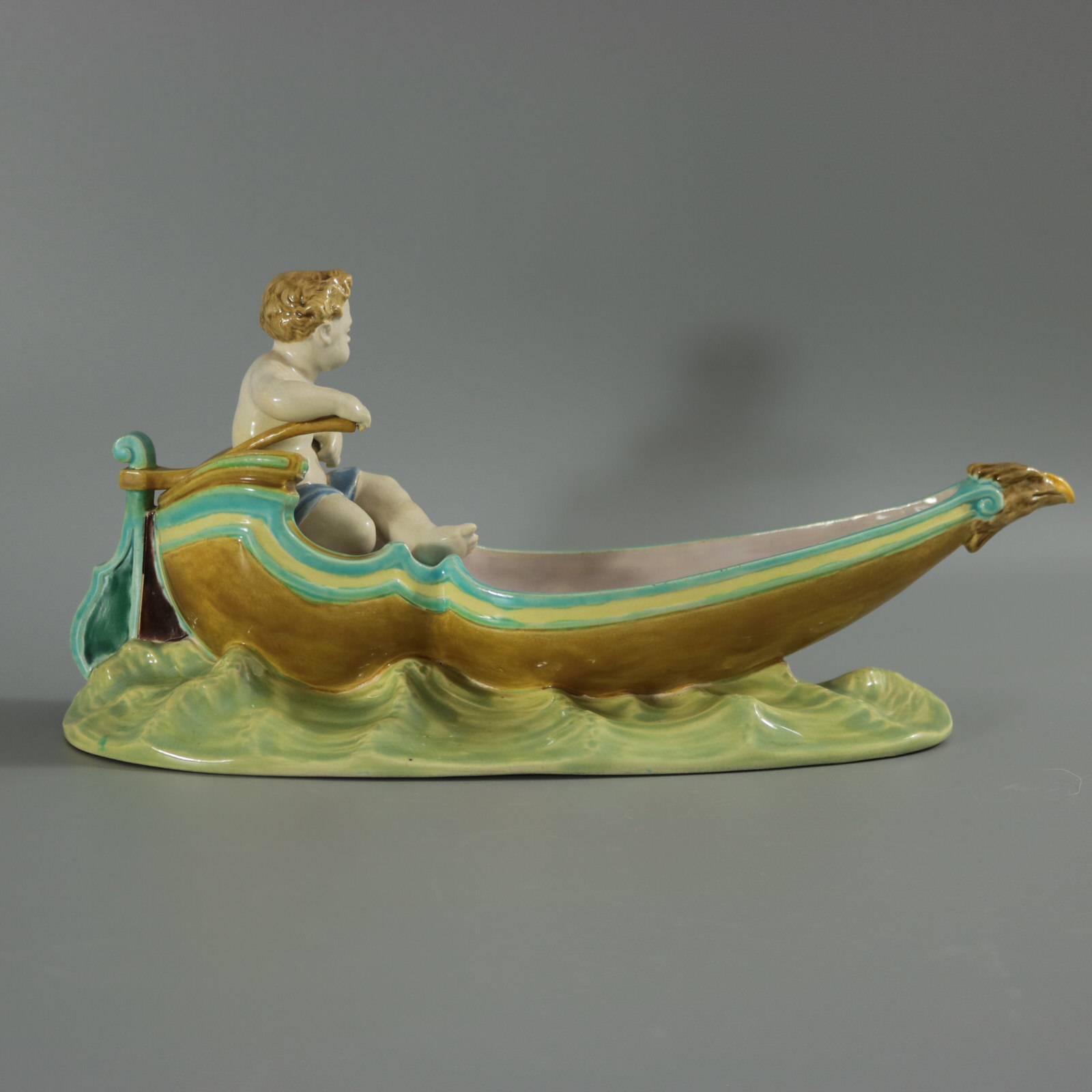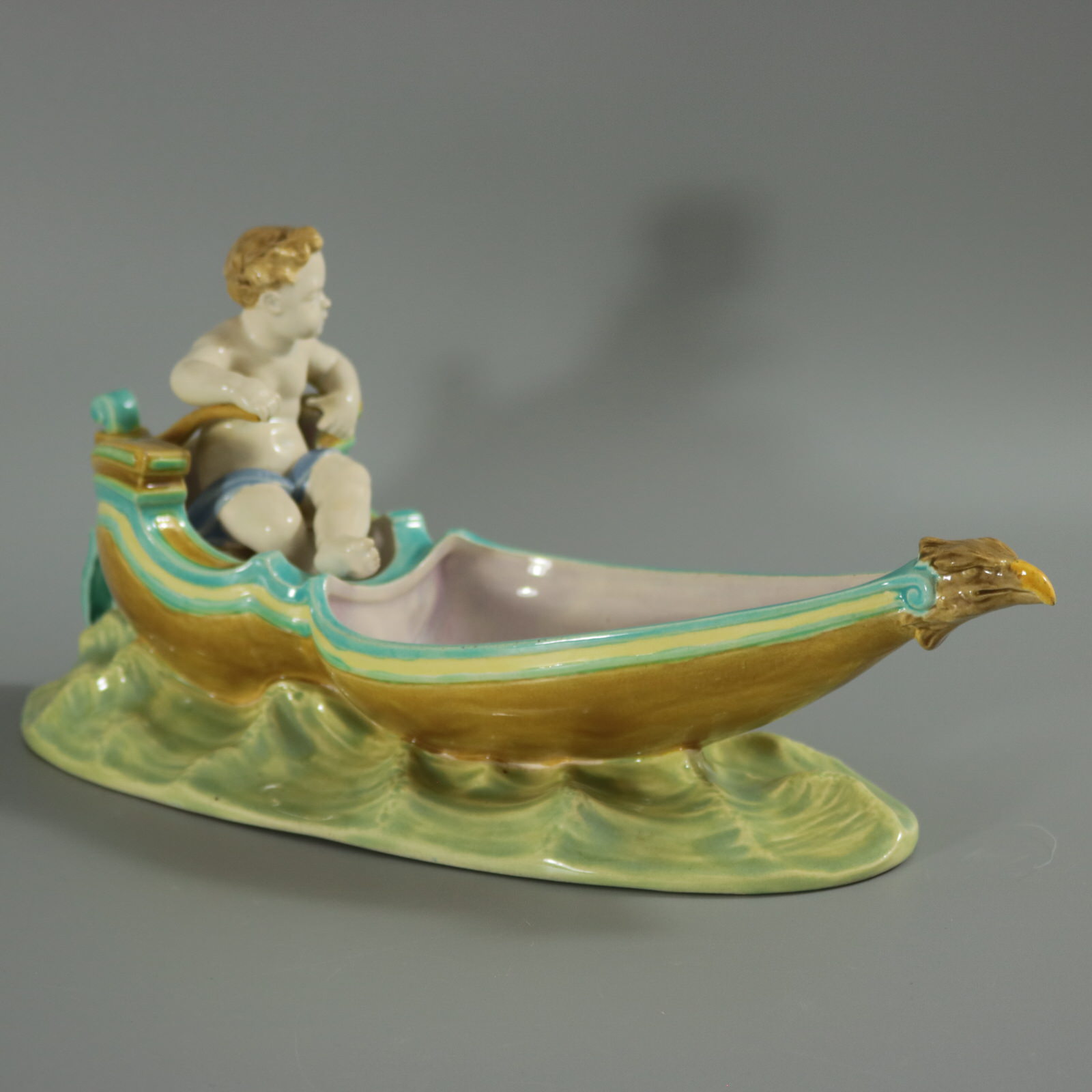 Victorian, circa 1880. 5.1ins high, 11.2ins wide, 4.3ins depth. Royal Worcester Majolica figural dish which features a putto seated on a gondola boat, with an eagle figurehead.
