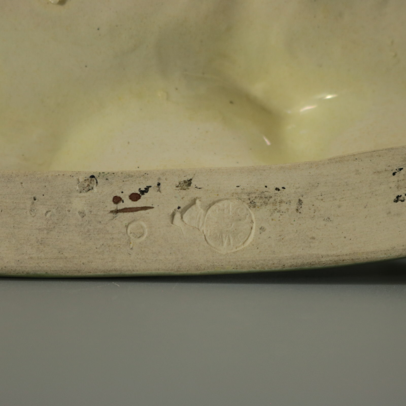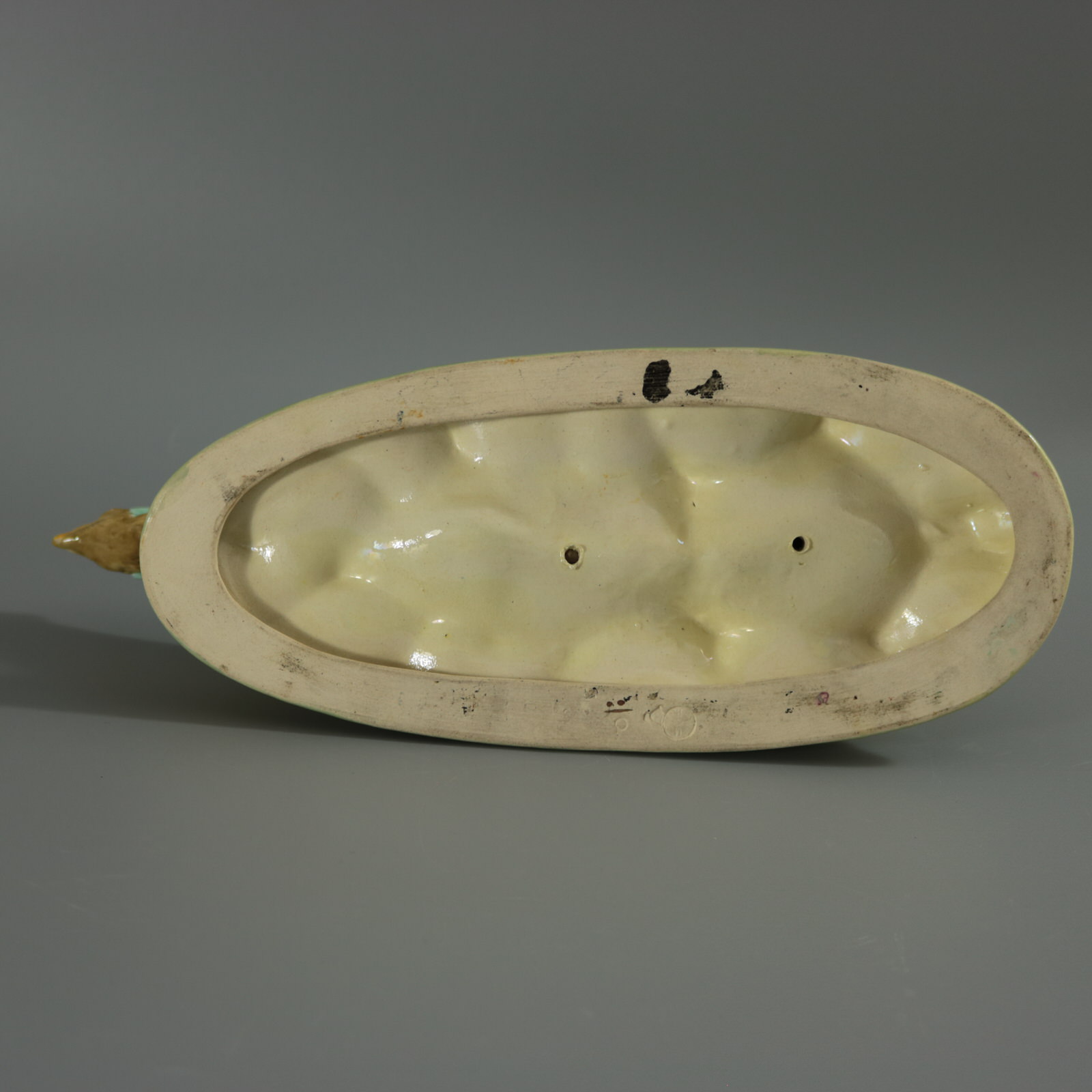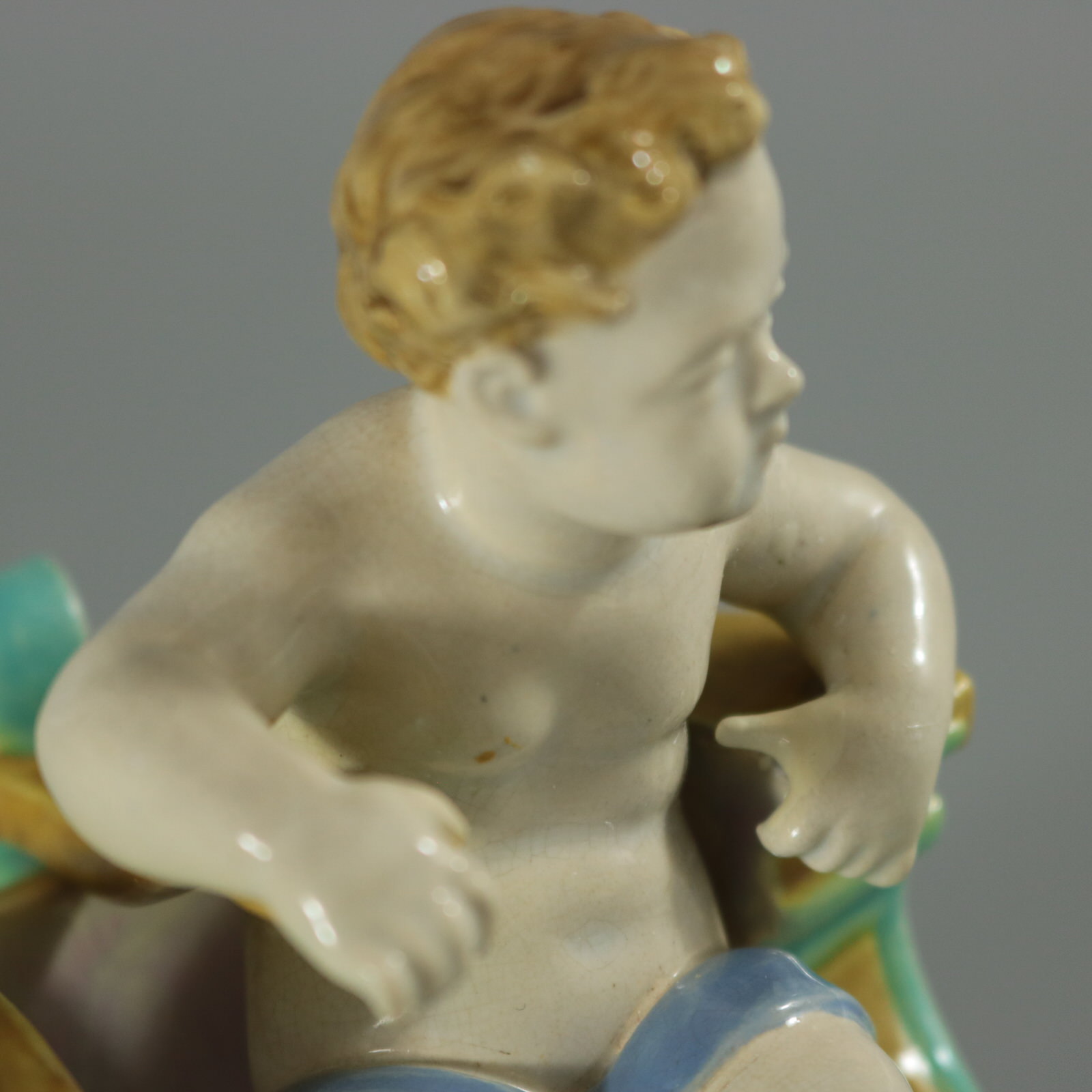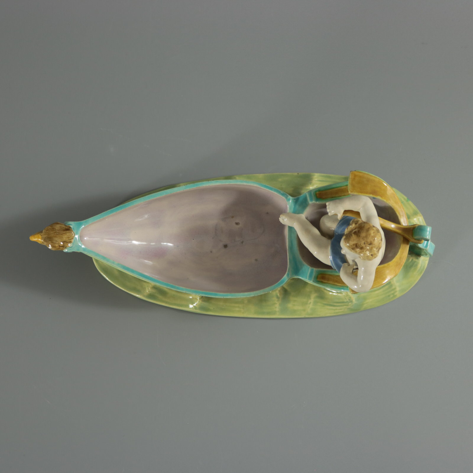 Victorian, circa 1880. 5.1ins high, 11.2ins wide, 4.3ins depth. Royal Worcester Majolica figural dish which features a putto seated on a gondola boat, with an eagle figurehead.