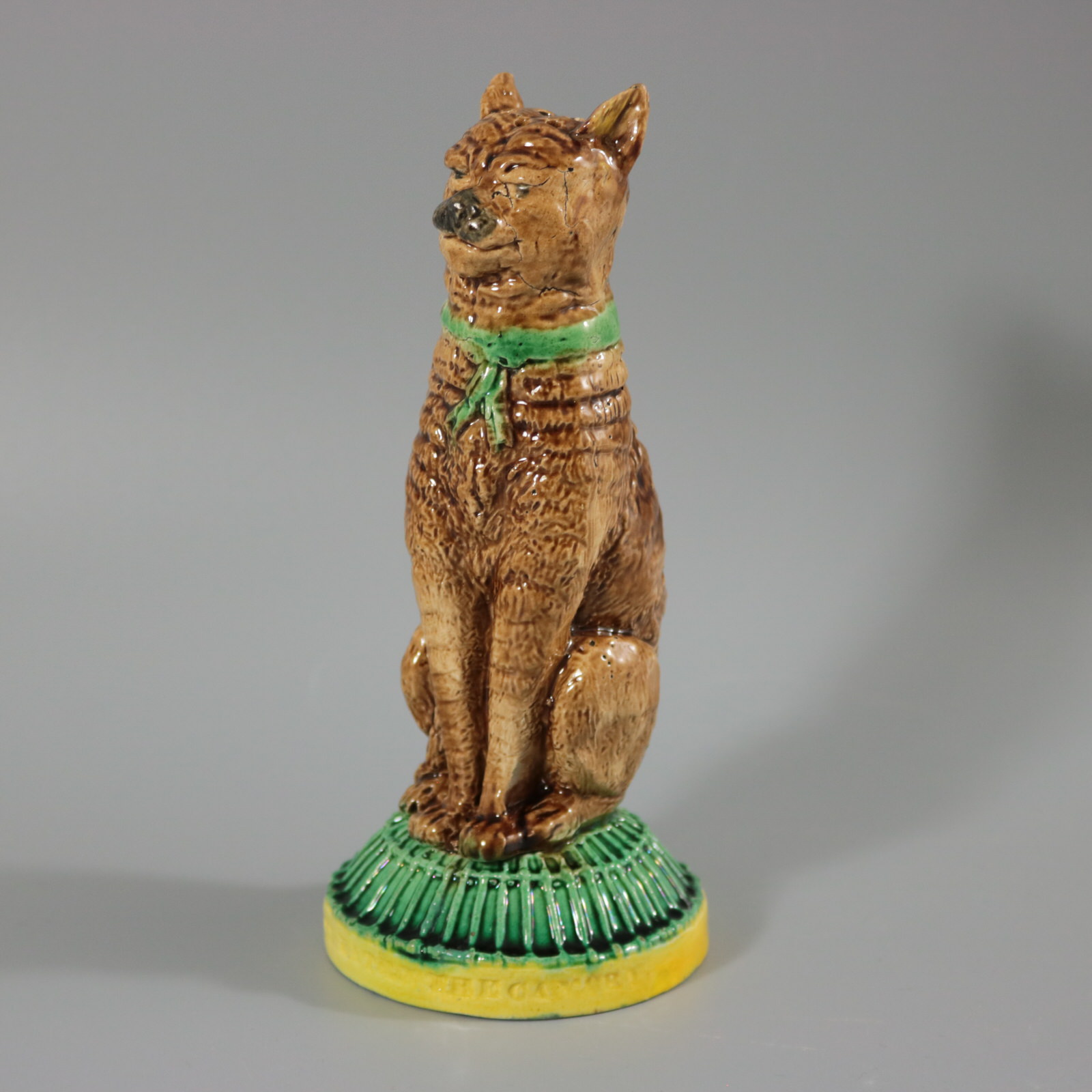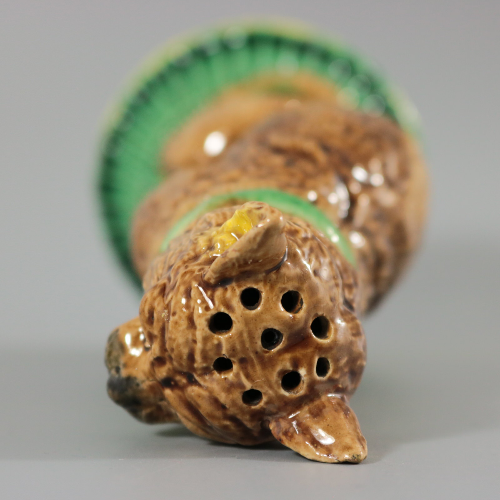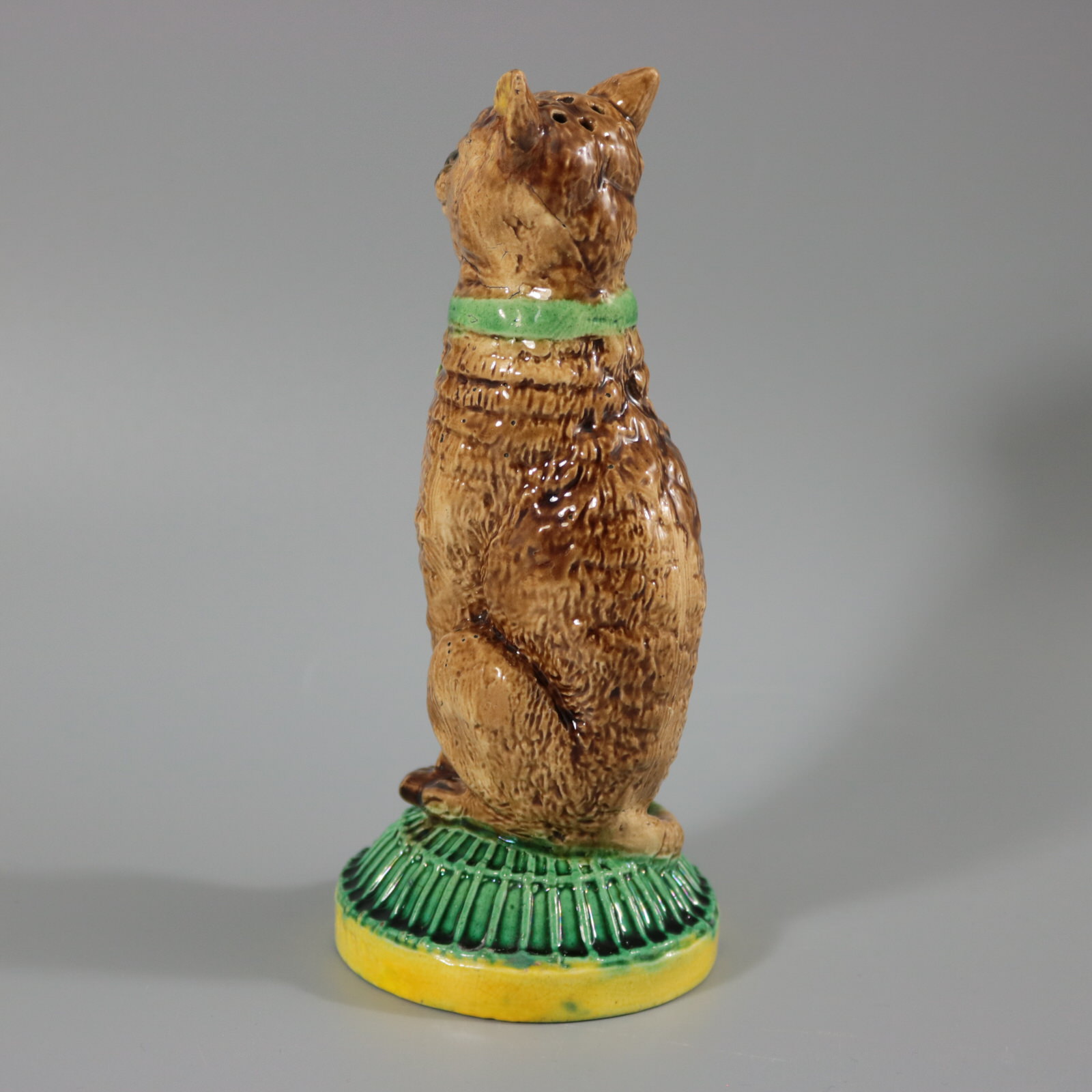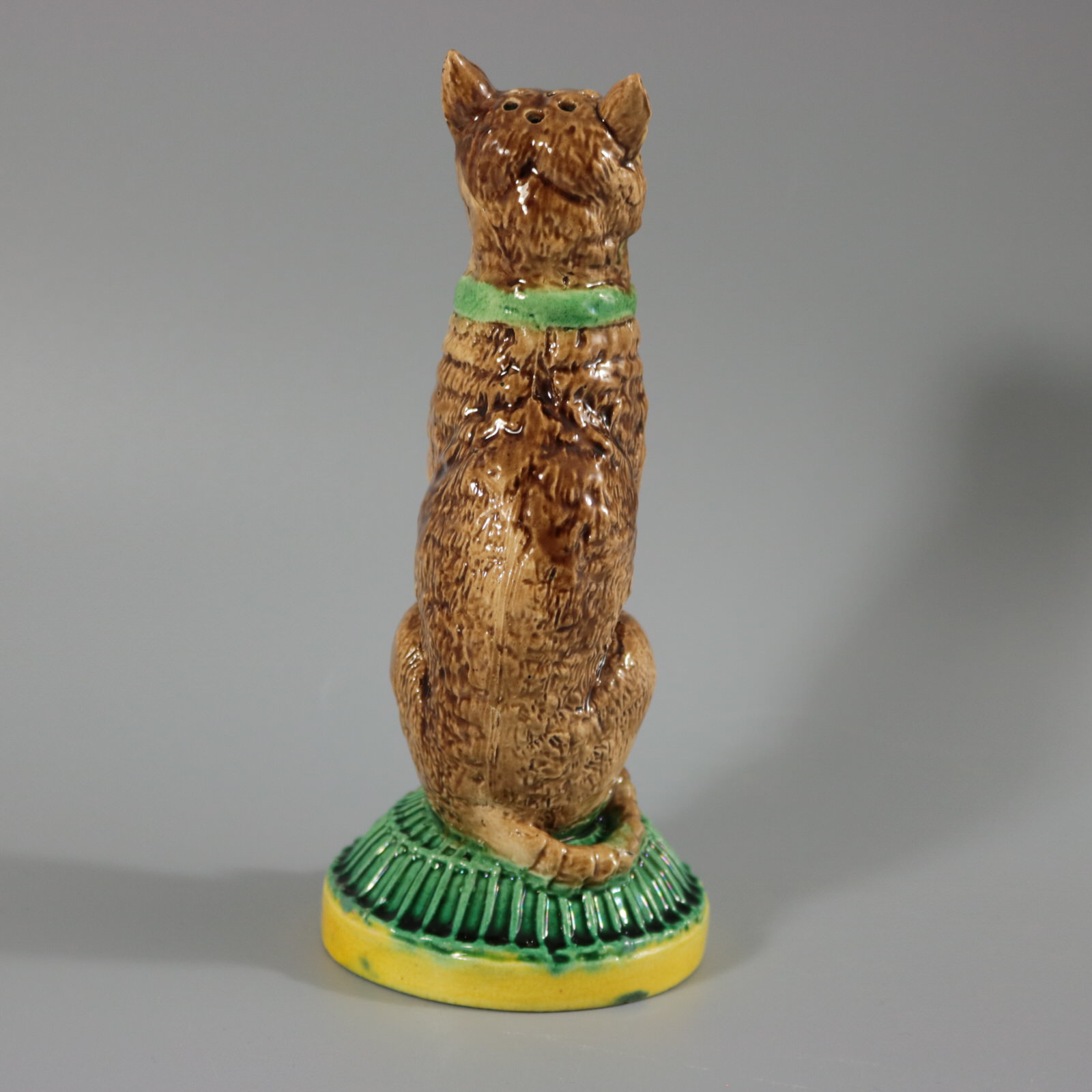 Victorian, circa 1880. 6.9ins high, 3ins wide, 3ins depth. Unidentified English Majolica pepper/salt shaker which features a seated cat, with a self-satisfied expression on it's face. Base in the form of a cage, impressed, 'IVE EATEN THE CANARY'.