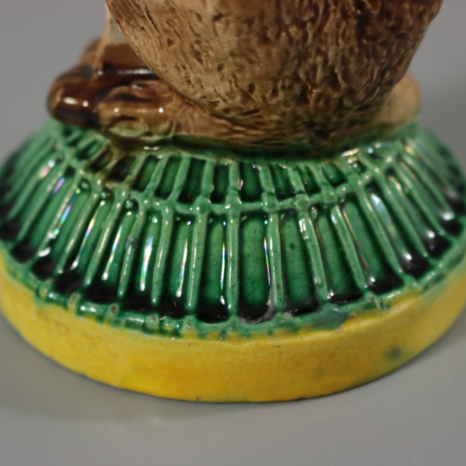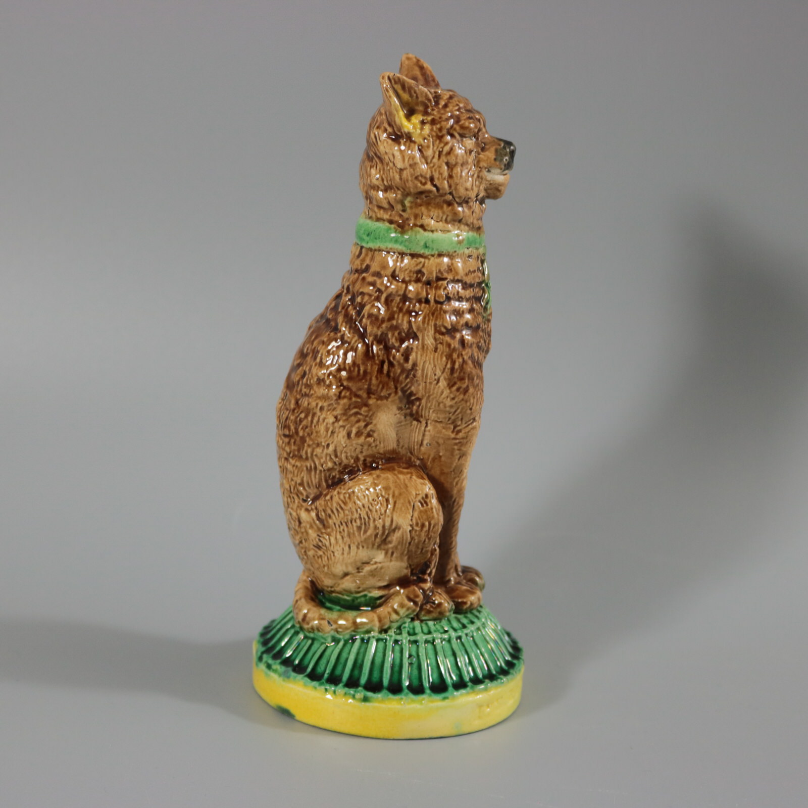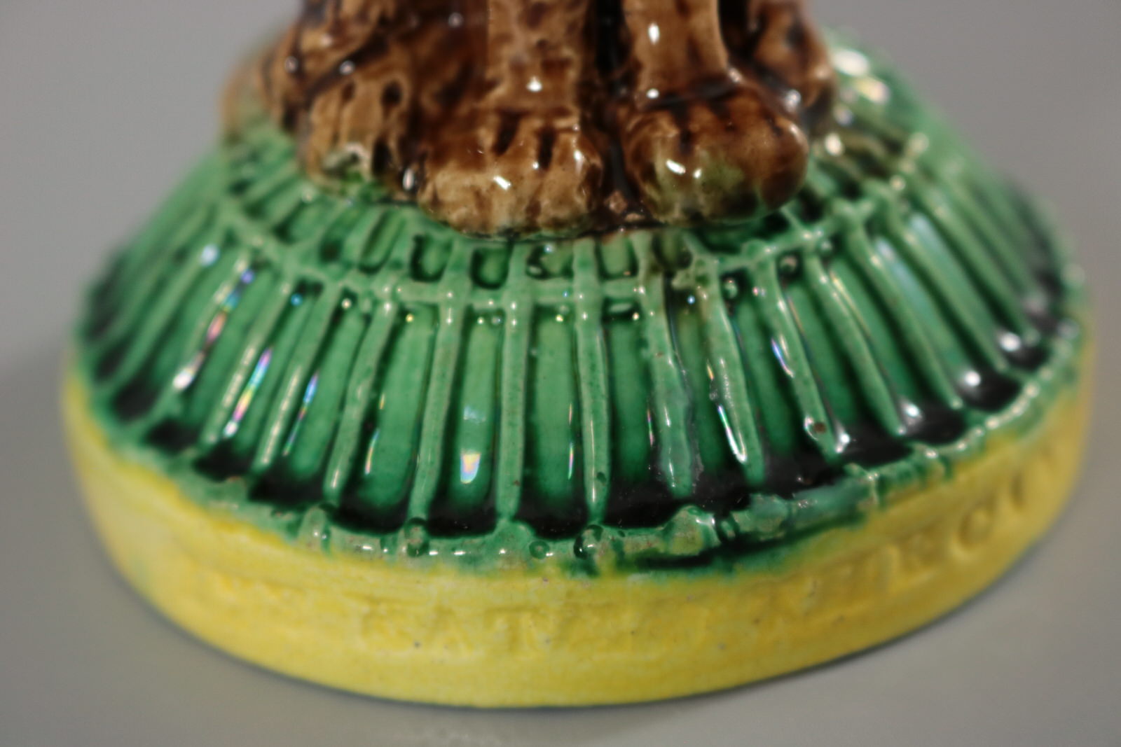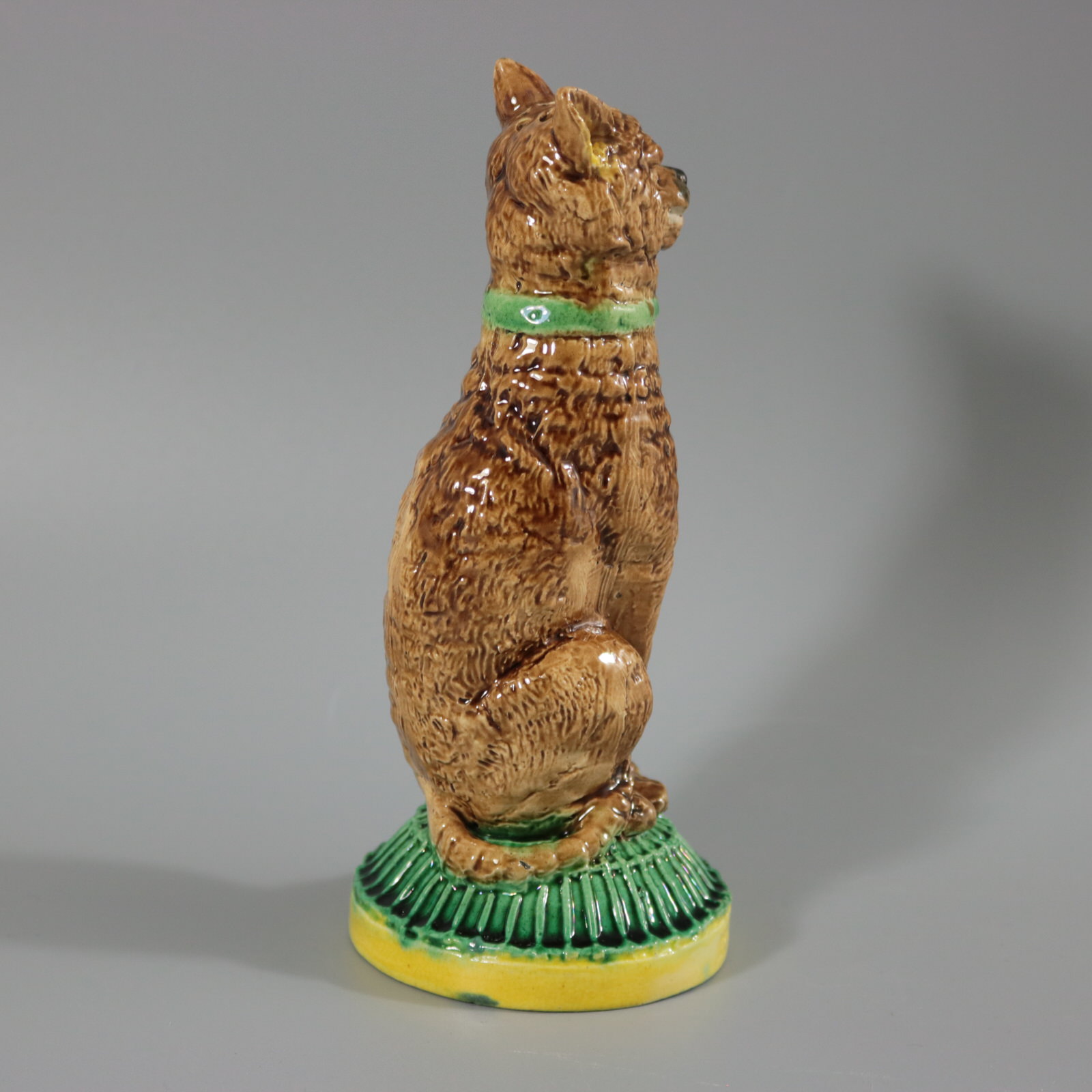 Victorian, circa 1880. 6.9ins high, 3ins wide, 3ins depth. Unidentified English Majolica pepper/salt shaker which features a seated cat, with a self-satisfied expression on it's face. Base in the form of a cage, impressed, 'IVE EATEN THE CANARY'.