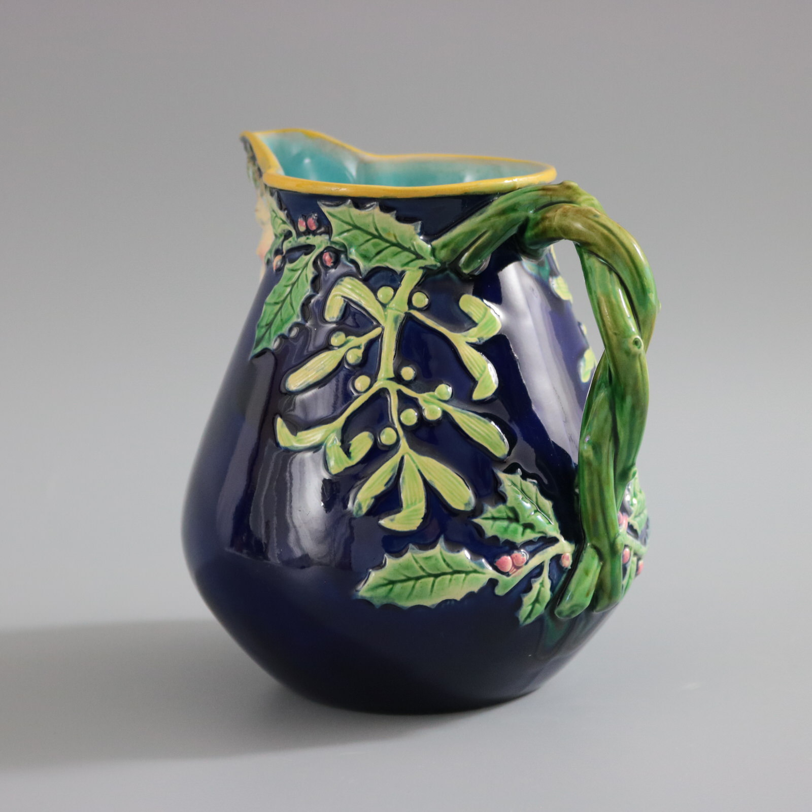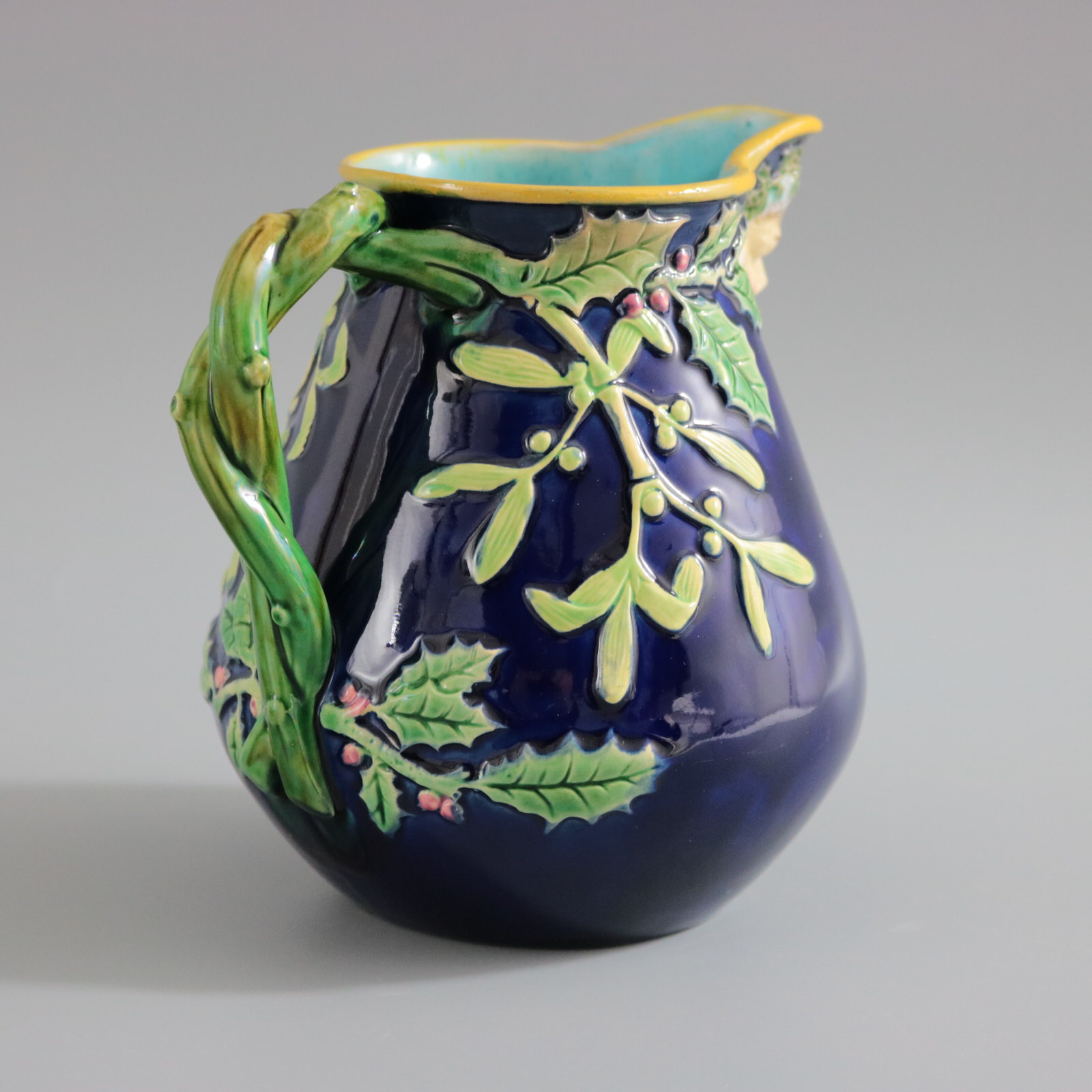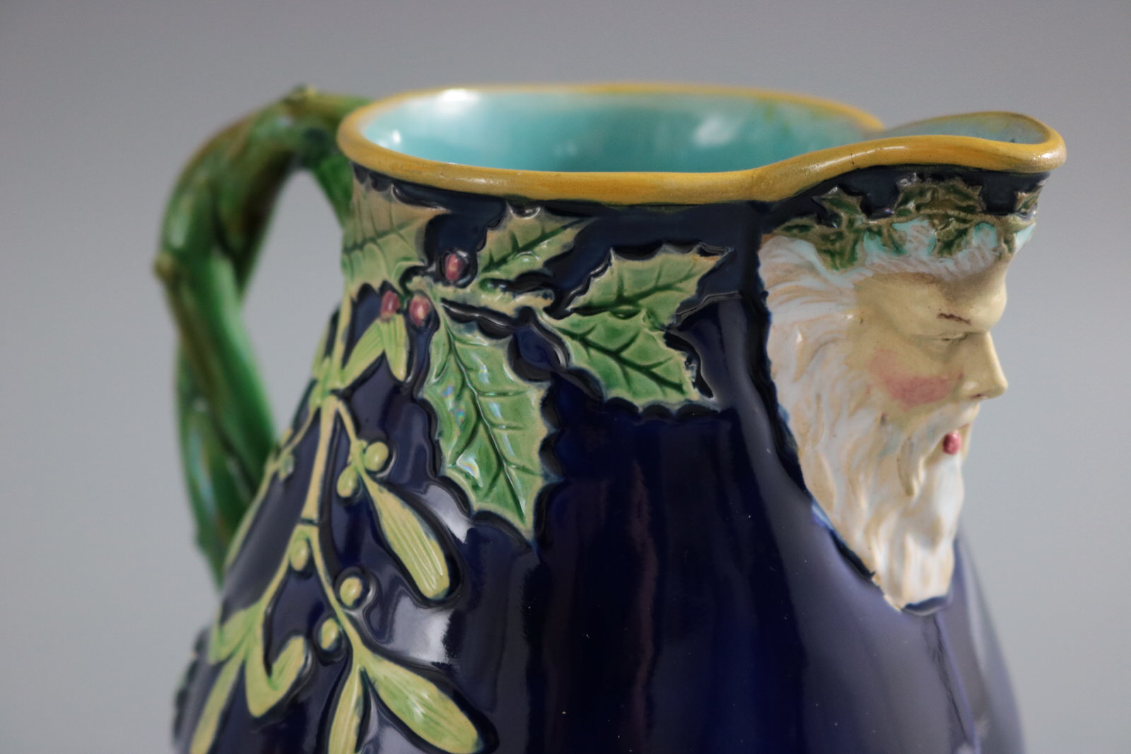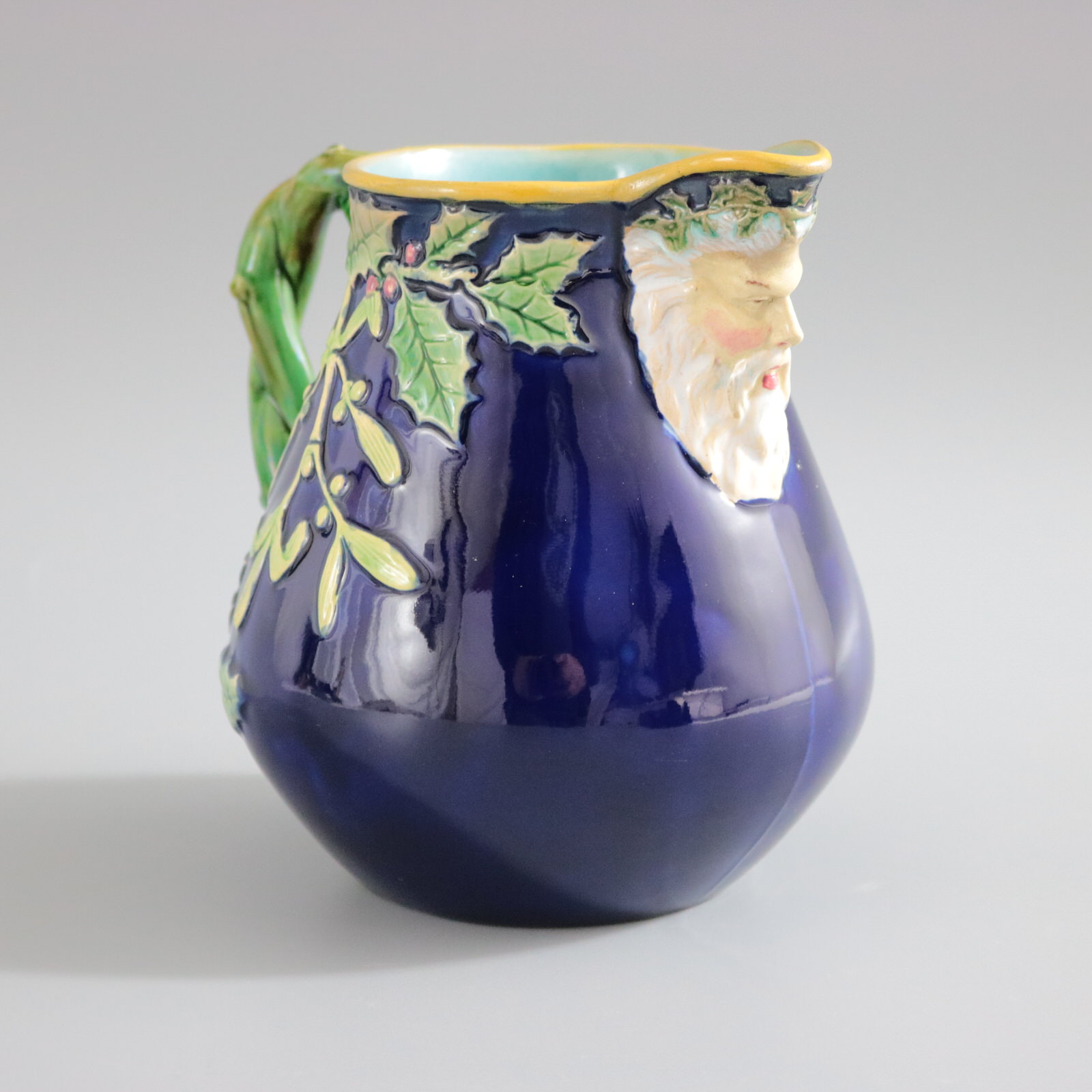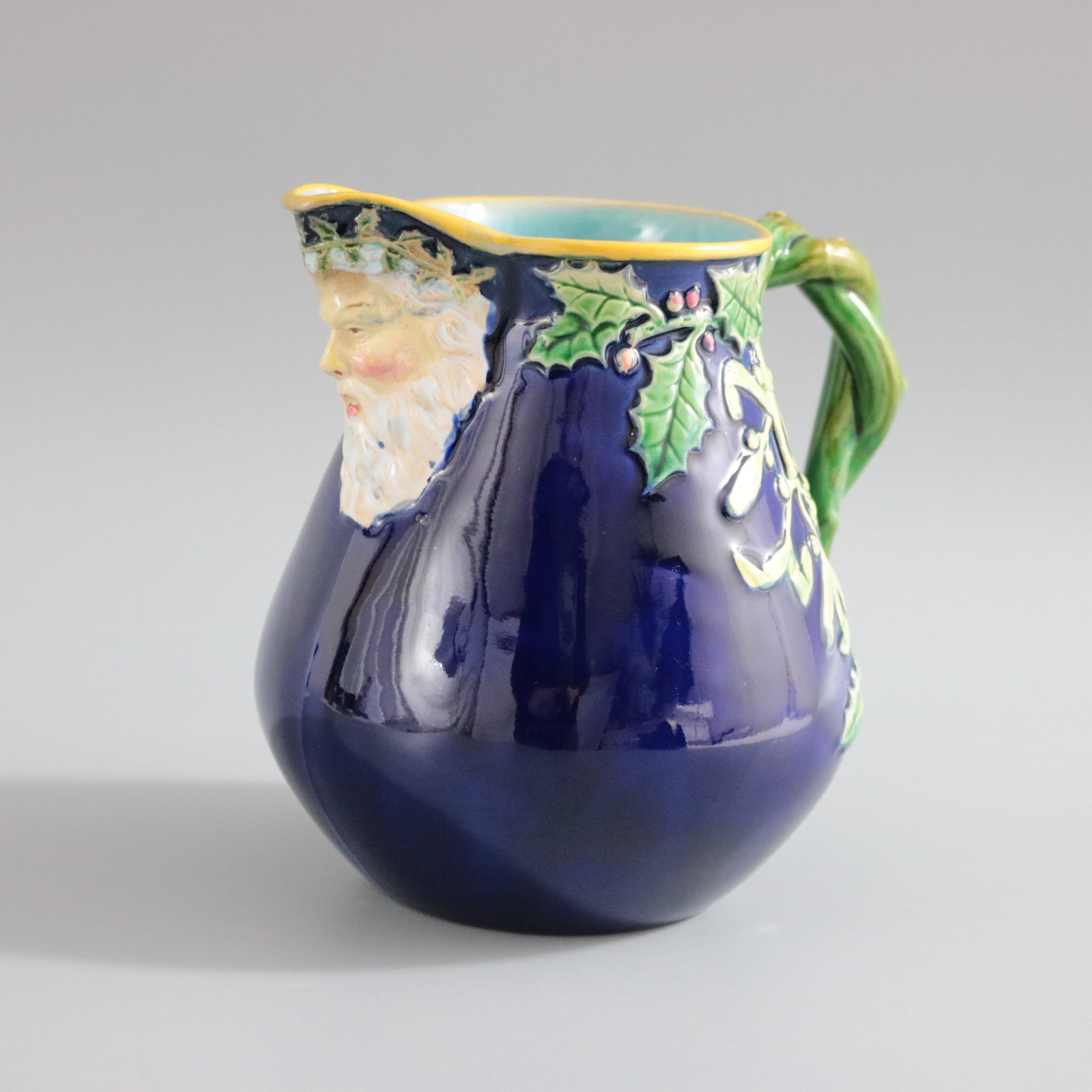 Victorian, circa 1875. 5.5ins high, 5.5ins wide, 4.1ins depth. George Jones Majolica jug/pitcher which features holly and mistletoe emanating from a twisted- branch handle. The spout molded with the head of Father Christmas wearing a crown of holly.