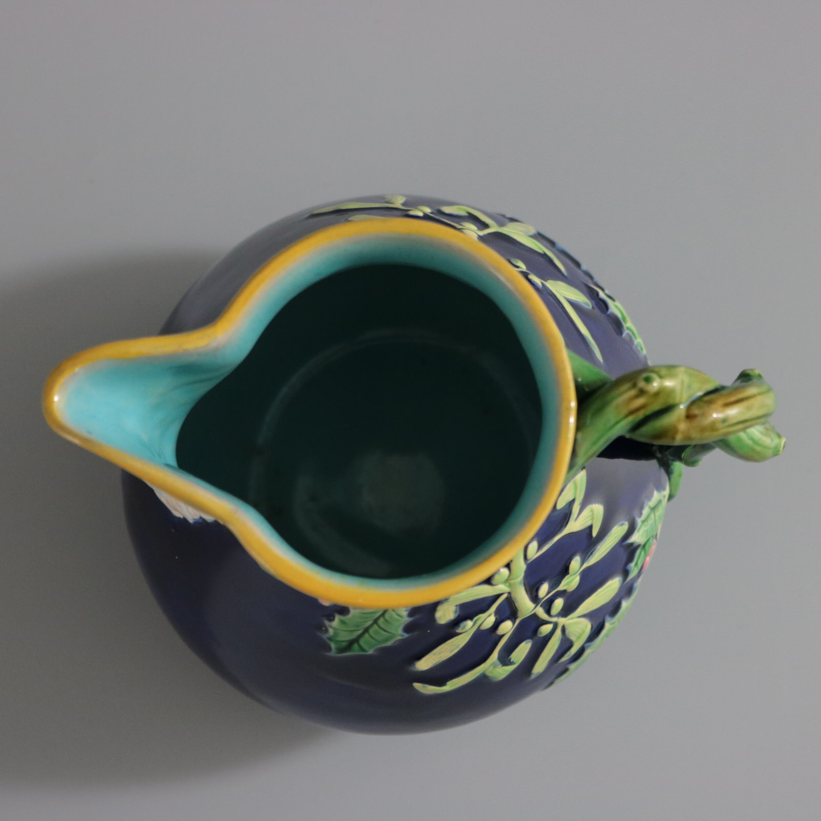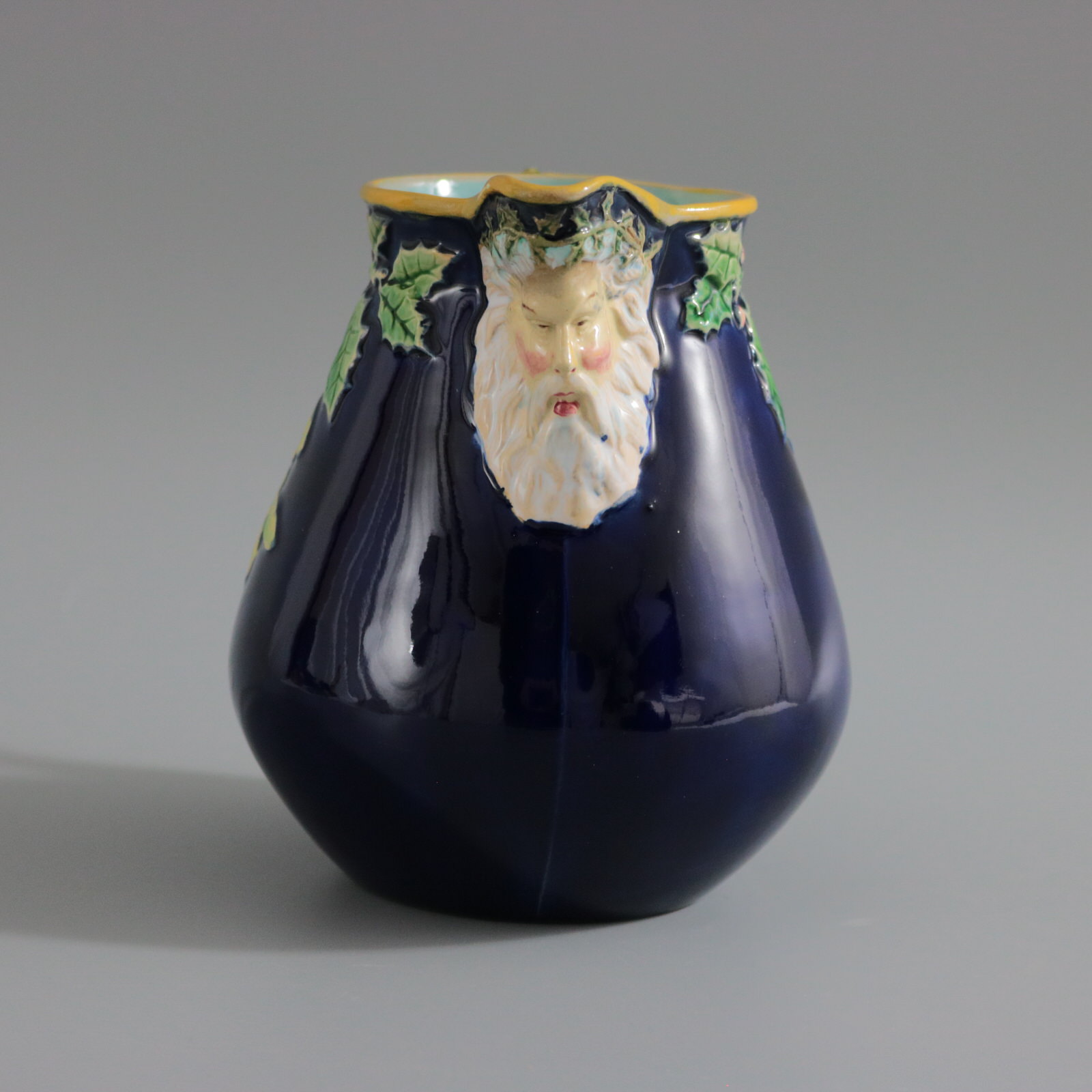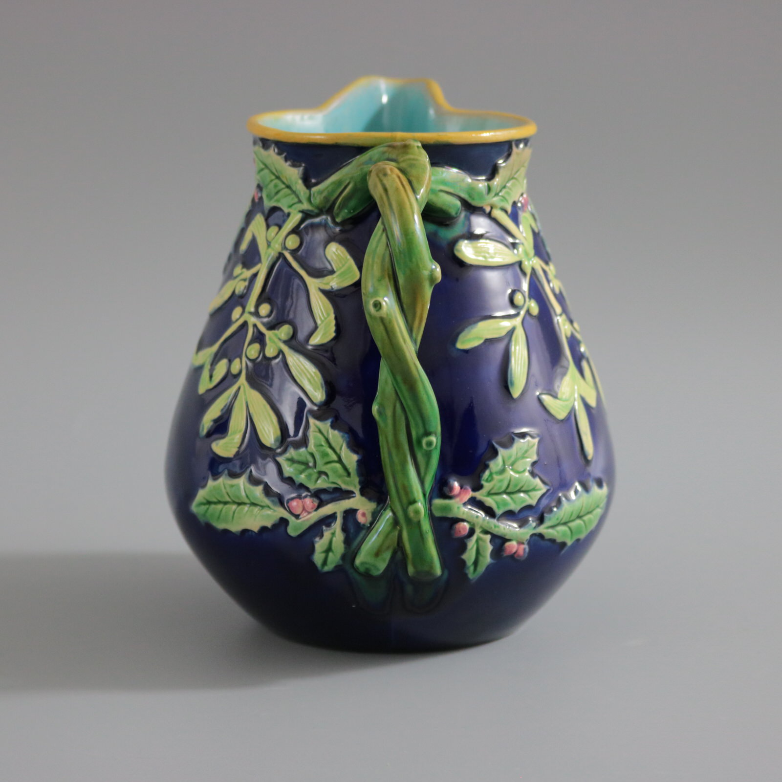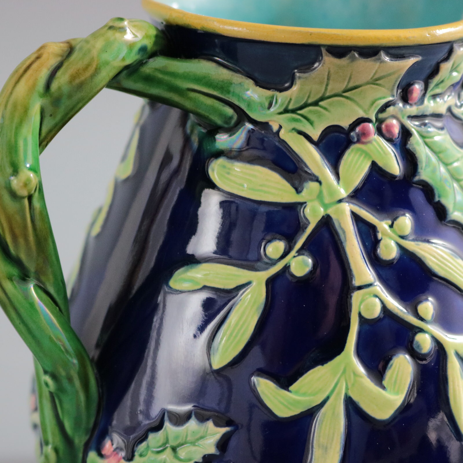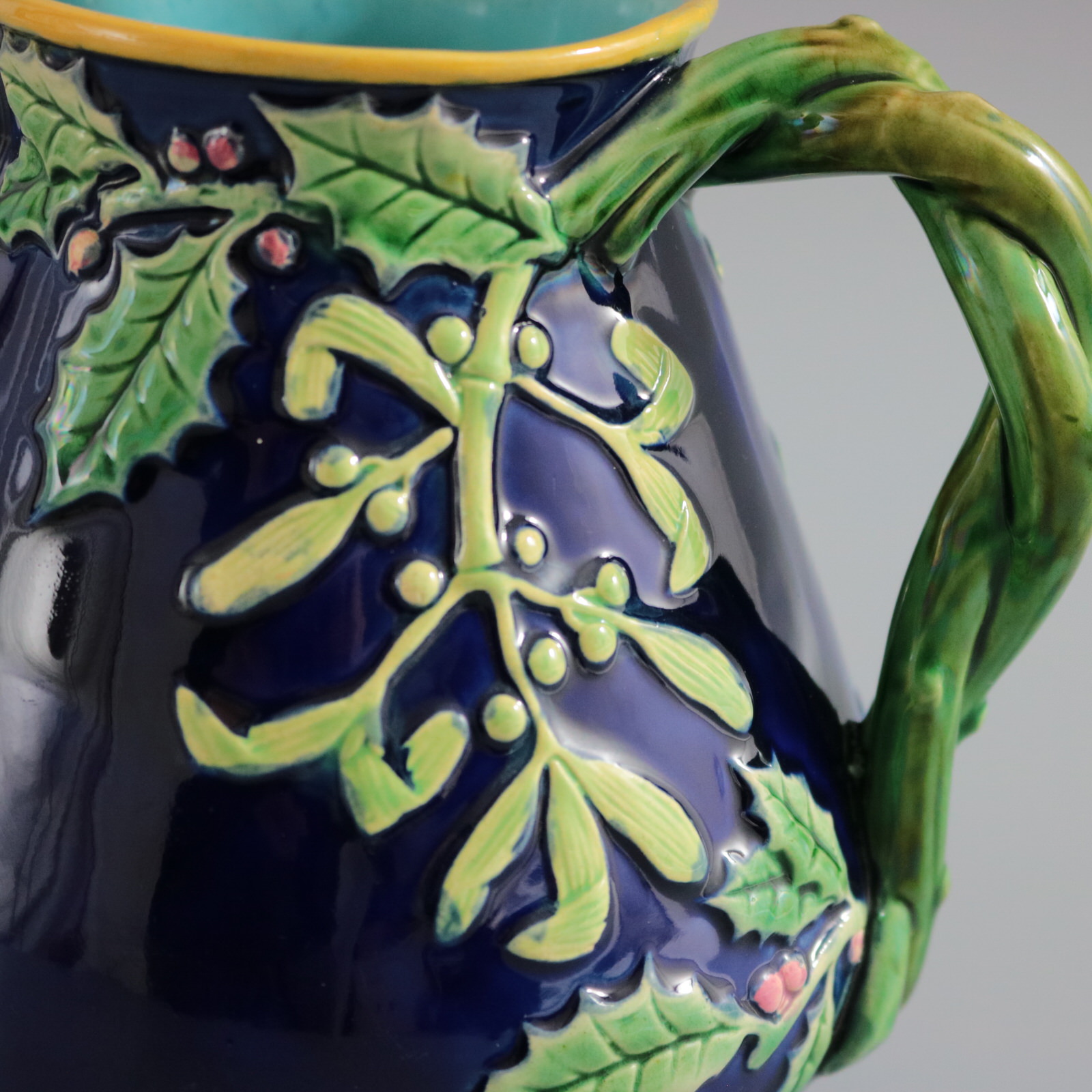 Victorian, circa 1875. 5.5ins high, 5.5ins wide, 4.1ins depth. George Jones Majolica jug/pitcher which features holly and mistletoe emanating from a twisted- branch handle. The spout molded with the head of Father Christmas wearing a crown of holly.
