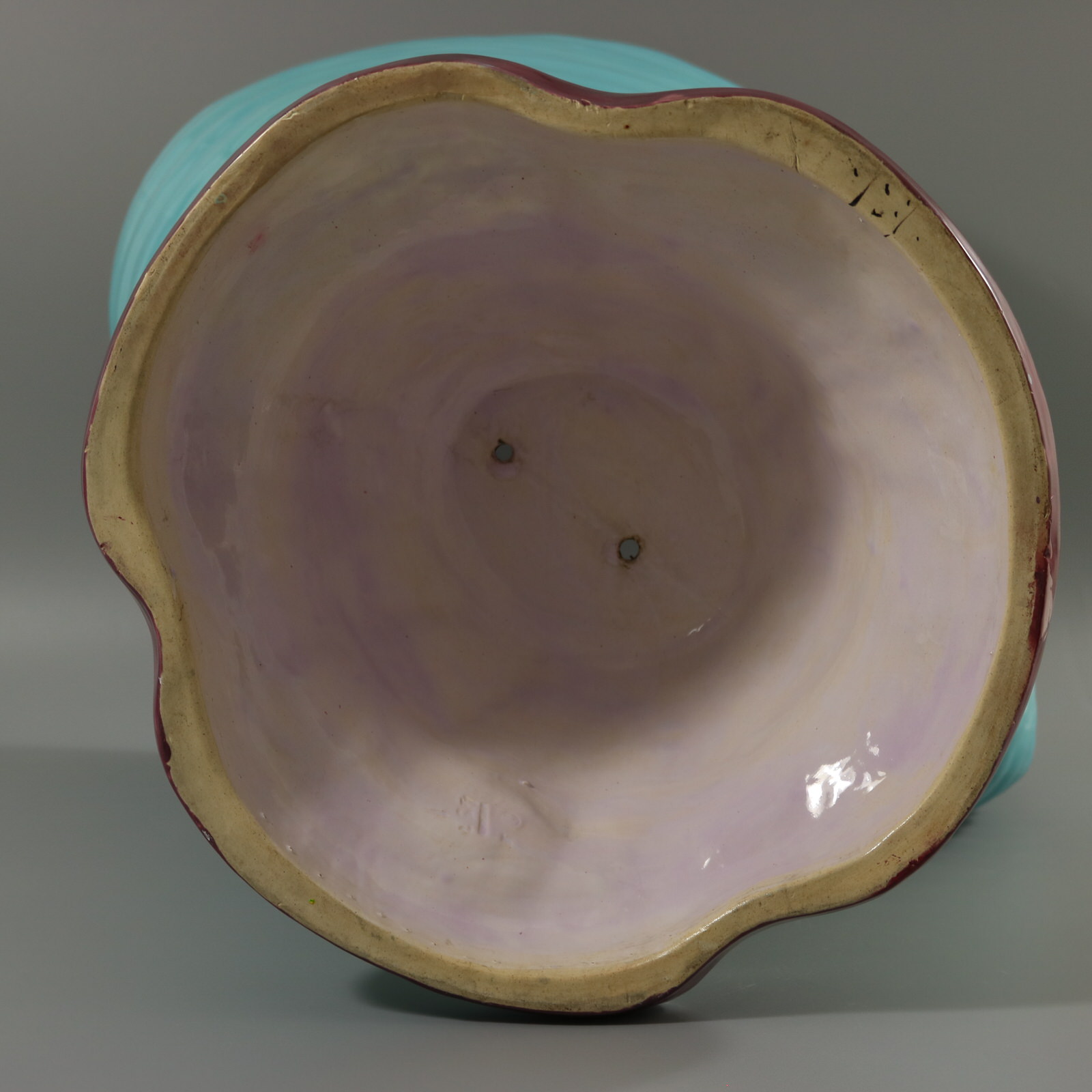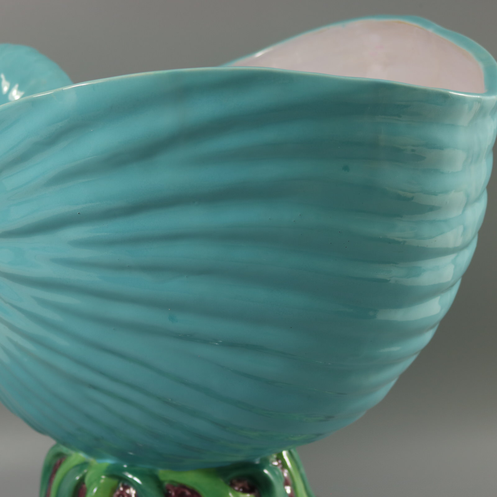 Victorian, circa 1876. 18.4ins high, 19.1ins wide, 14.6ins depth. Minton Majolica flower pot (jardiniere) which features a nautilus shell on a coral-like base which is draped in seaweed.