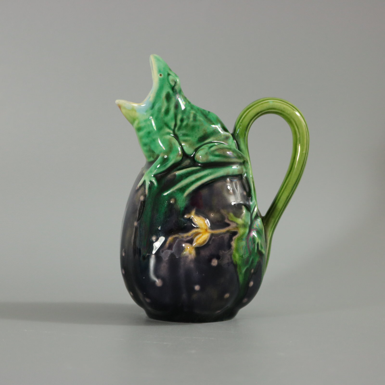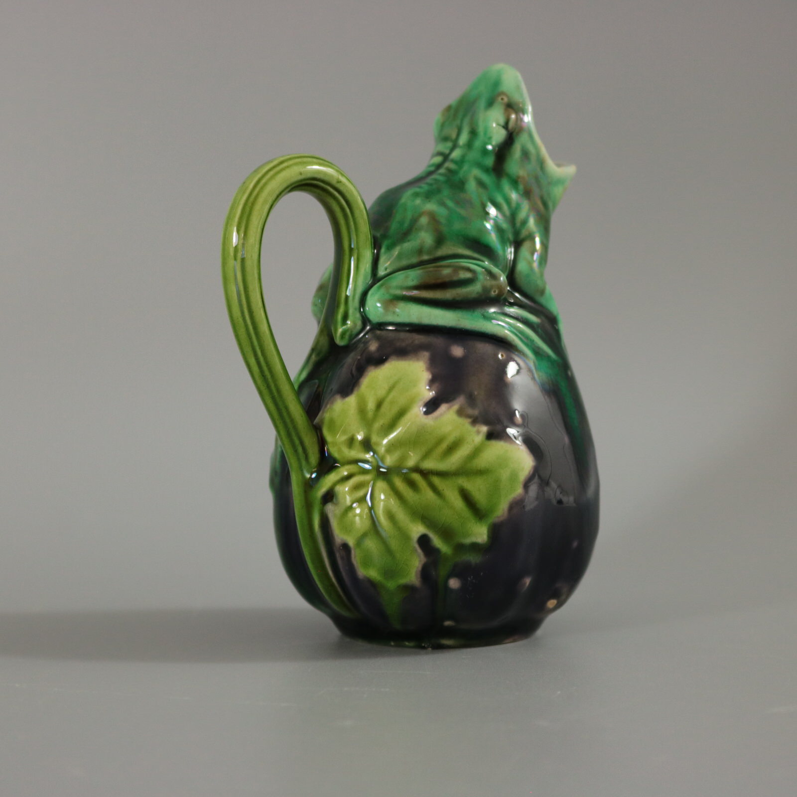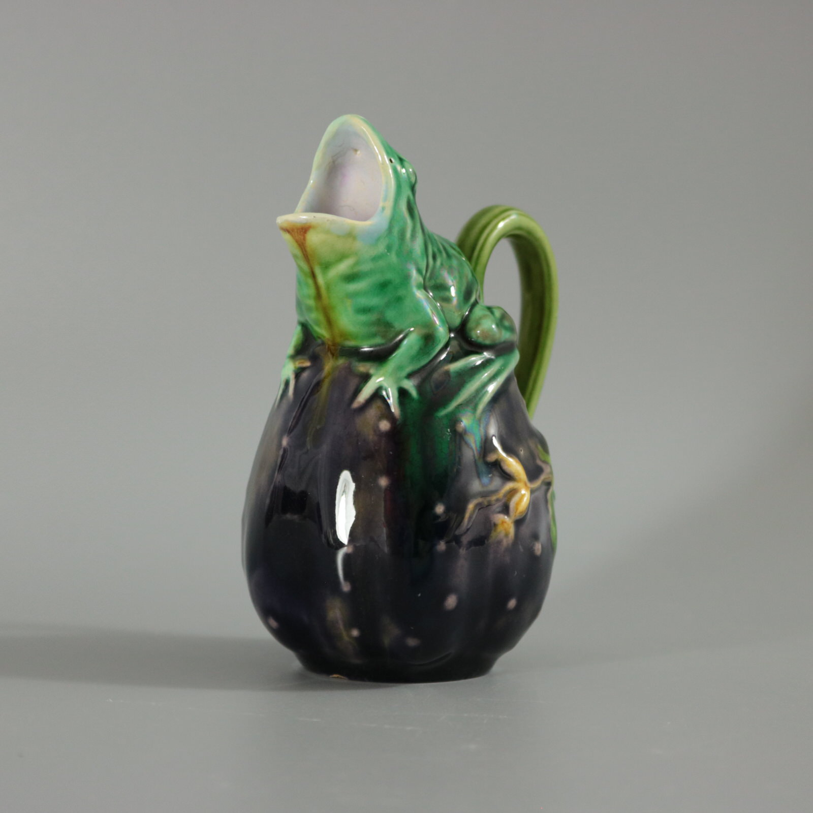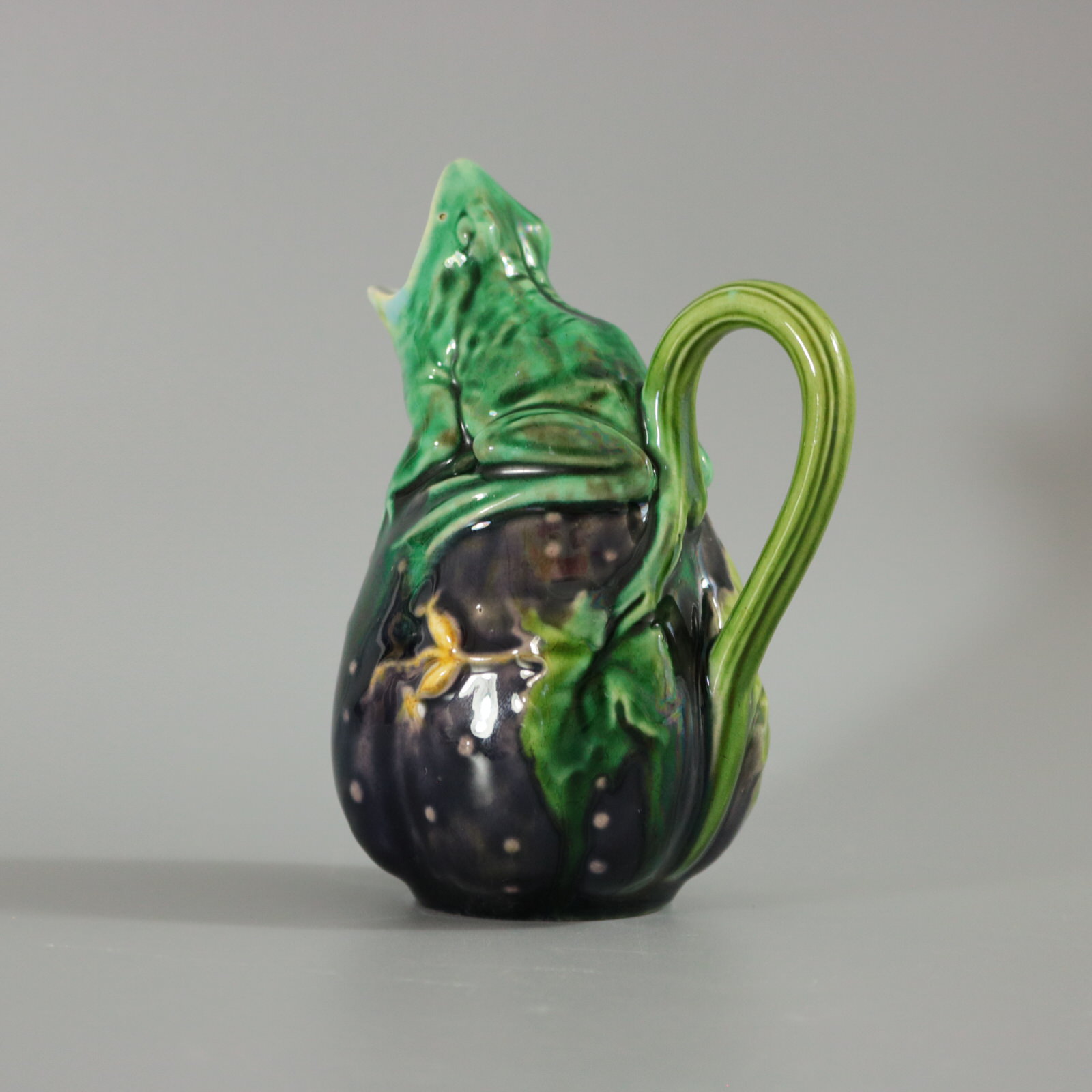 Victorian, circa 1870. 4.3ins high, 3ins wide, 2.4ins depth. Minton Majolica creamer which features a frog sitting on top of a gourd.
