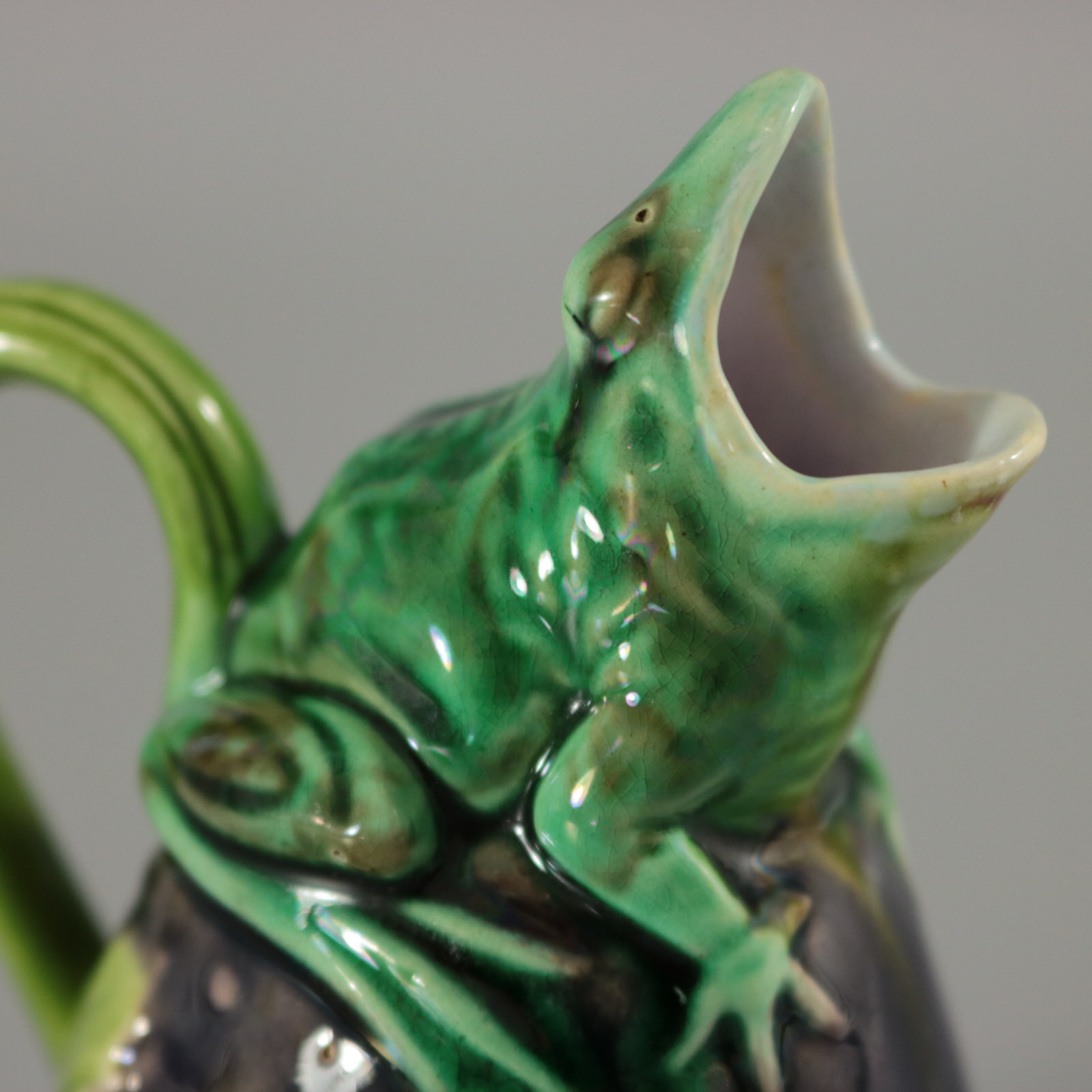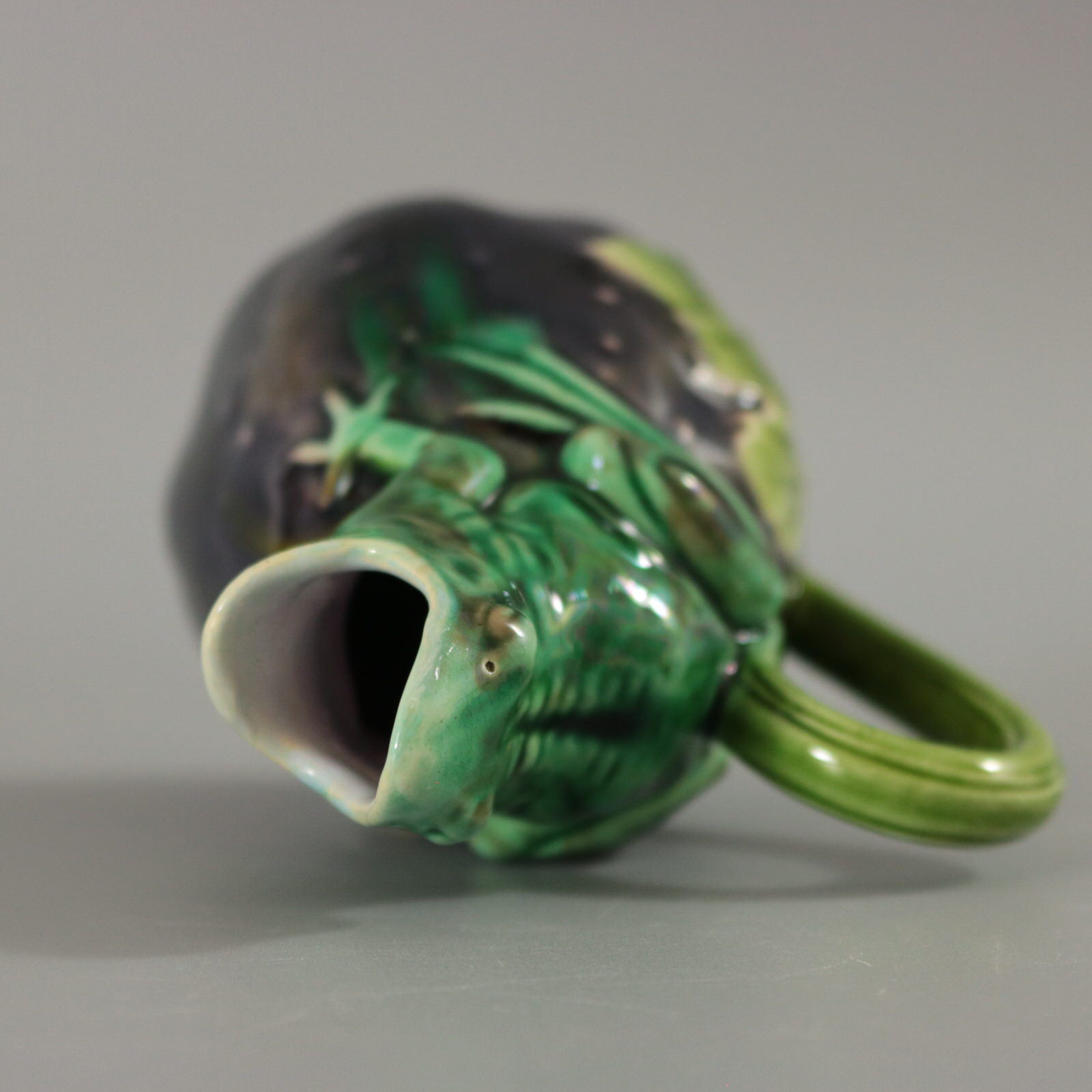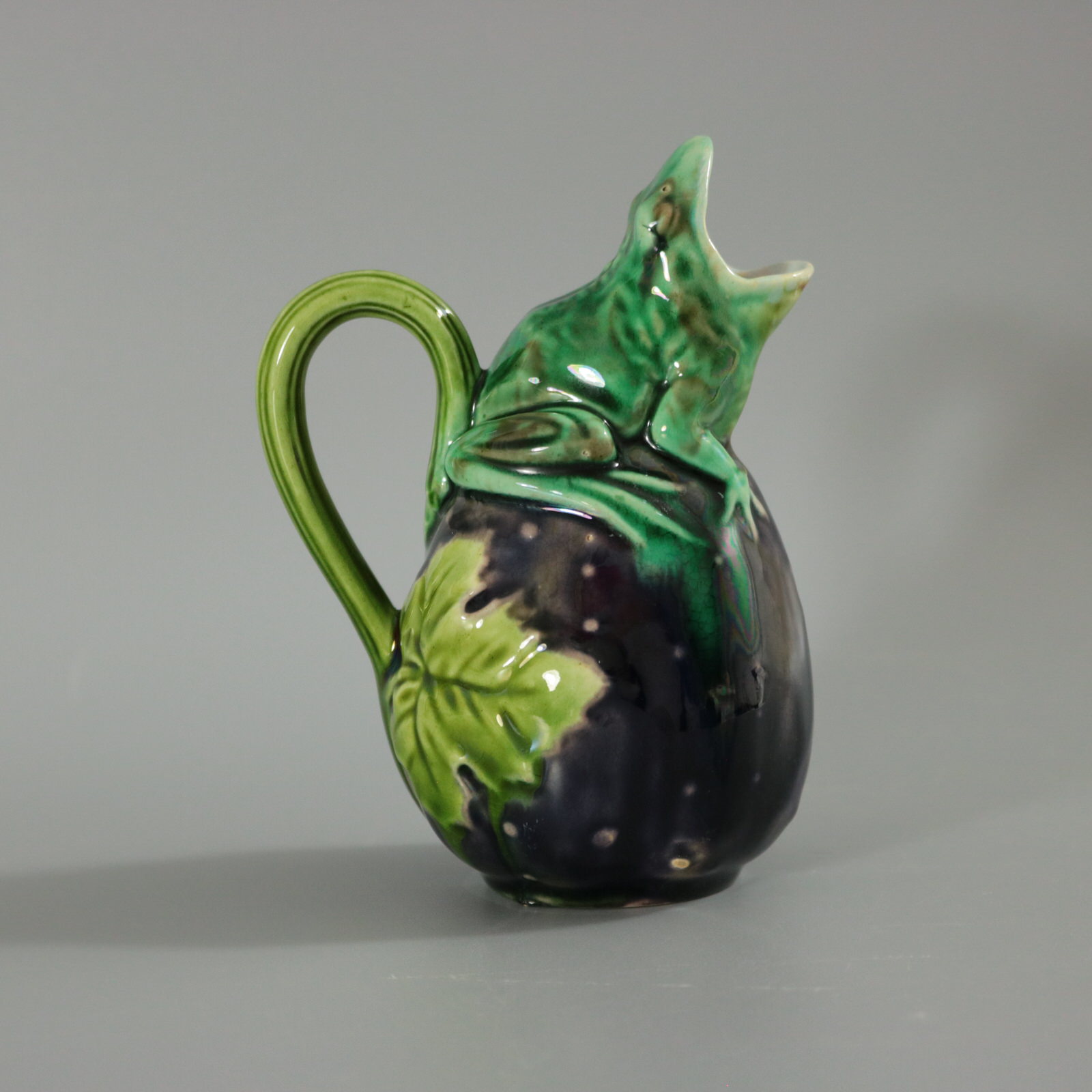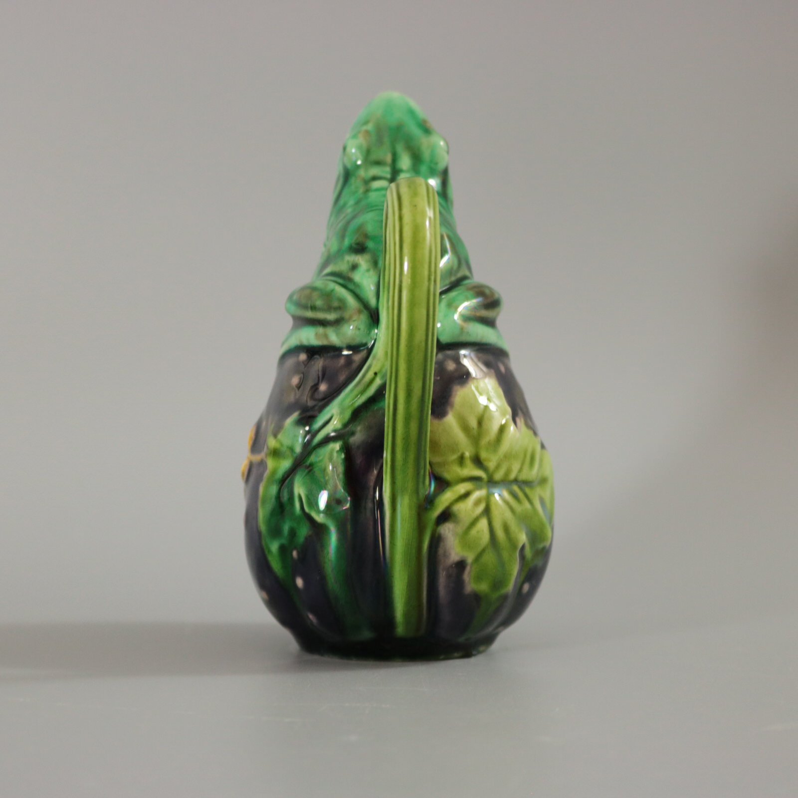 Victorian, circa 1870. 4.3ins high, 3ins wide, 2.4ins depth. Minton Majolica creamer which features a frog sitting on top of a gourd.