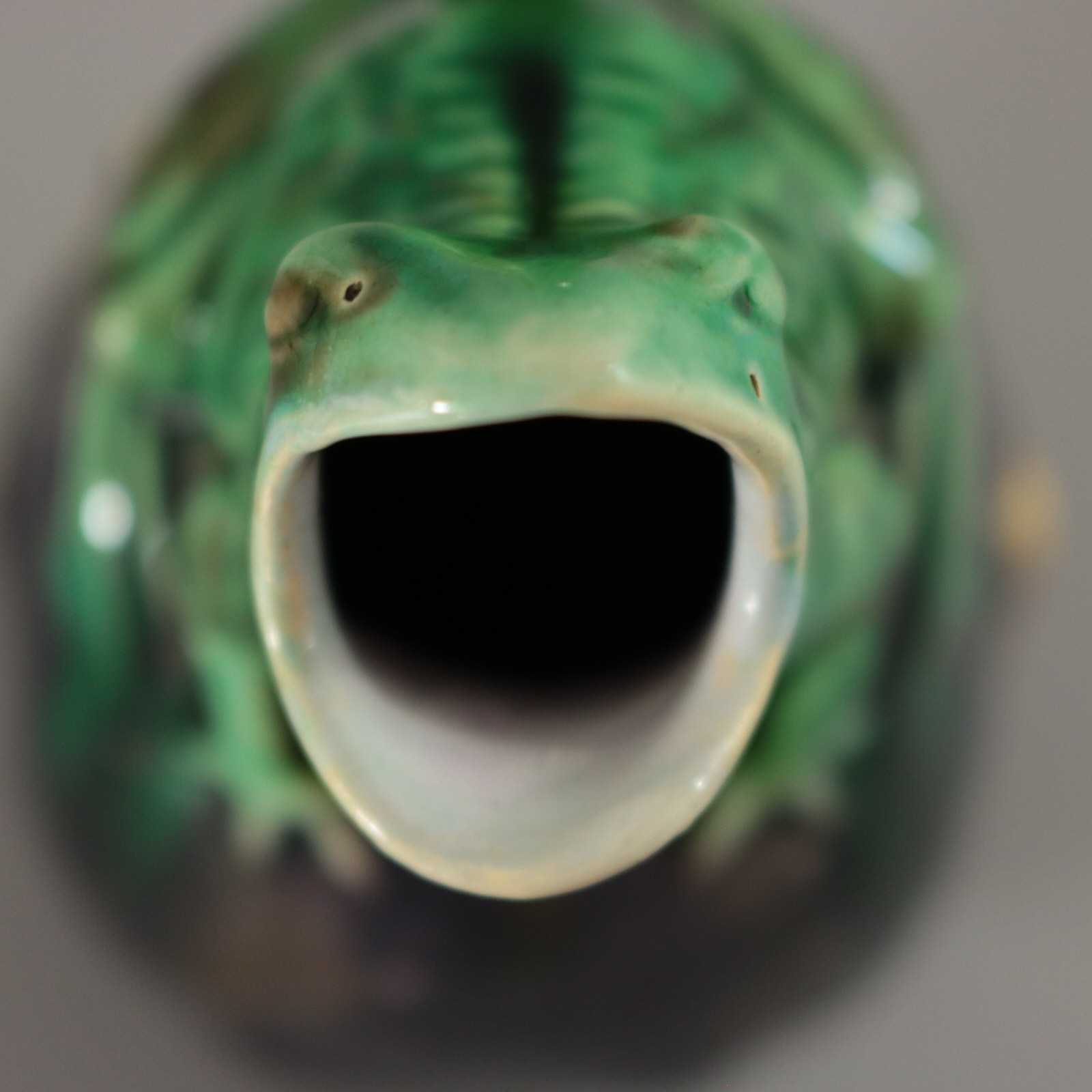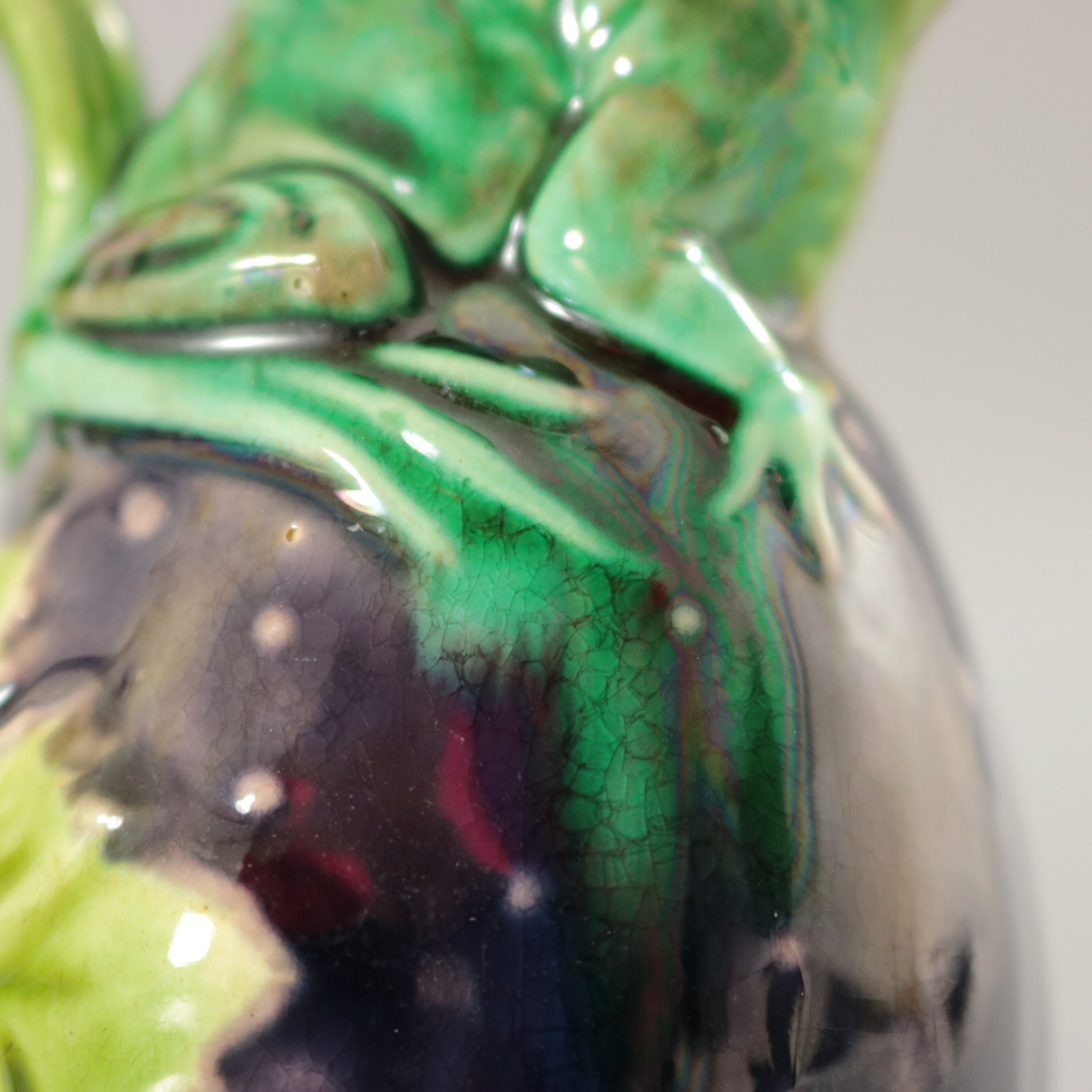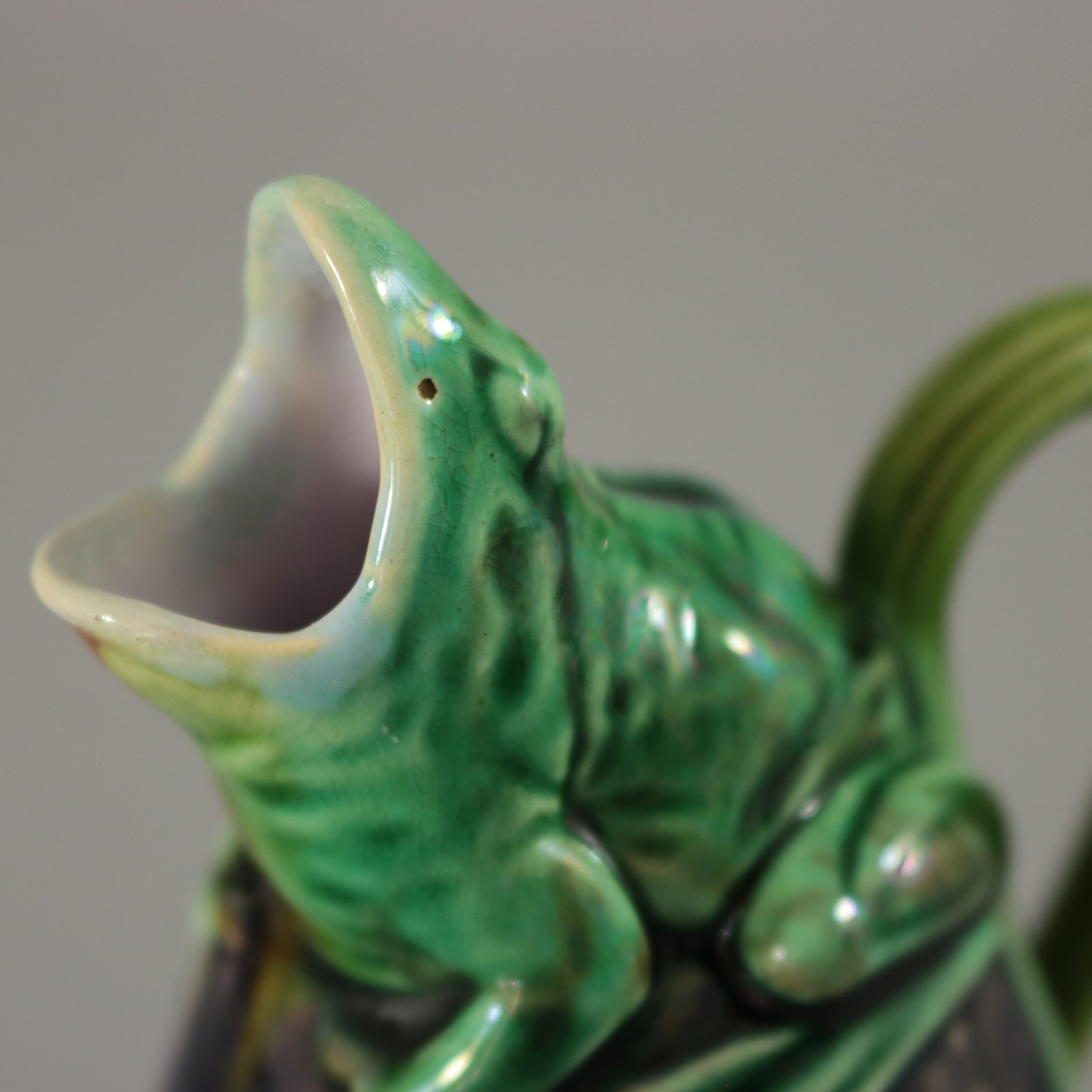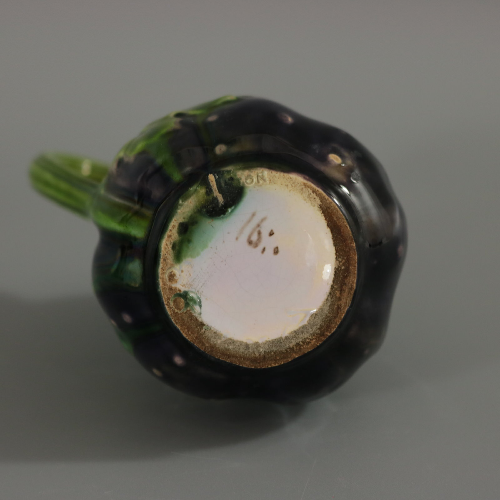 Victorian, circa 1870. 4.3ins high, 3ins wide, 2.4ins depth. Minton Majolica creamer which features a frog sitting on top of a gourd.