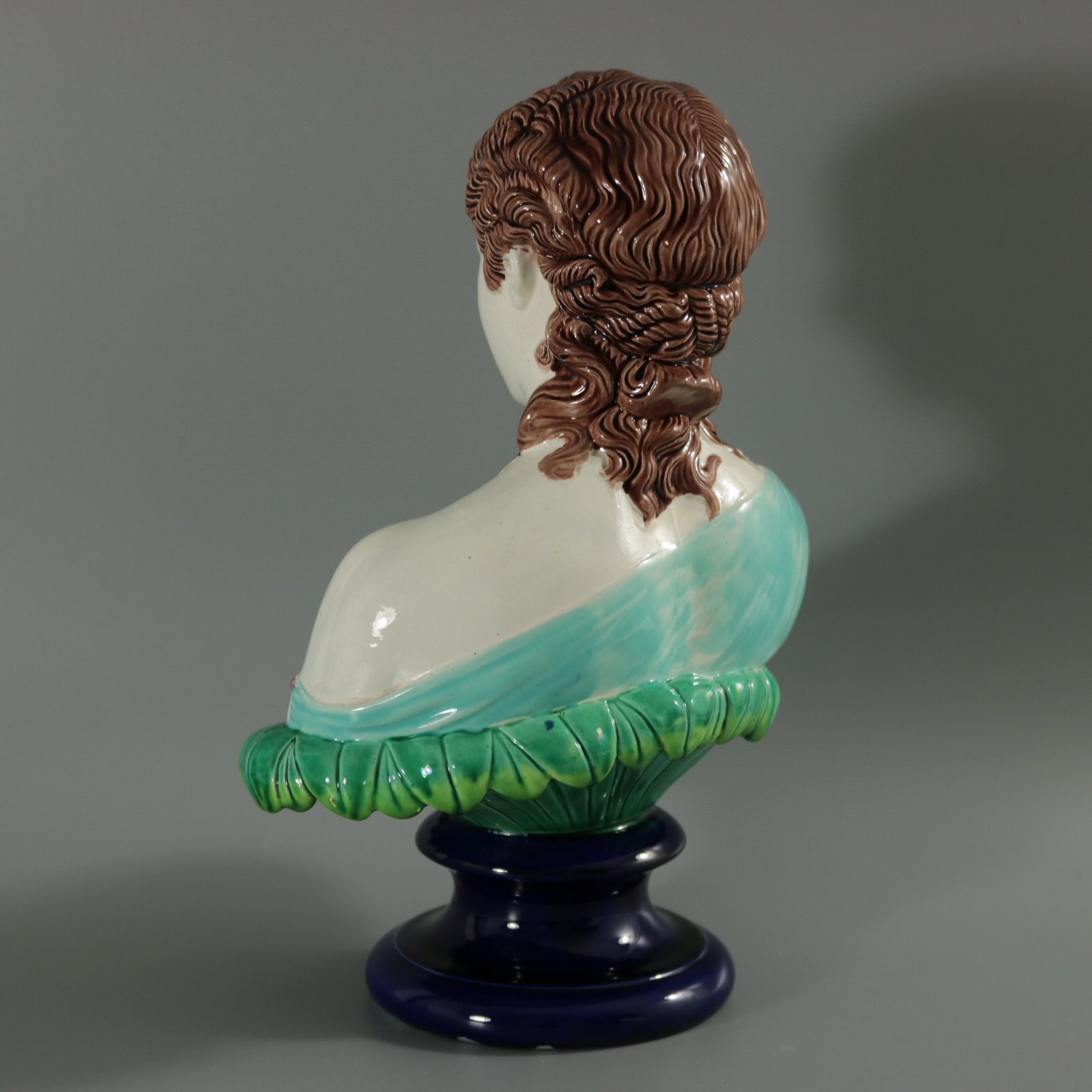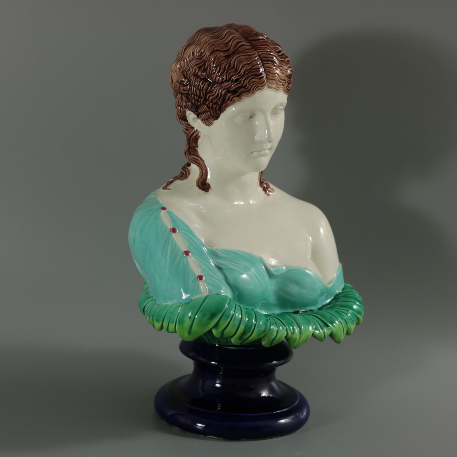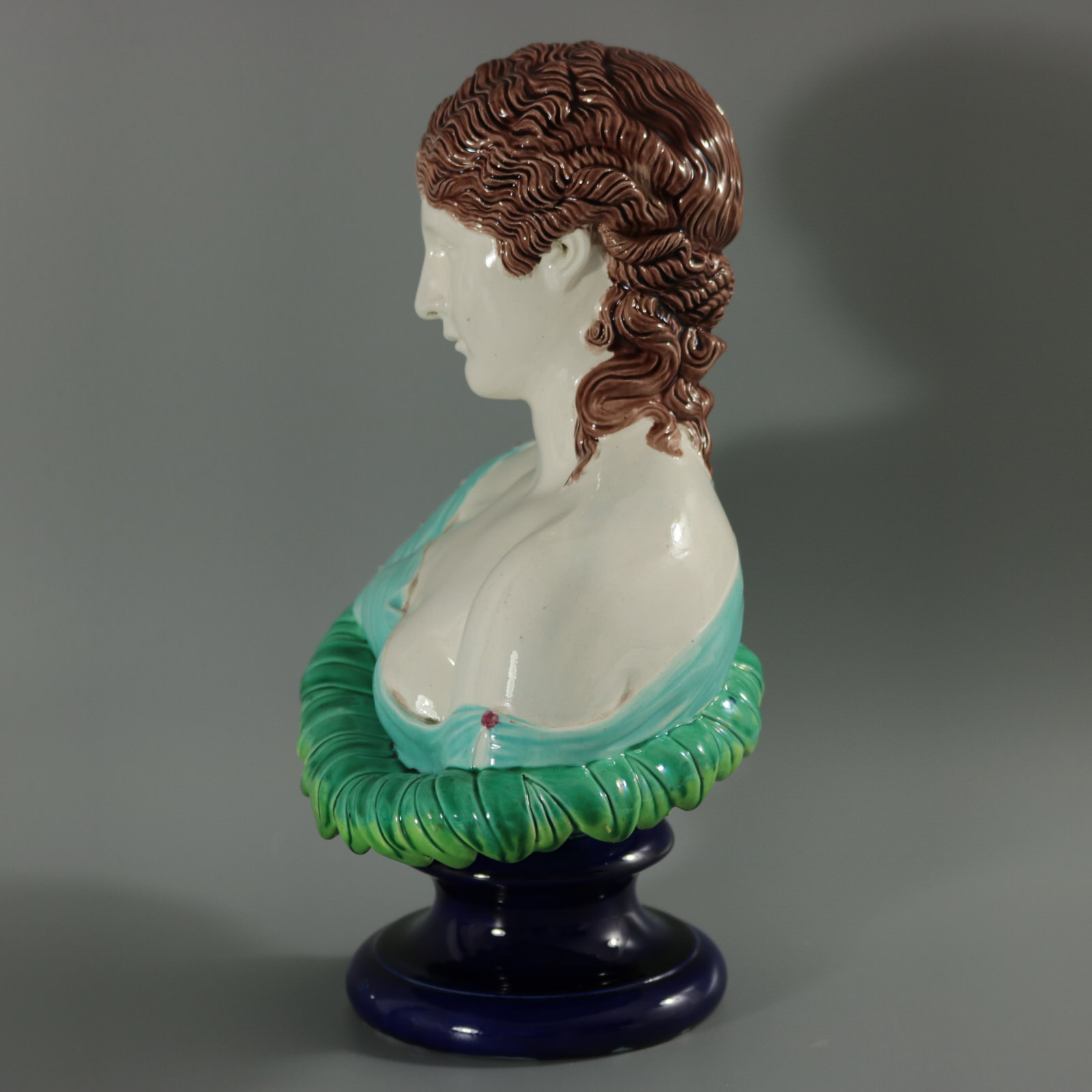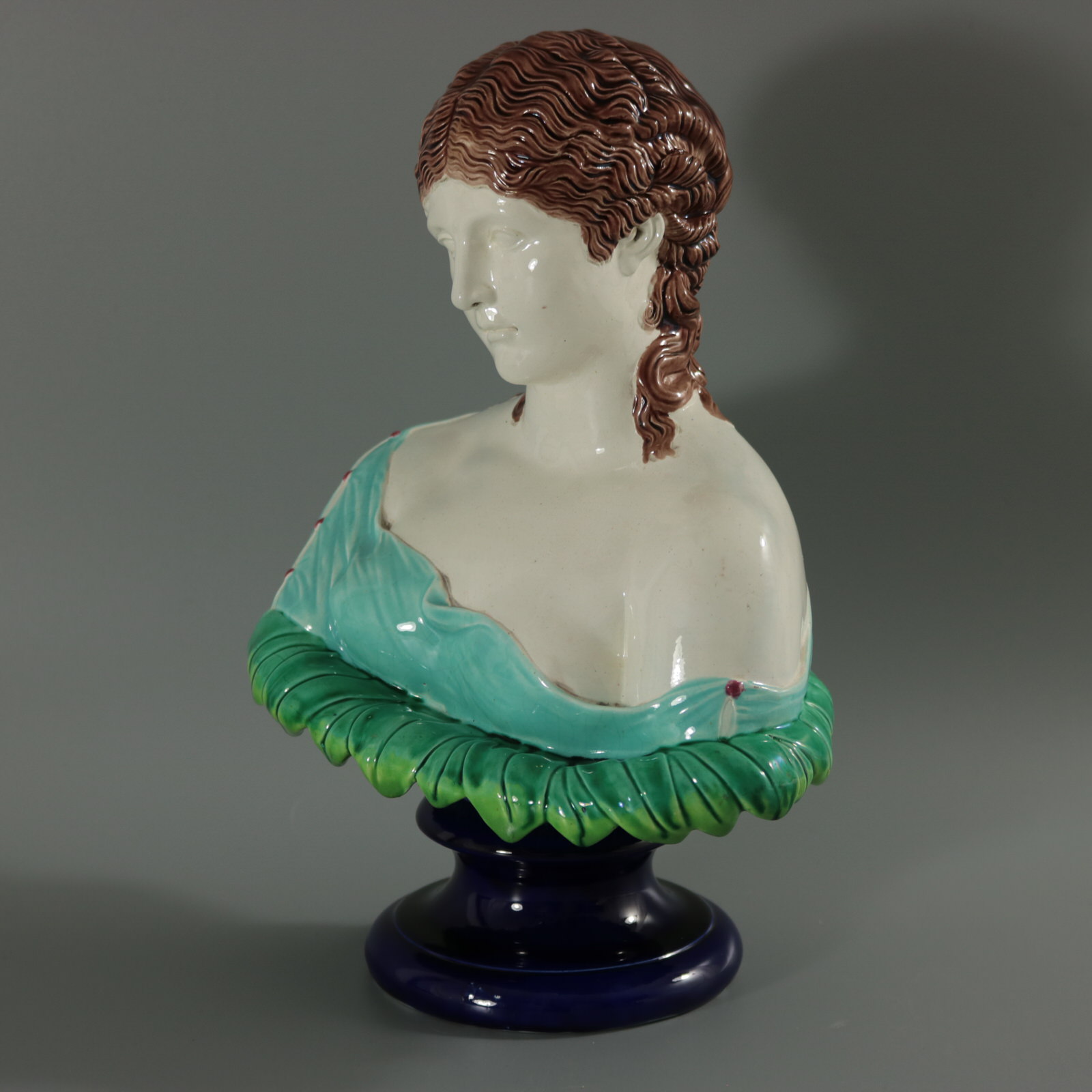 Victorian, circa 1870. 12.2ins high, 8.3ins wide, 5.9ins depth. Copeland Majolica bust which features head and shoulders of a woman on a bed of leaves. Sits on a socle base.