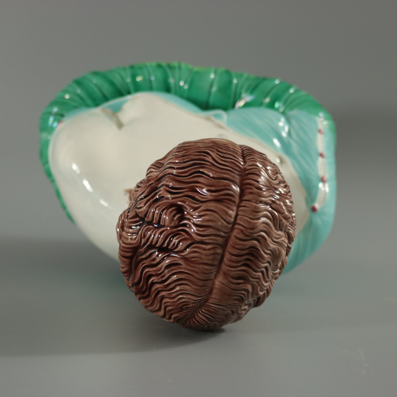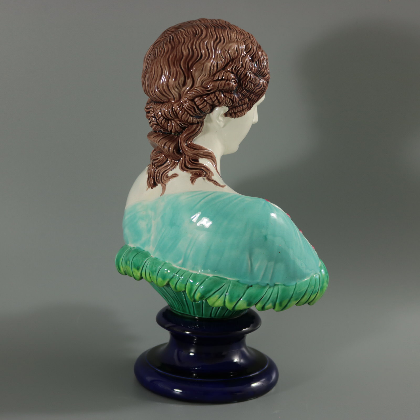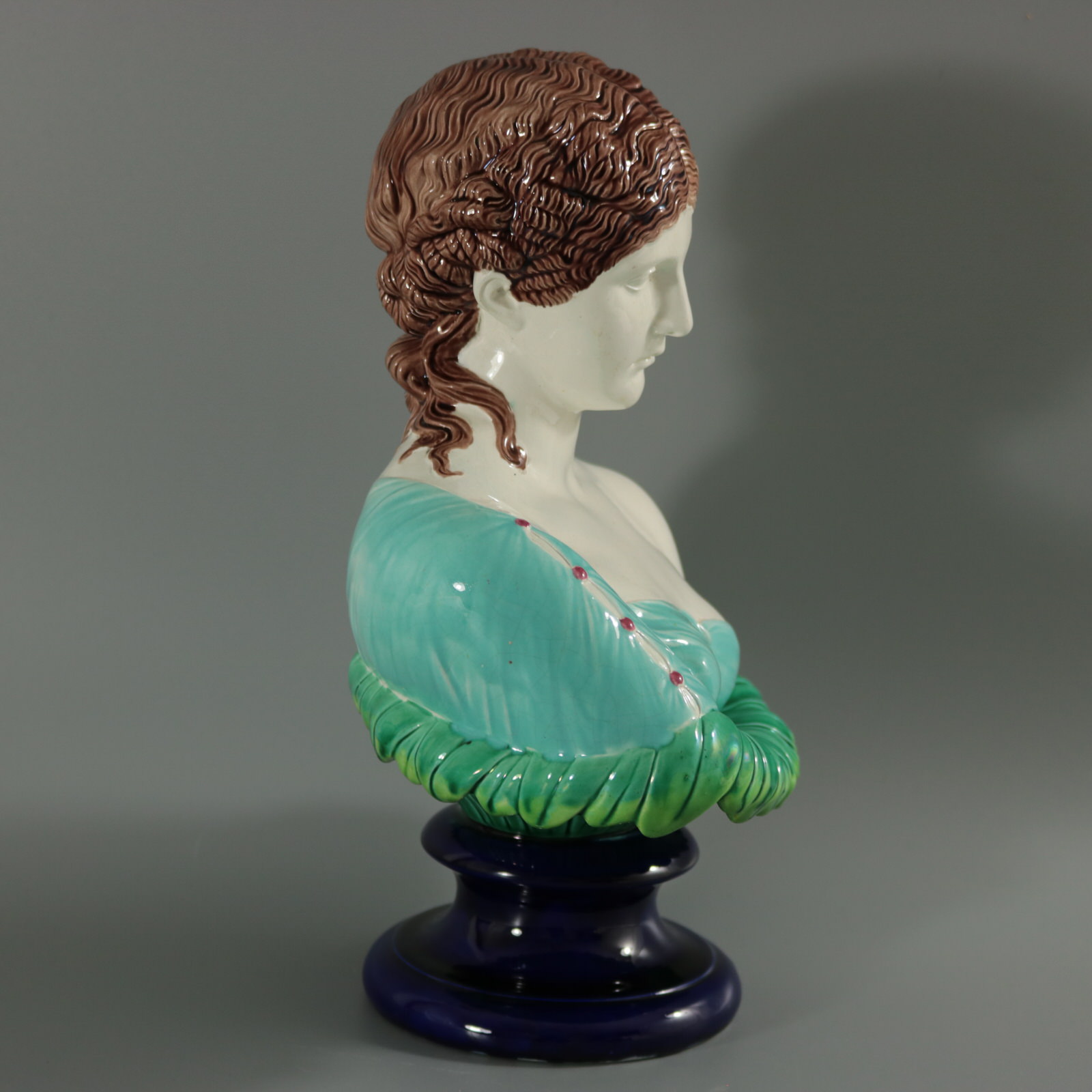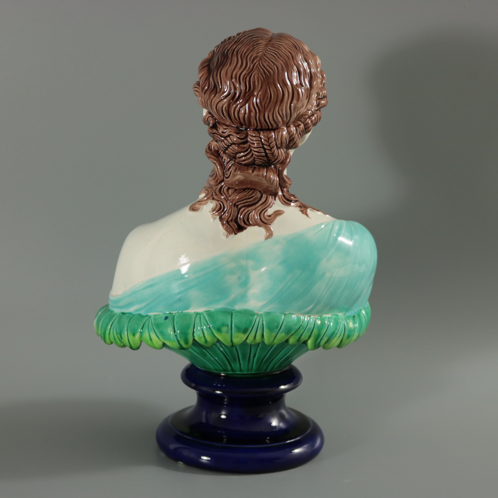 Victorian, circa 1870. 12.2ins high, 8.3ins wide, 5.9ins depth. Copeland Majolica bust which features head and shoulders of a woman on a bed of leaves. Sits on a socle base.