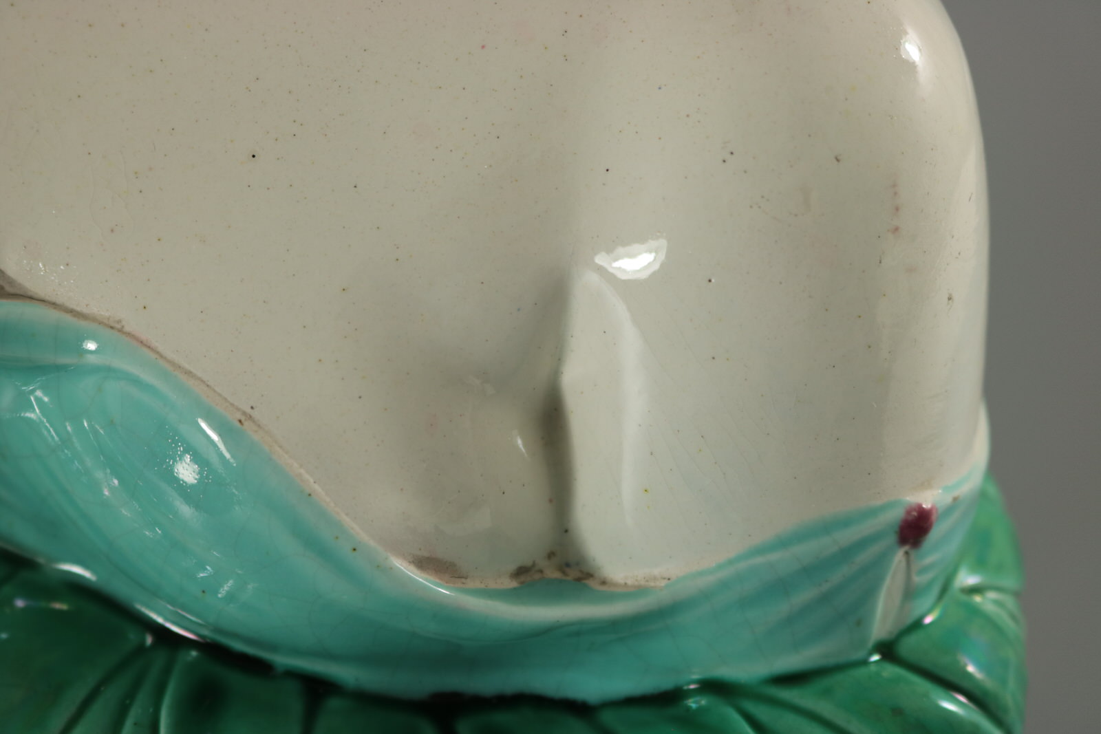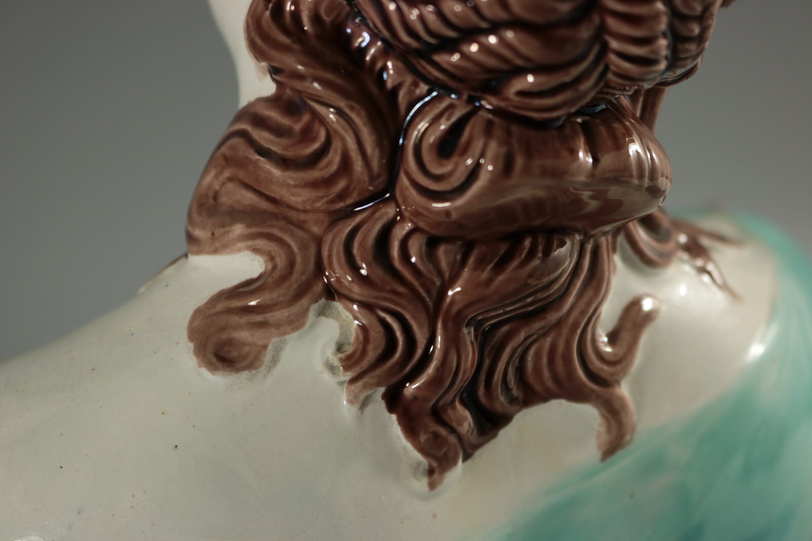 KILN EFFECTS: thin glaze application to join between chest and her robe.