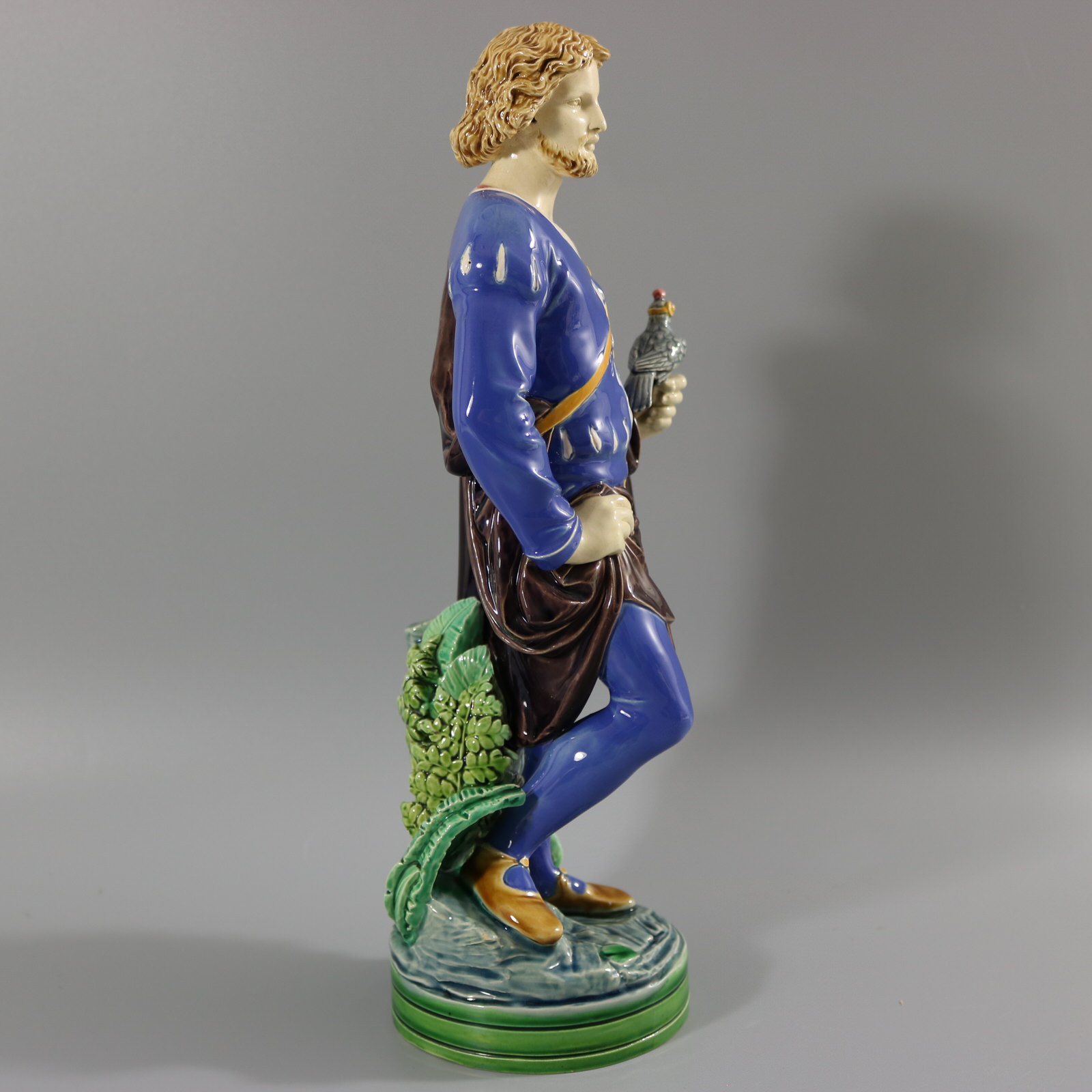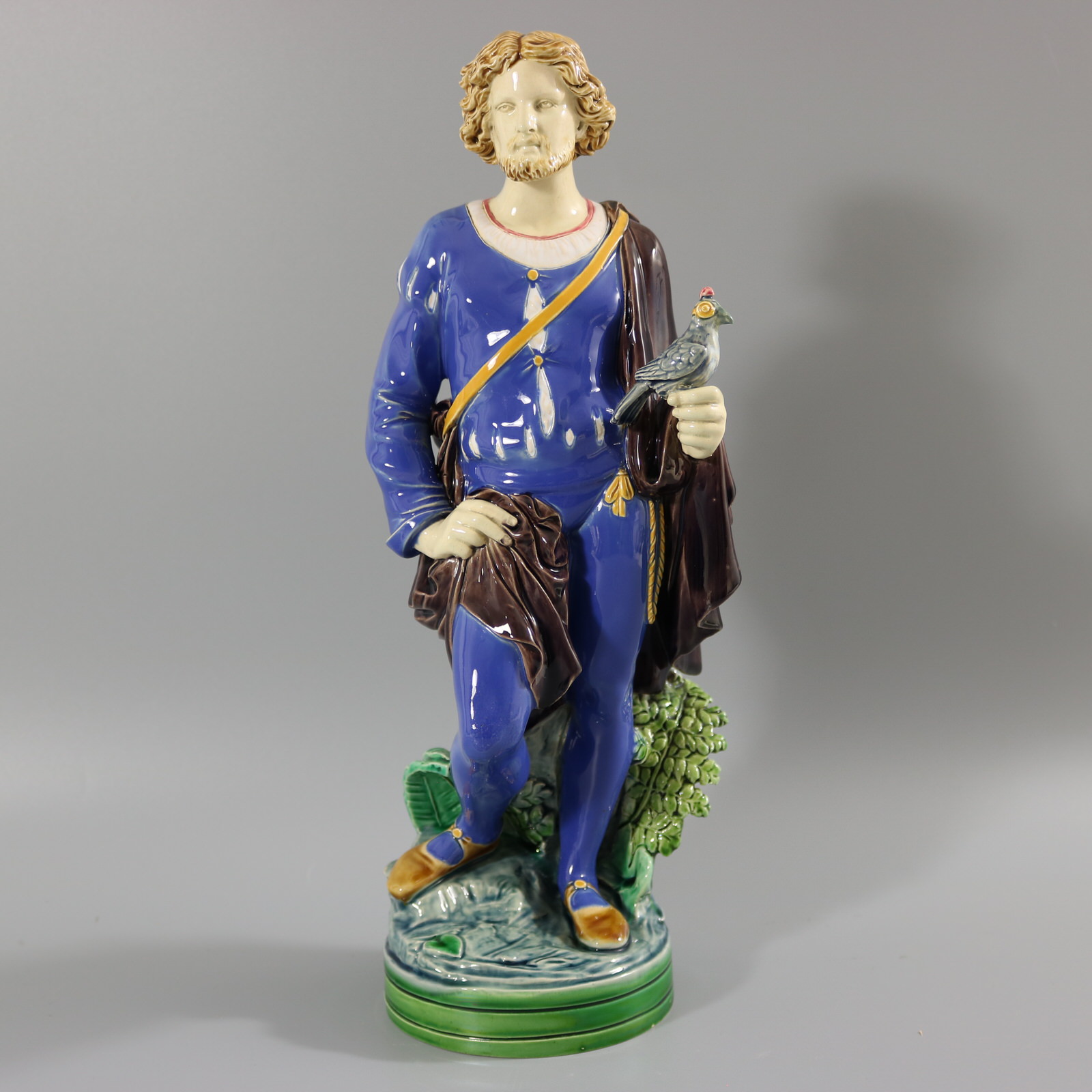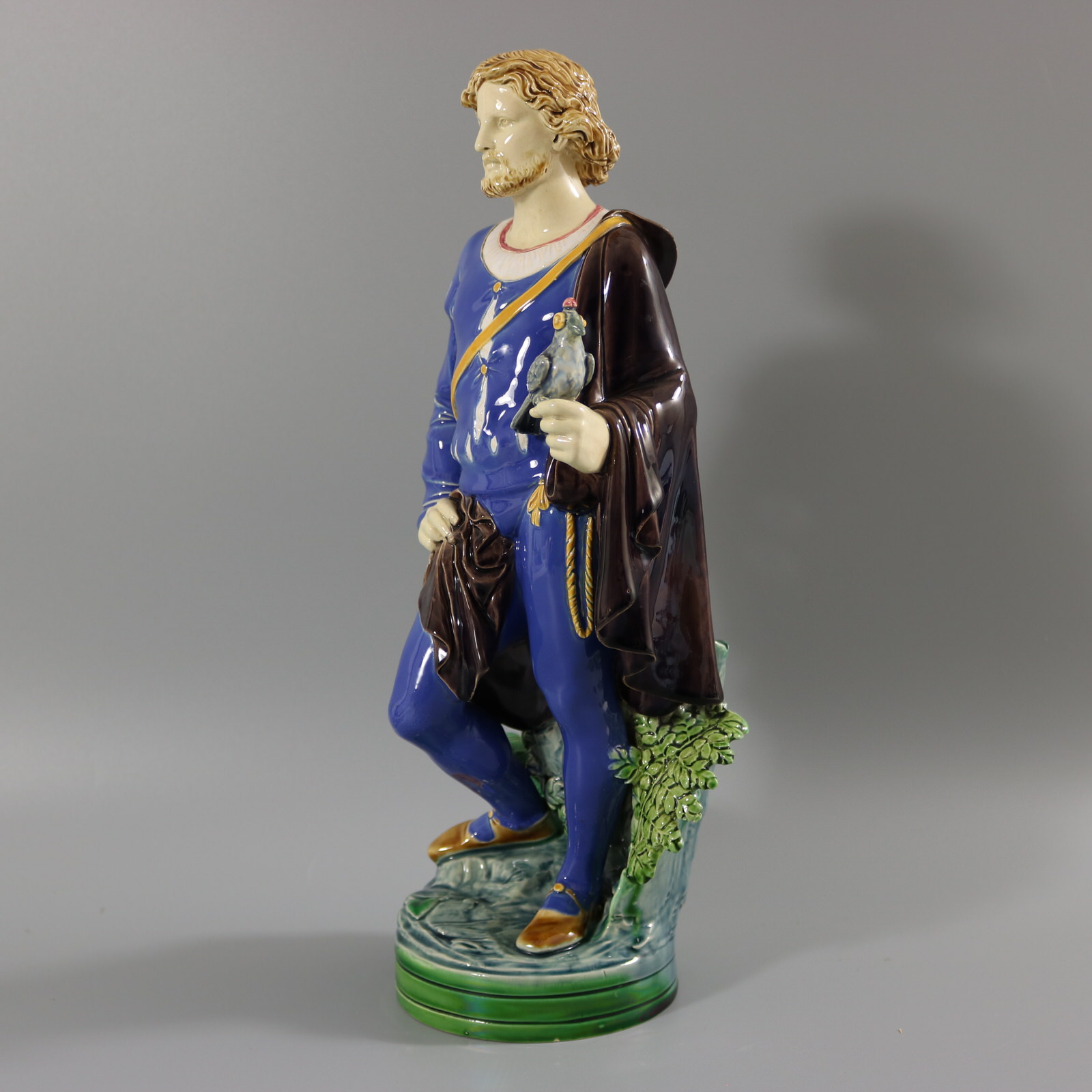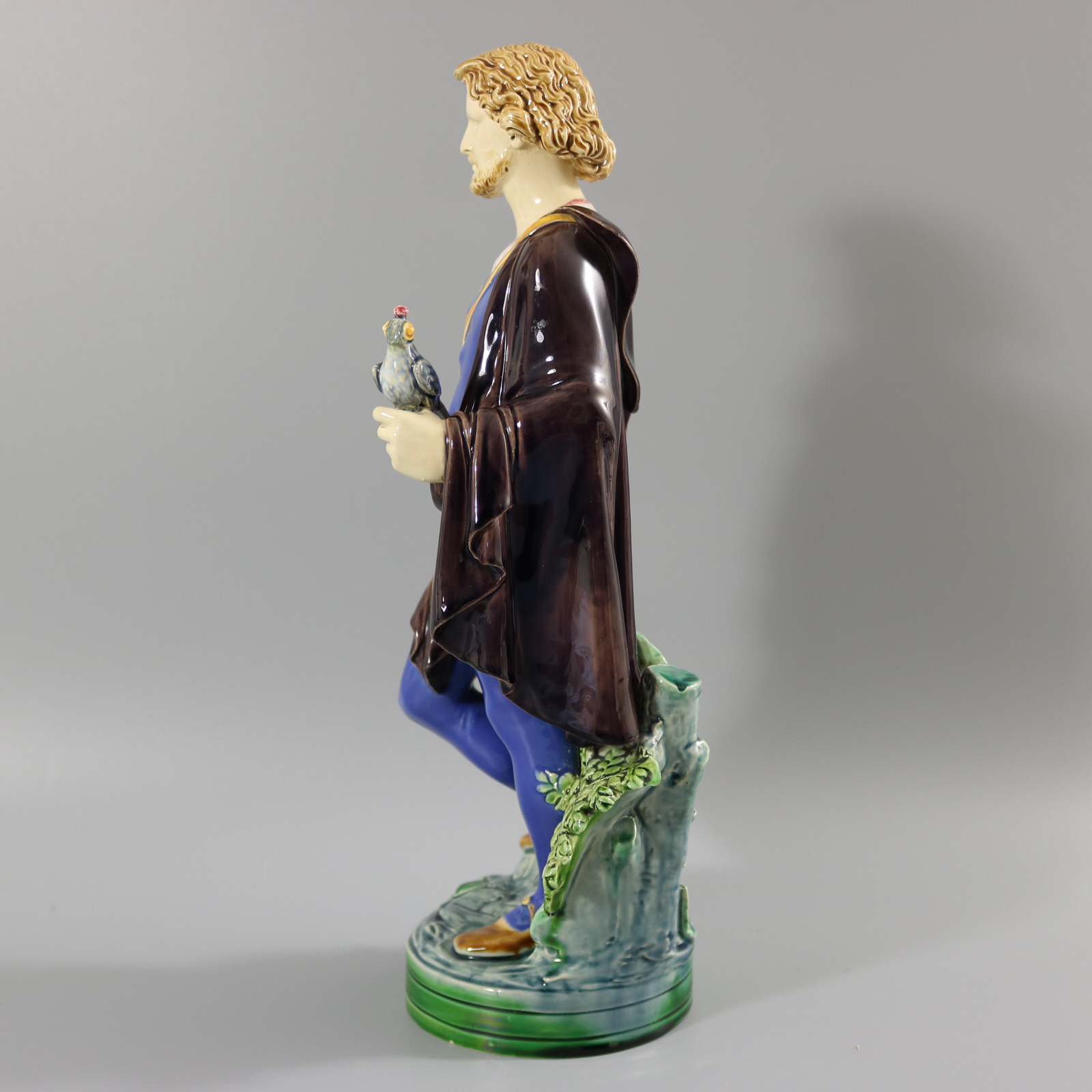 Victorian, circa 1864. 14.3ins high, 5.5ins wide, 5.5ins depth. Minton Majolica figure which features a falconer, stood in front of foliage, holding a bird (falcon) in his left hand.