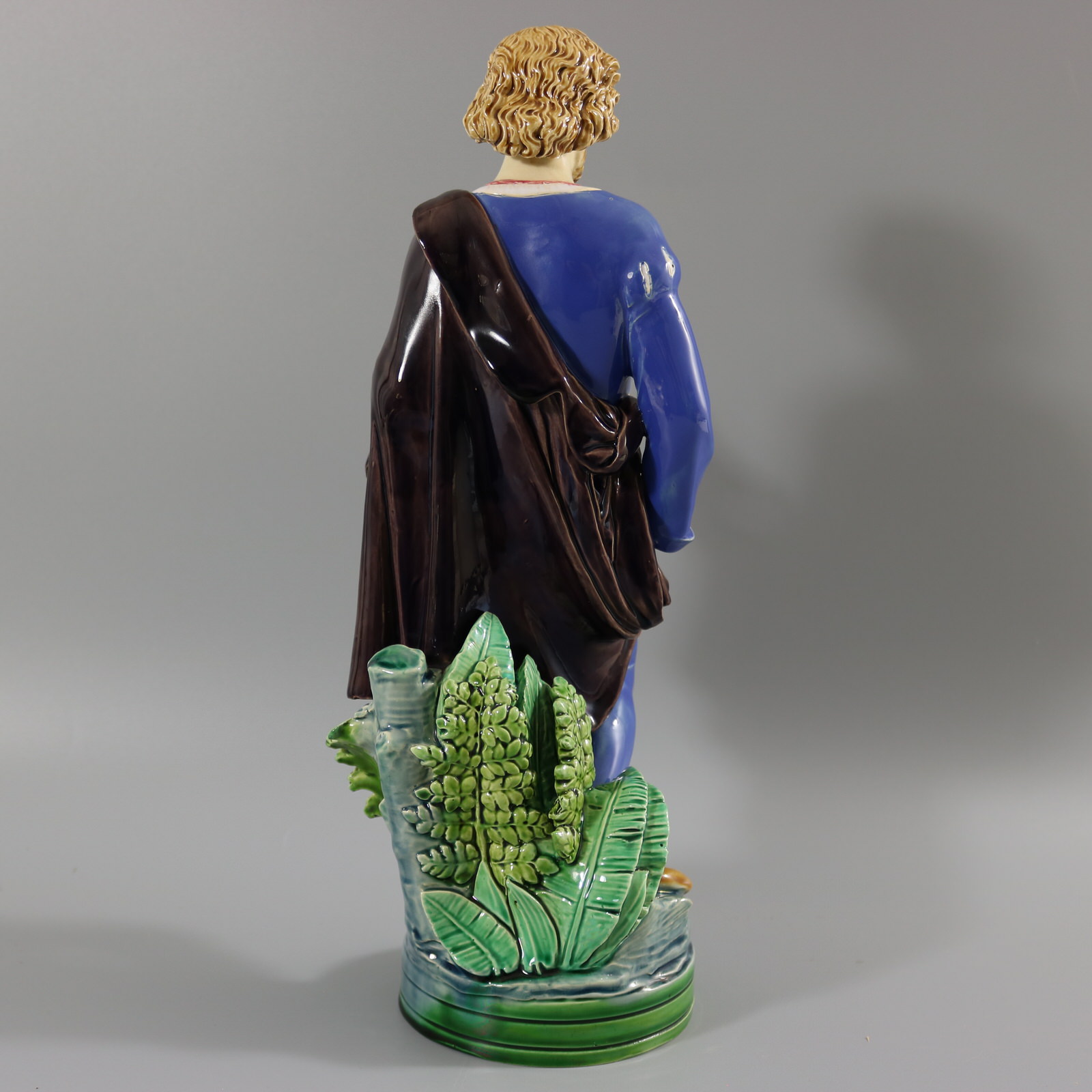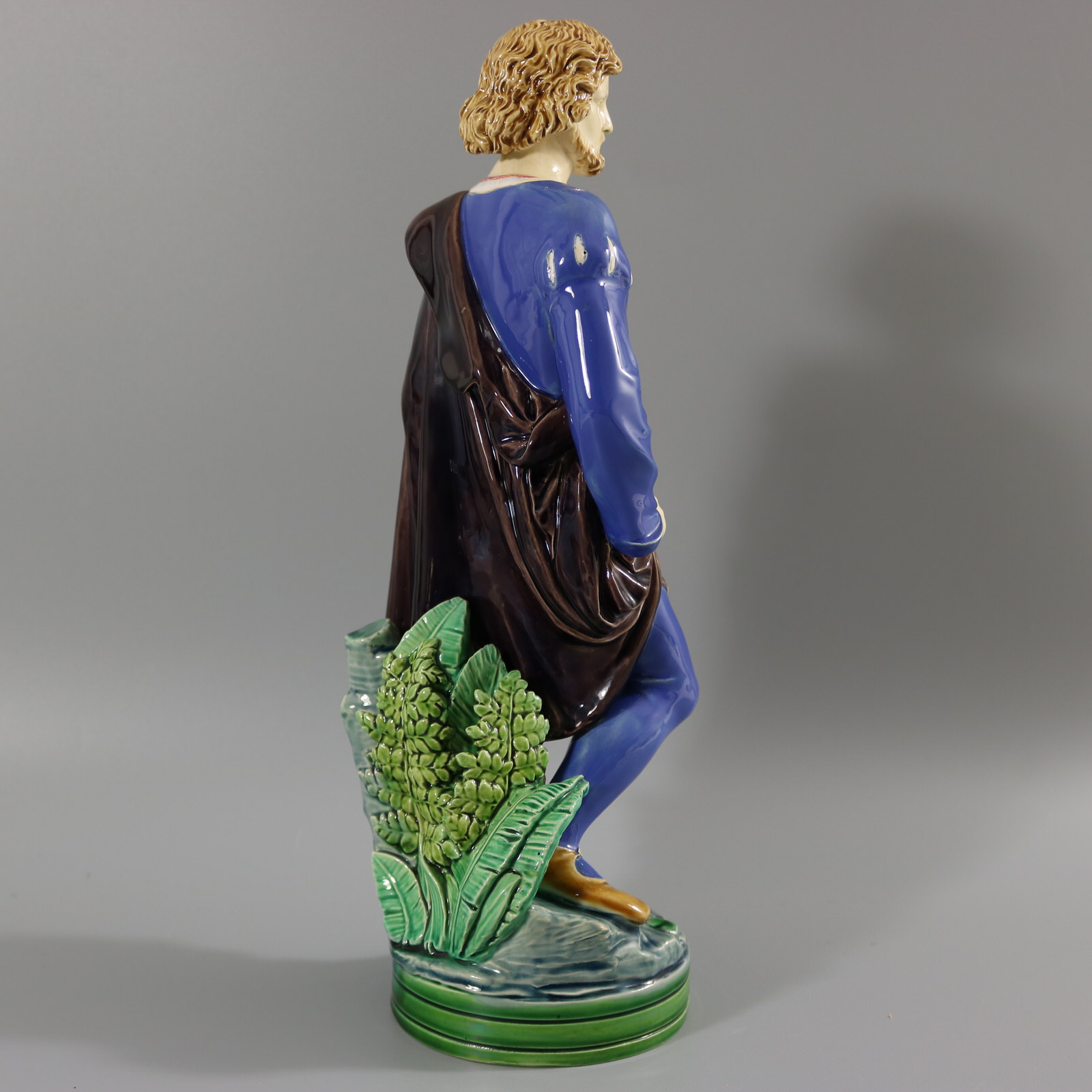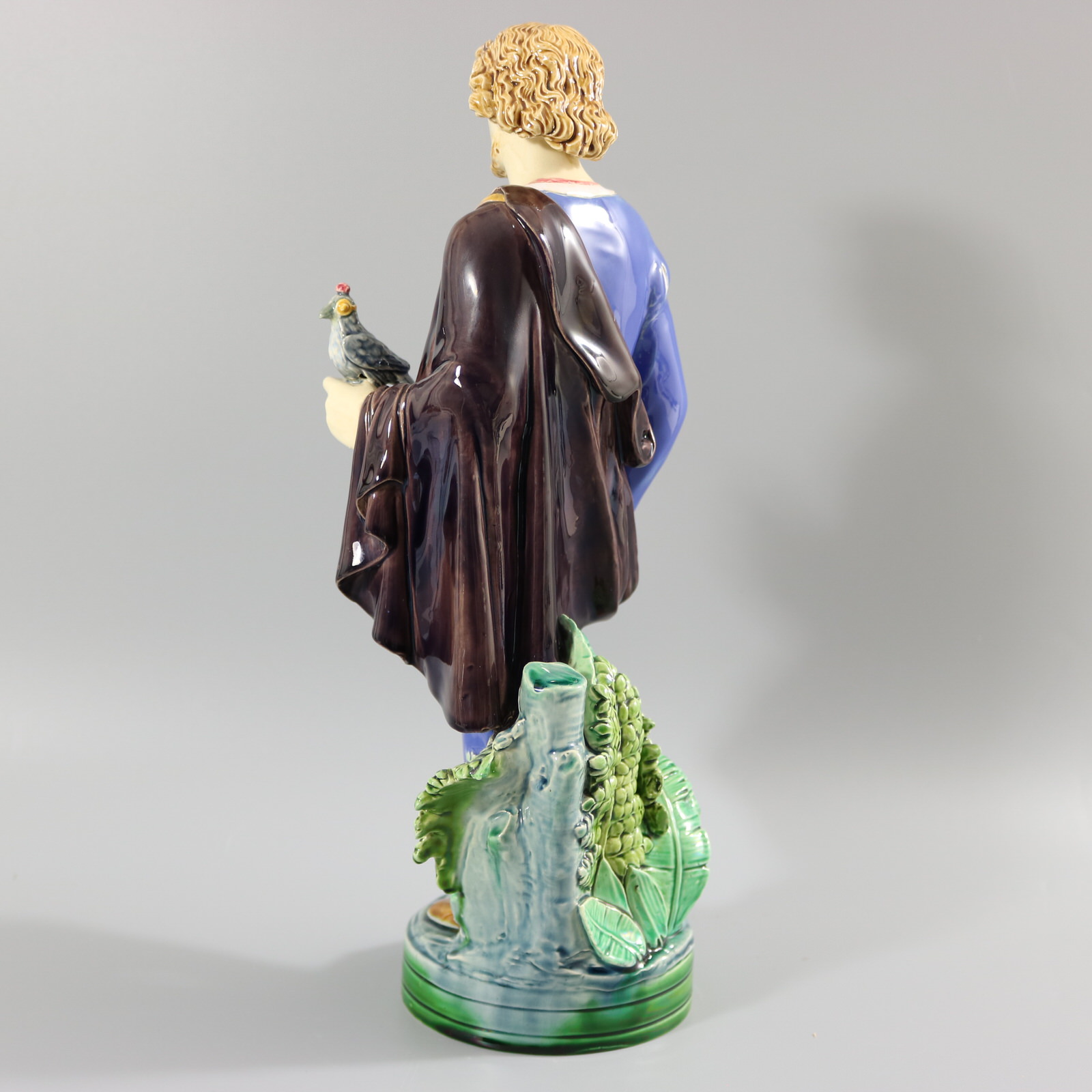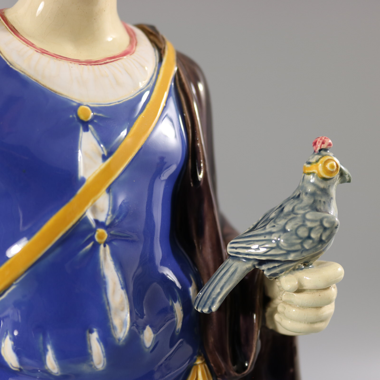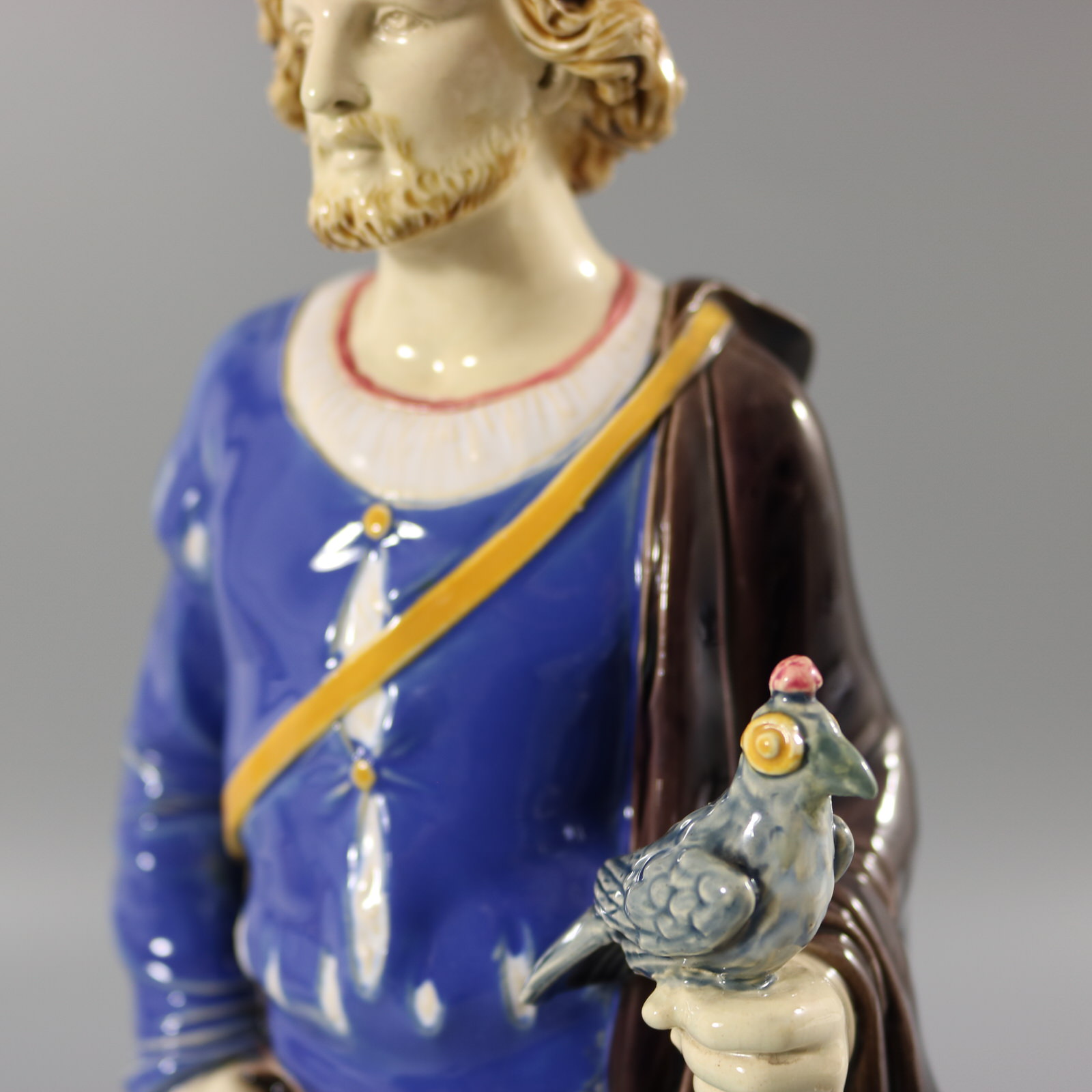 Victorian, circa 1864. 14.3ins high, 5.5ins wide, 5.5ins depth. Minton Majolica figure which features a falconer, stood in front of foliage, holding a bird (falcon) in his left hand.