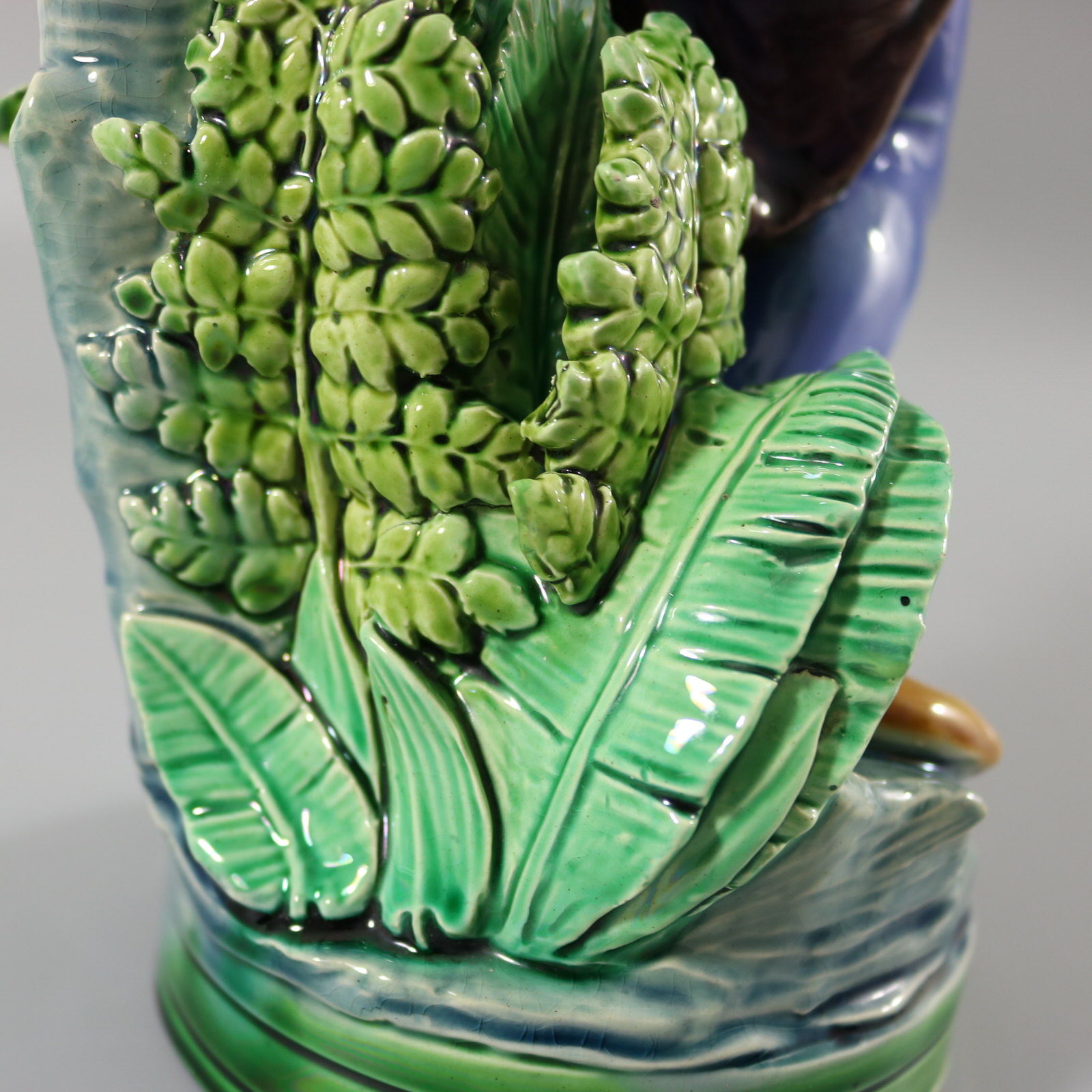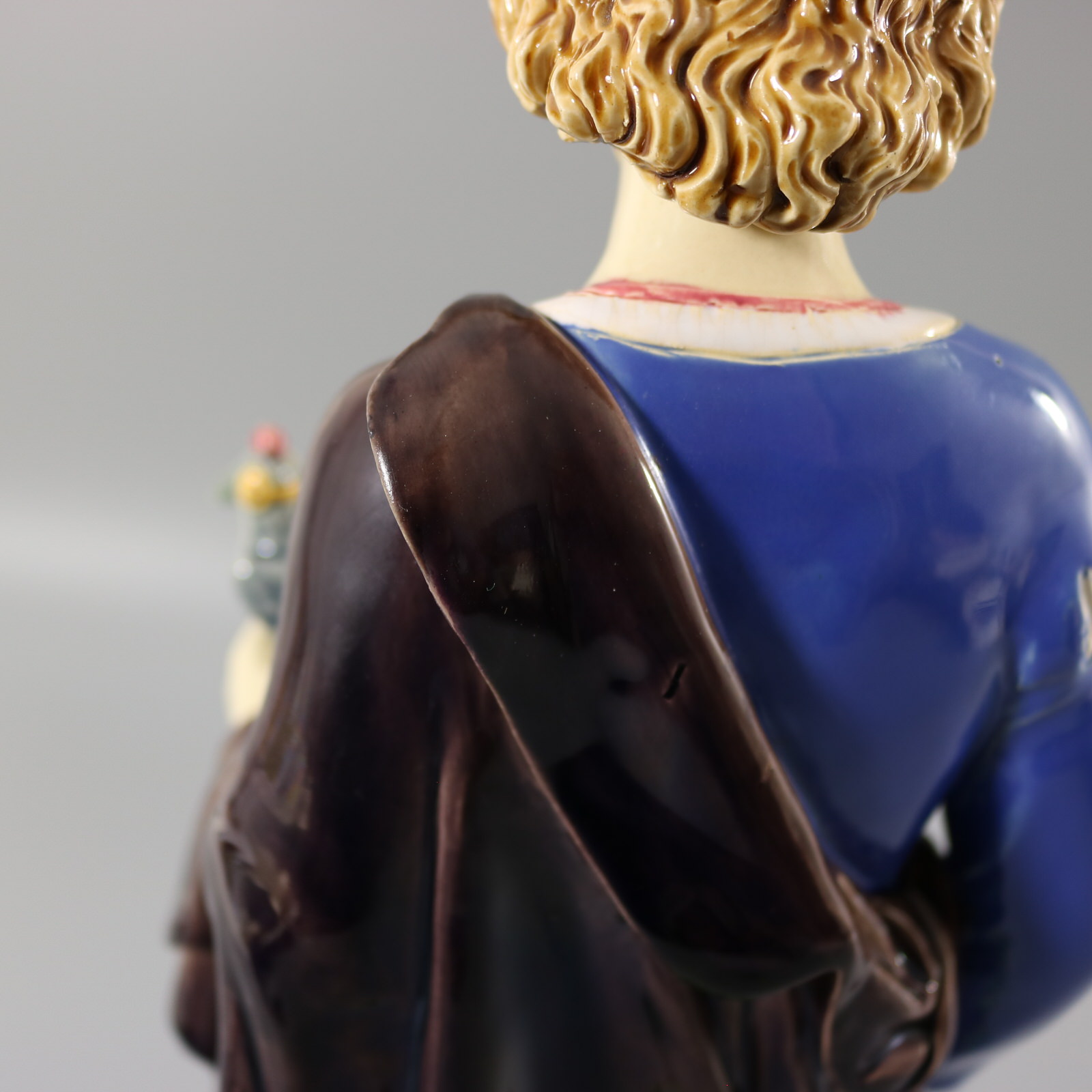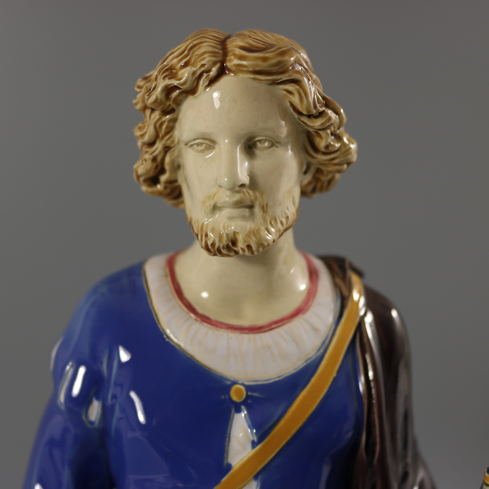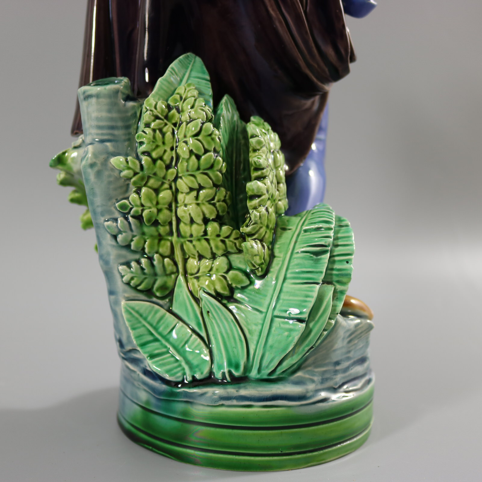 Victorian, circa 1864. 14.3ins high, 5.5ins wide, 5.5ins depth. Minton Majolica figure which features a falconer, stood in front of foliage, holding a bird (falcon) in his left hand.