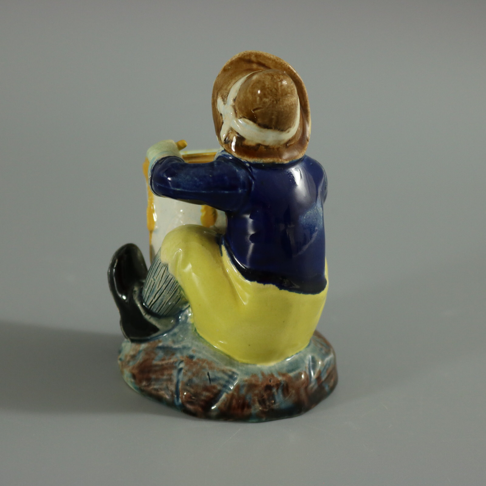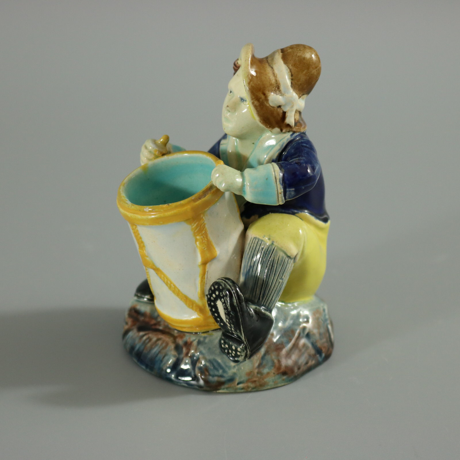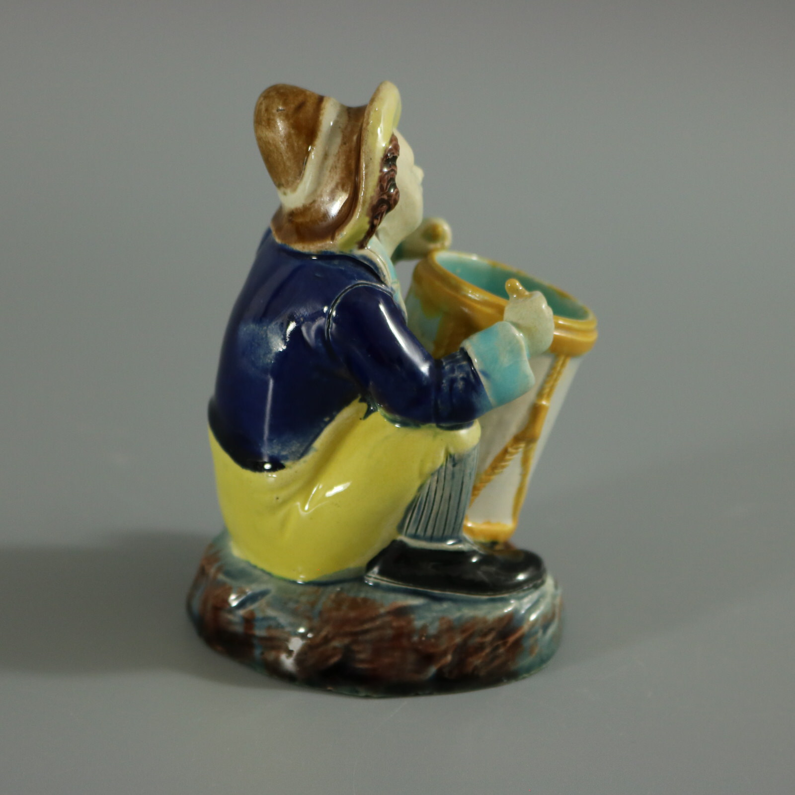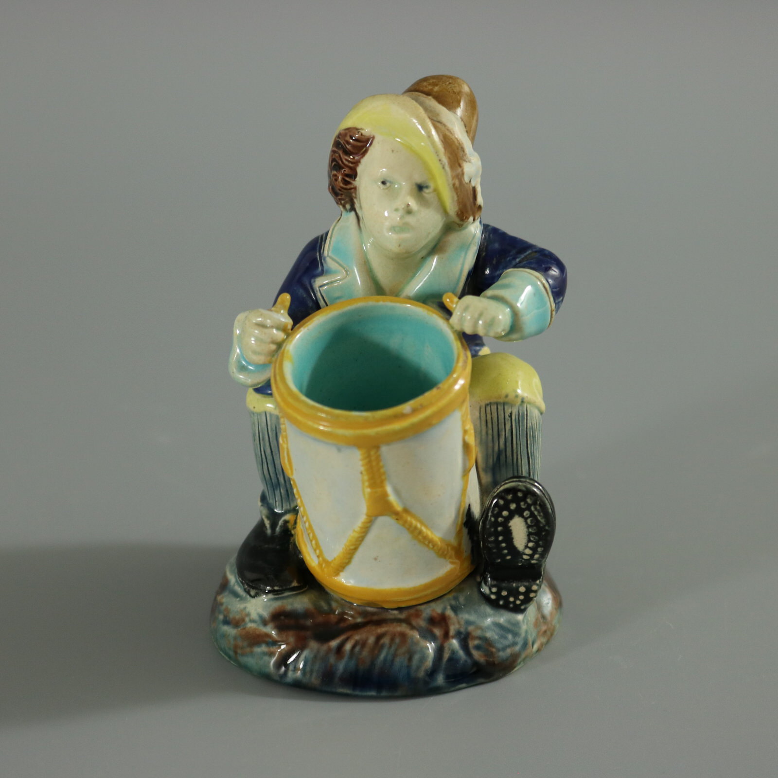 Victorian, circa 1880. 3.9ins high, 2.6ins wide, 2.8ins depth. Holdcroft Majolica match holder which features a seated boy, playing a drum.