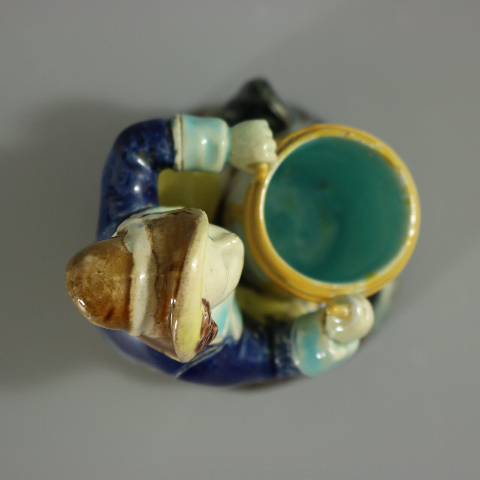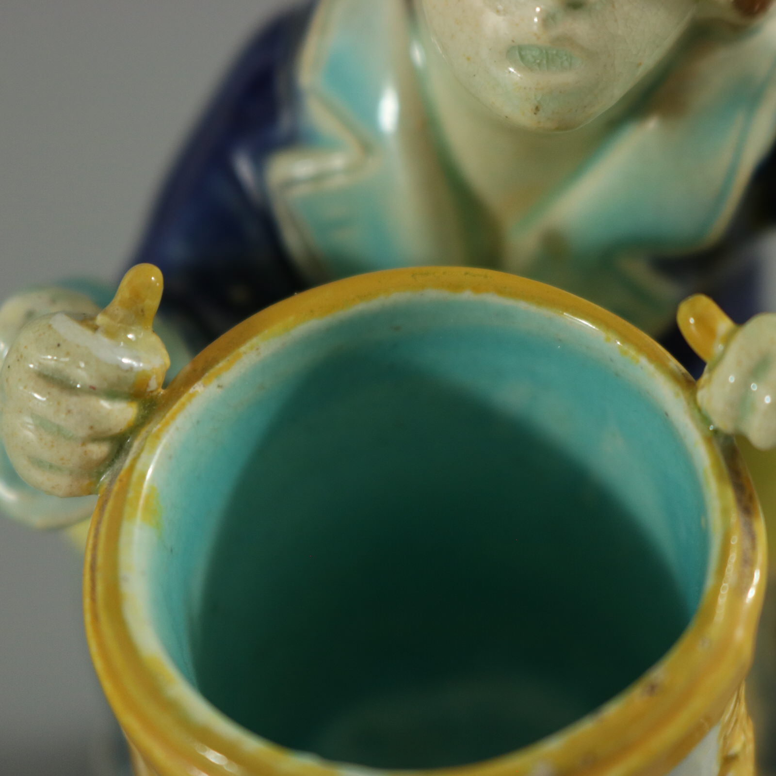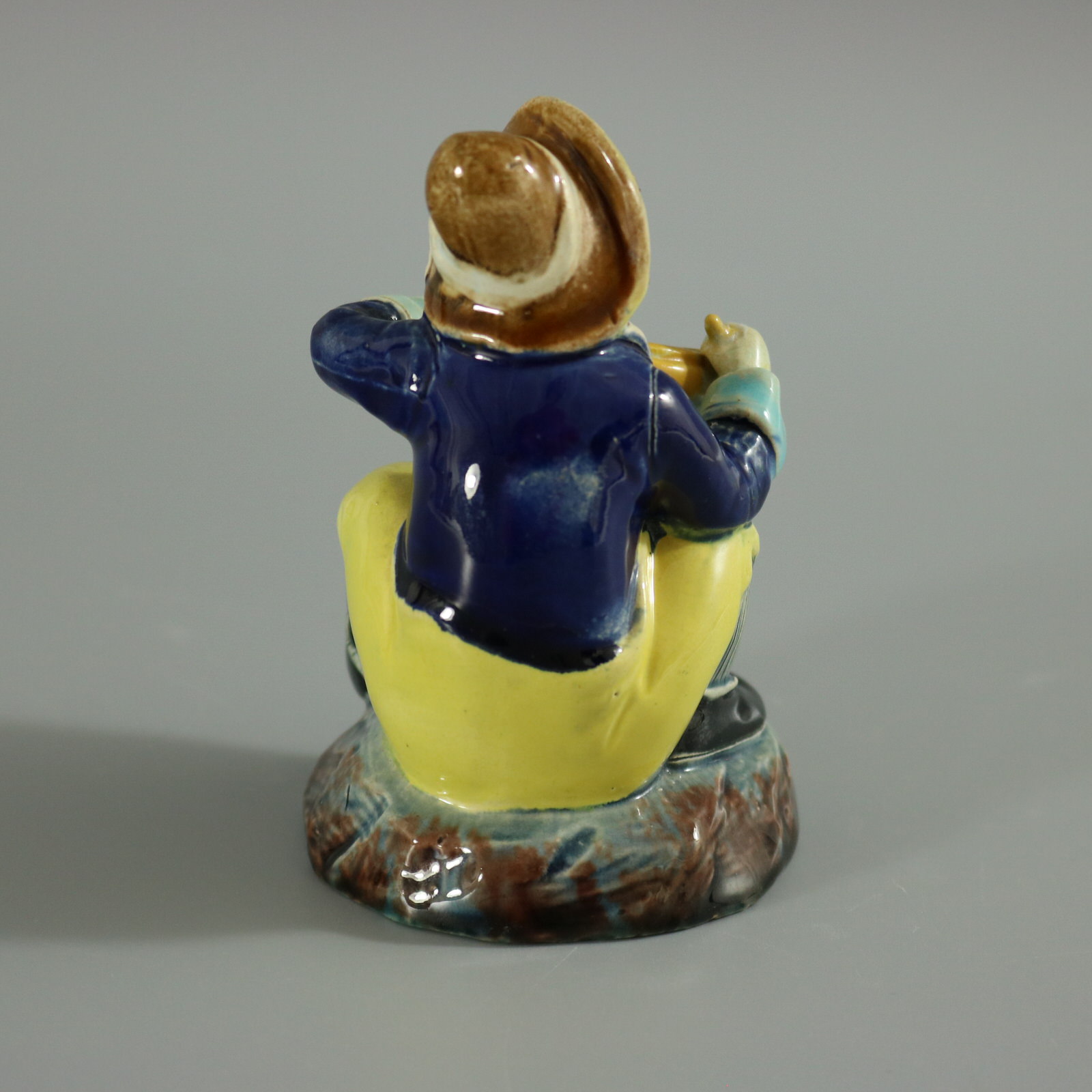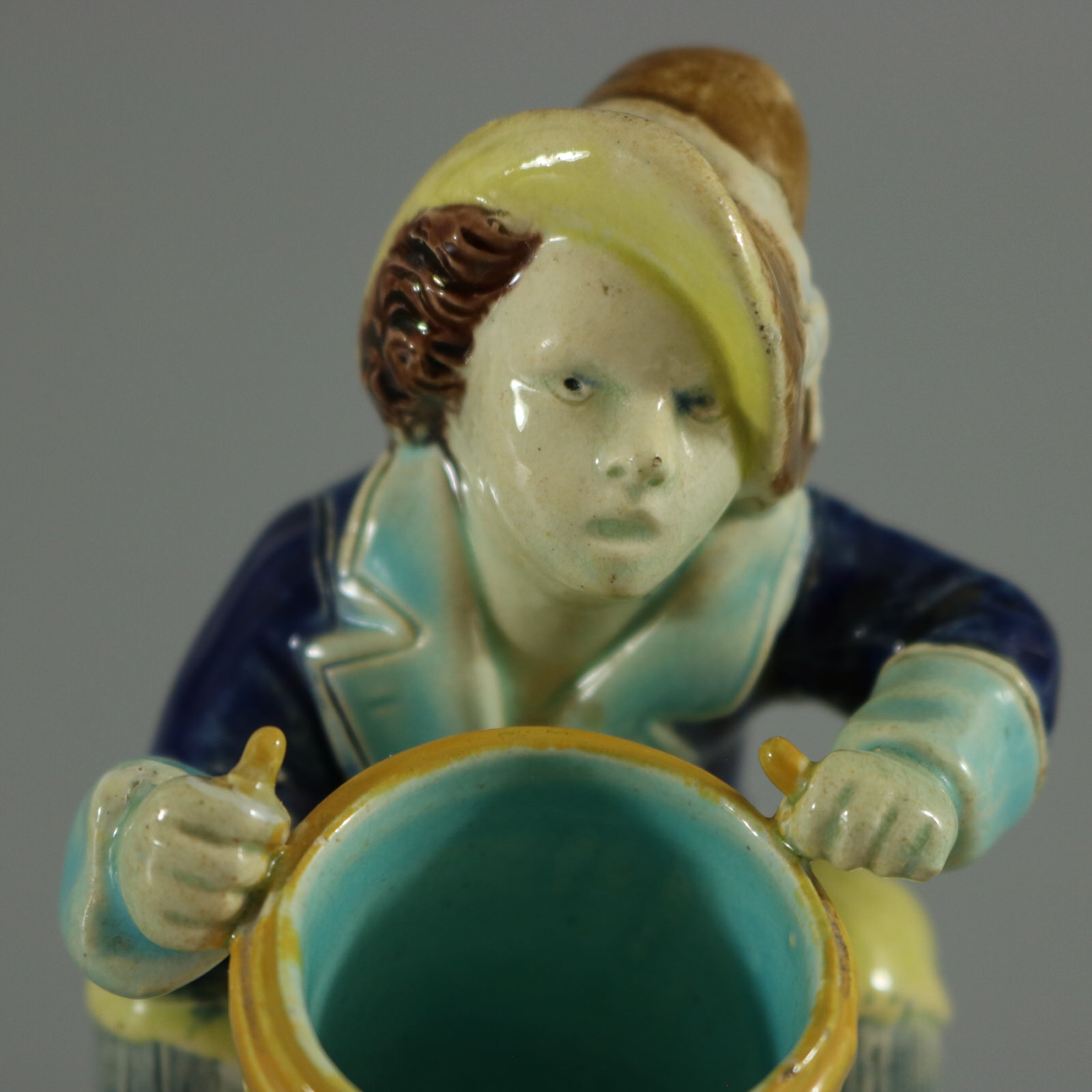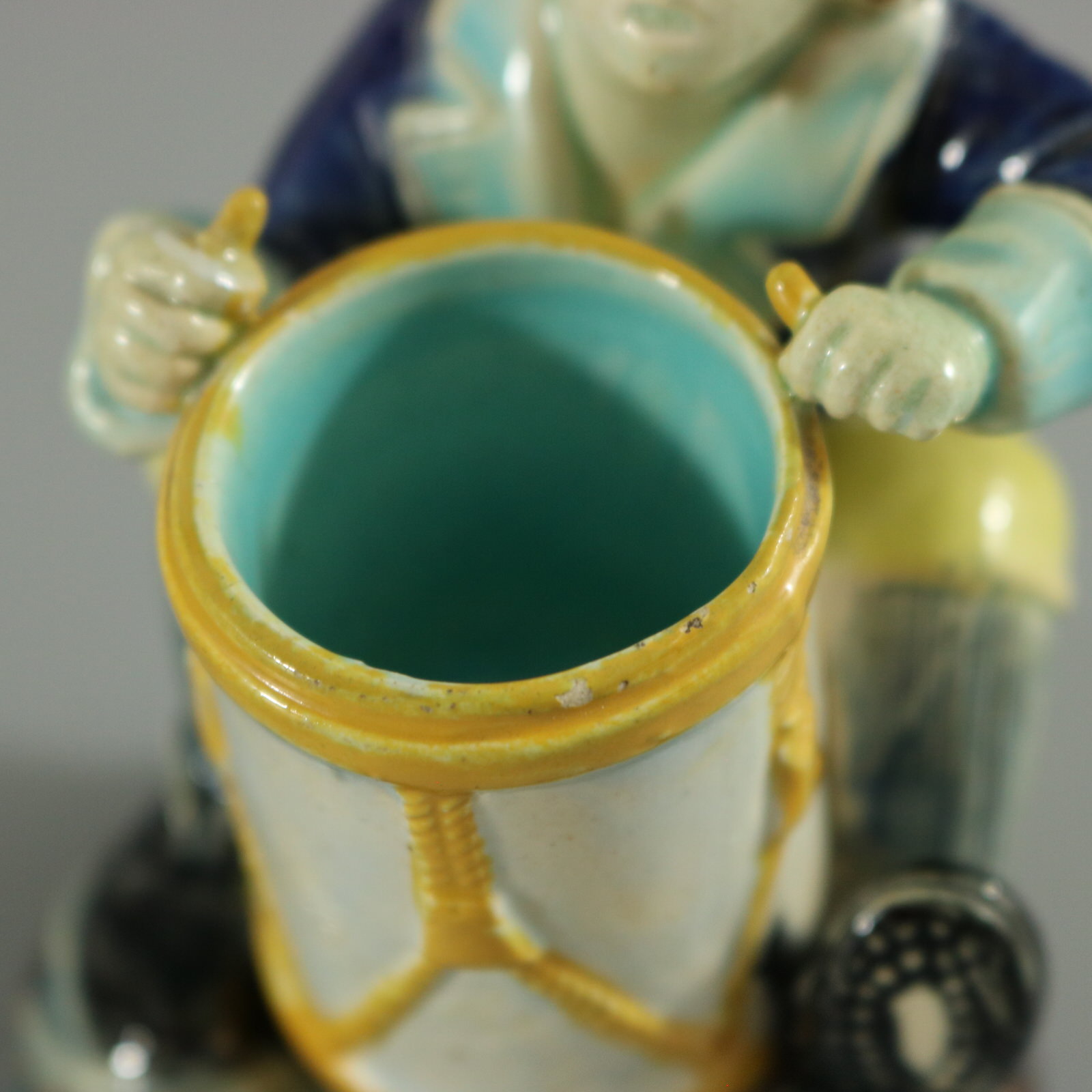 Victorian, circa 1880. 3.9ins high, 2.6ins wide, 2.8ins depth. Holdcroft Majolica match holder which features a seated boy, playing a drum.