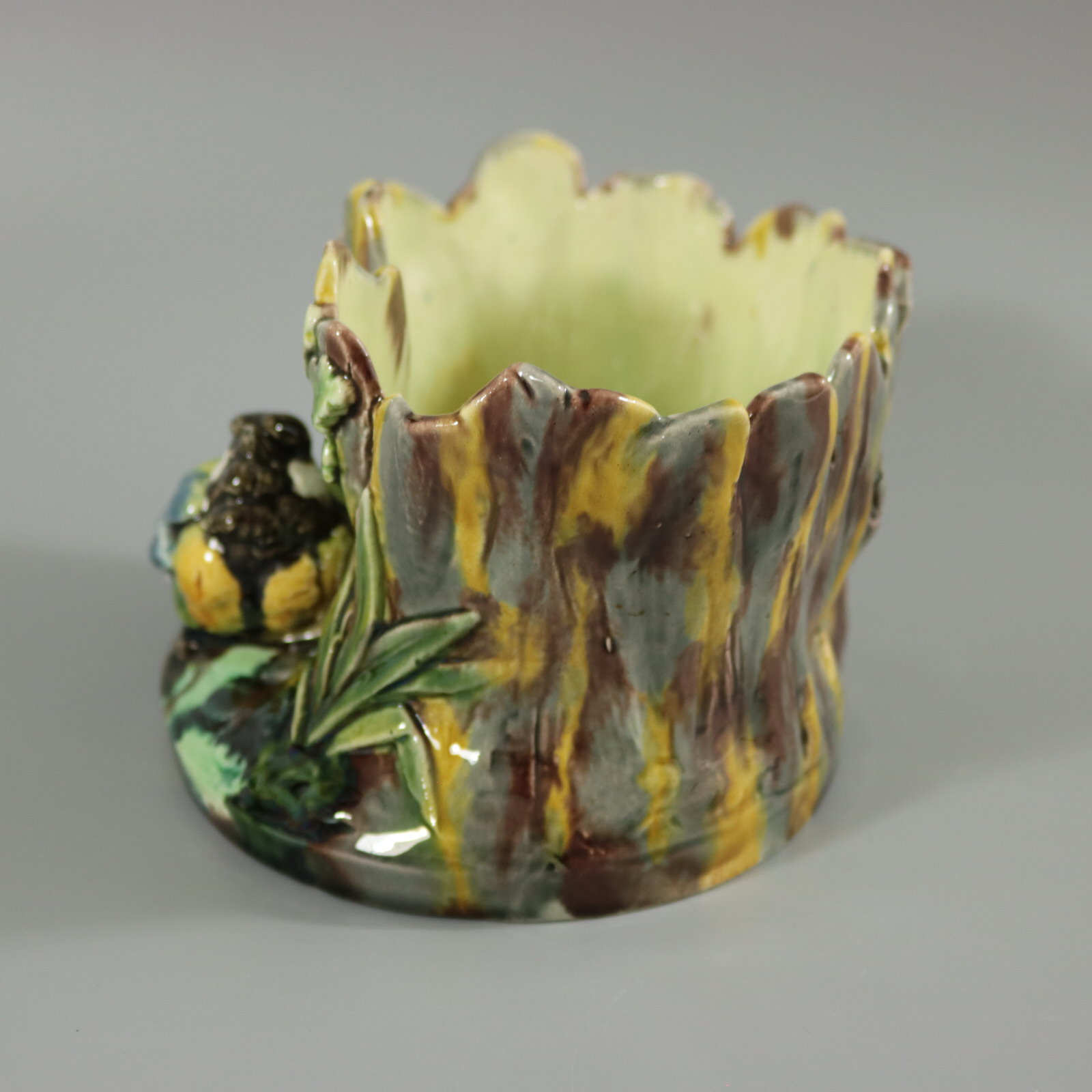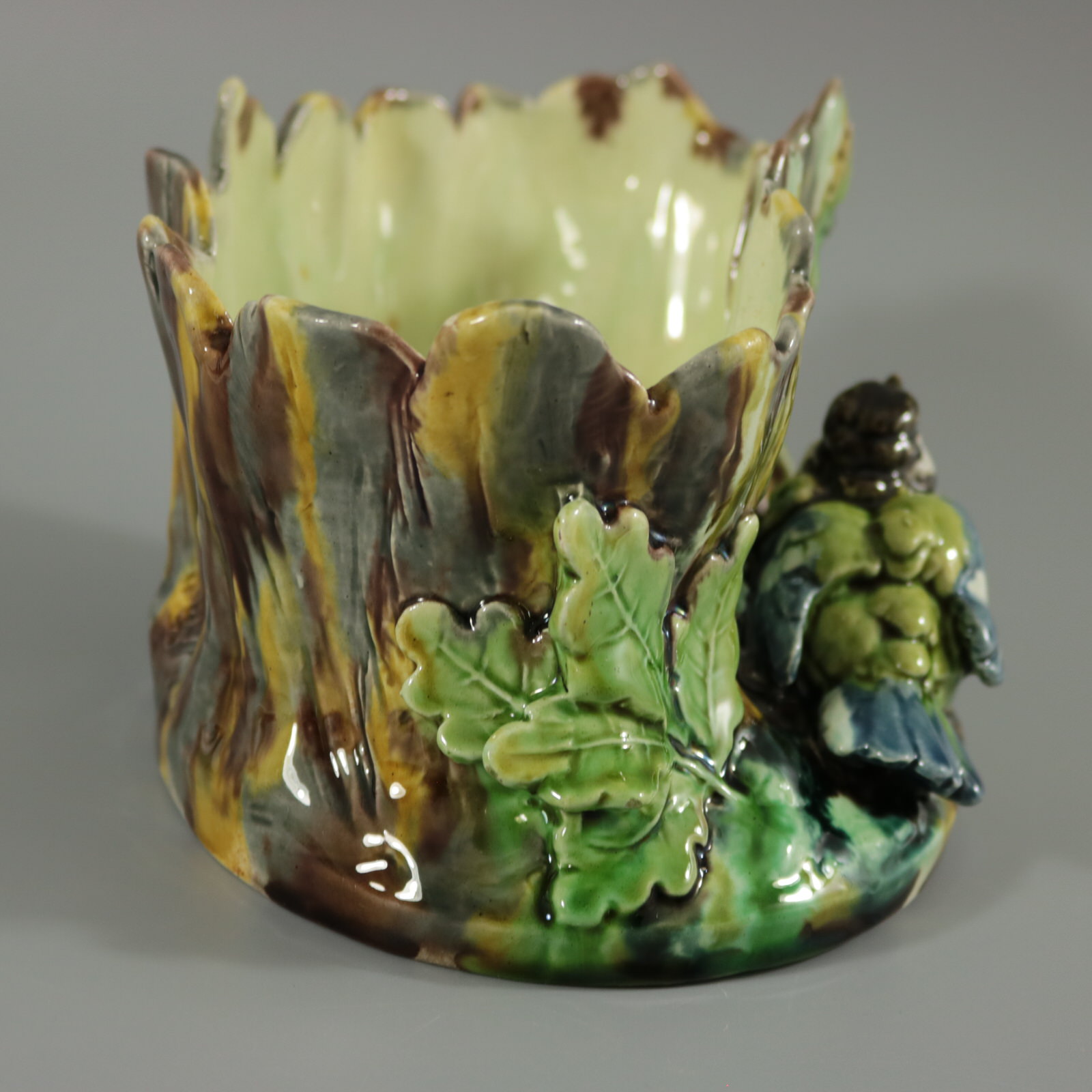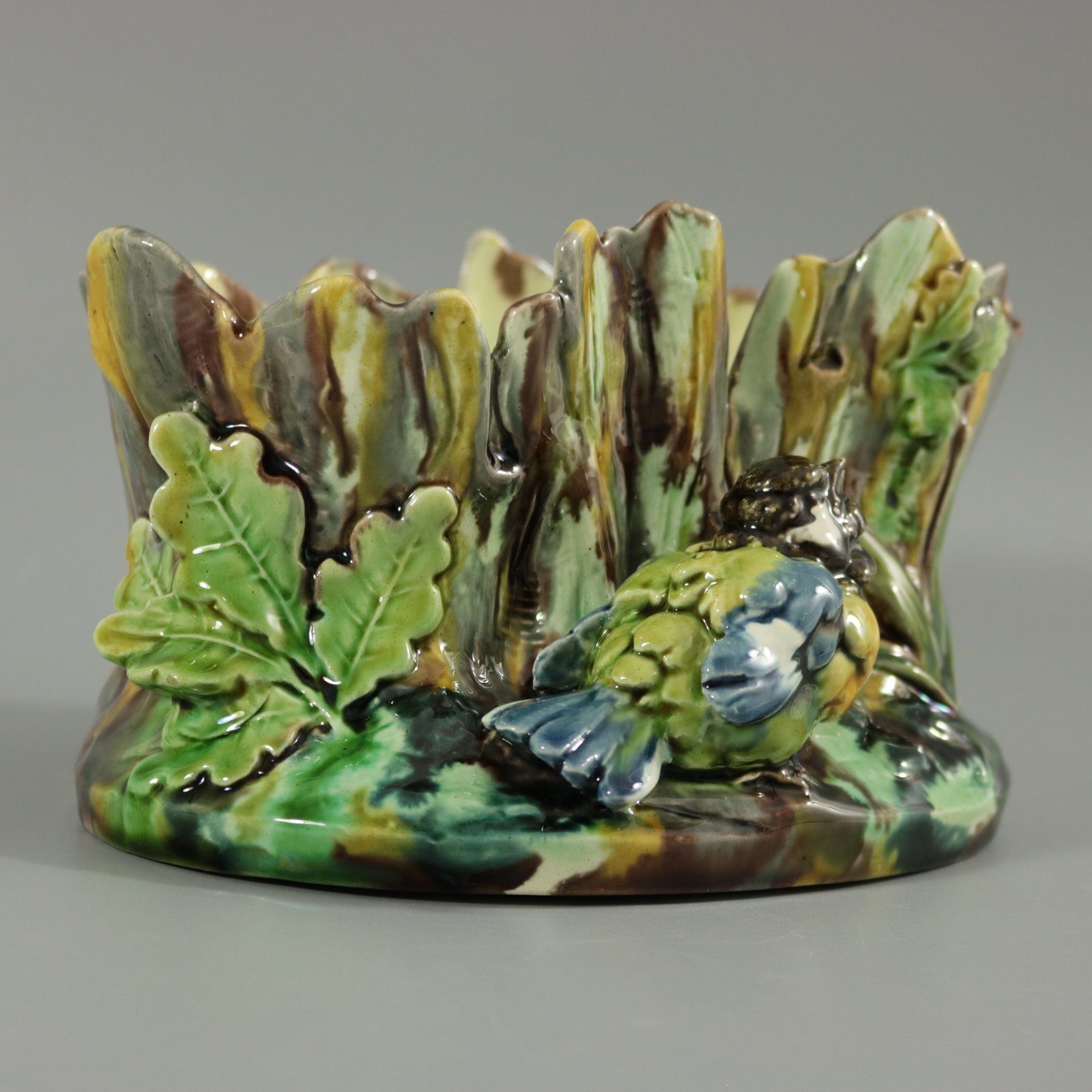 Circa 1875. 4.3ins high, 7.1ins wide, 5.5ins depth. Thomas Sergent French Majolica flower pot which features a great tit (bird) sat in front of a tree stump. Oak leaves either side.