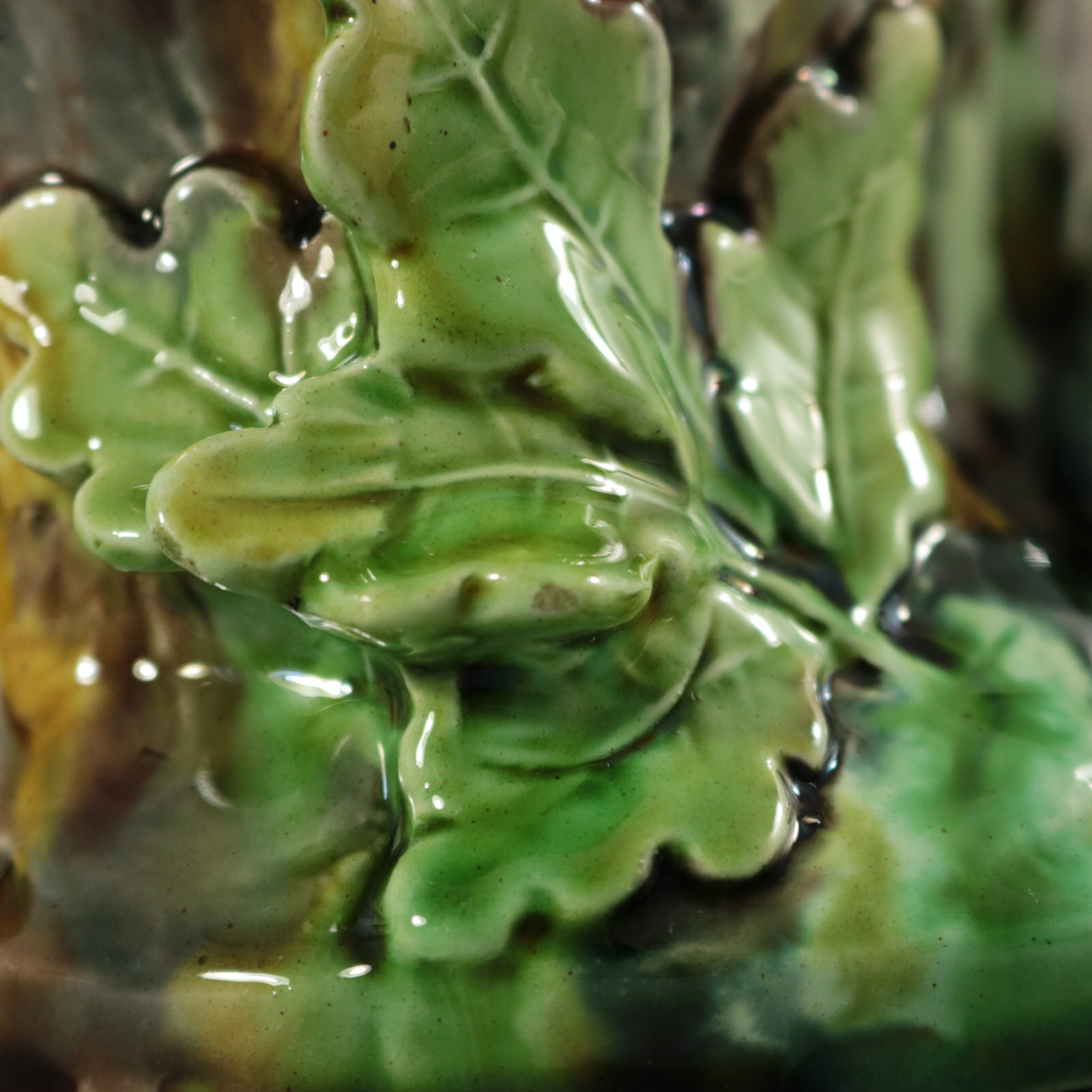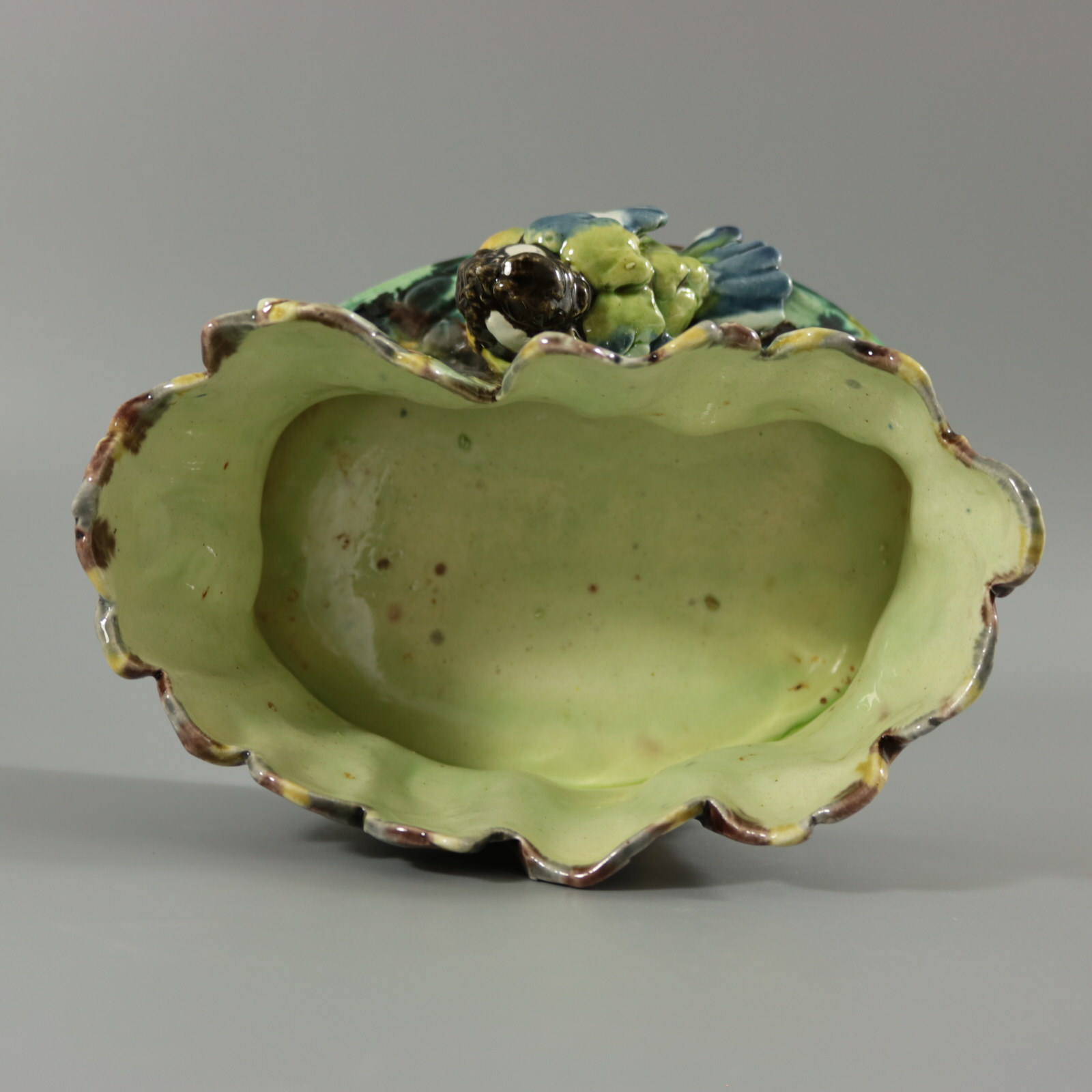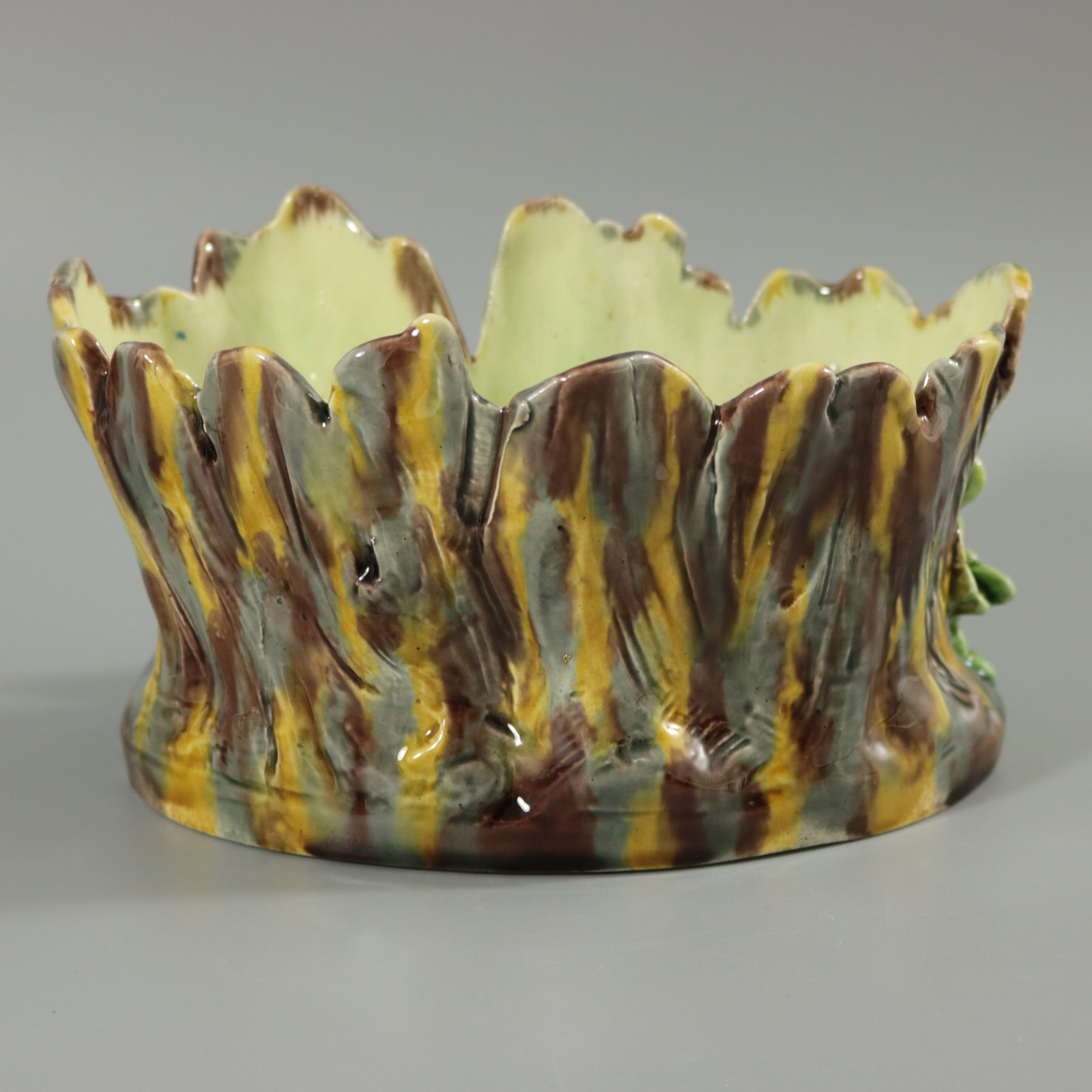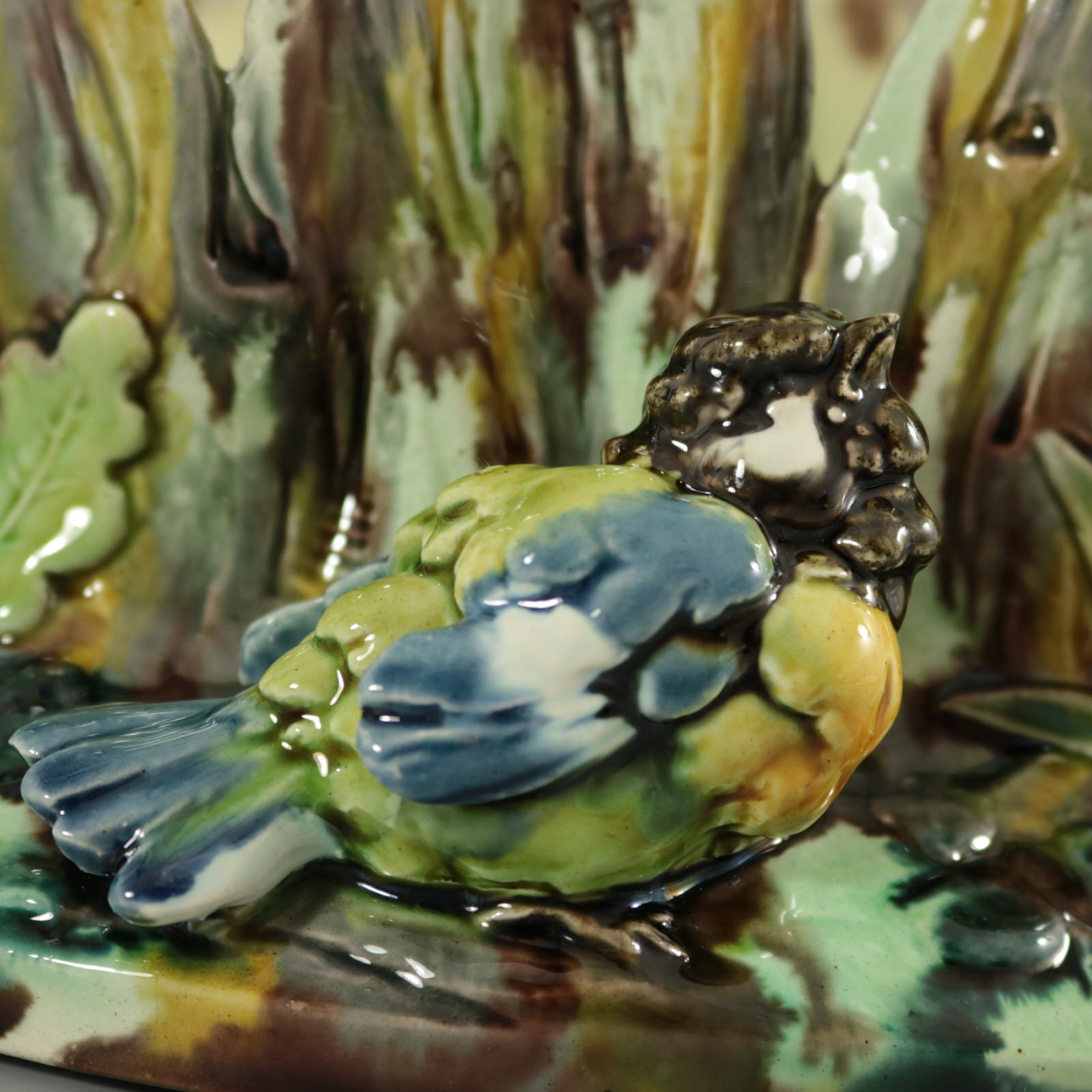 Circa 1875. 4.3ins high, 7.1ins wide, 5.5ins depth. Thomas Sergent French Majolica flower pot which features a great tit (bird) sat in front of a tree stump. Oak leaves either side.
