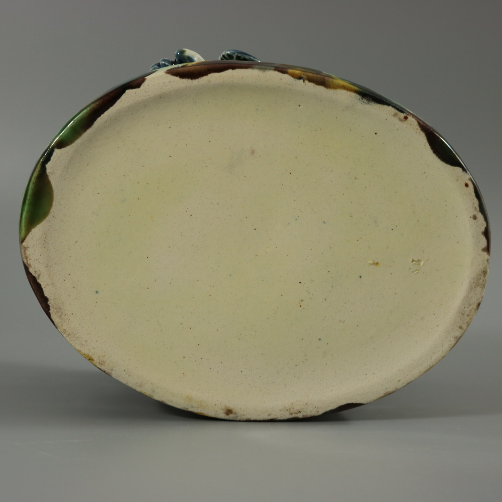 Colouration: green, blue, yellow, are predominant. The piece bears maker's marks for the Thomas Sergent pottery.
