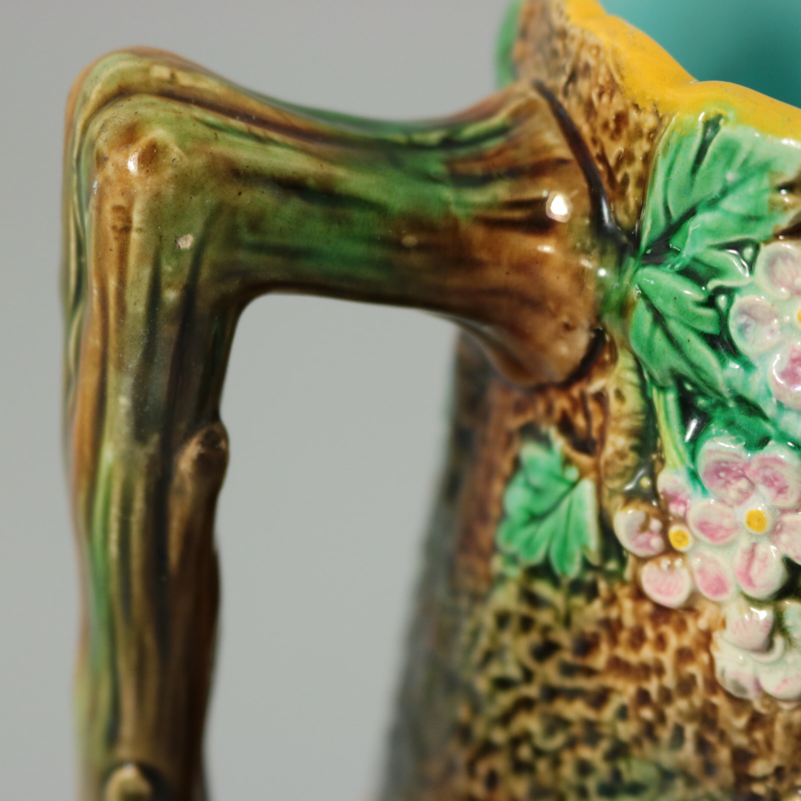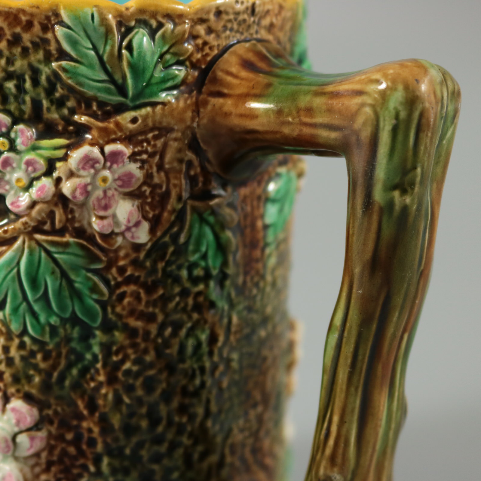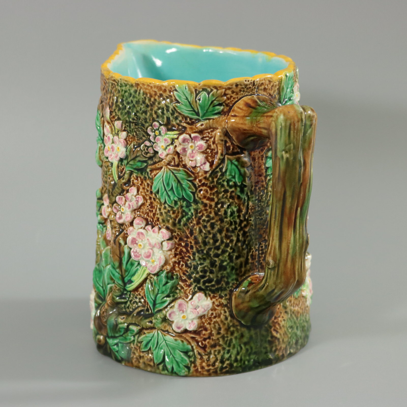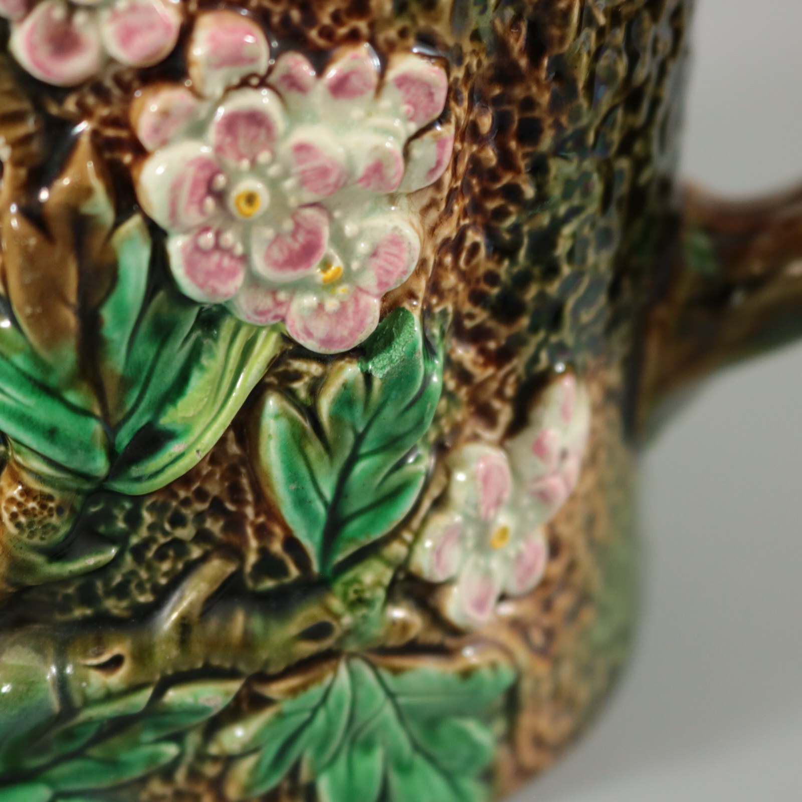 Victorian, circa 1870. 6.1ins high, 6.7ins wide, 4.9ins depth. George Jones Majolica jug/pitcher which features pink and white blossom (hawthorn or mayflower), and green leaves on brown, bark effect ground and a rustic branch molded handle.