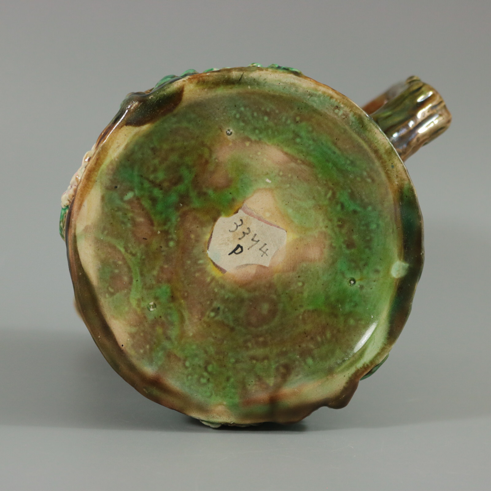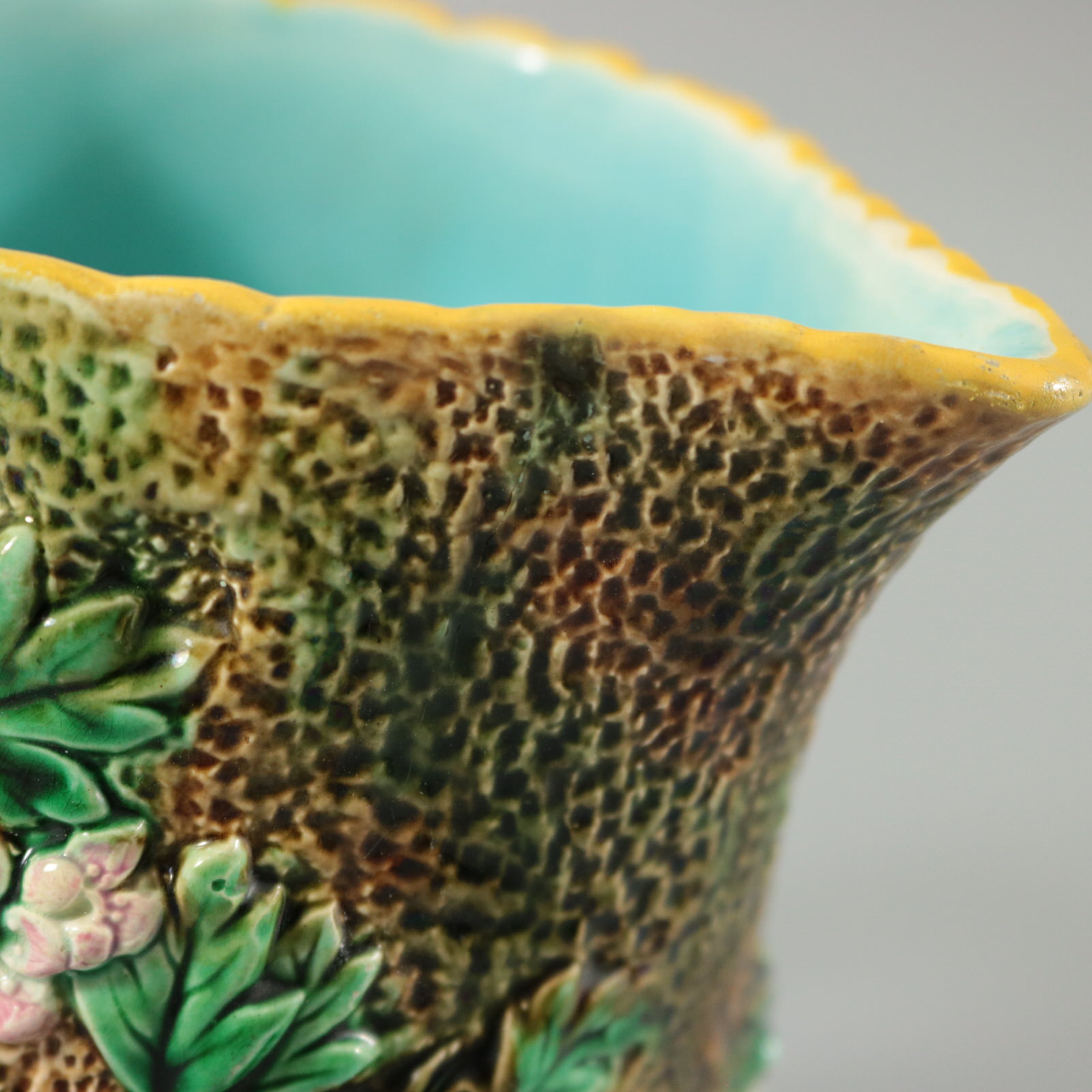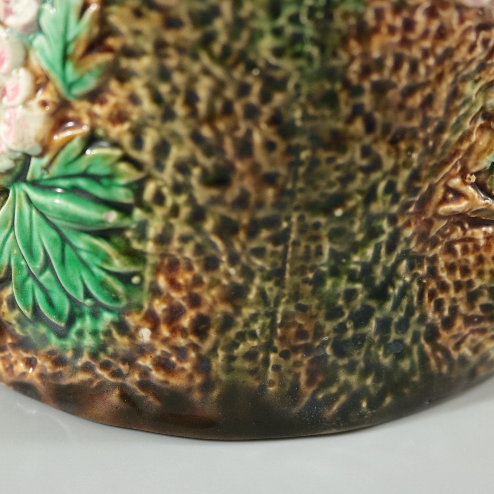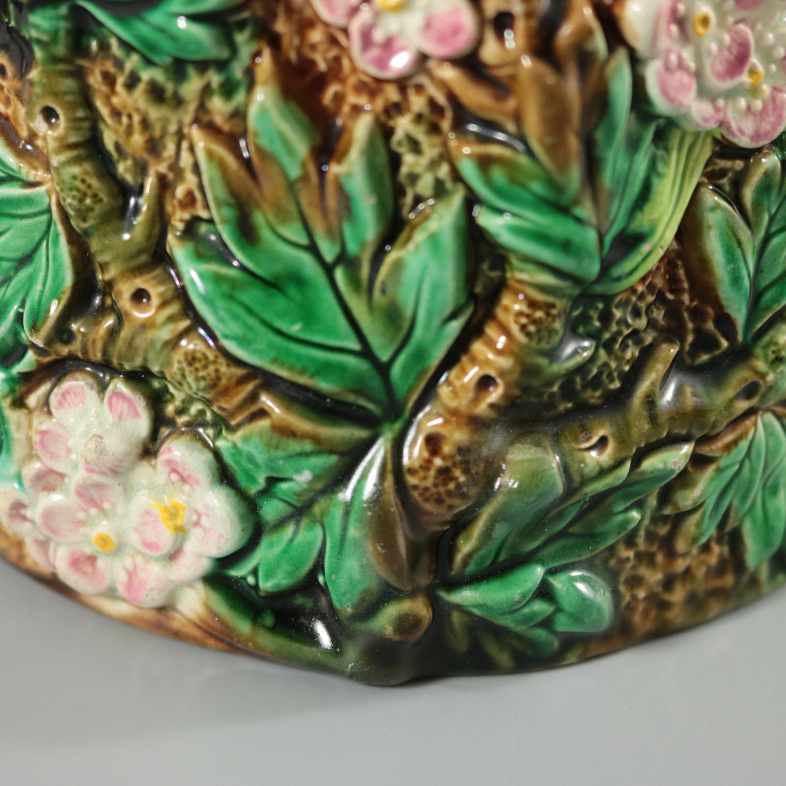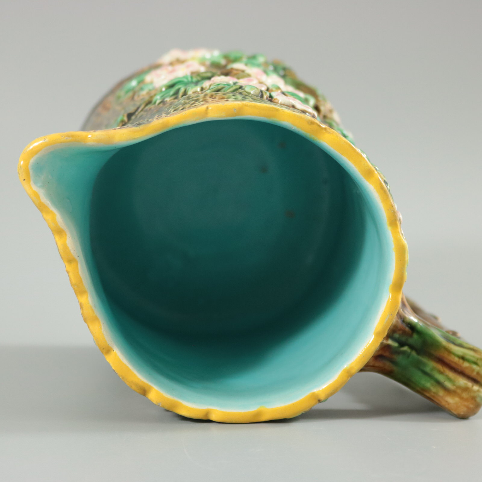 Victorian, circa 1870. 6.1ins high, 6.7ins wide, 4.9ins depth. George Jones Majolica jug/pitcher which features pink and white blossom (hawthorn or mayflower), and green leaves on brown, bark effect ground and a rustic branch molded handle.