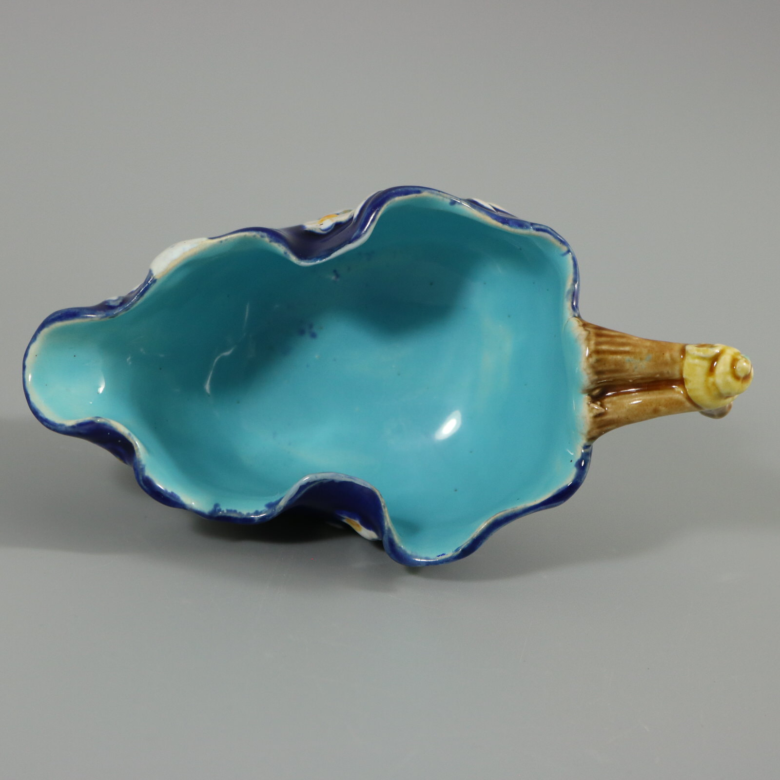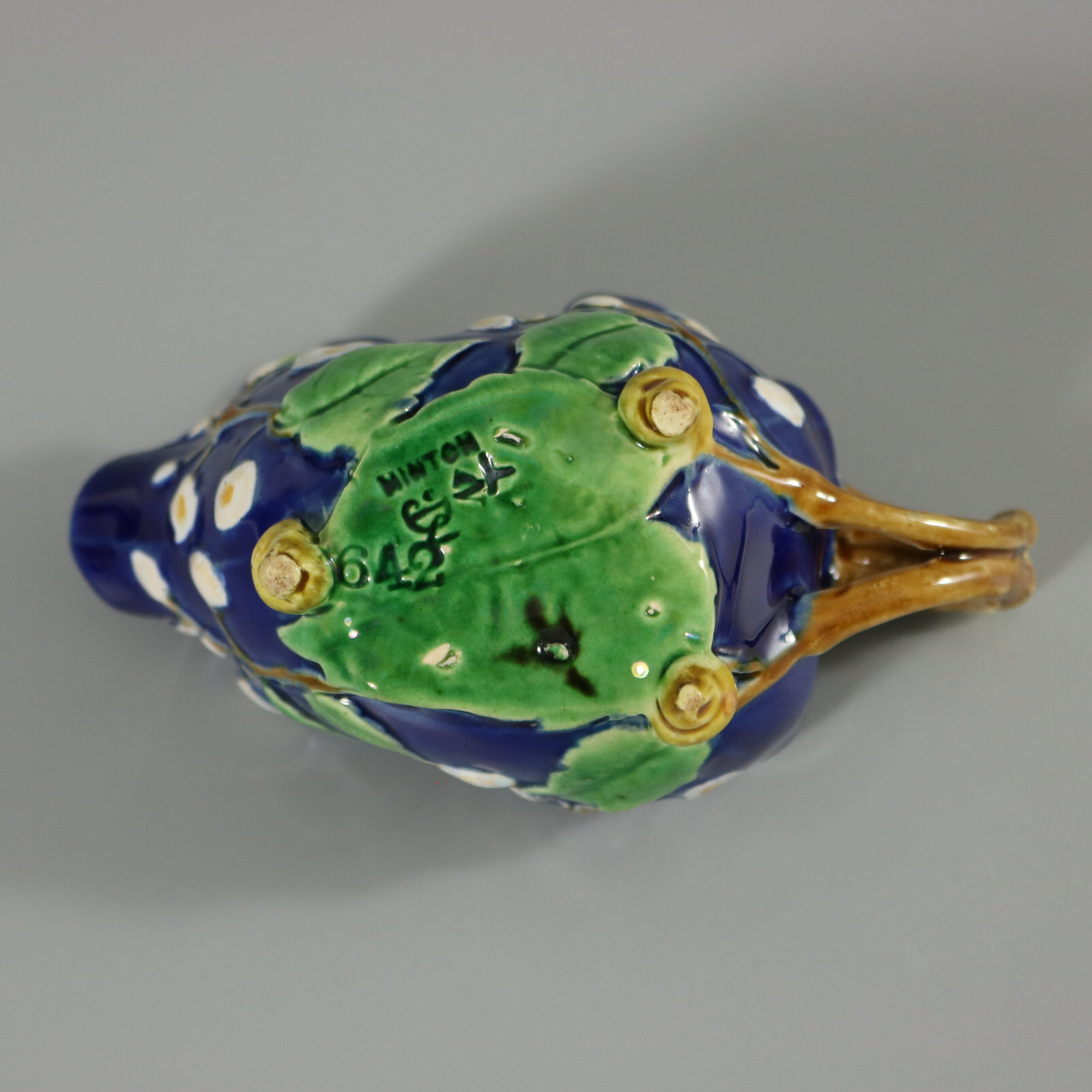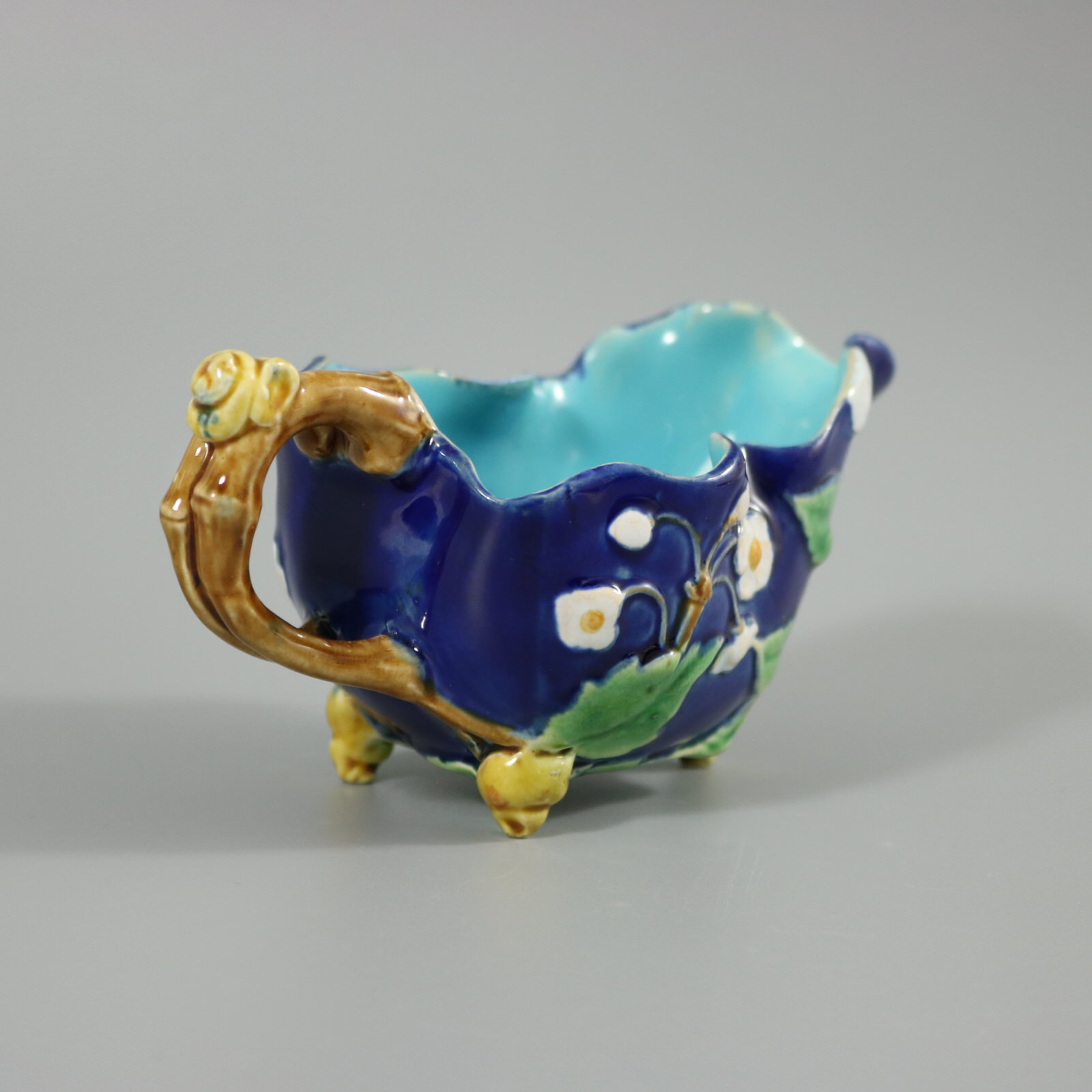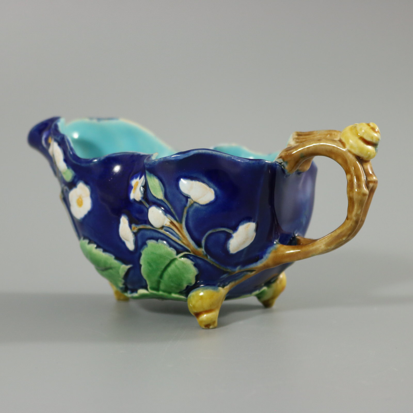 Victorian, circa 1871. 2.7ins high, 5.1ins wide, 2.8ins depth. Minton Majolica creamer which features a blossoming branch, snail shell on handle and feet.