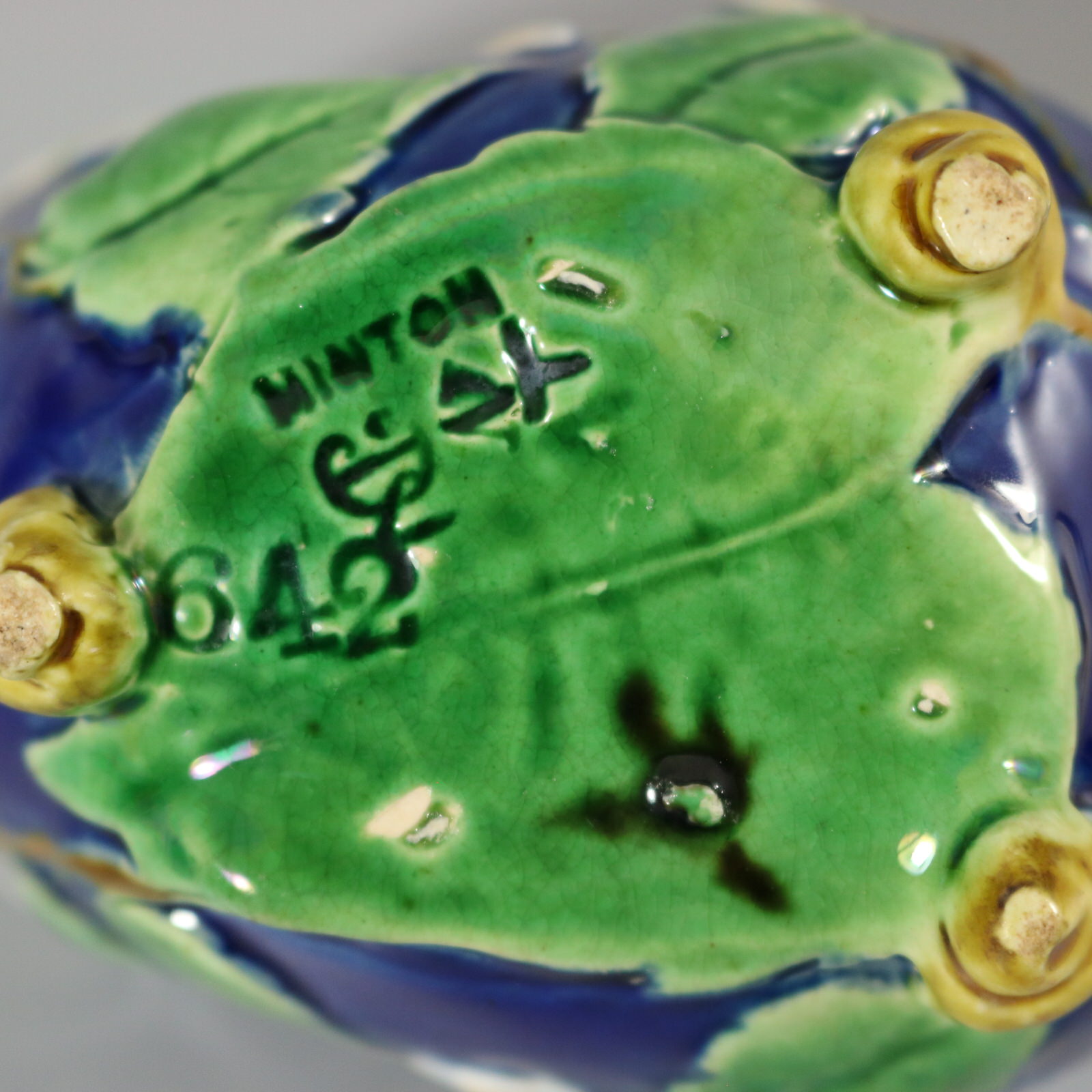 The piece bears maker's marks for the Minton pottery. Bears a pattern number, '642'. Marks include a factory specific date cipher for the year 1871.