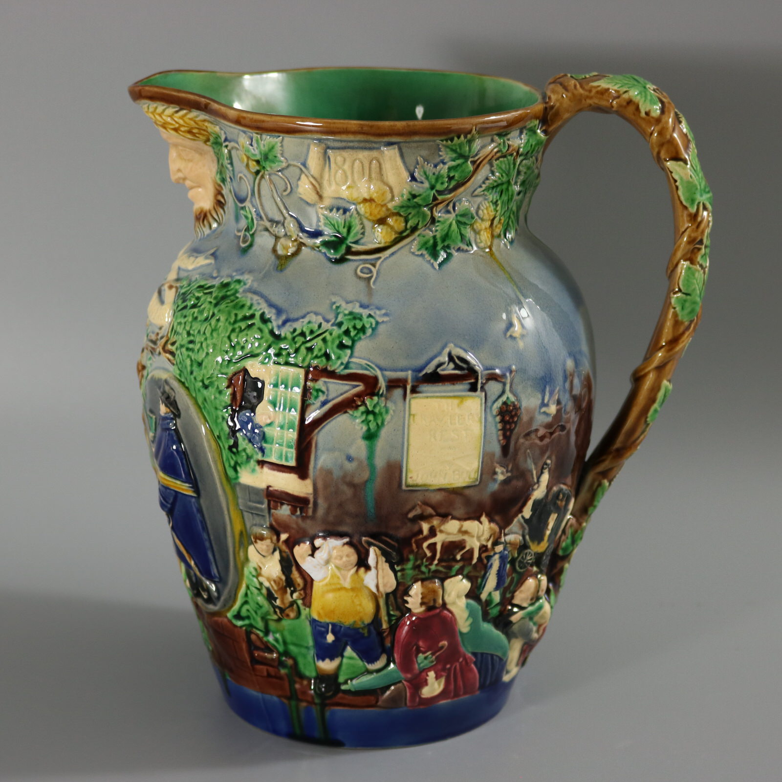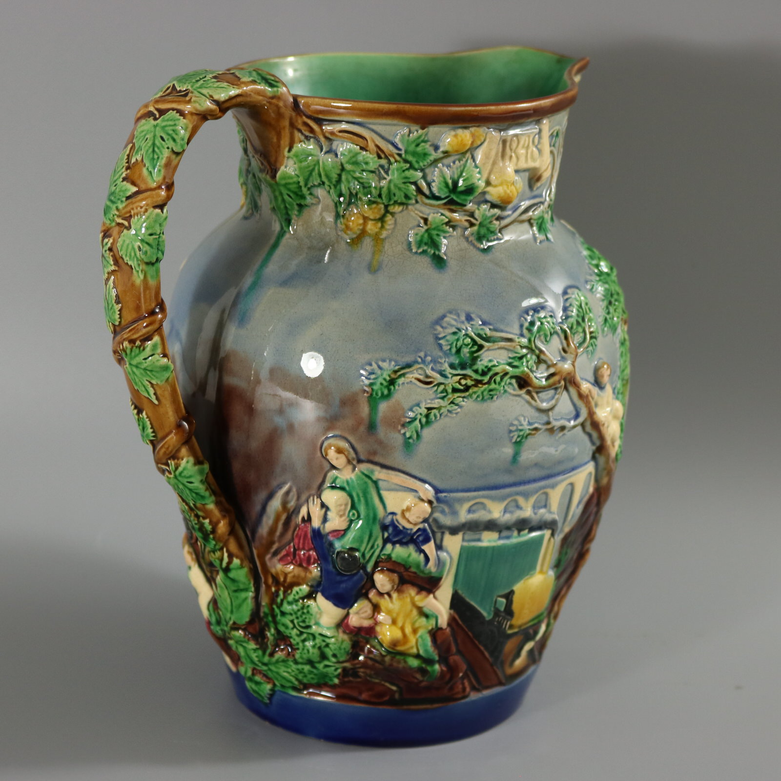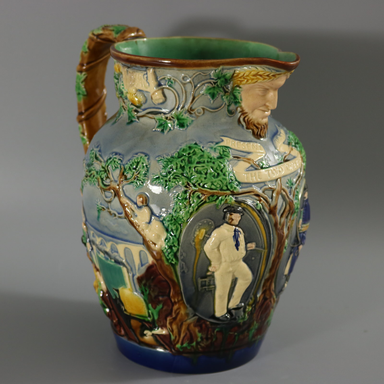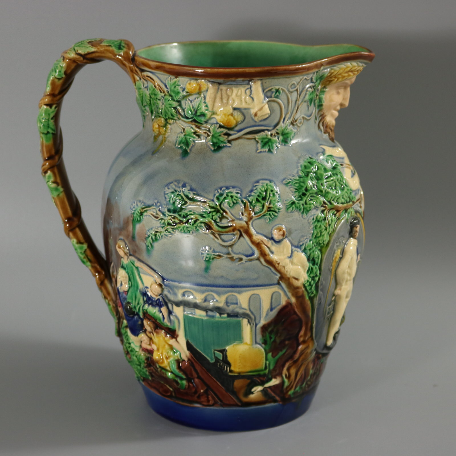 Victorian, circa 1857. 8.7ins high, 7.9ins wide, 5.9ins depth. Minton Majolica jug/pitcher which features pictorial scenes of past and present.
