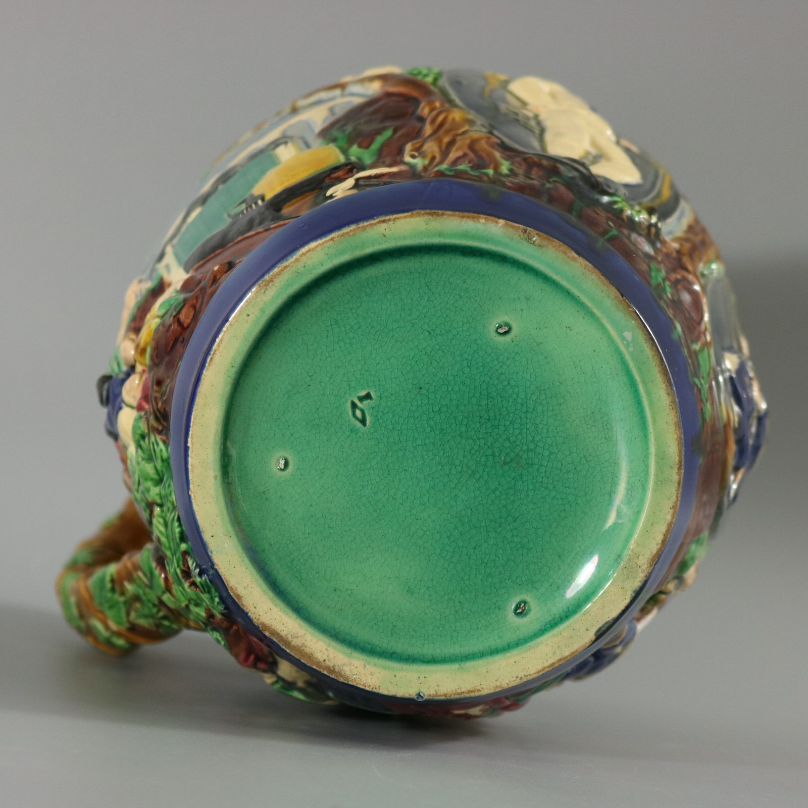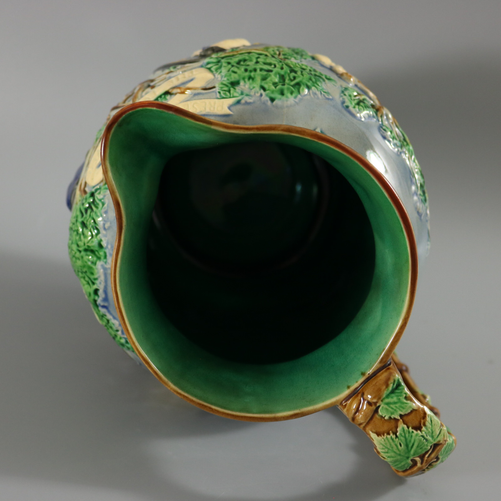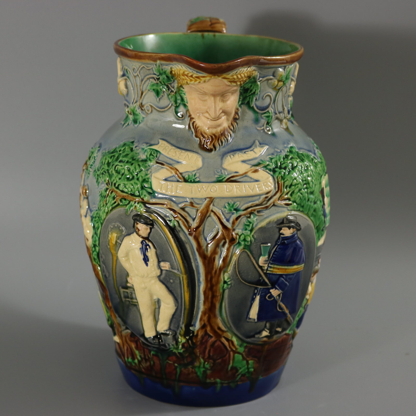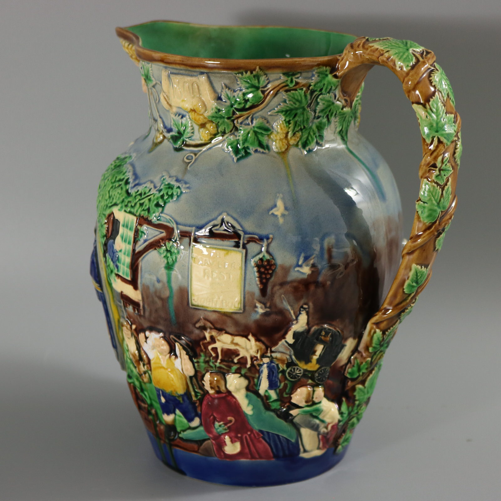 Victorian, circa 1857. 8.7ins high, 7.9ins wide, 5.9ins depth. Minton Majolica jug/pitcher which features pictorial scenes of past and present.