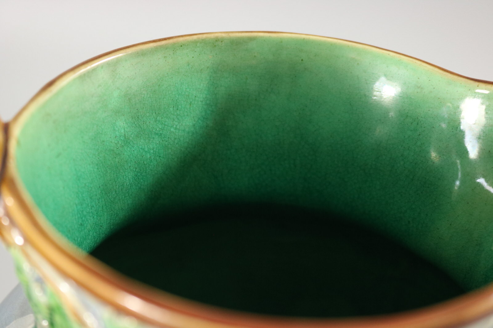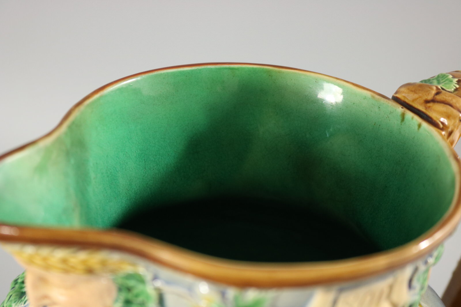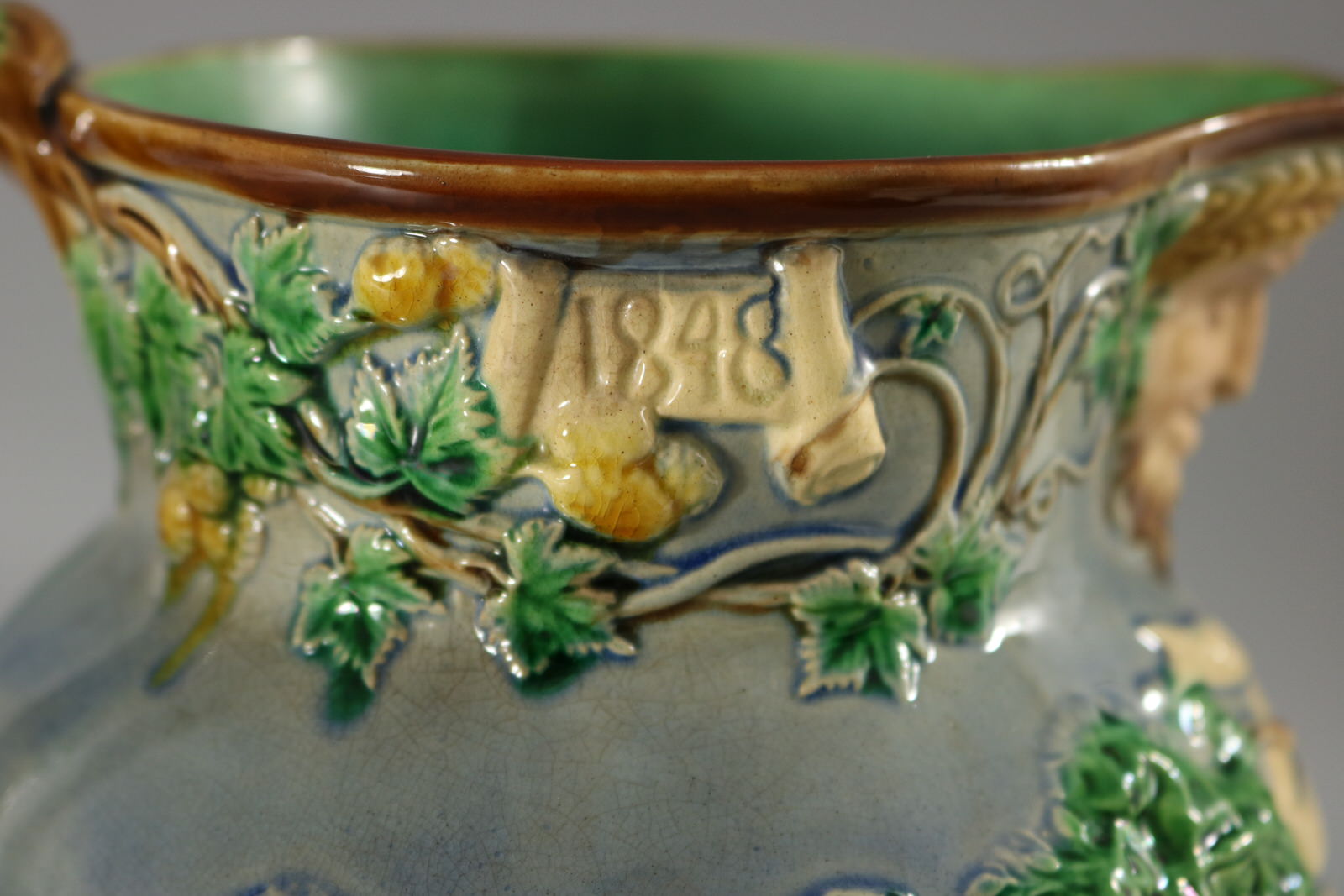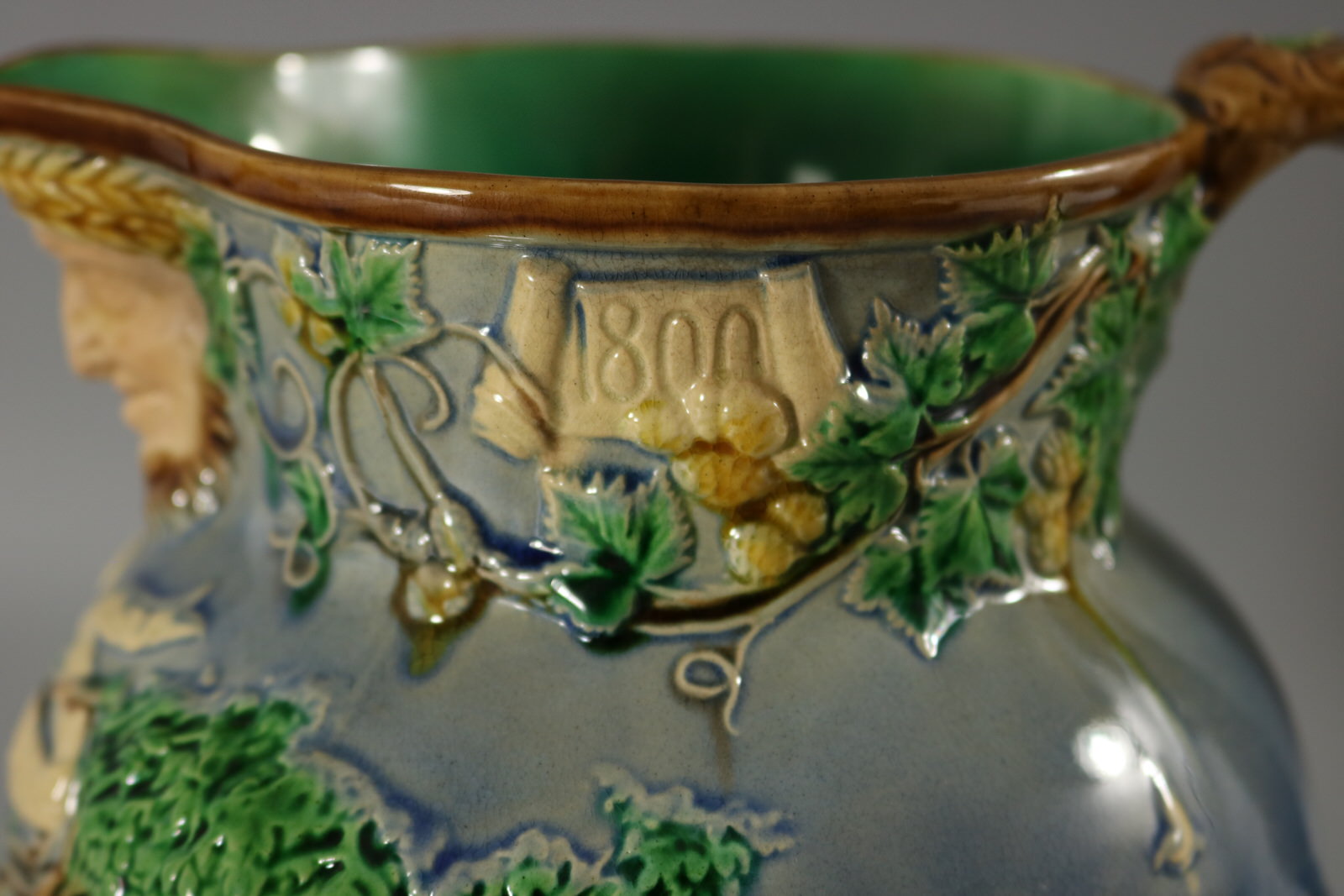 Victorian, circa 1857. 8.7ins high, 7.9ins wide, 5.9ins depth. Minton Majolica jug/pitcher which features pictorial scenes of past and present.