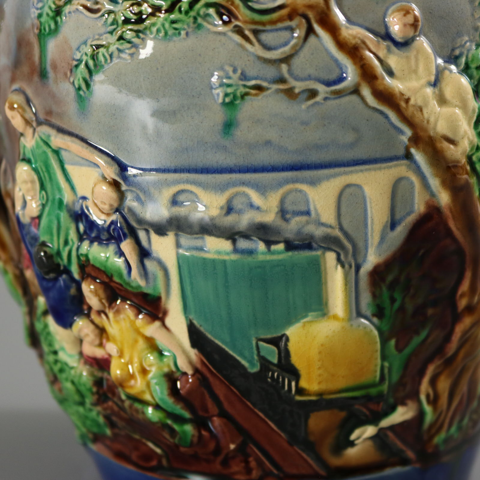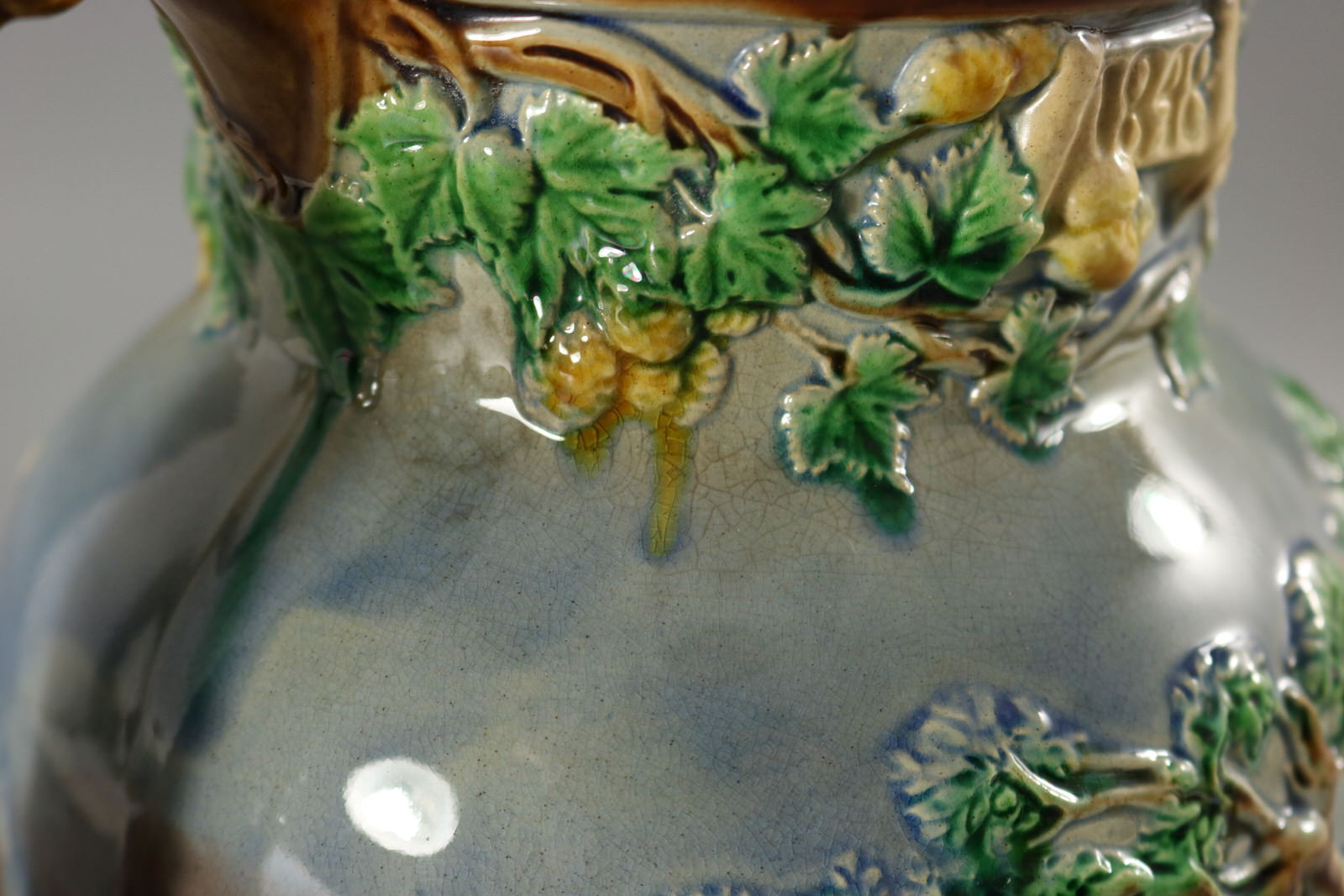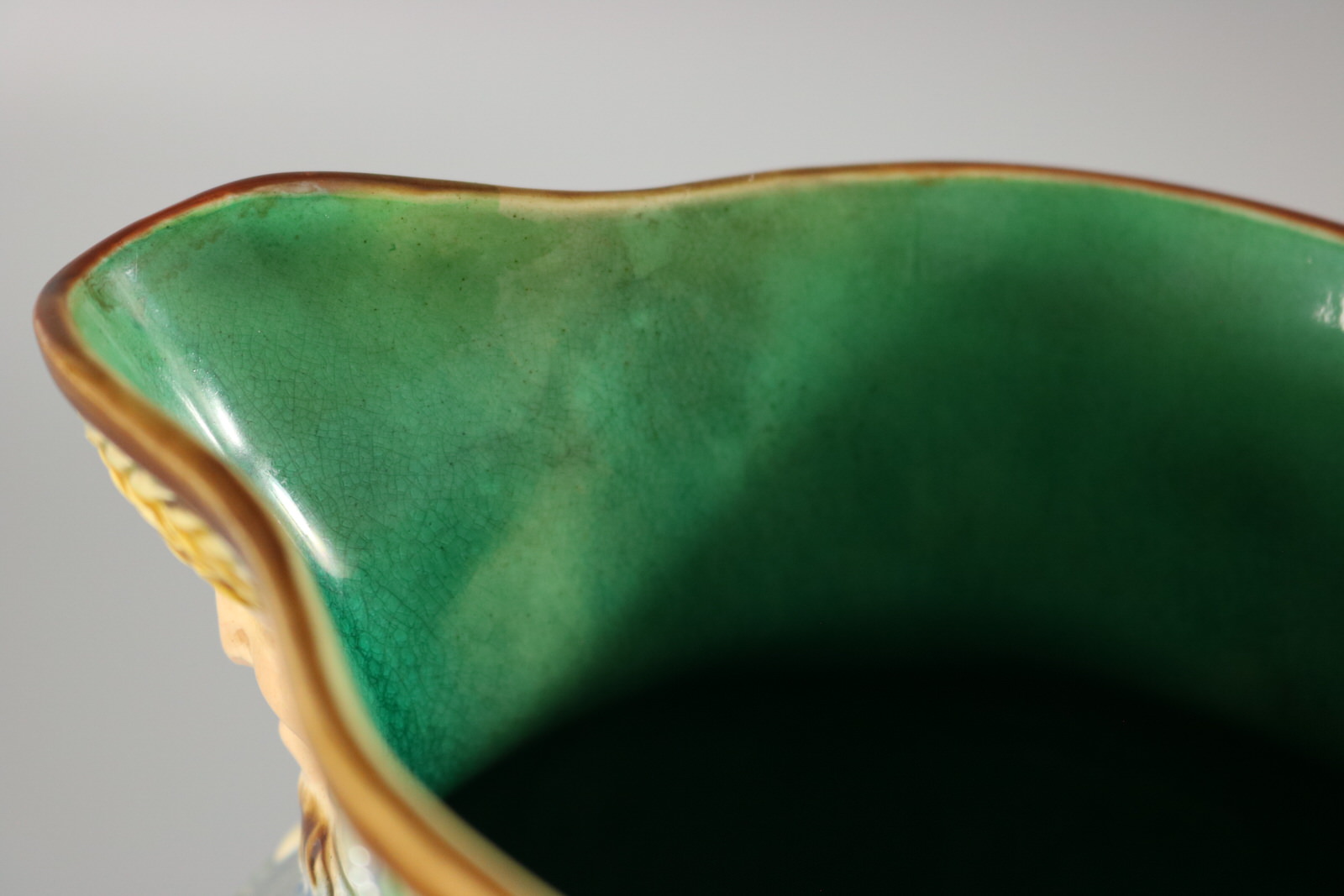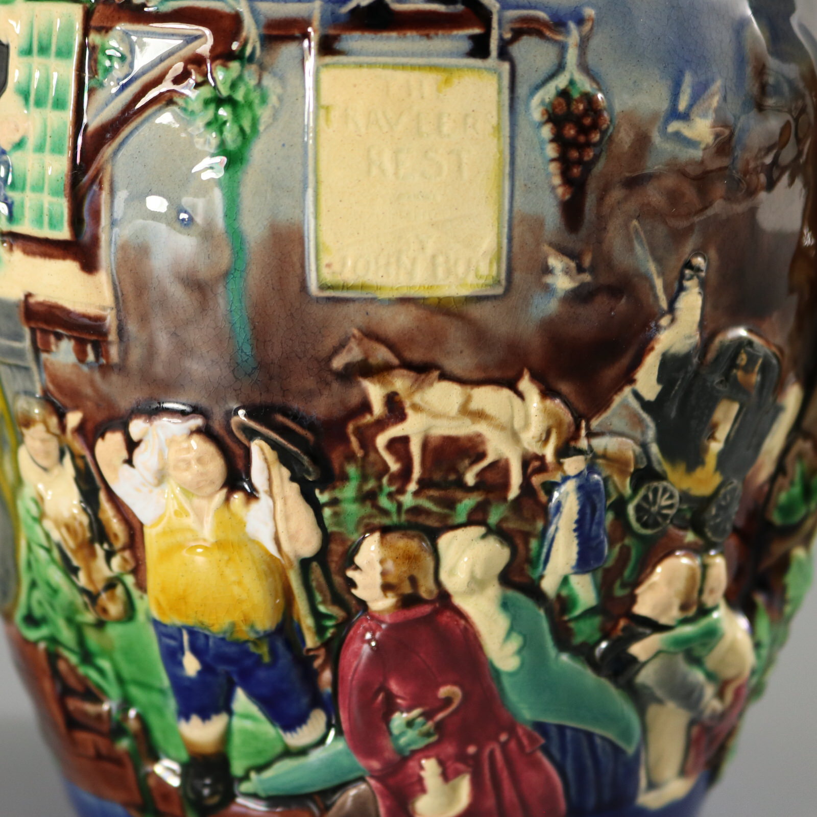 Victorian, circa 1857. 8.7ins high, 7.9ins wide, 5.9ins depth. Minton Majolica jug/pitcher which features pictorial scenes of past and present.