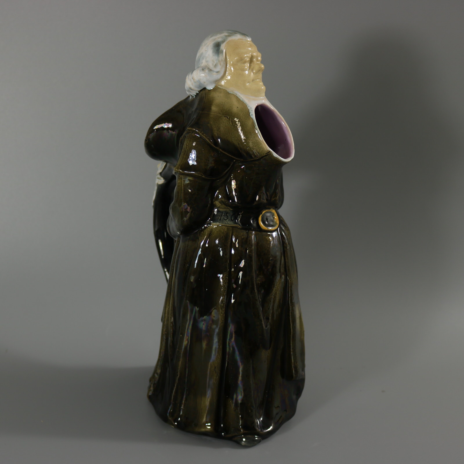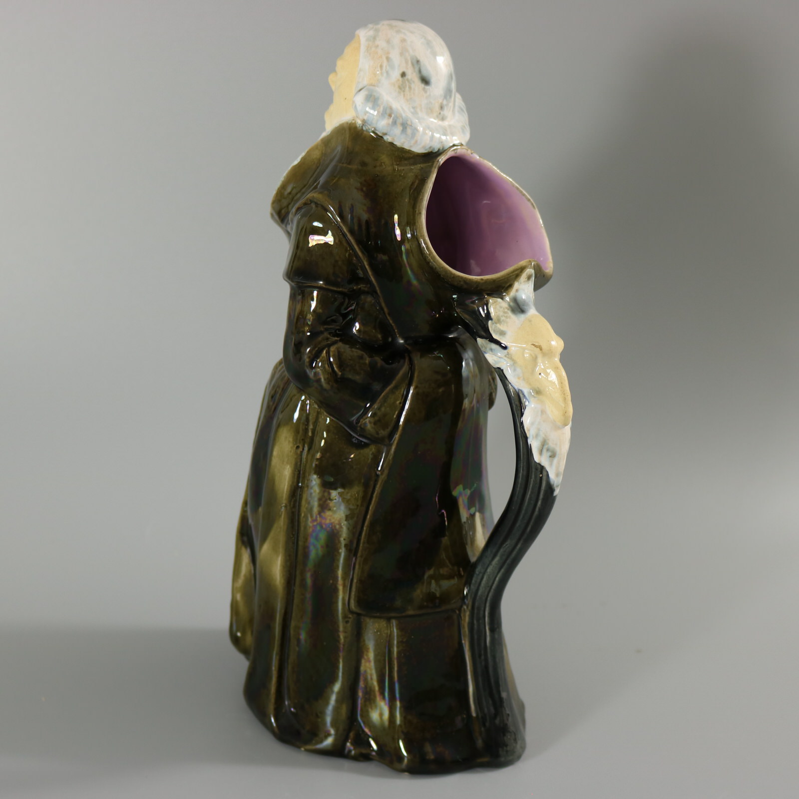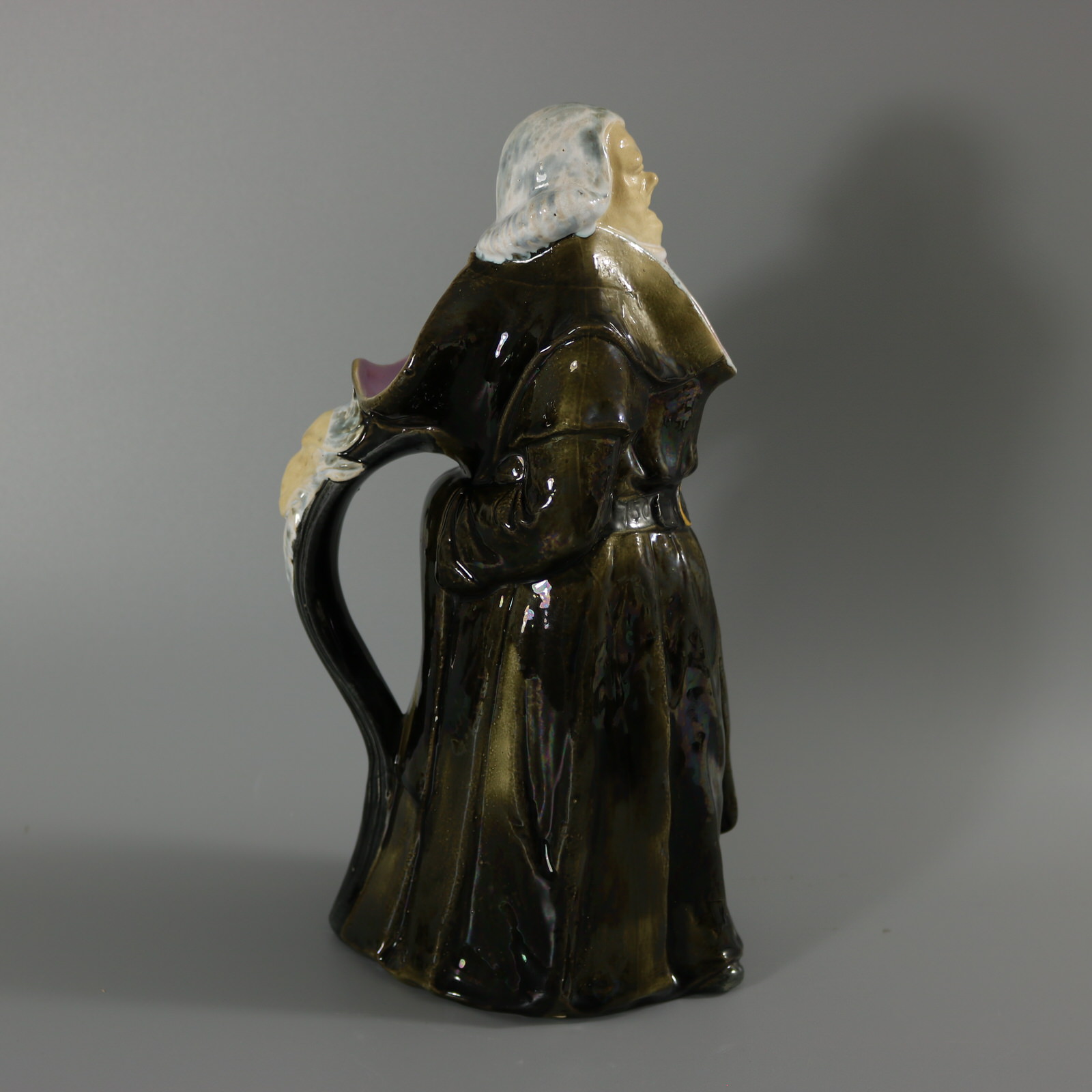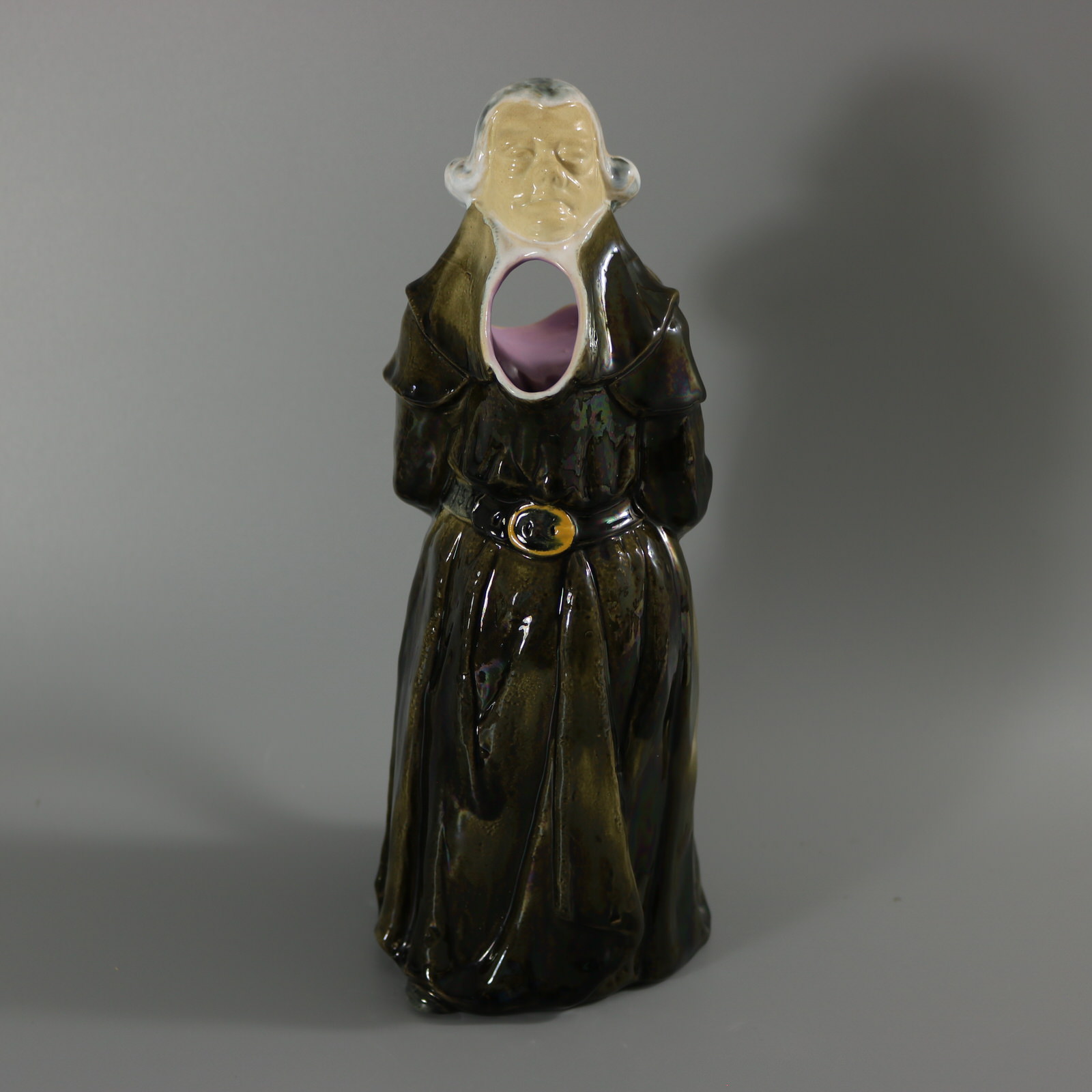 Victorian, circa 1875. 12ins high, 6.3ins wide, 4.9ins depth. George Jones Majolica jug/pitcher which features a monk, standing with hands behind his back.