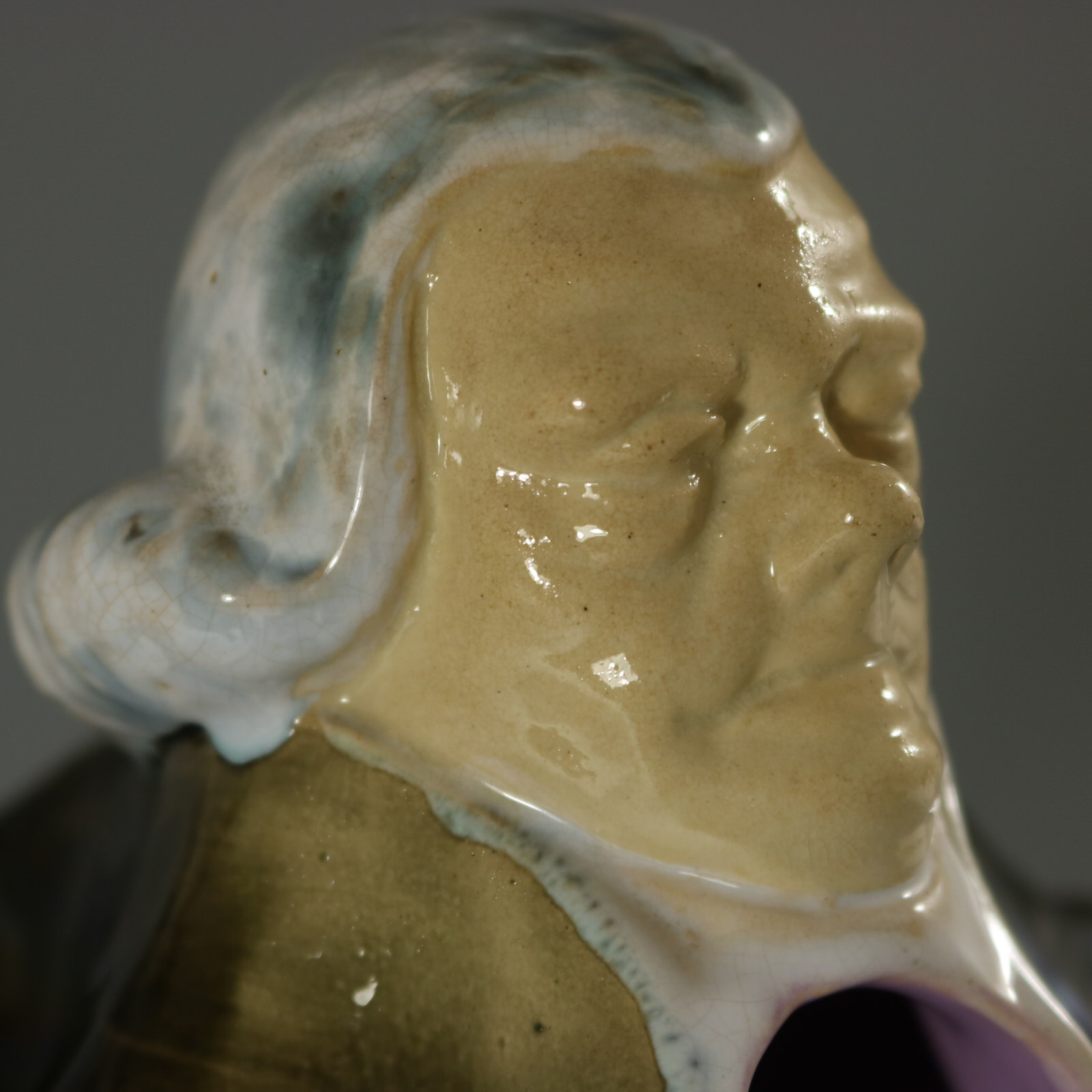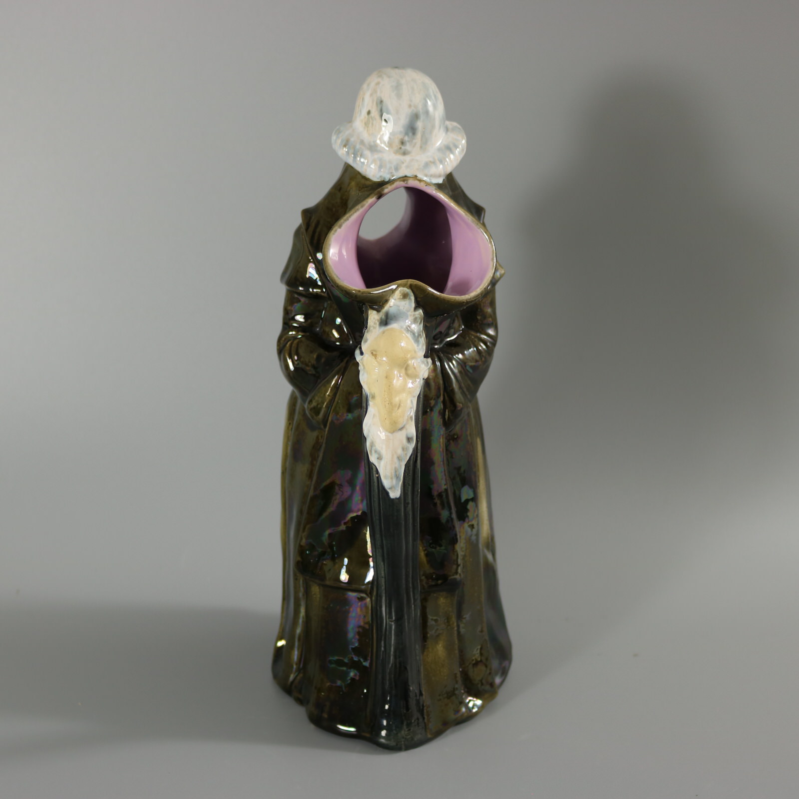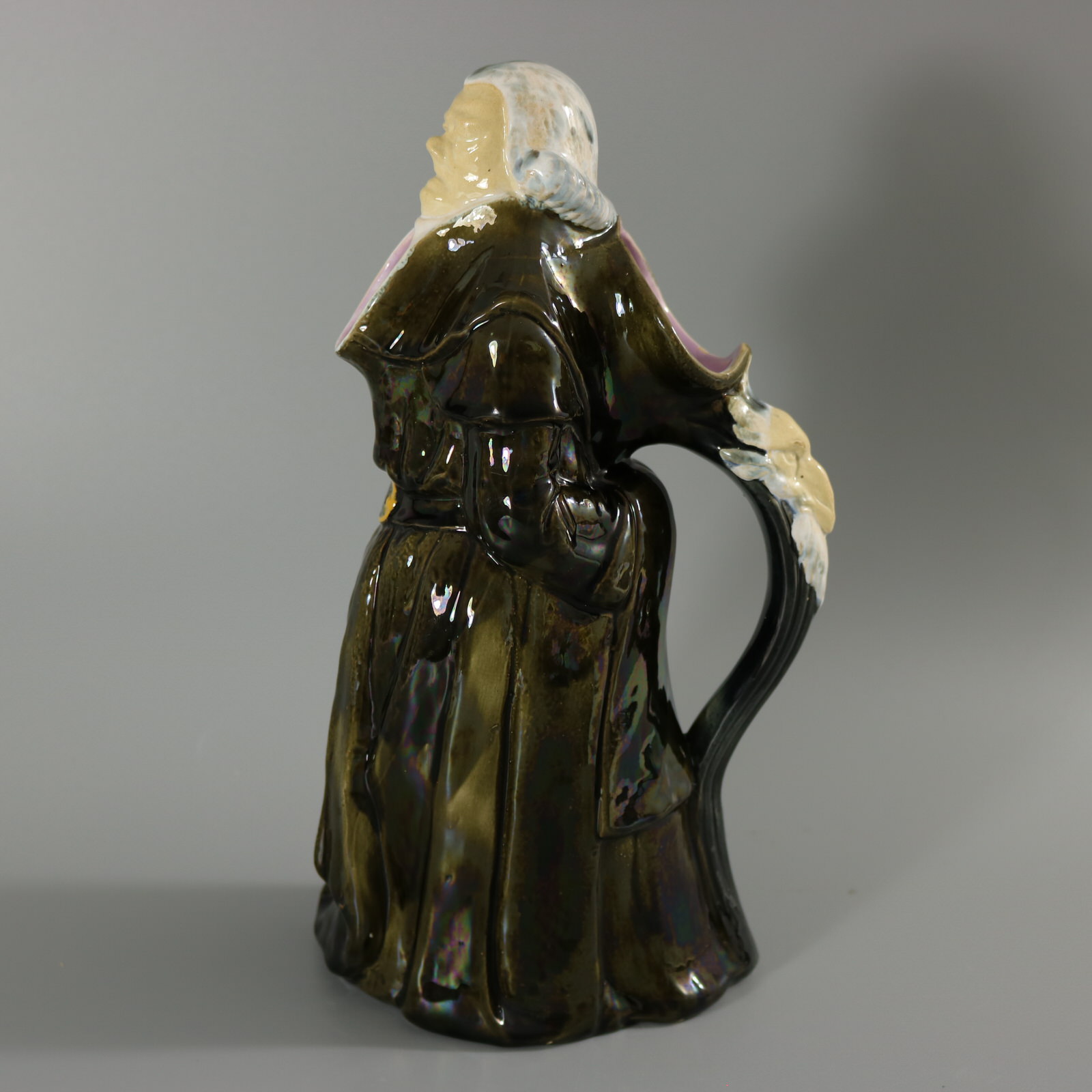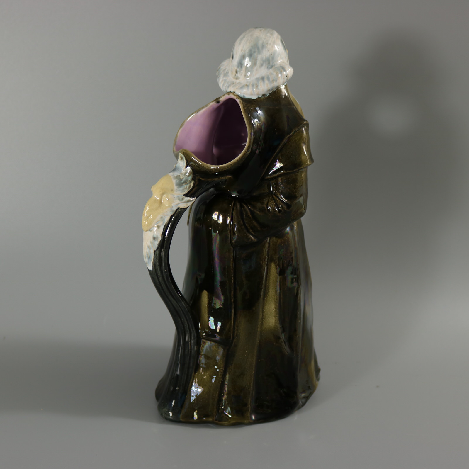 Victorian, circa 1875. 12ins high, 6.3ins wide, 4.9ins depth. George Jones Majolica jug/pitcher which features a monk, standing with hands behind his back.