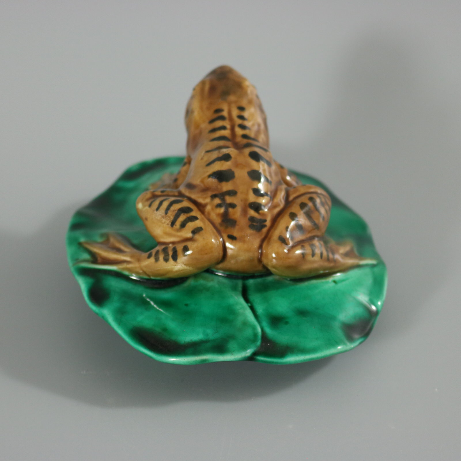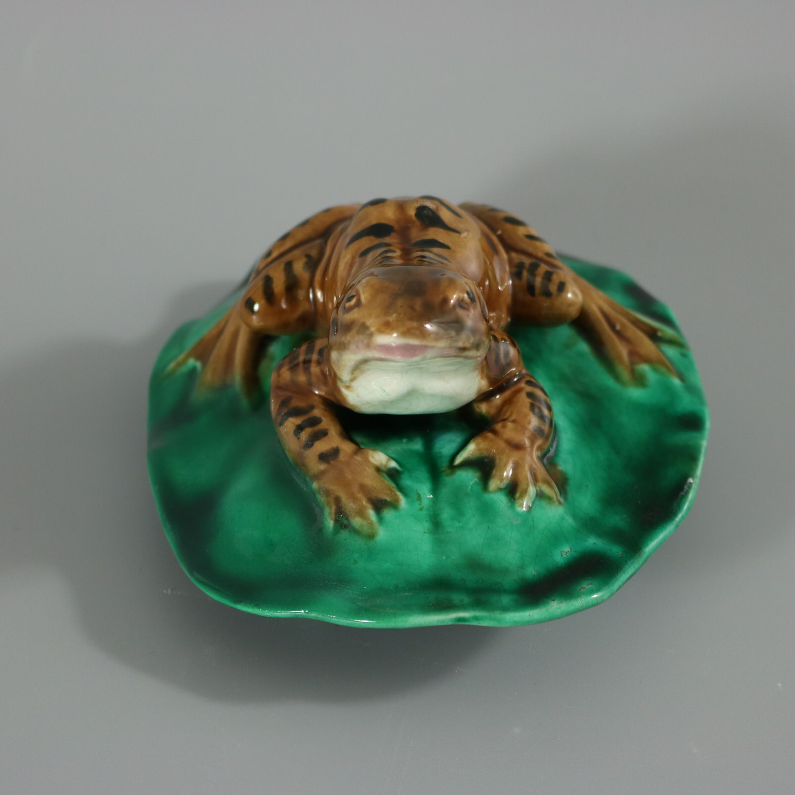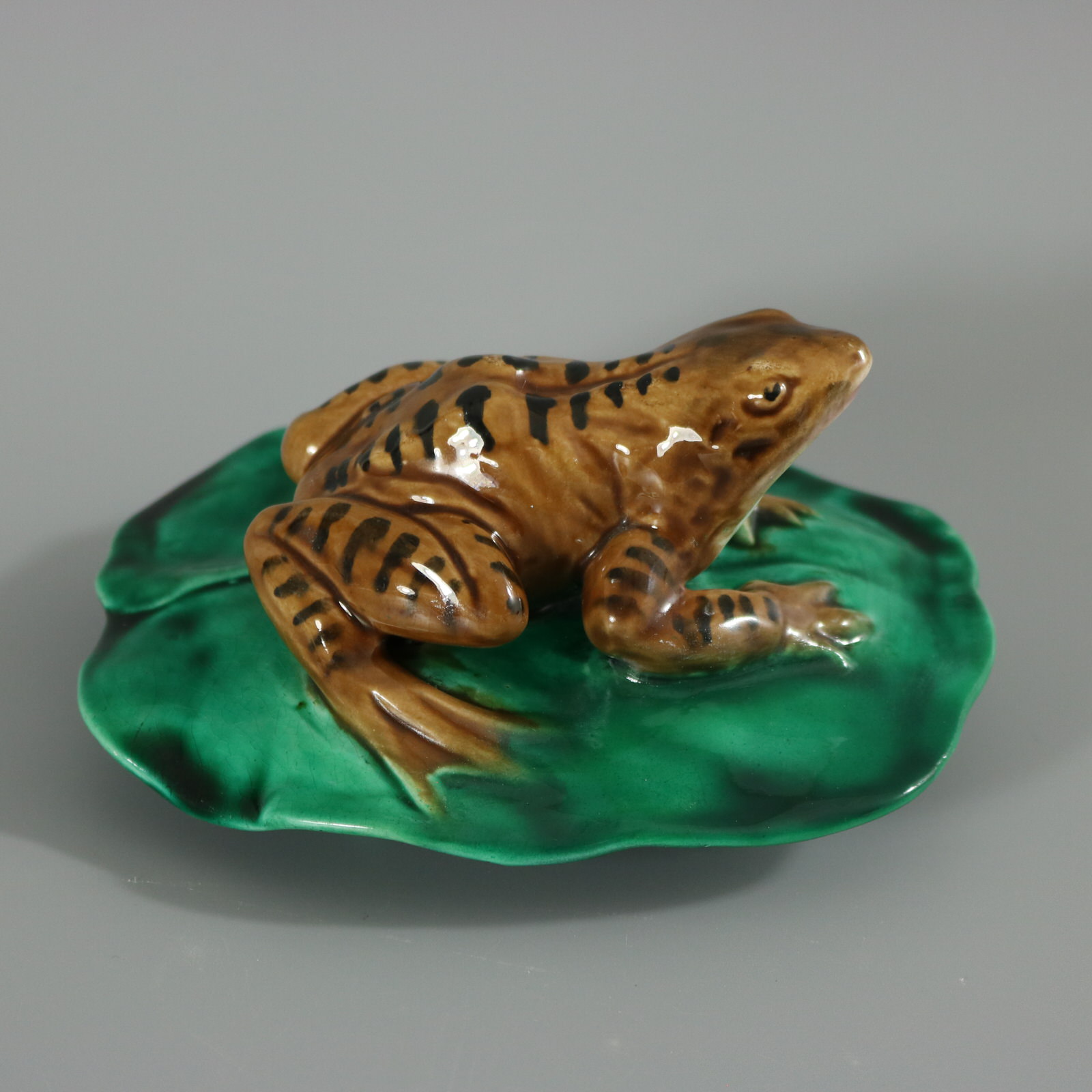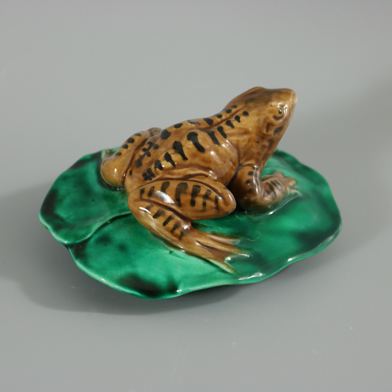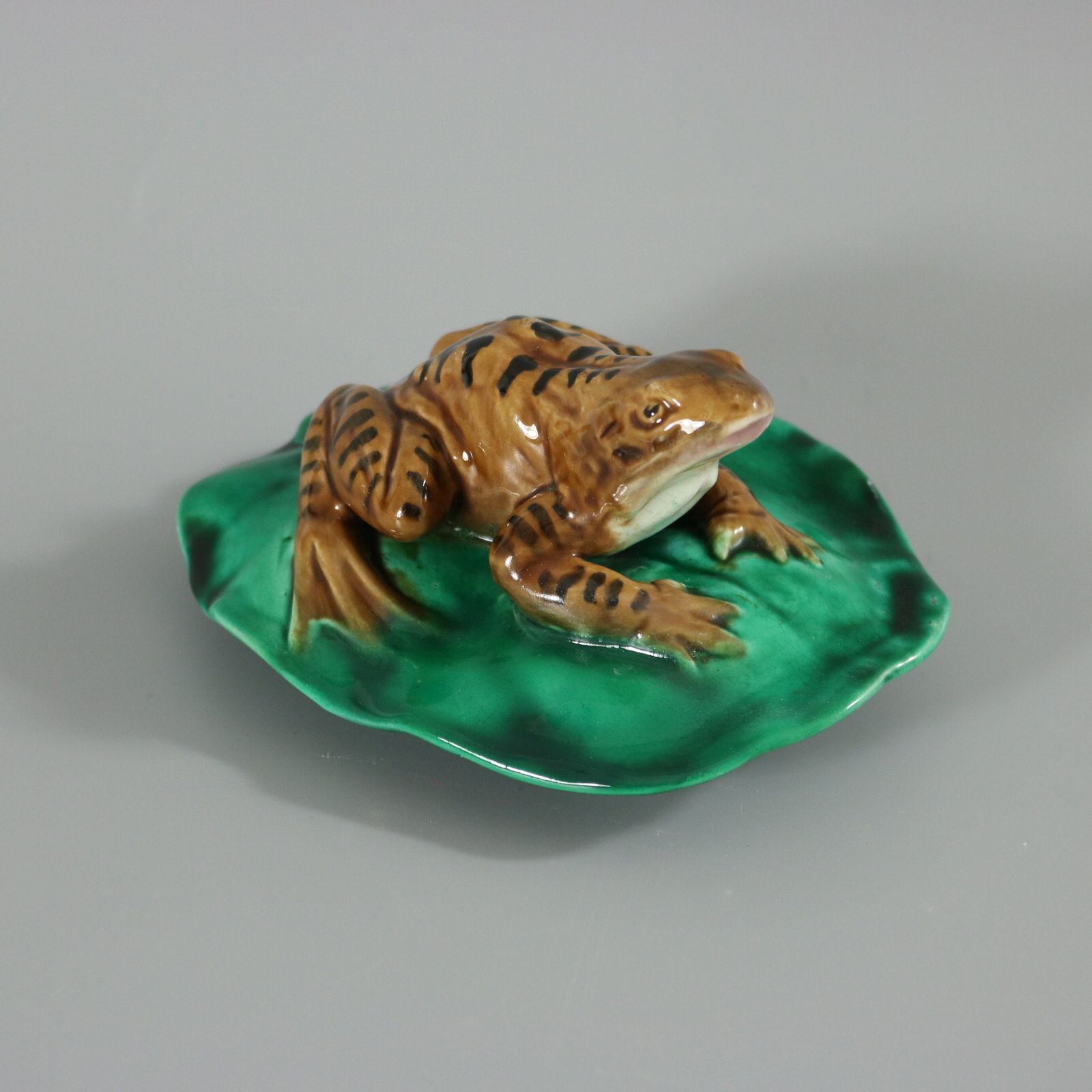 Victorian, circa 1880. 2.6ins high, 5ins wide, 4.1ins depth. Majolica figure which features a frog seated on a lily pad.