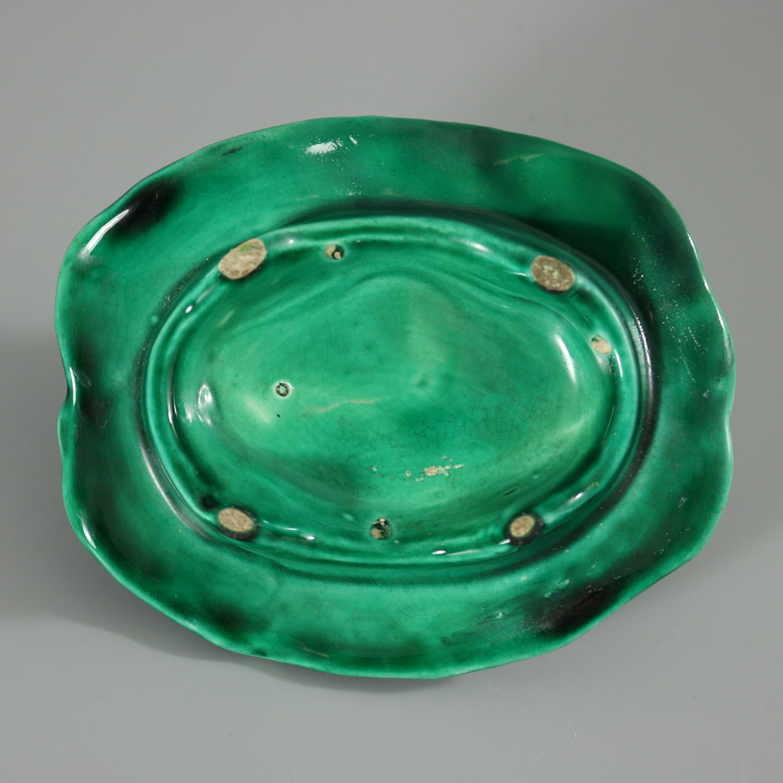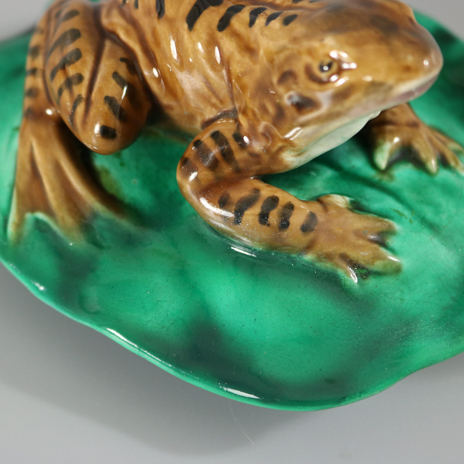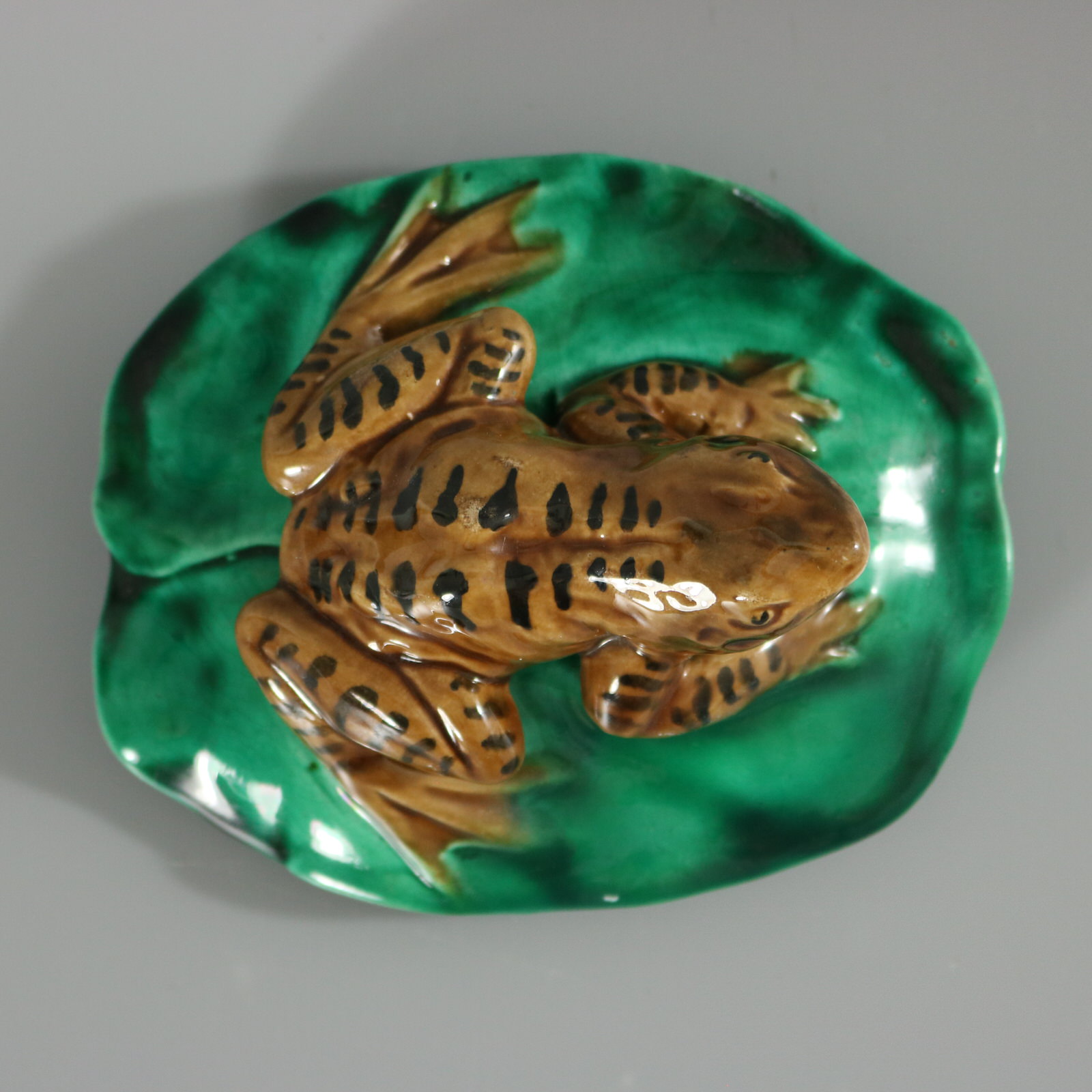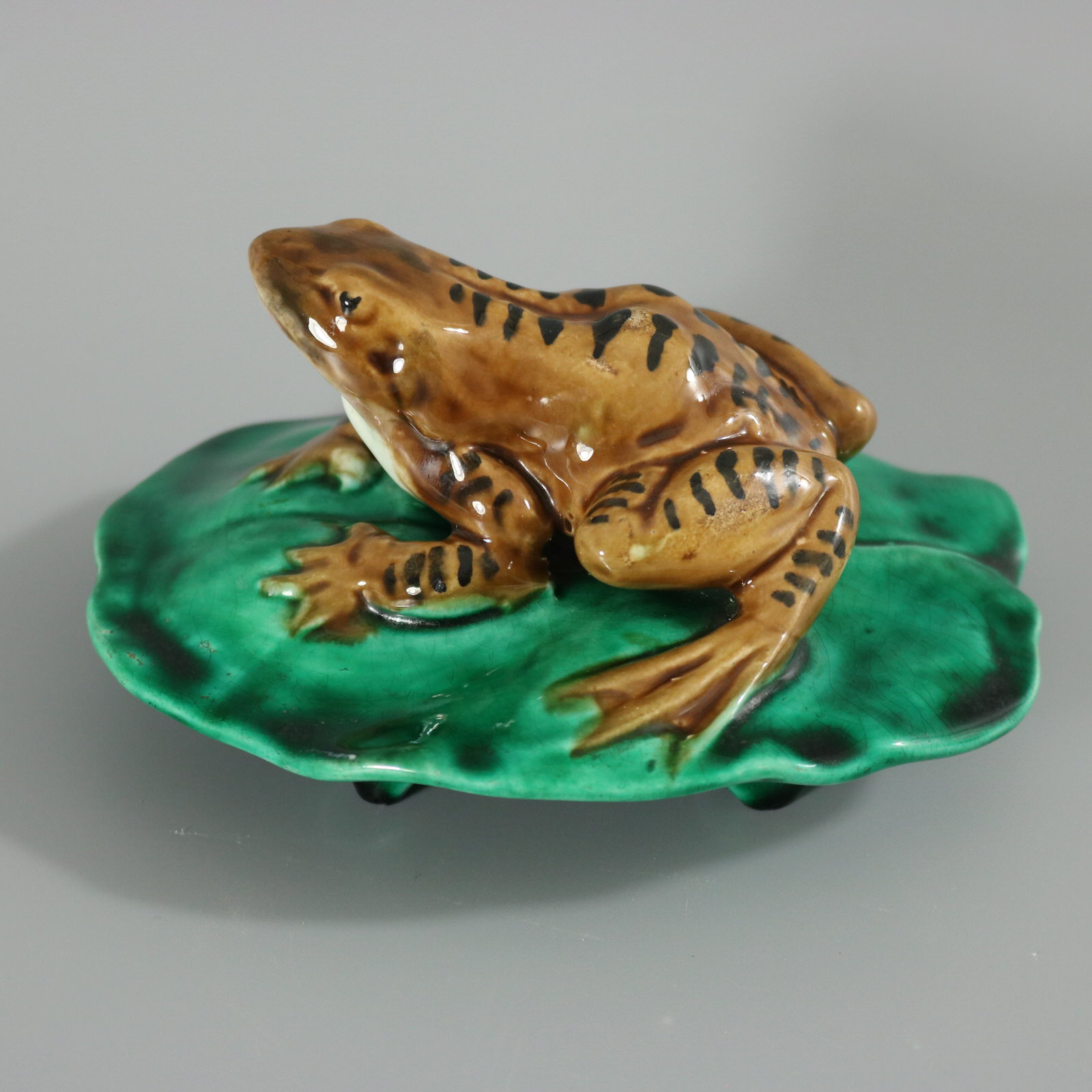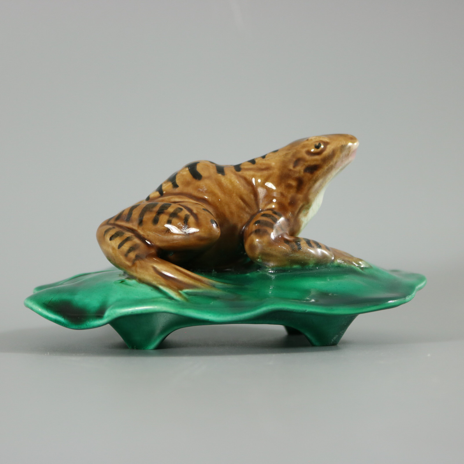 Victorian, circa 1880. 2.6ins high, 5ins wide, 4.1ins depth. Majolica figure which features a frog seated on a lily pad.