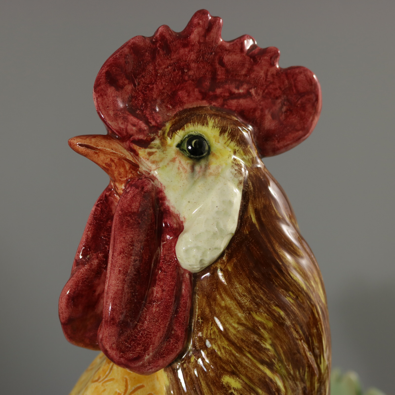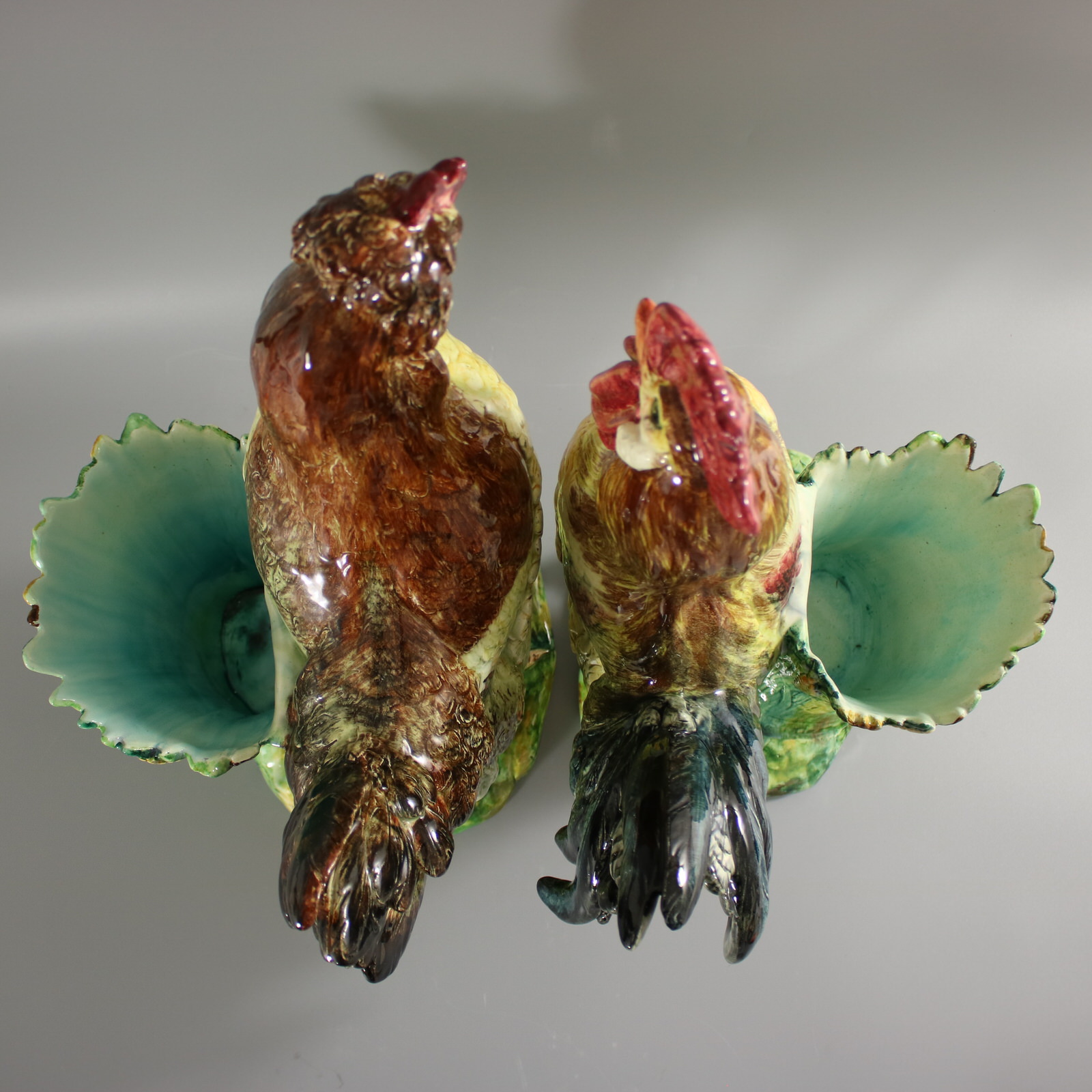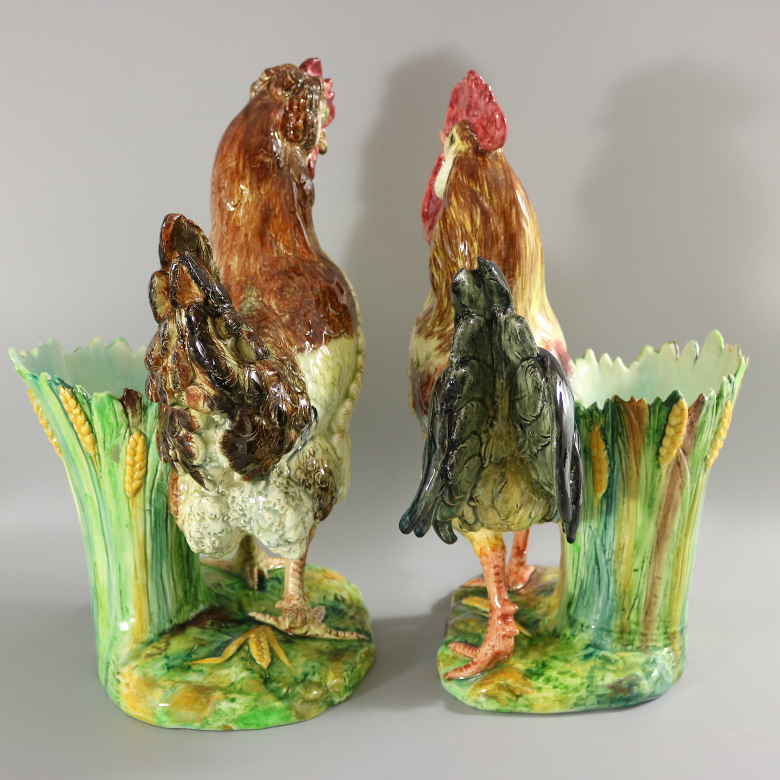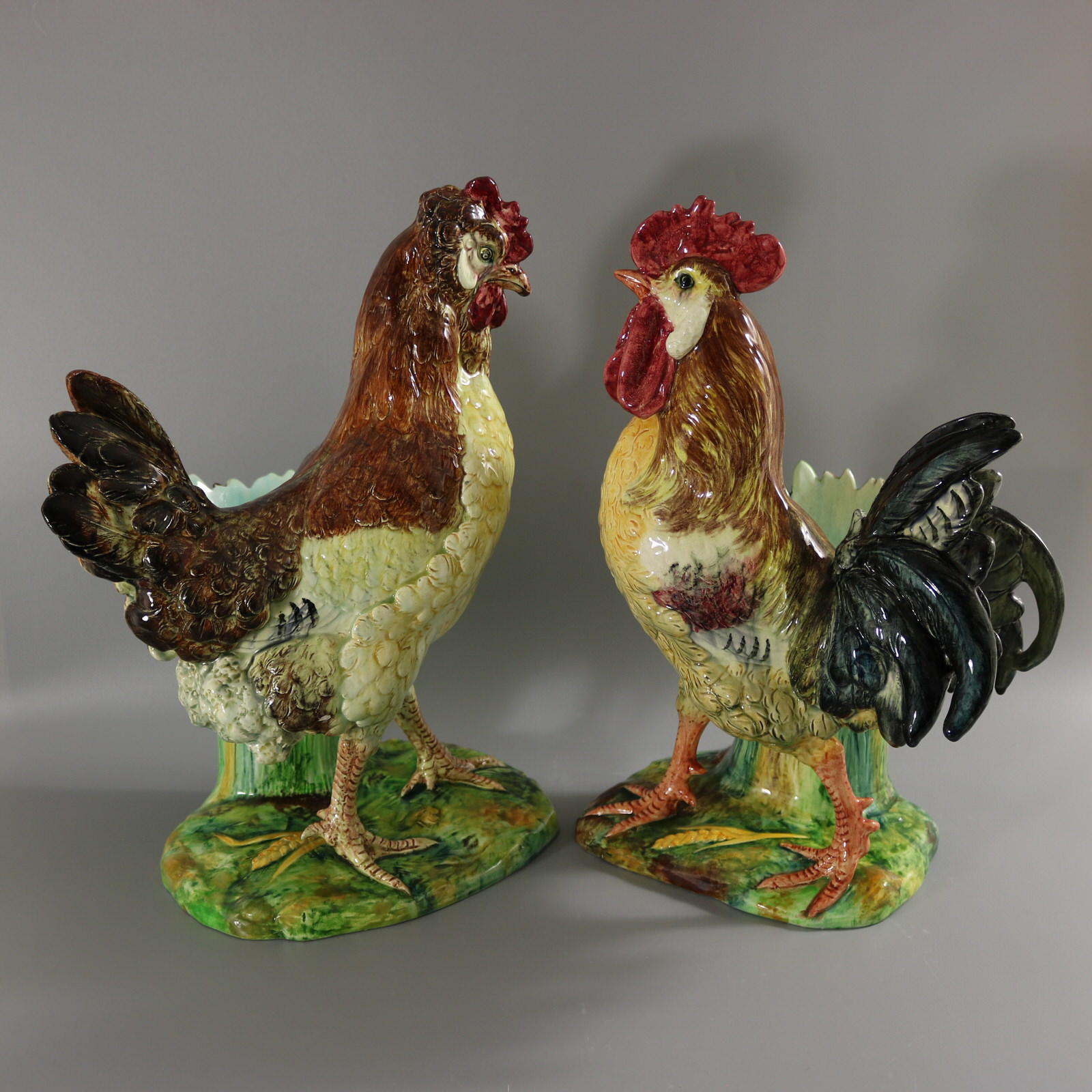Circa 1910. Tallest is 18.5ins high, 12.4ins wide, 10.2ins depth. Pair of Jerome Massier Fils Majolica figural vases which feature a hen and a rooster, stood in front of a vase.