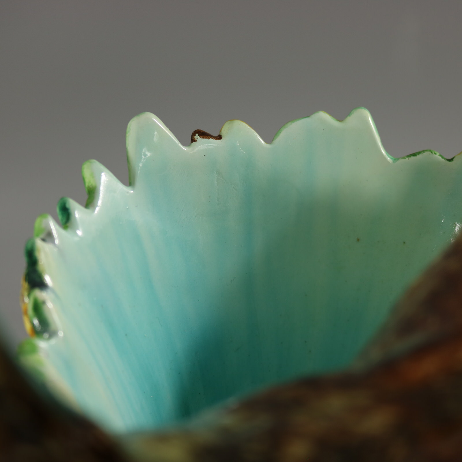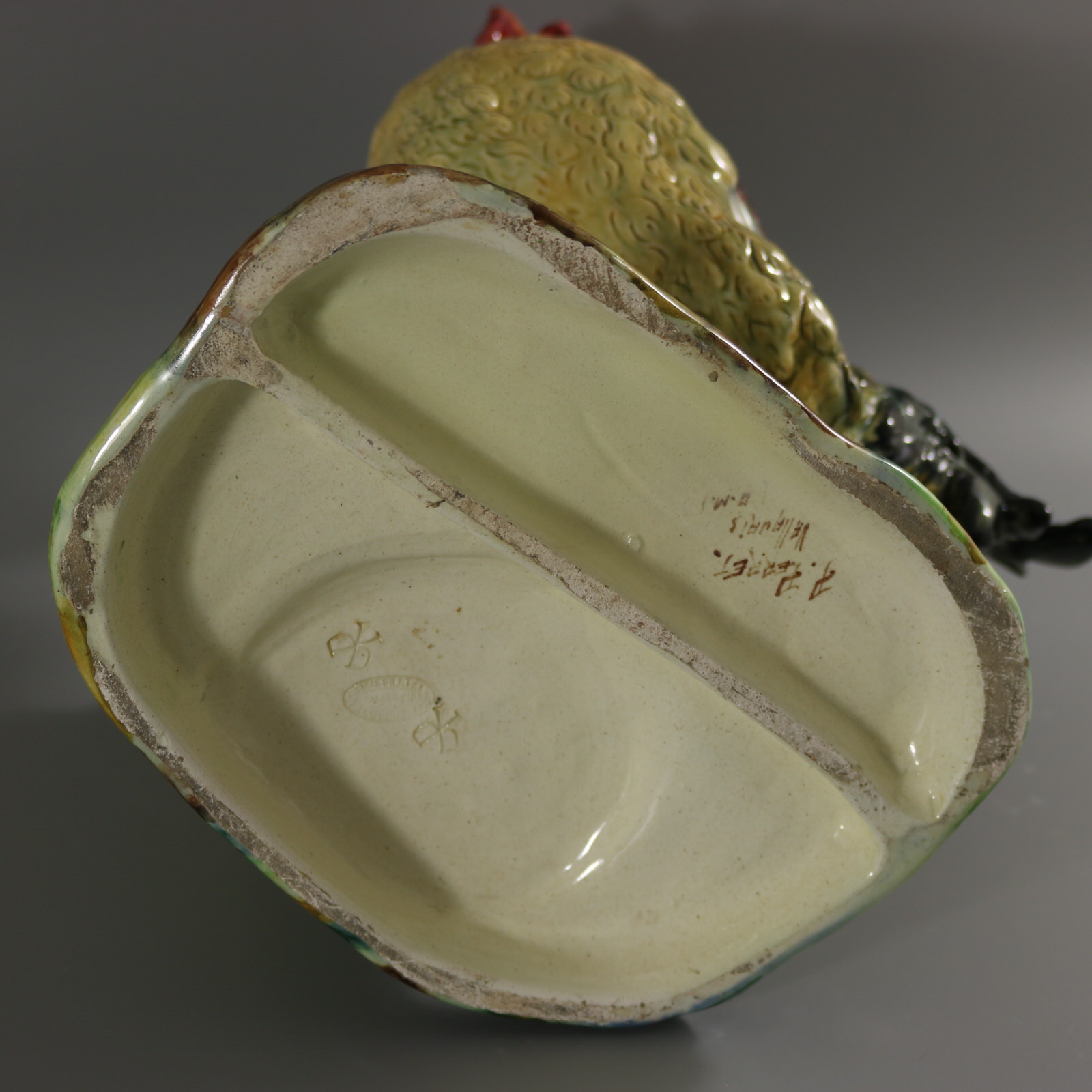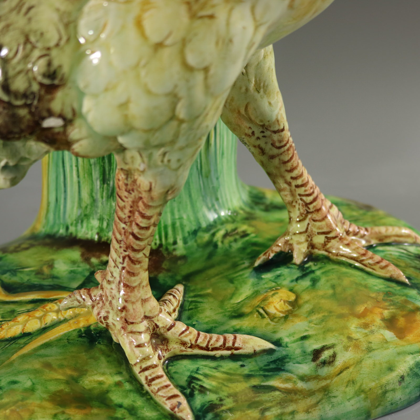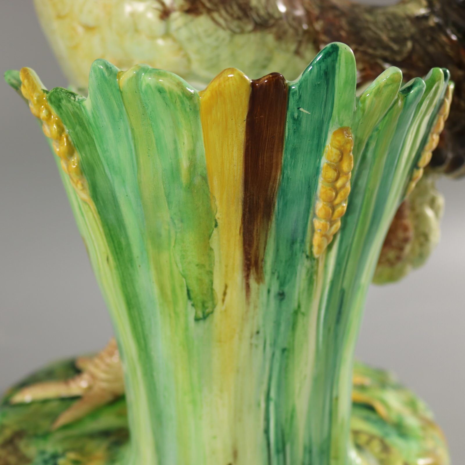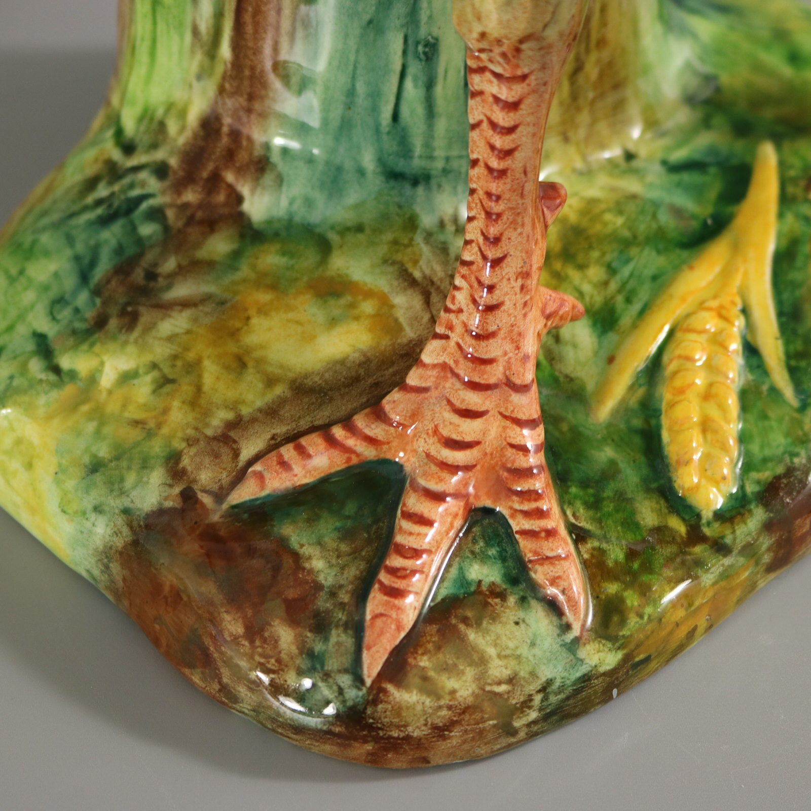 Circa 1910. Tallest is 18.5ins high, 12.4ins wide, 10.2ins depth. Pair of Jerome Massier Fils Majolica figural vases which feature a hen and a rooster, stood in front of a vase.