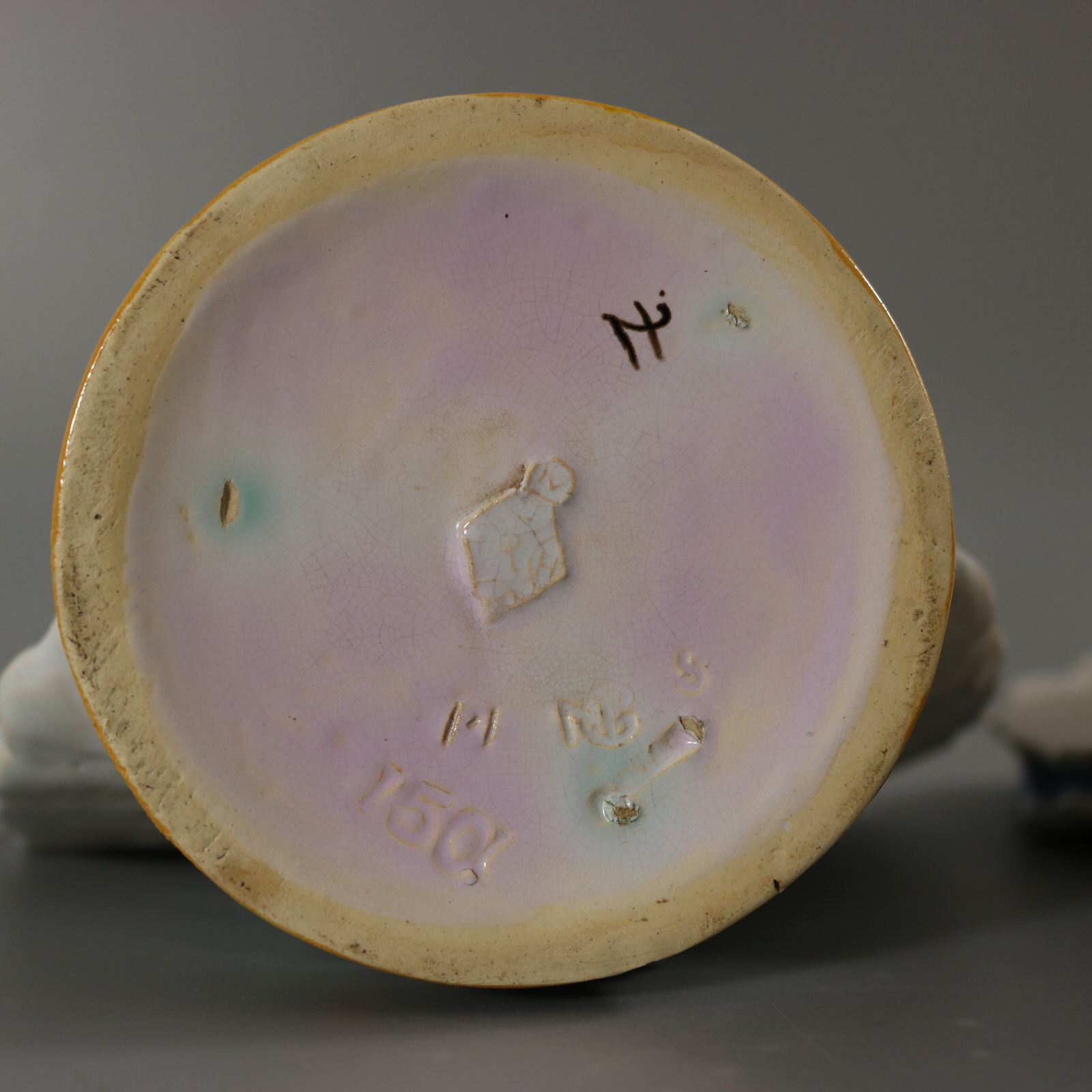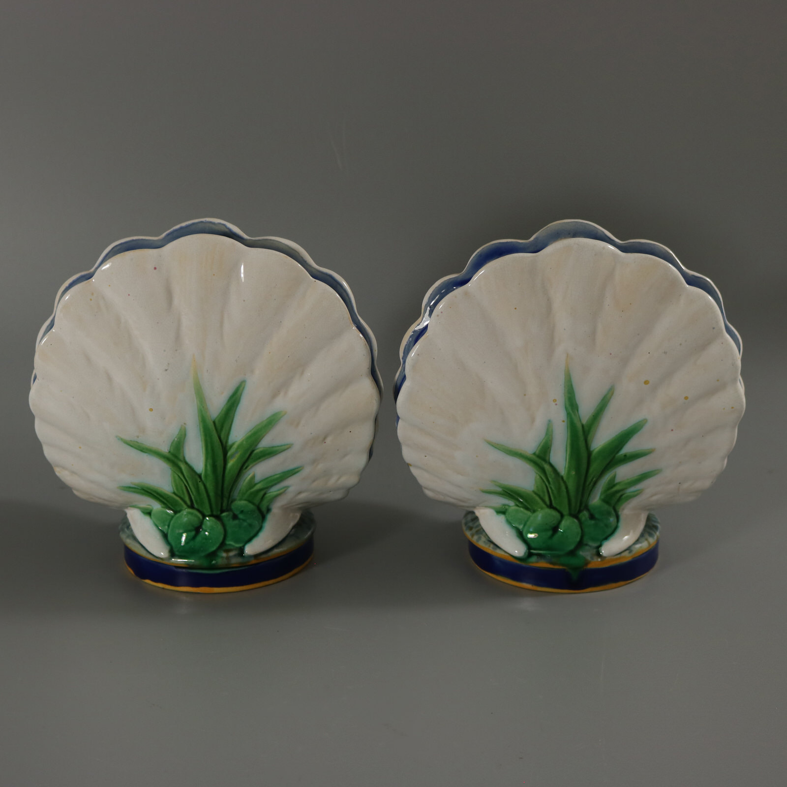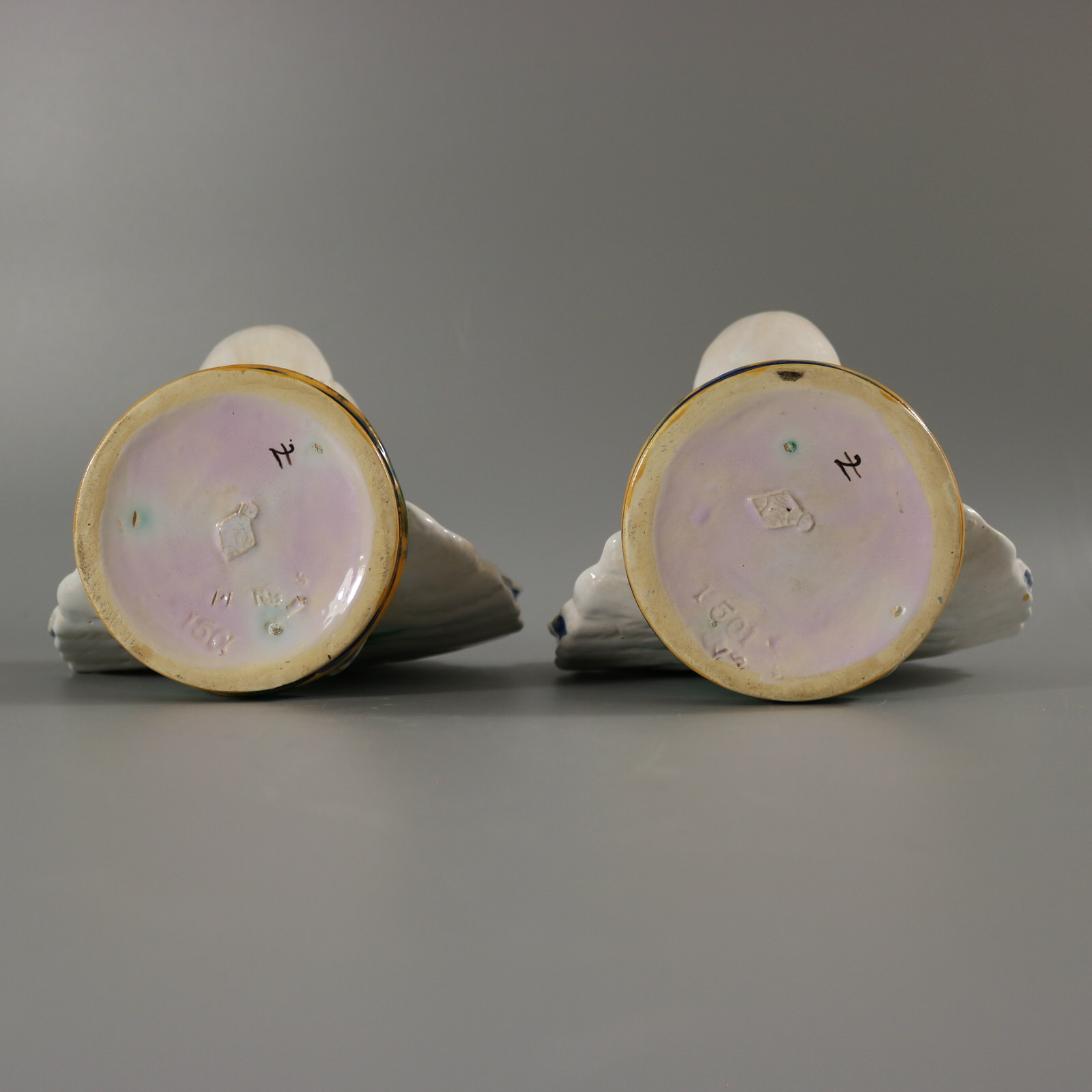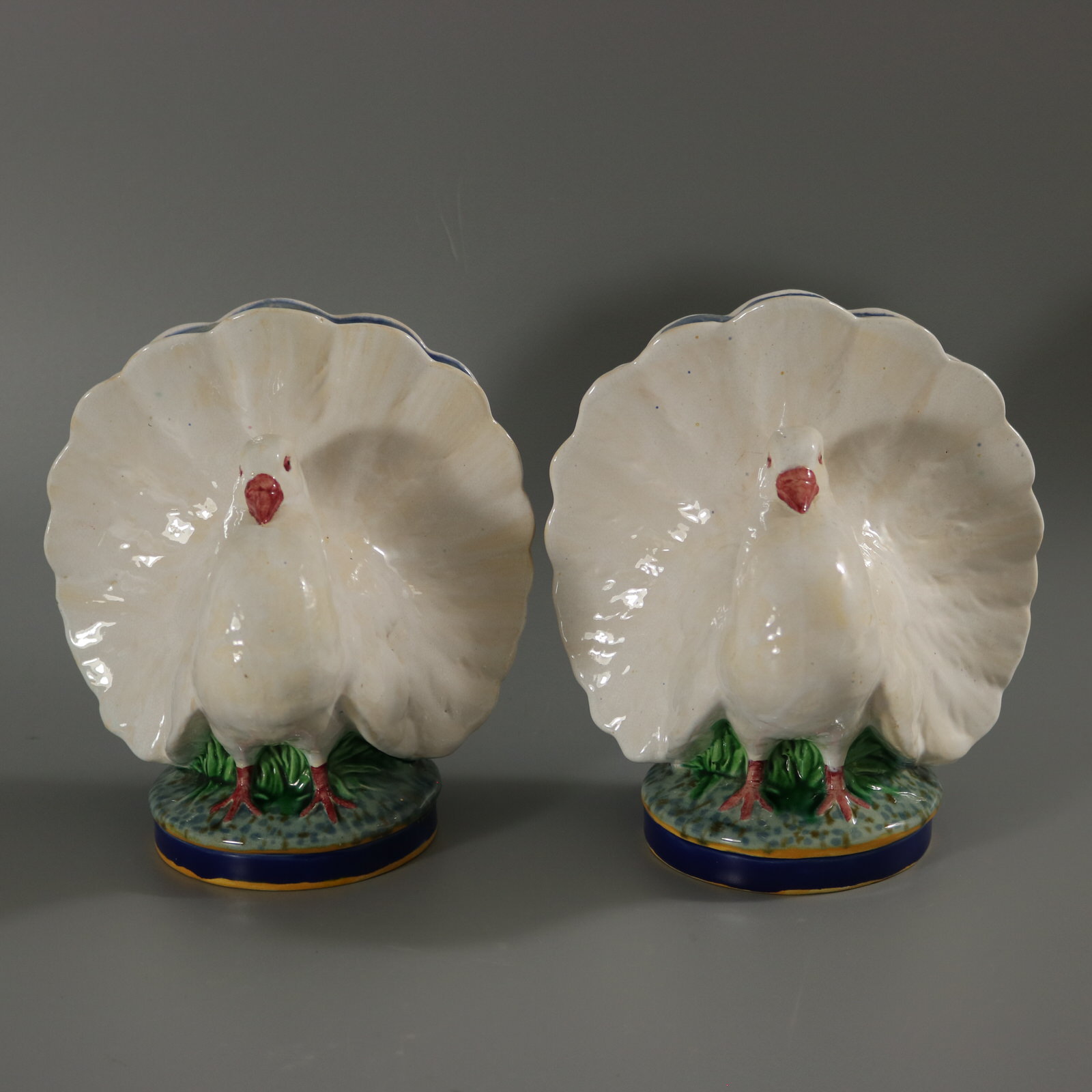Victorian, circa 1871. Tallest is 6.7ins high, 6ins wide, 4.5ins depth. Pair of Minton Majolica flower holders which feature a fantail pigeon, standing on a leafy base. Flower inserts around the tail.