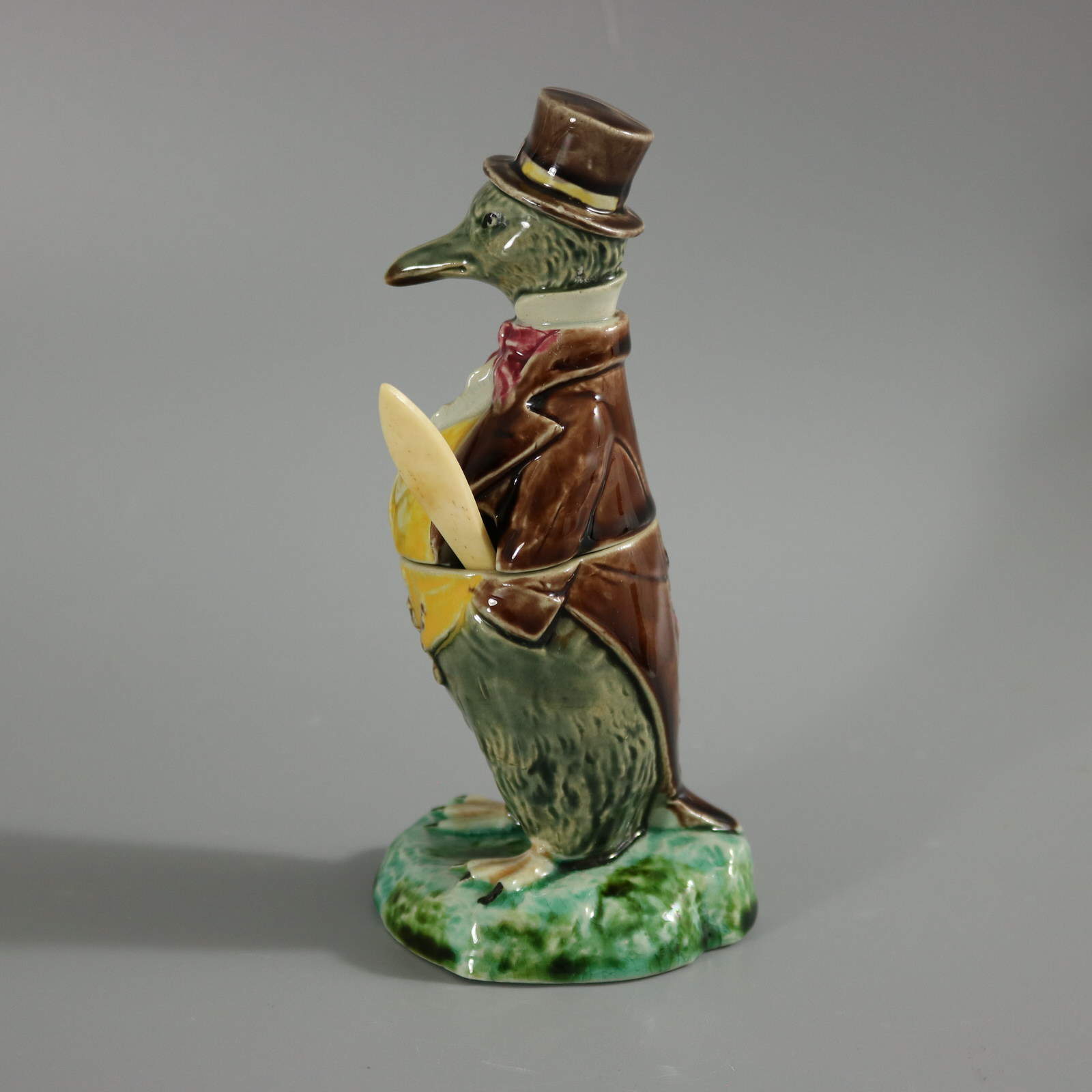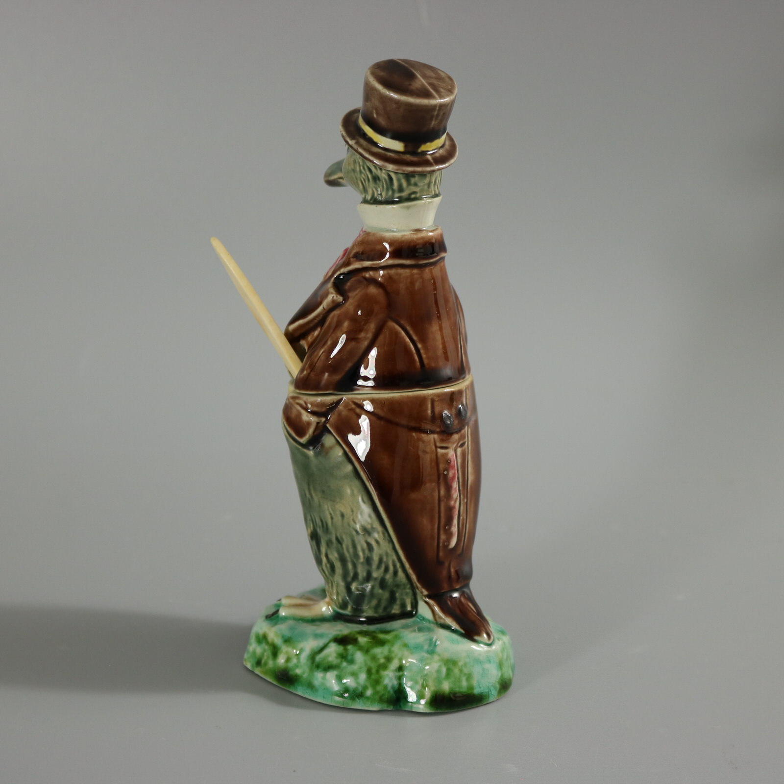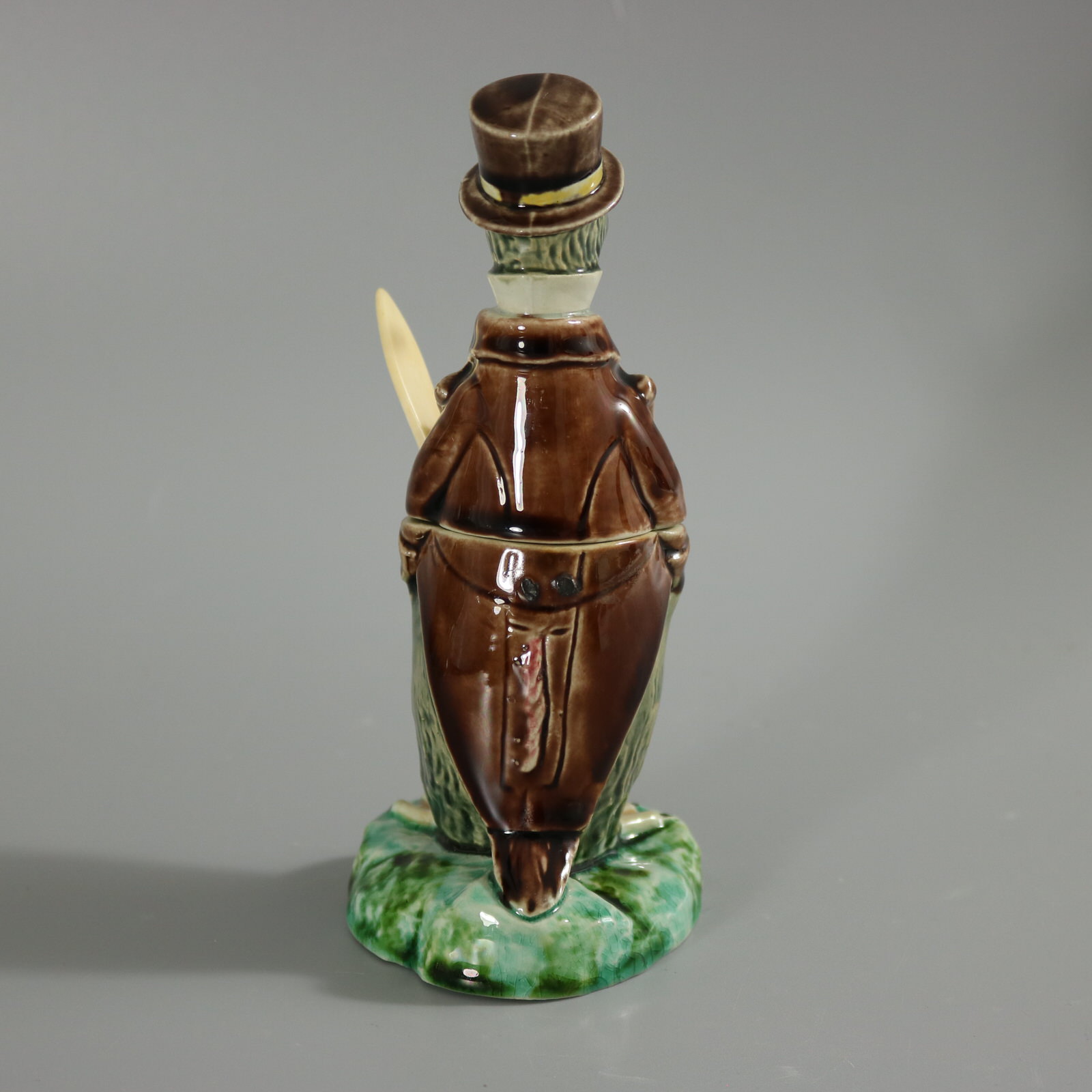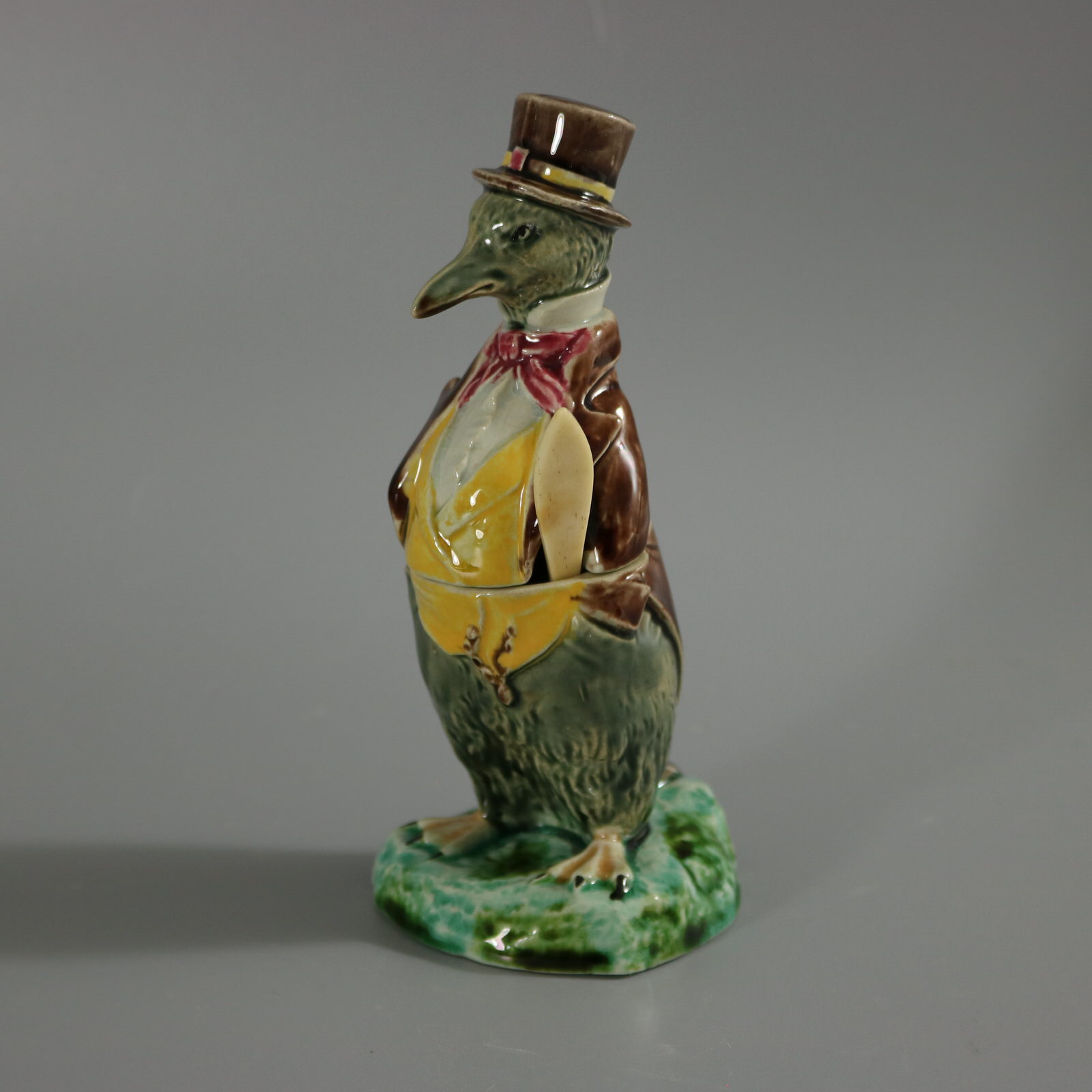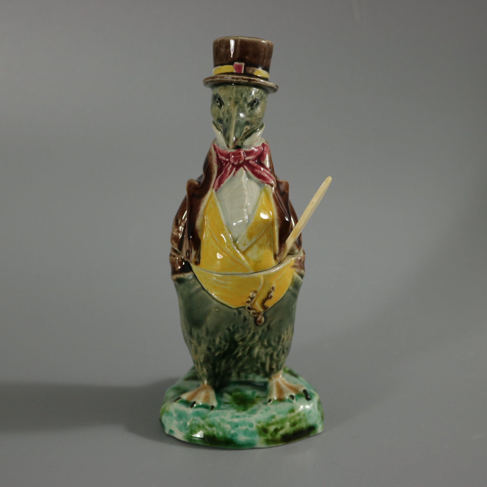 Victorian, circa 1875. 6.3ins high, 2.8ins wide, 3ins depth. Sarreguemines French Majolica preserve pot, cover and spoon which features an anthropomorphic penguin, standing with hands in pockets, dressed in top hat and tails. Original spoon.