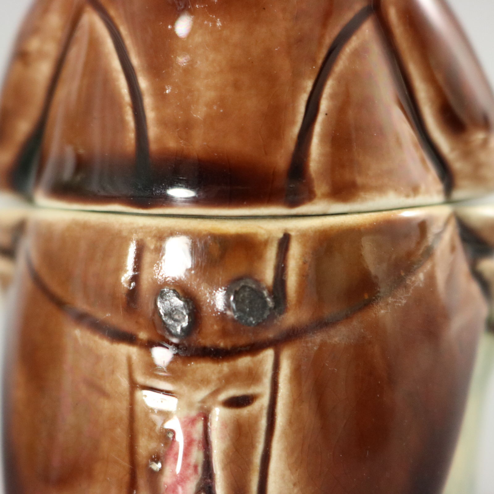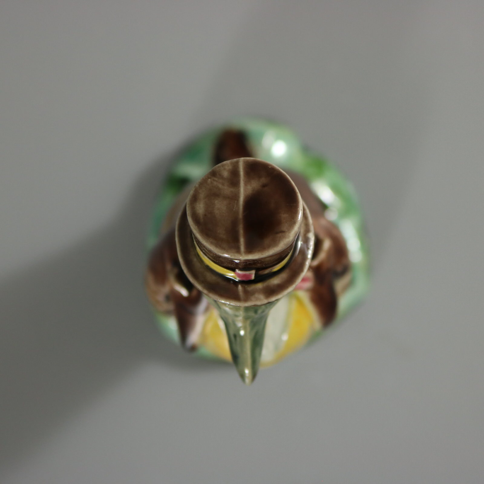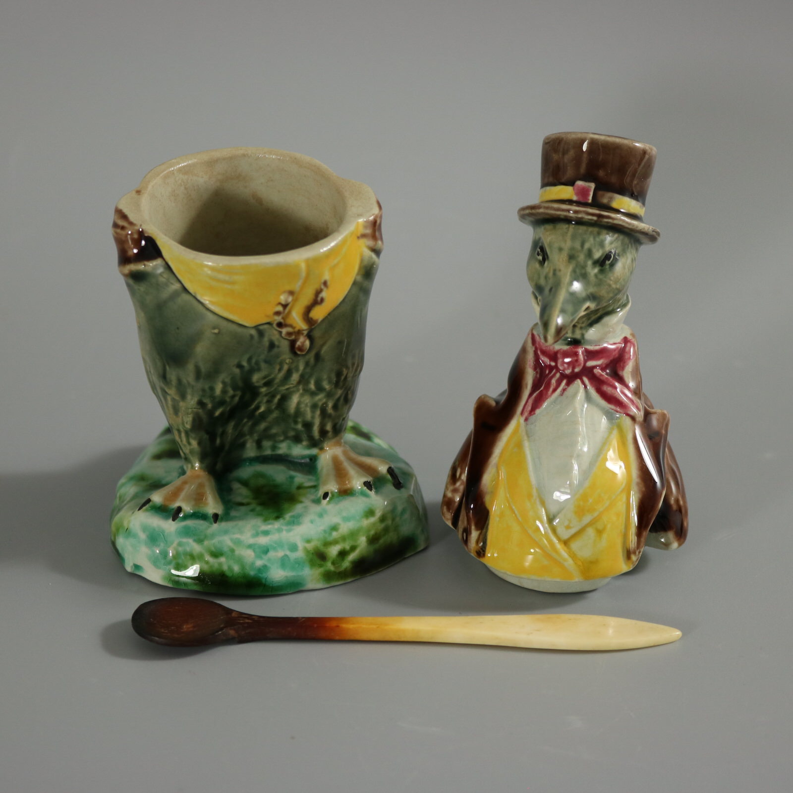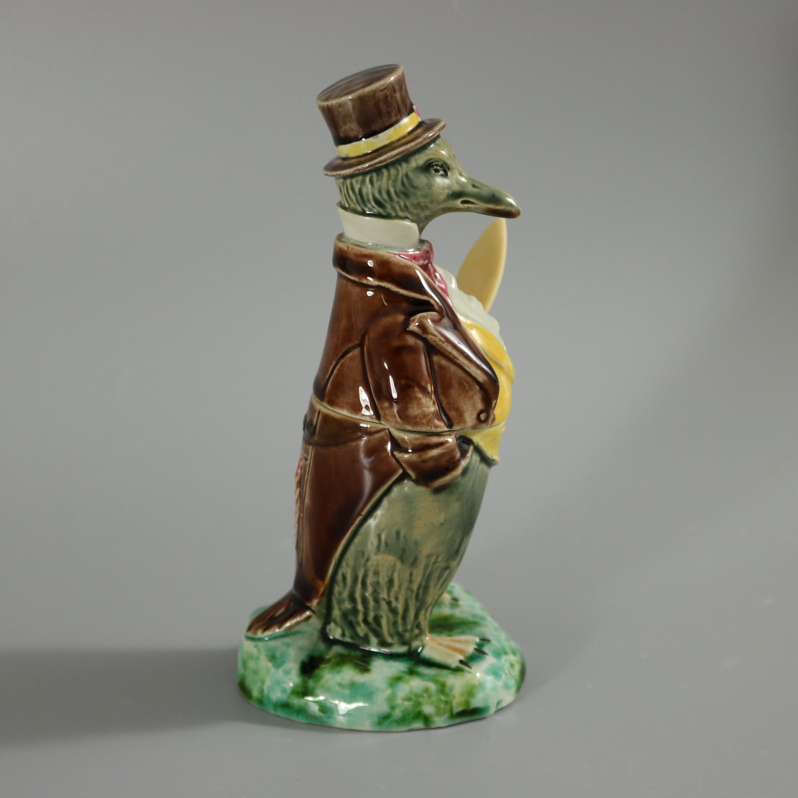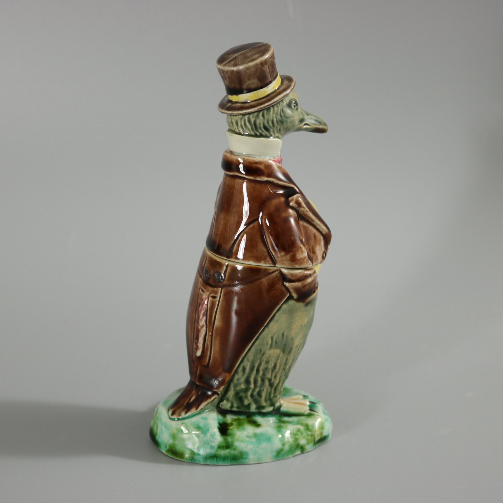 Victorian, circa 1875. 6.3ins high, 2.8ins wide, 3ins depth. Sarreguemines French Majolica preserve pot, cover and spoon which features an anthropomorphic penguin, standing with hands in pockets, dressed in top hat and tails. Original spoon.