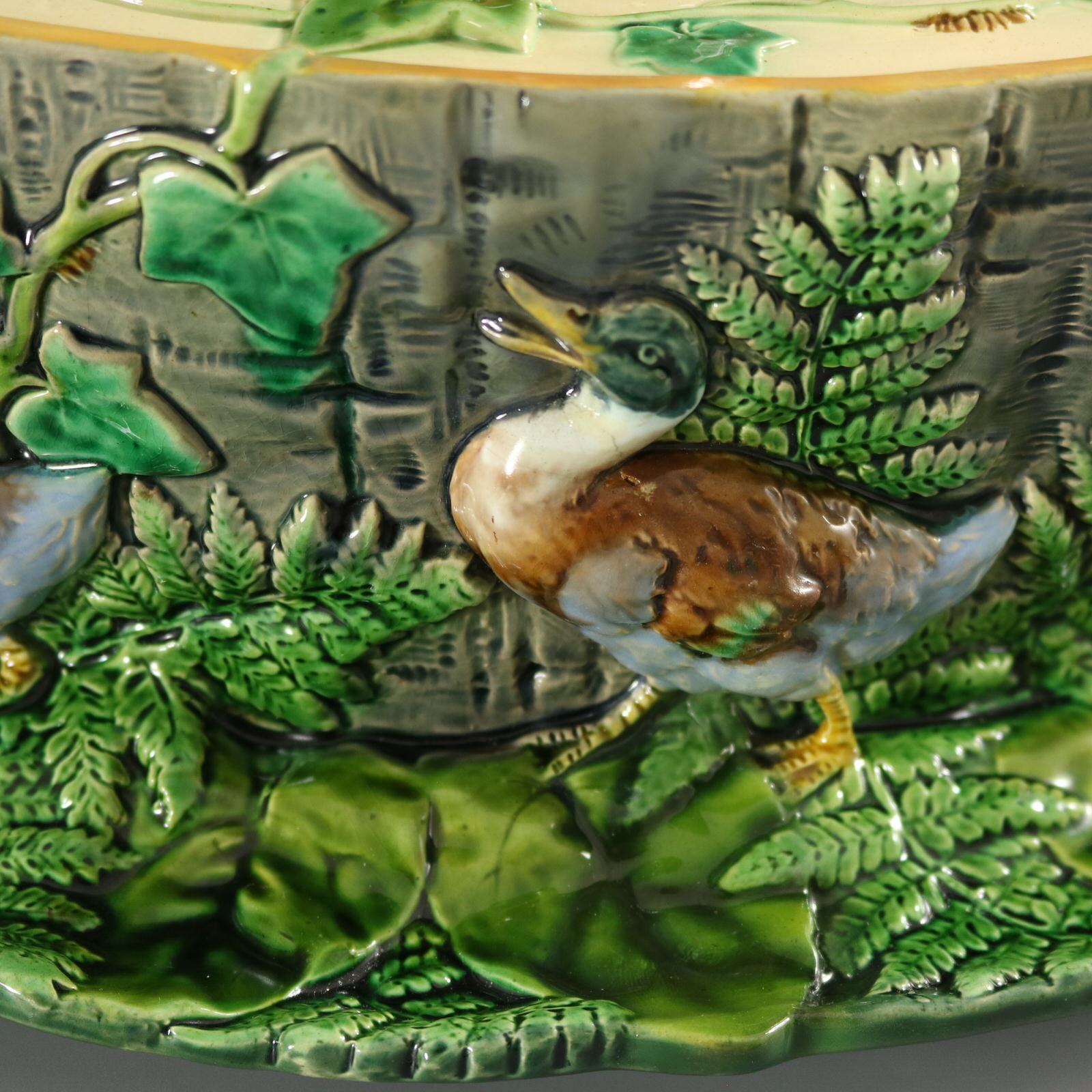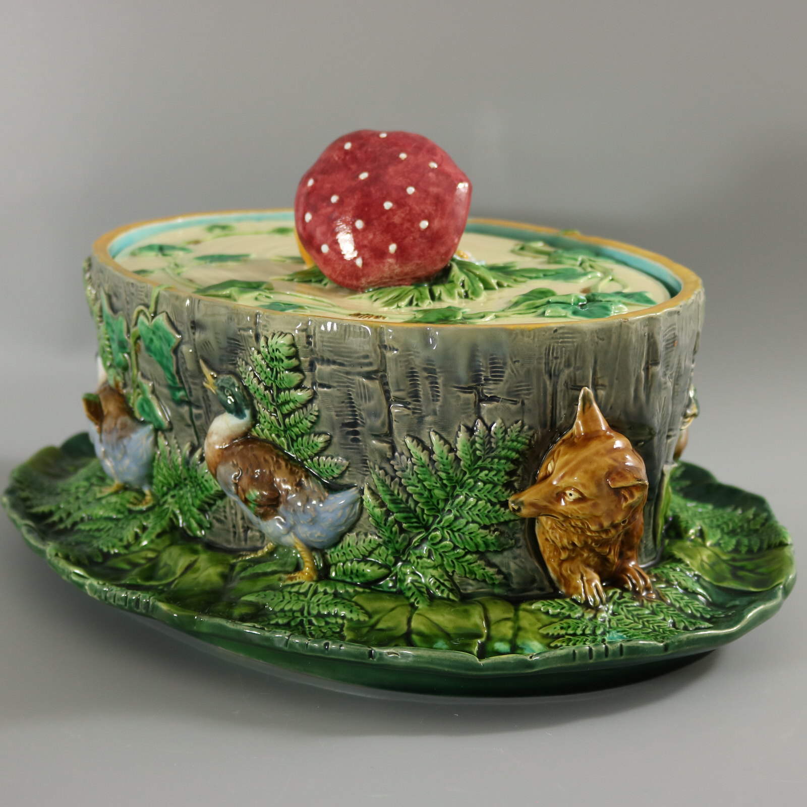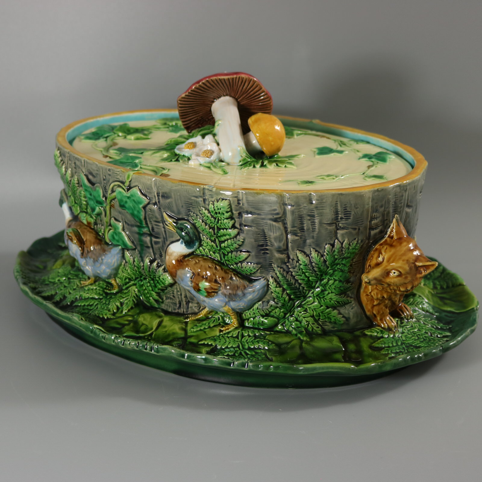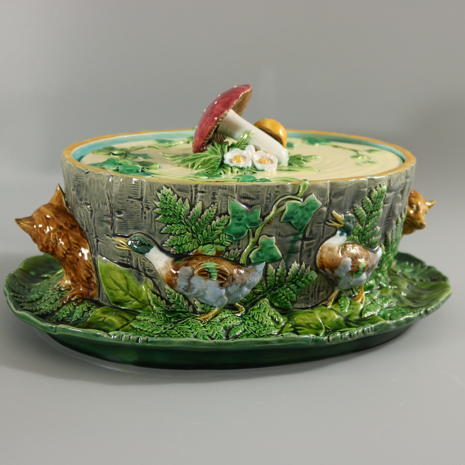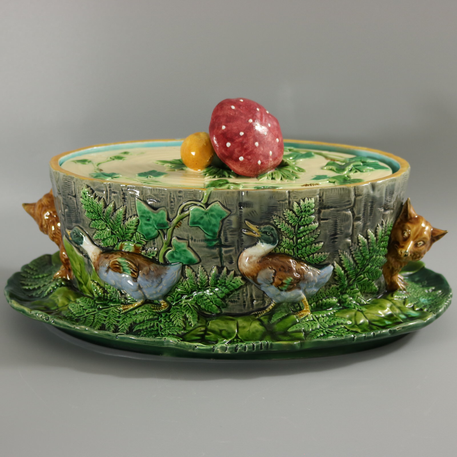 Victorian, circa 1877. 7.1ins high, 15.4ins wide, 11.4ins depth. Minton Majolica game pie dish which features foxes at either end, peering slyly out of a burrow, looking at mallard ducks.